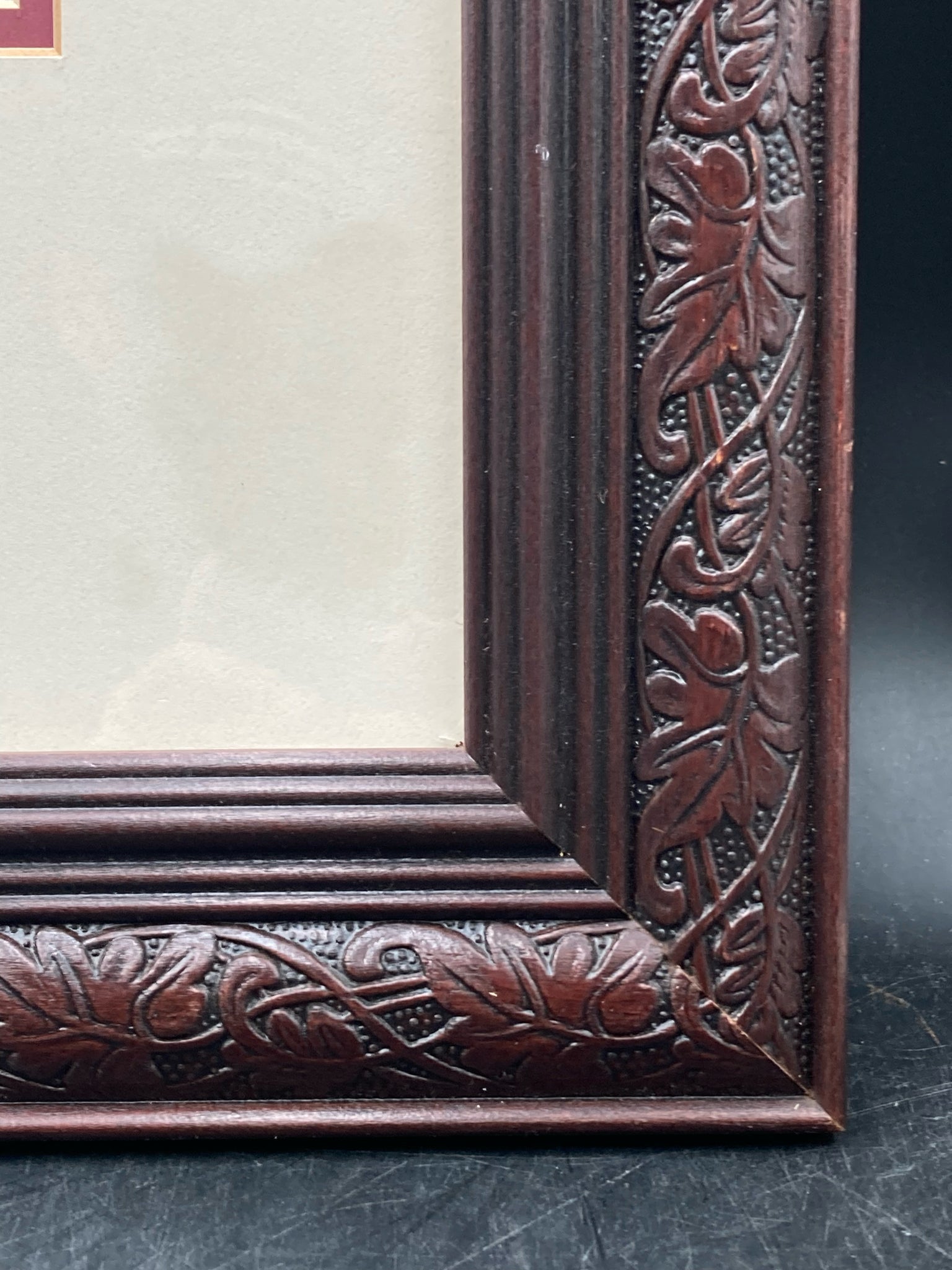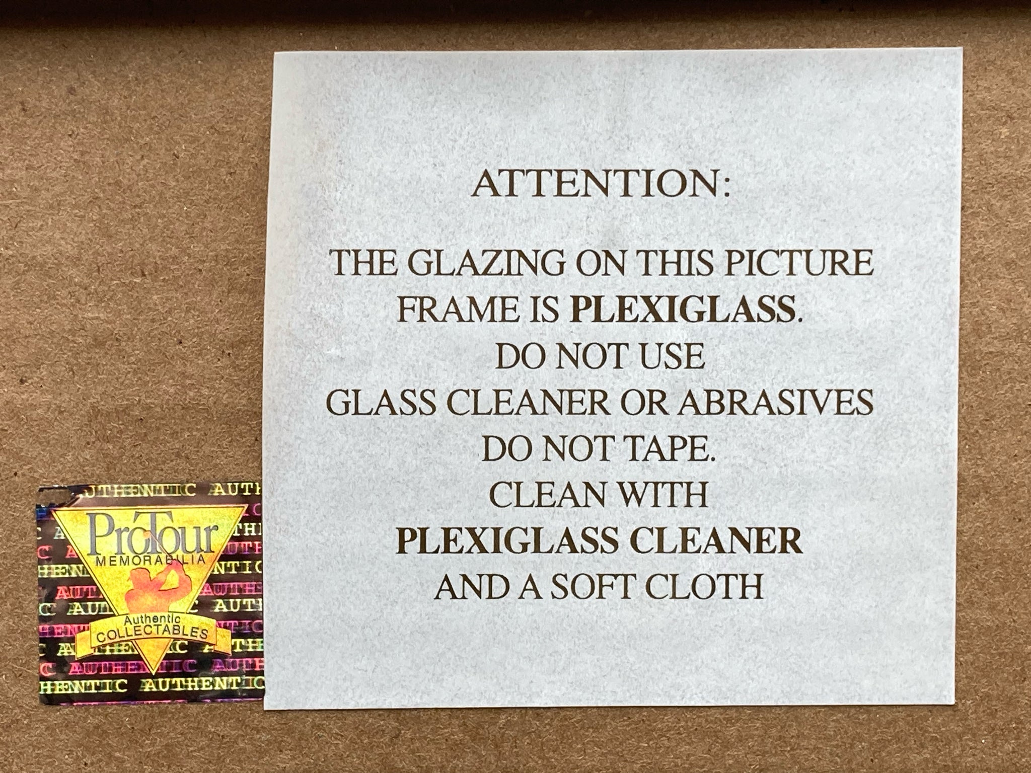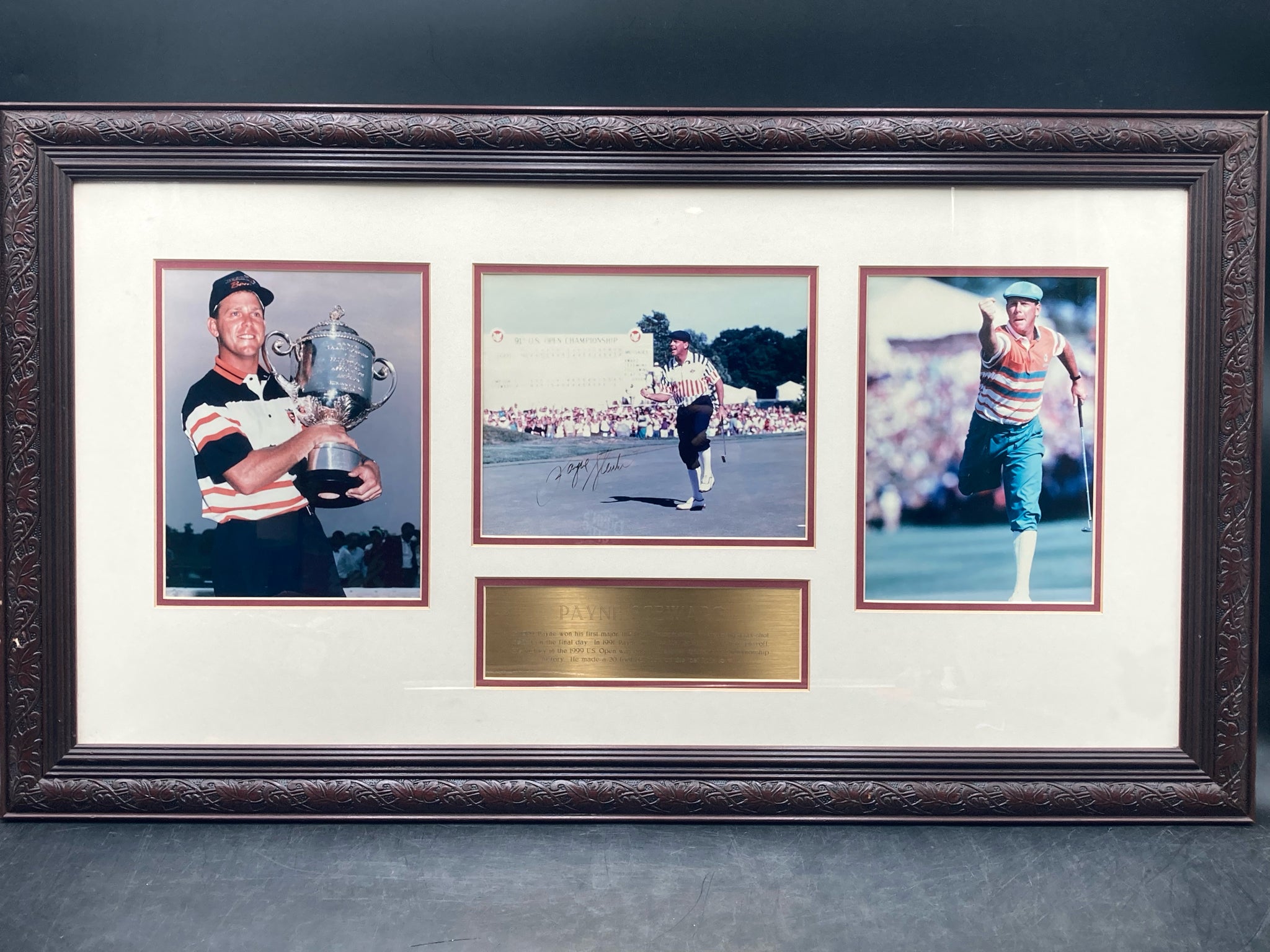 Payne Stewart signed commemorative photo display with certificate of authenticity. authenticity plaque features three 8x10" sized photos of Payne Stewart, the middle photo of the winning put from his 1991 US Open victory and is signed by Payne Stewart. Bottom center features a plaque detailing his career accomplishments. Display measures 20" tall by 34" long. Display comes with a certificate of authenticity from Pro Tour Memorabilia which has additional information on the piece. Frame has some light wear otherwise display is in good condition.