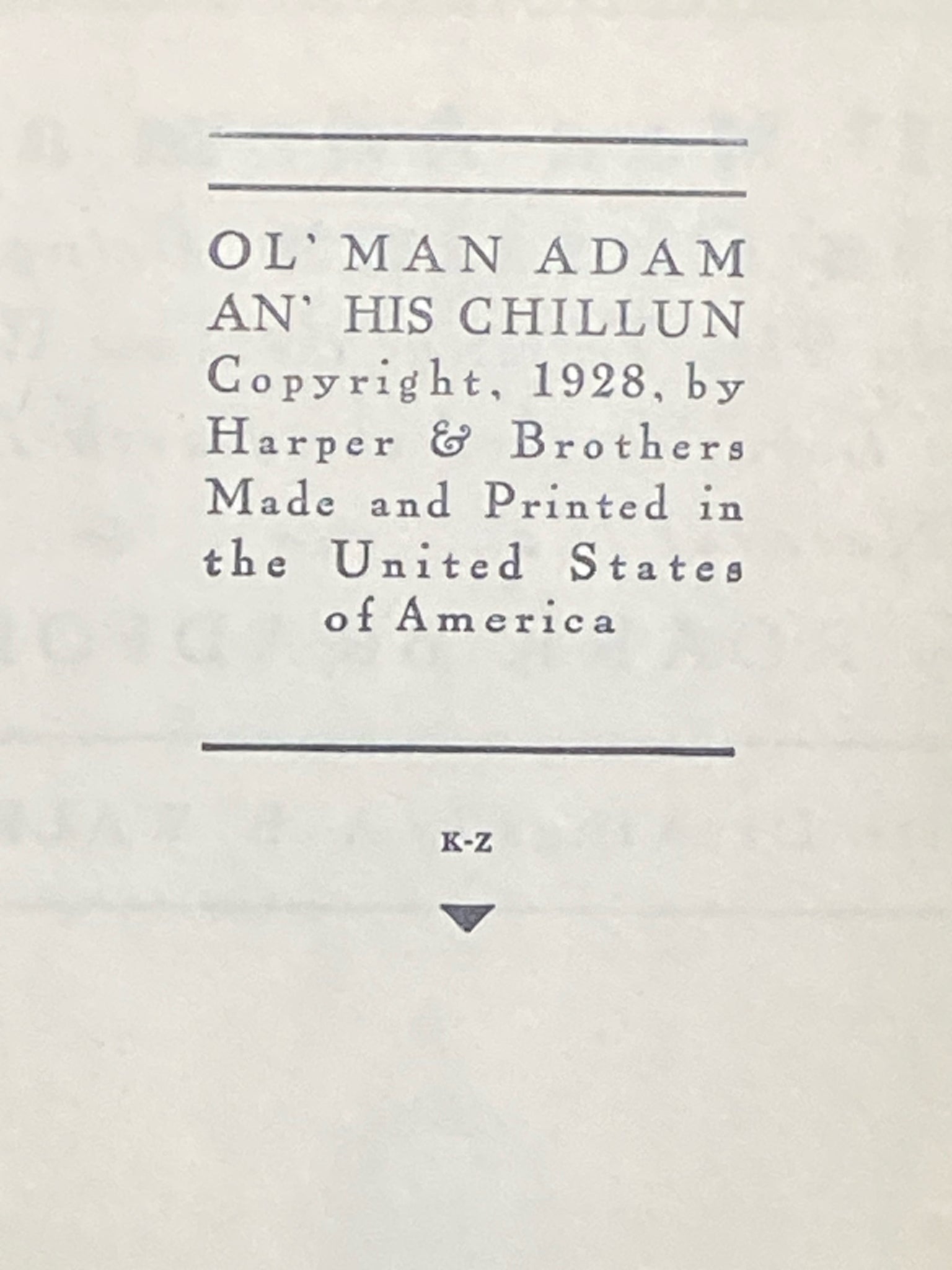Ol' Man Adam An' His Chillun: Roark Bradford w/ Drawings by A.B. Walker (1928, Harper & Row, Publishers)