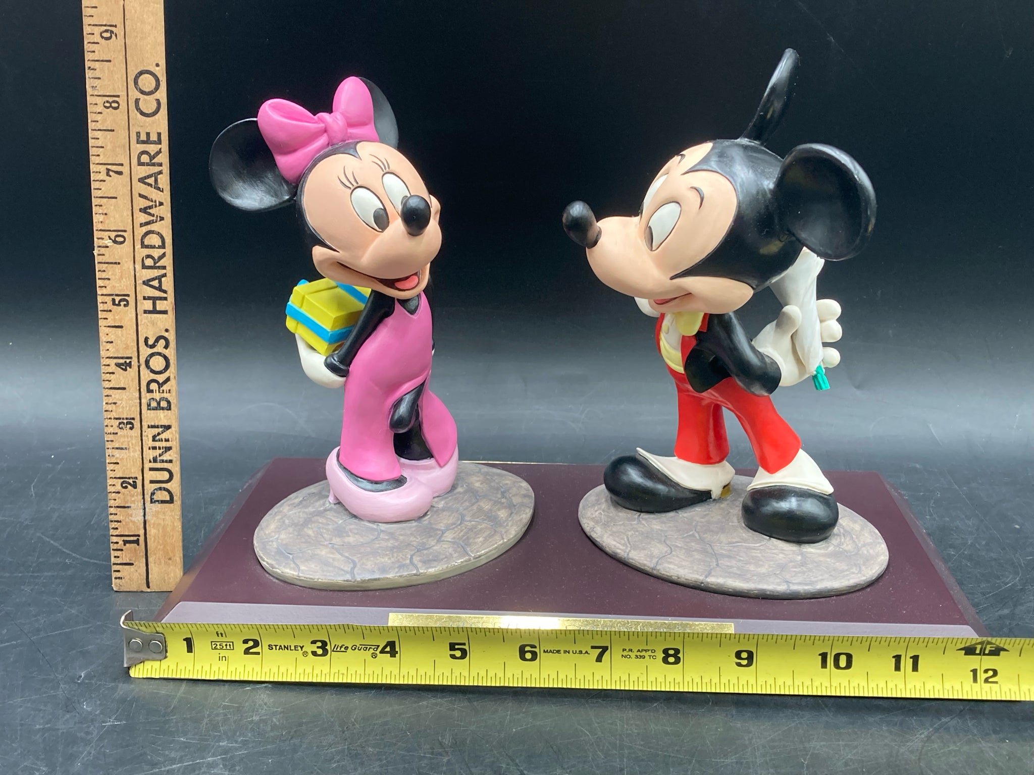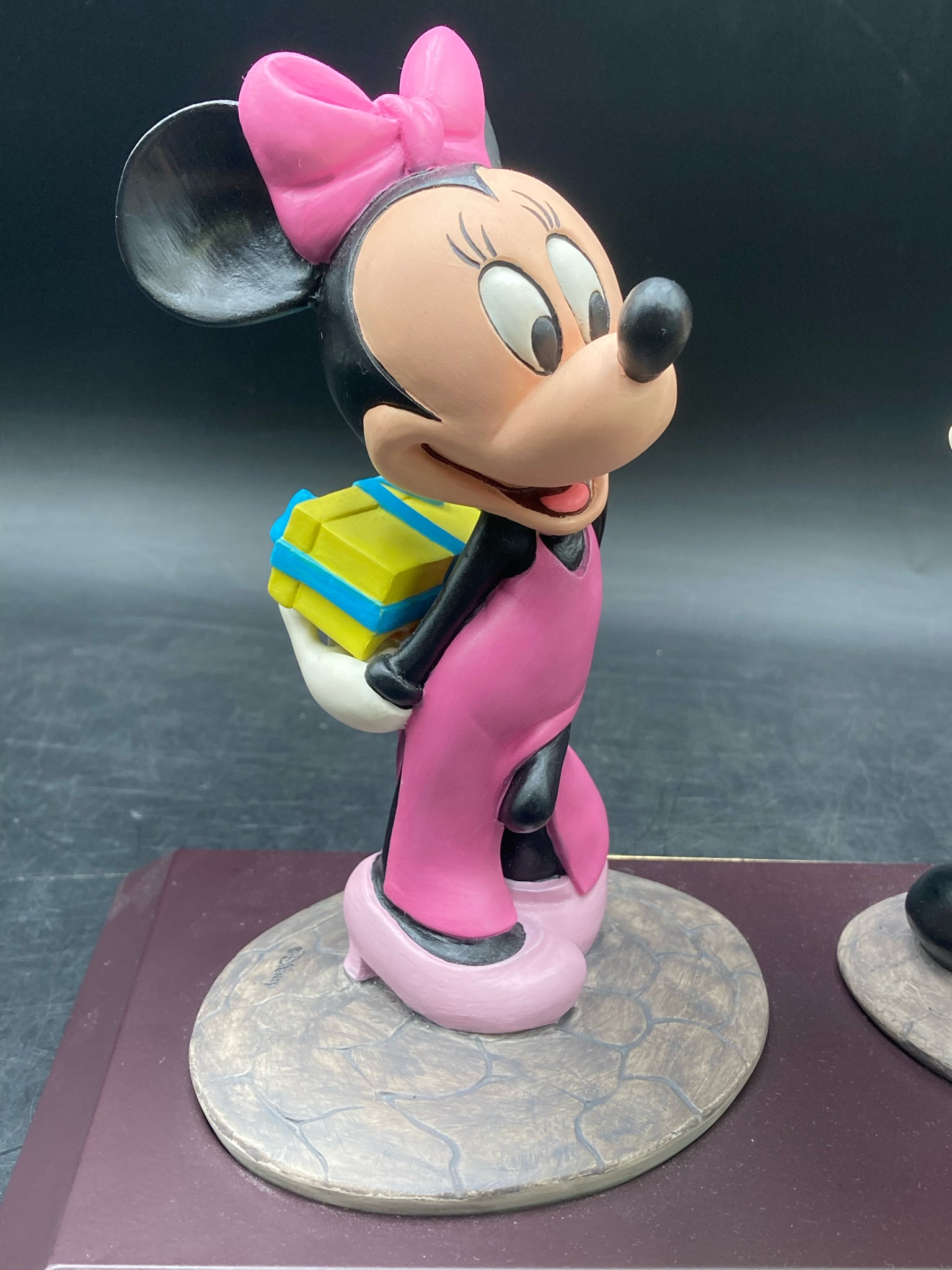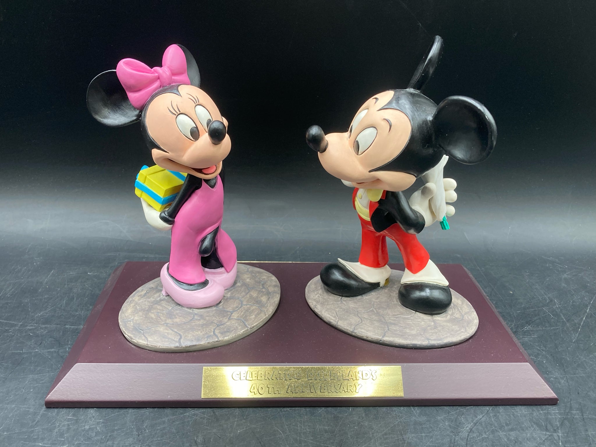 Disneyland 40th Anniversary signed limited edition Mickey and Minnie figure. Figure was released at Disneyland as part of the park's 40th anniversary celebration. Colorful and cute modeling of Mickey and Minnie surprising each other with gifts. Figure base is signed and dated by Disney artist Marc Delle. Figure is part of a limited run of only 1500 pieces. Figure measures 12" long and roughly 8" tall. Figure is in excellent condition with no damages or scuffs noted.
