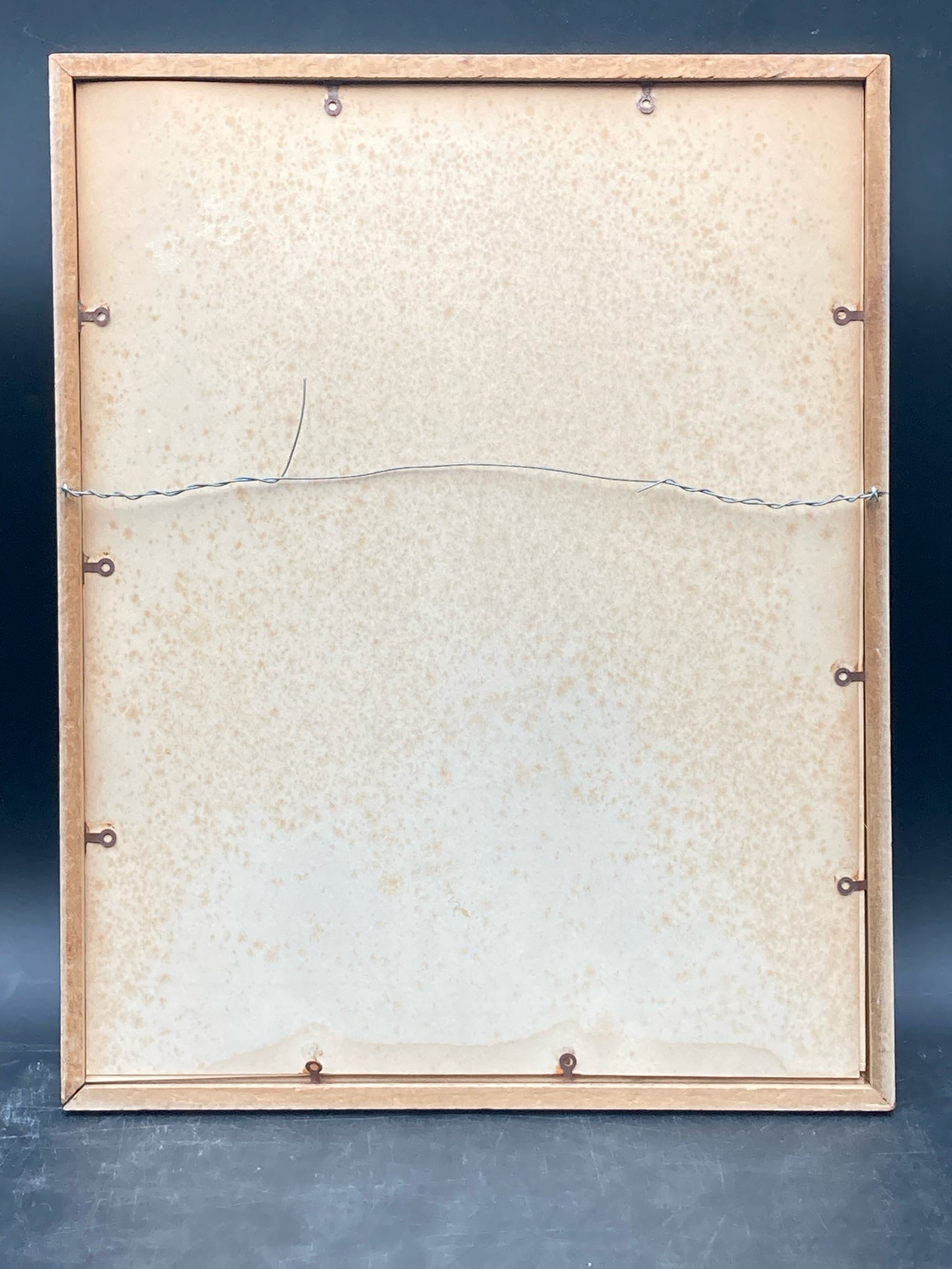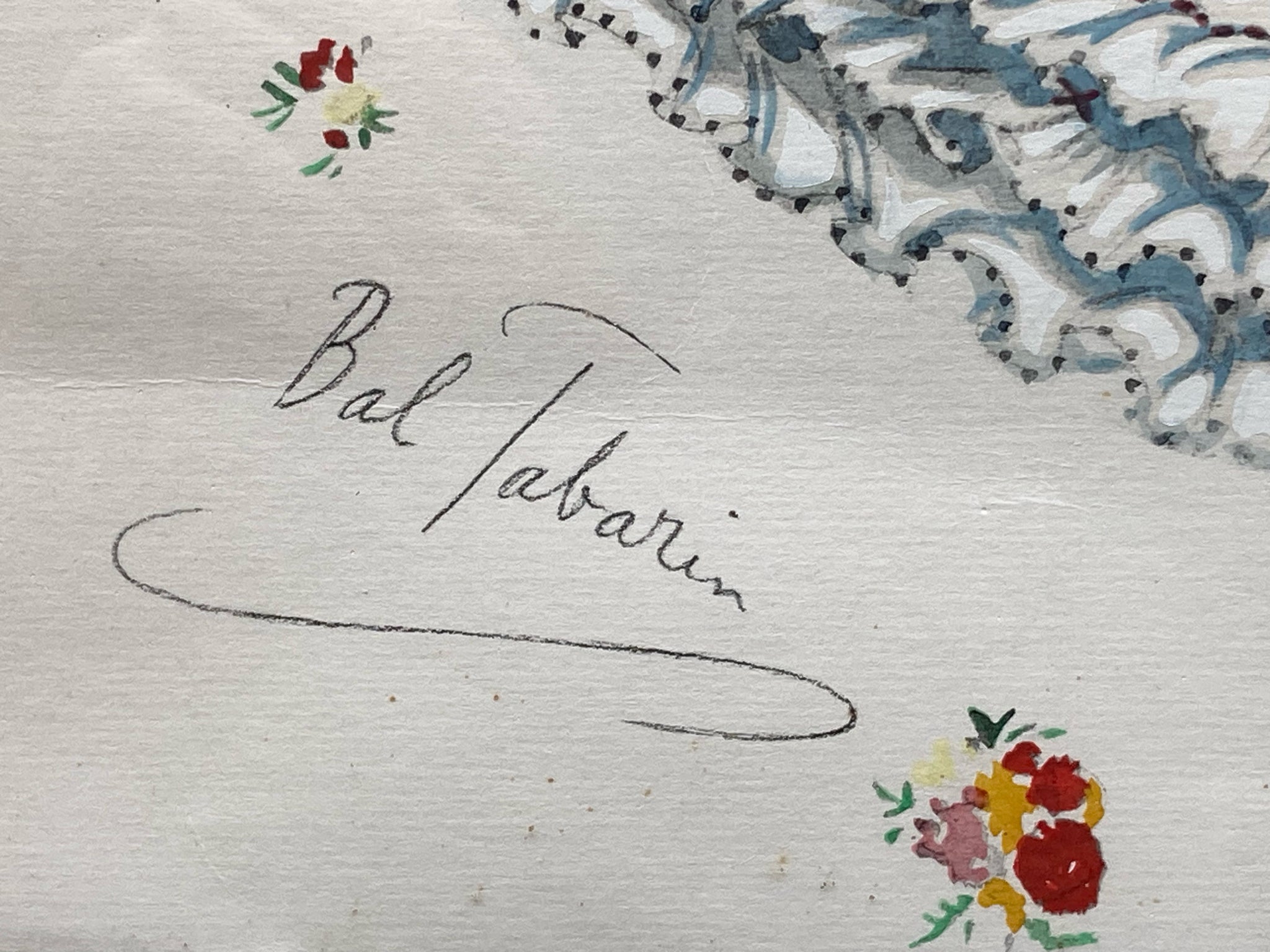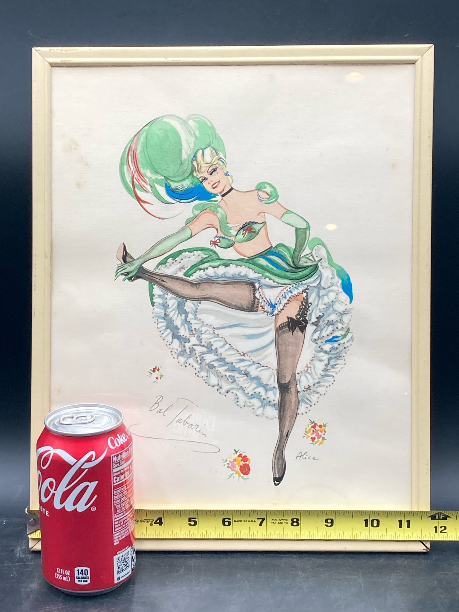 Original Alice Huertas signed "Bal Tabarin" colored drawing. Named after a famous Paris cabaret, this scene depicts a French woman dancing, a common theme of Huertas' works. Singed and titles in black charcoal pencil at bottom, noted in photos. Drawing measures 12" wide and 15" tall. SOme staining on inside glass and there is some light water staining at bottom of sketch, the area with the drawing itself is in good condition.