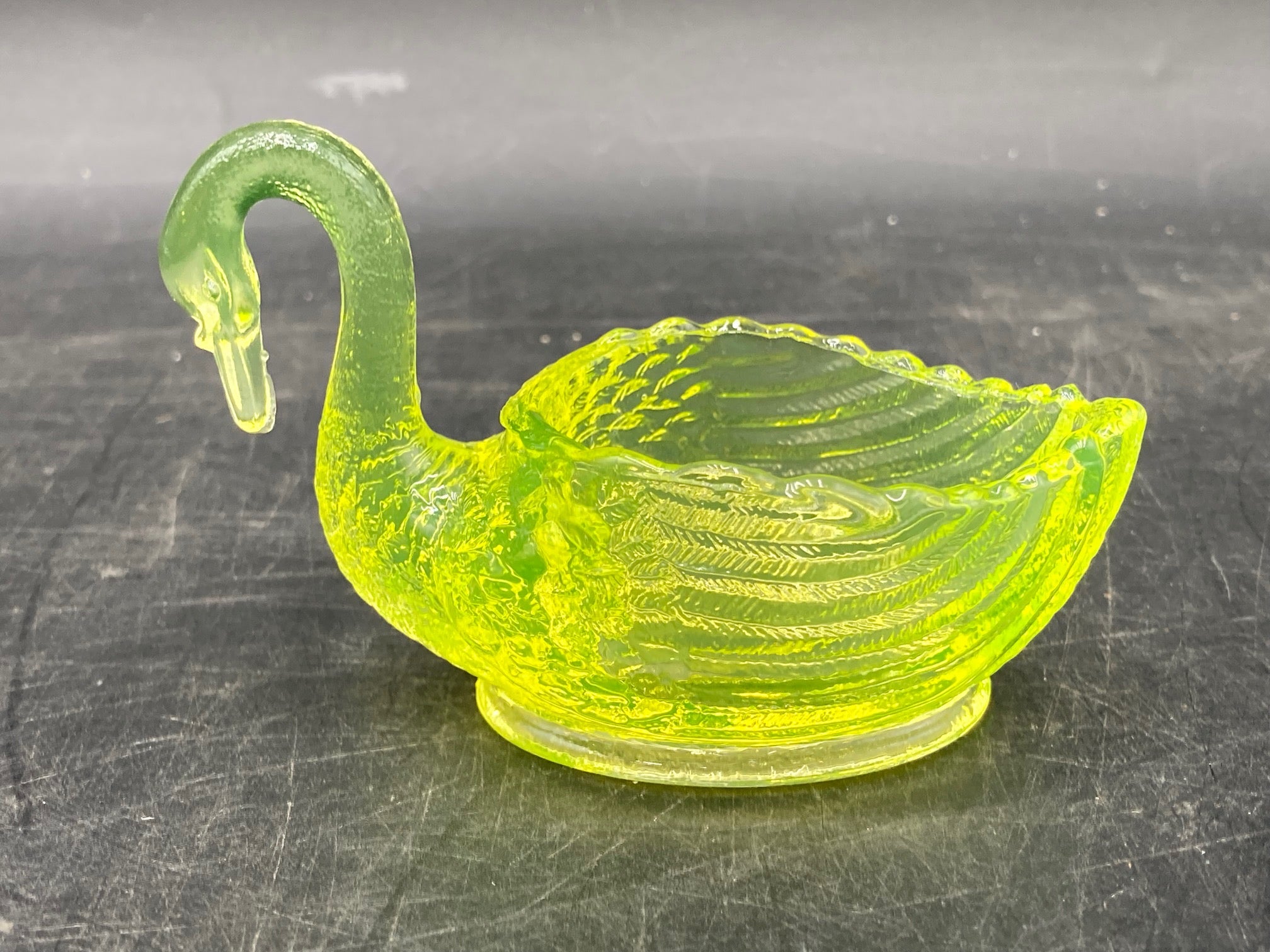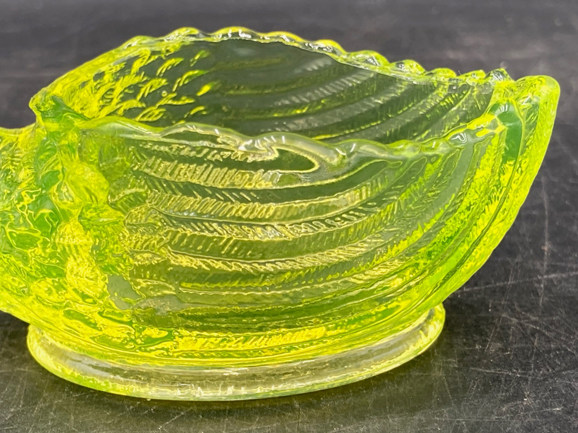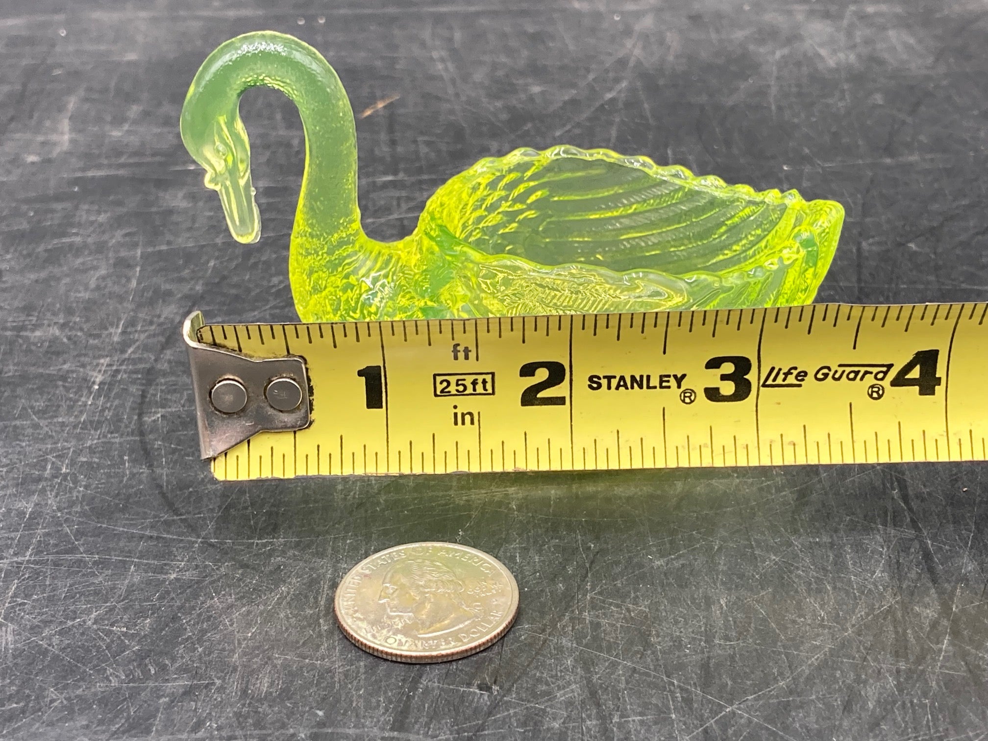 Antique 1930's Cambridge uranium glass swan dish. Yellow-Green colored glass with detailed feather pressings and swan neck and head. Glass glows under UV light, noted in photos. Dish measures 3 3/4" long. Dish is in excellent condition with no noted cracks or chips.