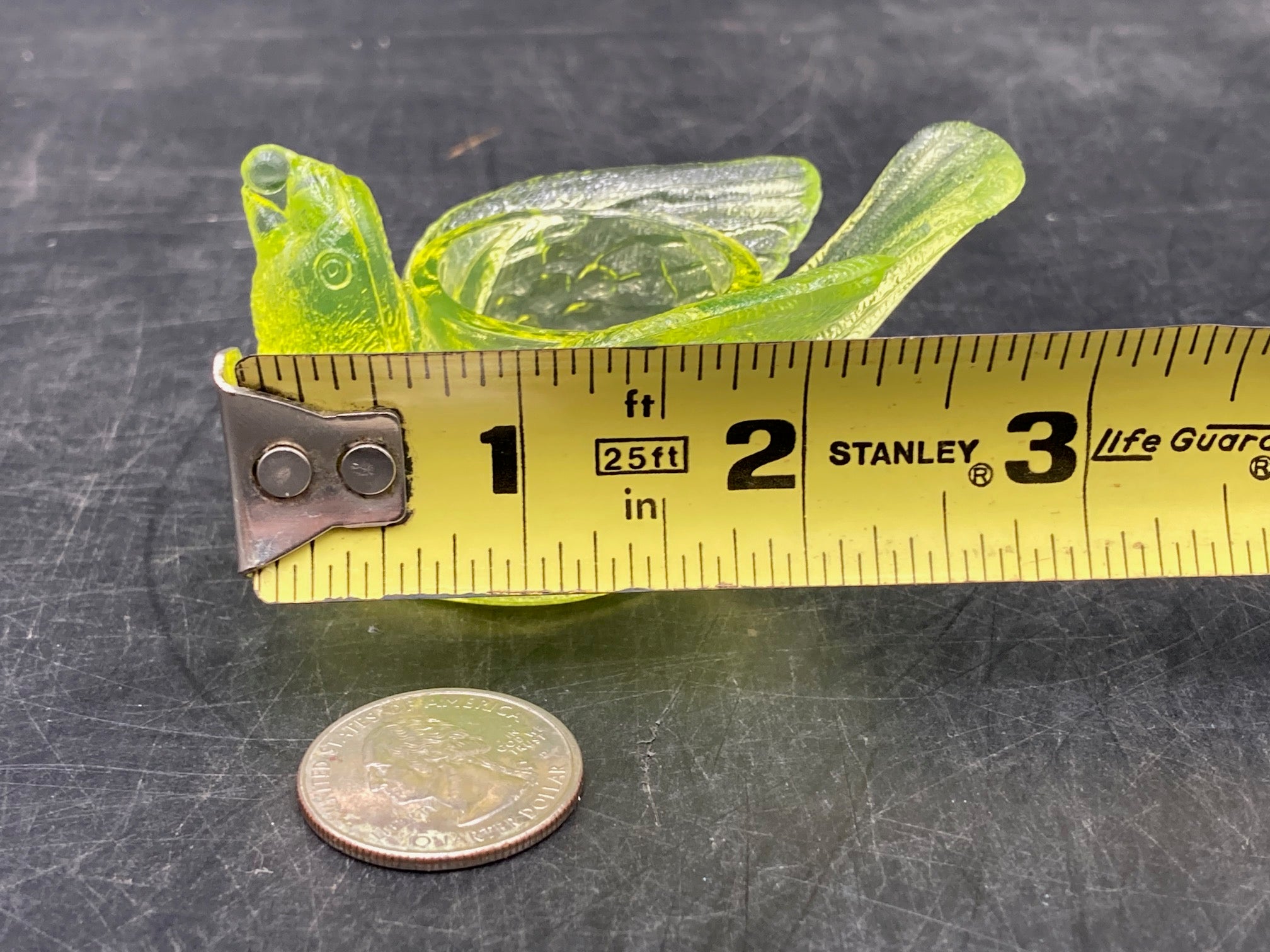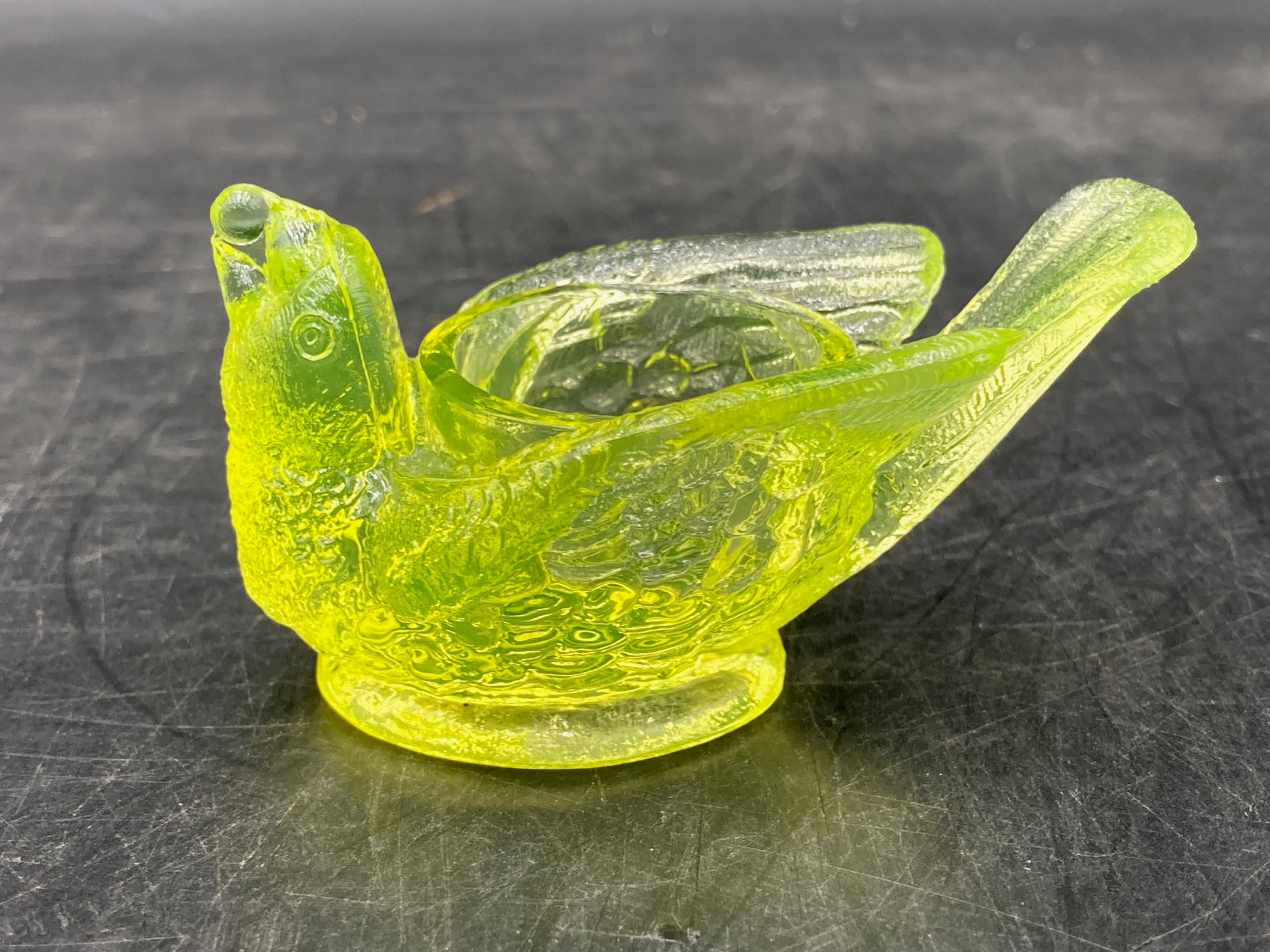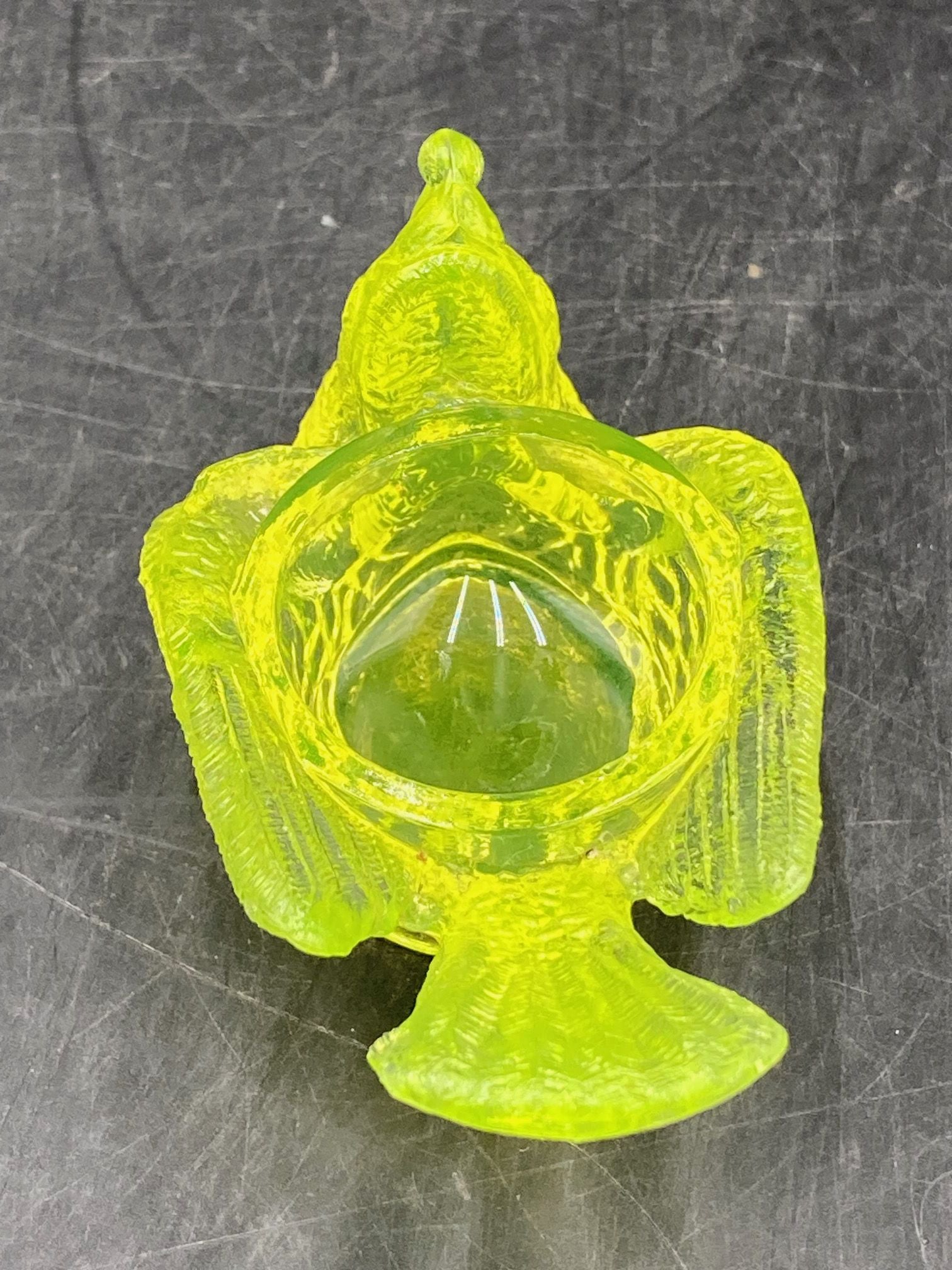 Antique Degenhart vaseline glass bird candle holder. Circa 1930s. Yellow-Green colored glass bird figurine with detailed feather pressings and a candlestick holder in the middle. Glows under UV light, noted in photos. Holder measures 3" long. Item is in excellent condition with no noted breaks or cracks.