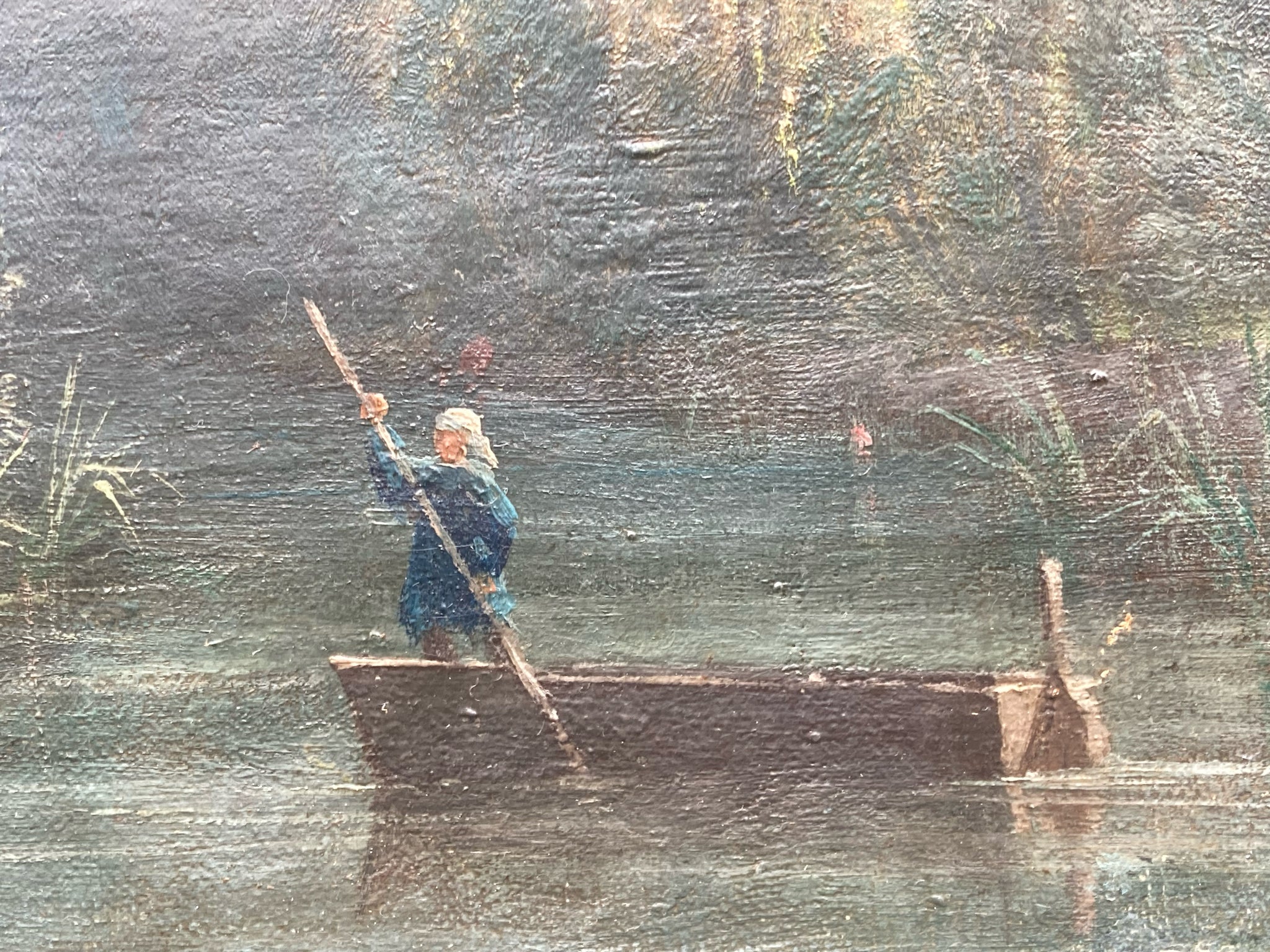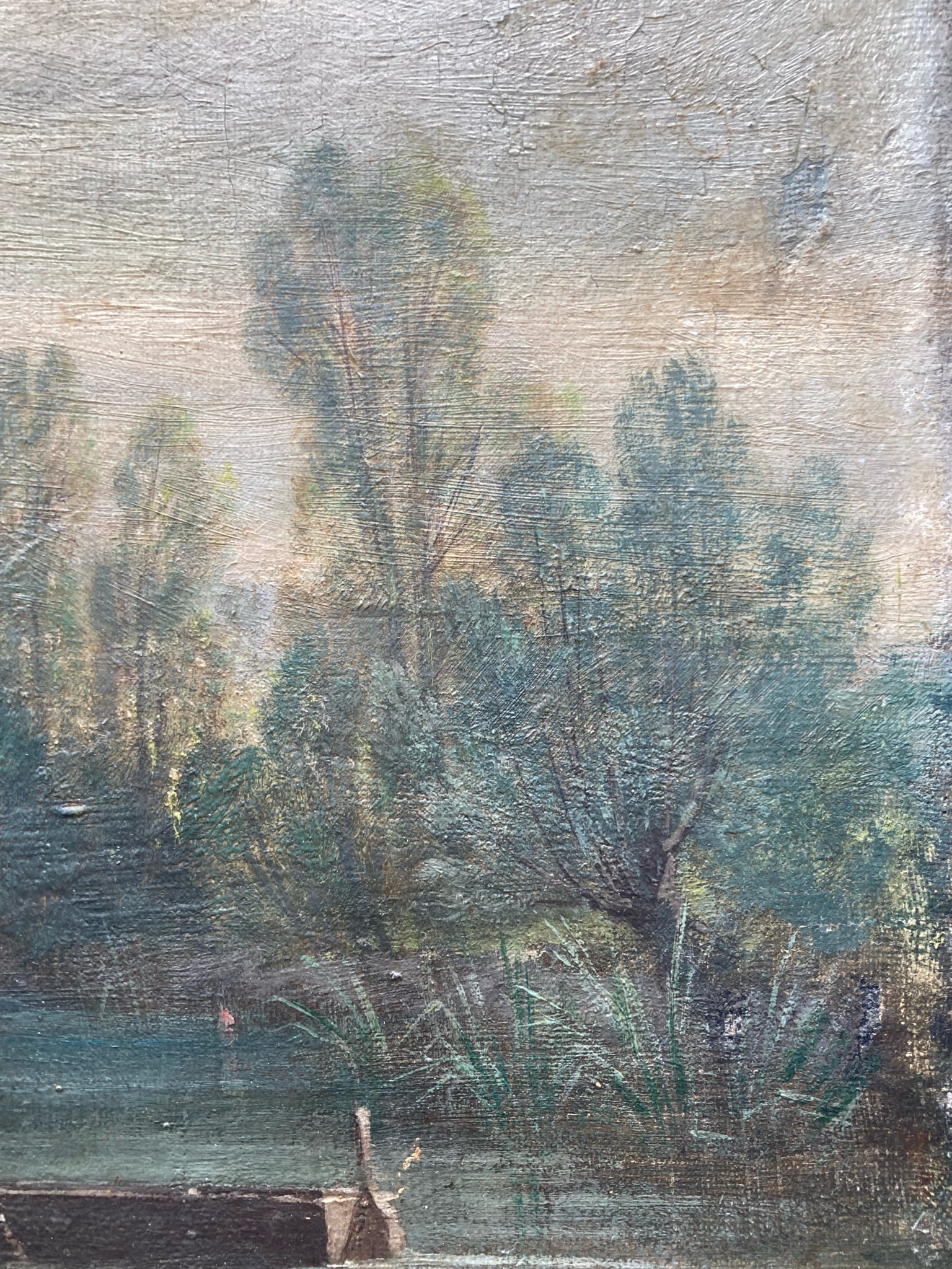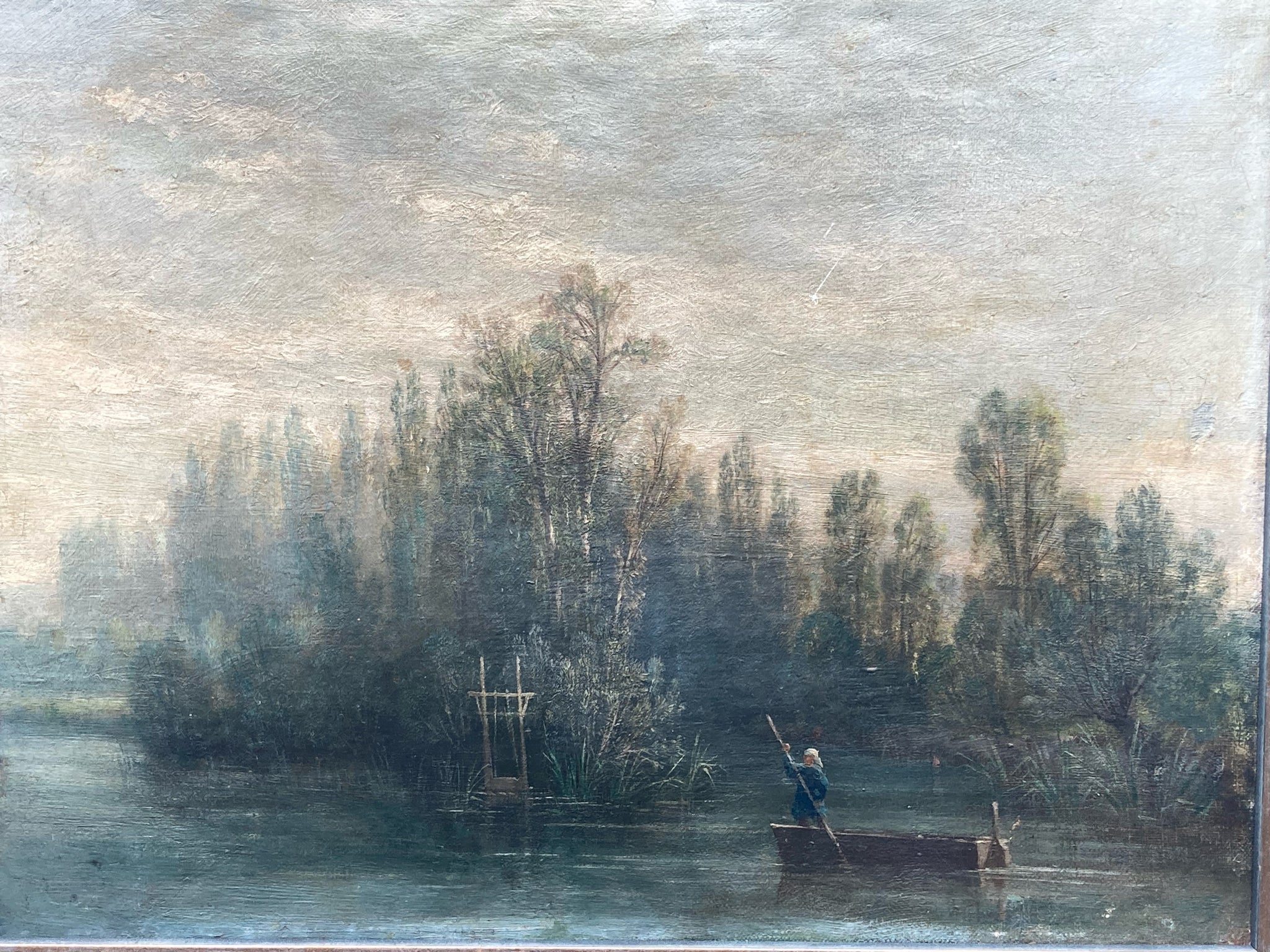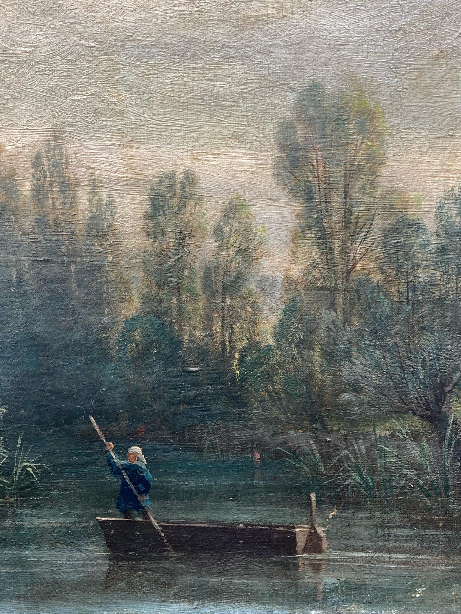 Antique French Barbizon school style painting. Oil on canvas. Undated, likely mid to late 19th century based on age of canvas and style. Depicts scene of a woman on a row boat in a tranquil lake using brooding, muted color tones. Style of is reminiscent of Jean Baptiste Camille Corot, though this can't be confirmed with certainty. Painting measures 11" tall by 14" long, total size with frame is 13" tall and 16" long. Unsigned on front, backside paper removed to examine back of canvas, no dates stamps or signatures noted. Some areas of wear to canvas are noted in photos, overall painting is in good, display worthy condition.