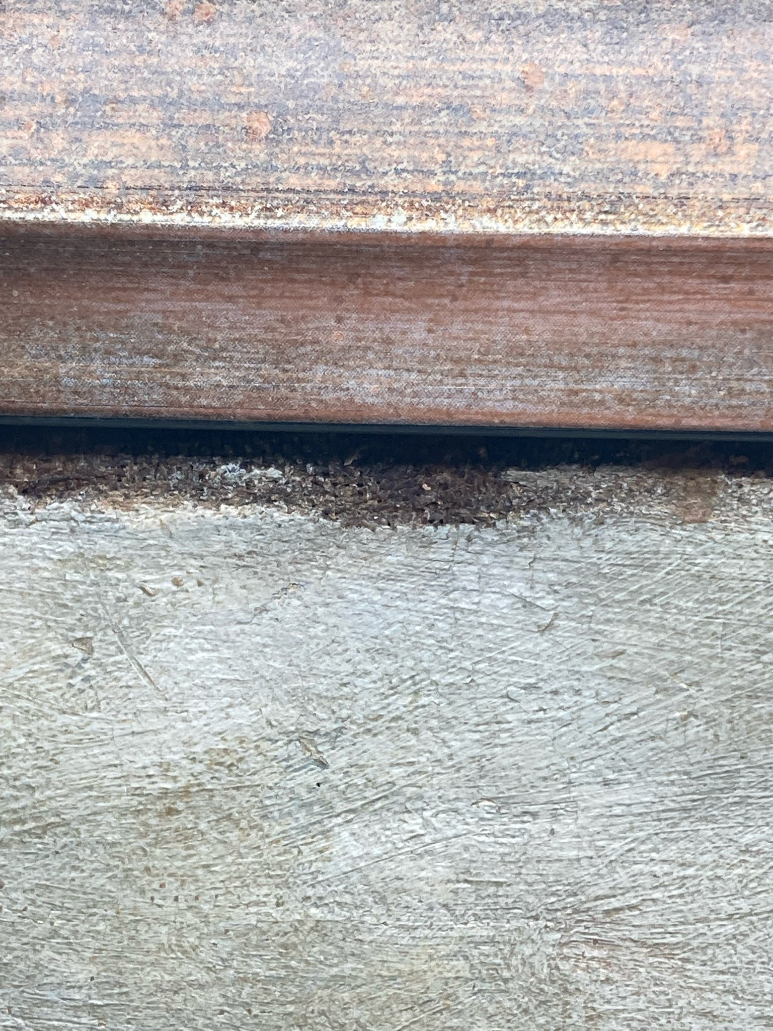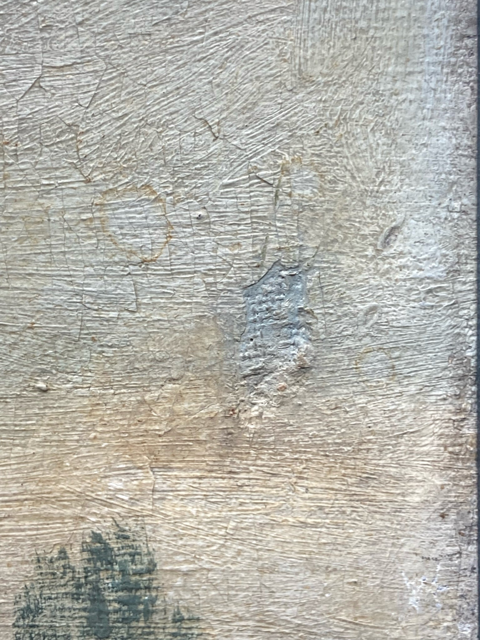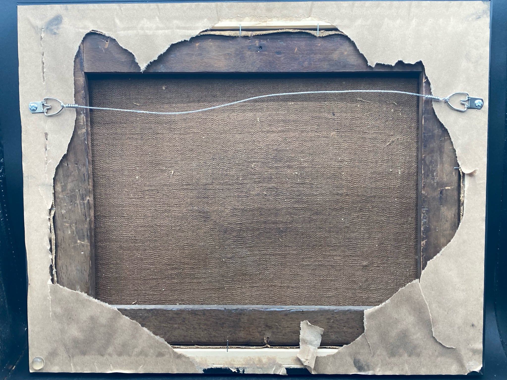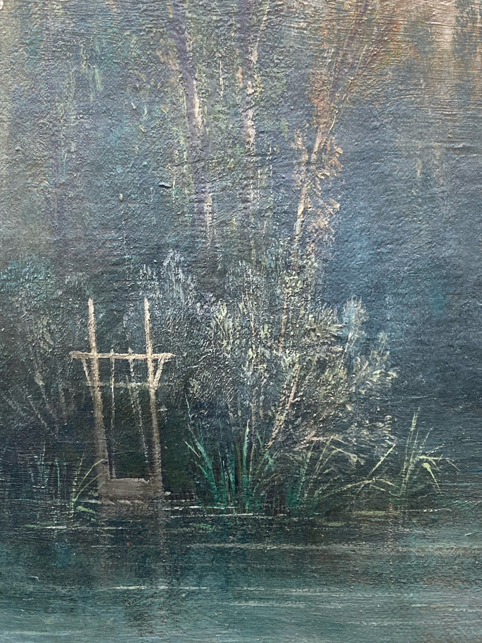 Antique French Barbizon school style painting. Oil on canvas. Undated, likely mid to late 19th century based on age of canvas and style. Depicts scene of a woman on a row boat in a tranquil lake using brooding, muted color tones. Style of is reminiscent of Jean Baptiste Camille Corot, though this can't be confirmed with certainty. Painting measures 11" tall by 14" long, total size with frame is 13" tall and 16" long. Unsigned on front, backside paper removed to examine back of canvas, no dates stamps or signatures noted. Some areas of wear to canvas are noted in photos, overall painting is in good, display worthy condition.