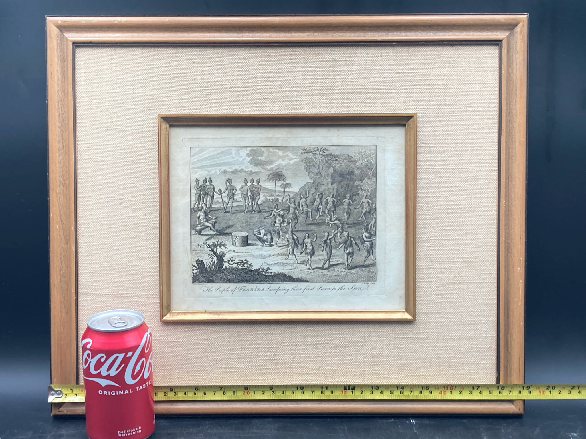 Antique framed and matted J. Lodge print. Dated to 1778. Print depicts the native americans of Florida performing a ritual sacrifice of a first born child to the sun god. Print measures 7" tall by 9" wide, total size with frame is 16" tall by 19" wide. Print is in excellent condition given its age. Unique piece of Florida history!