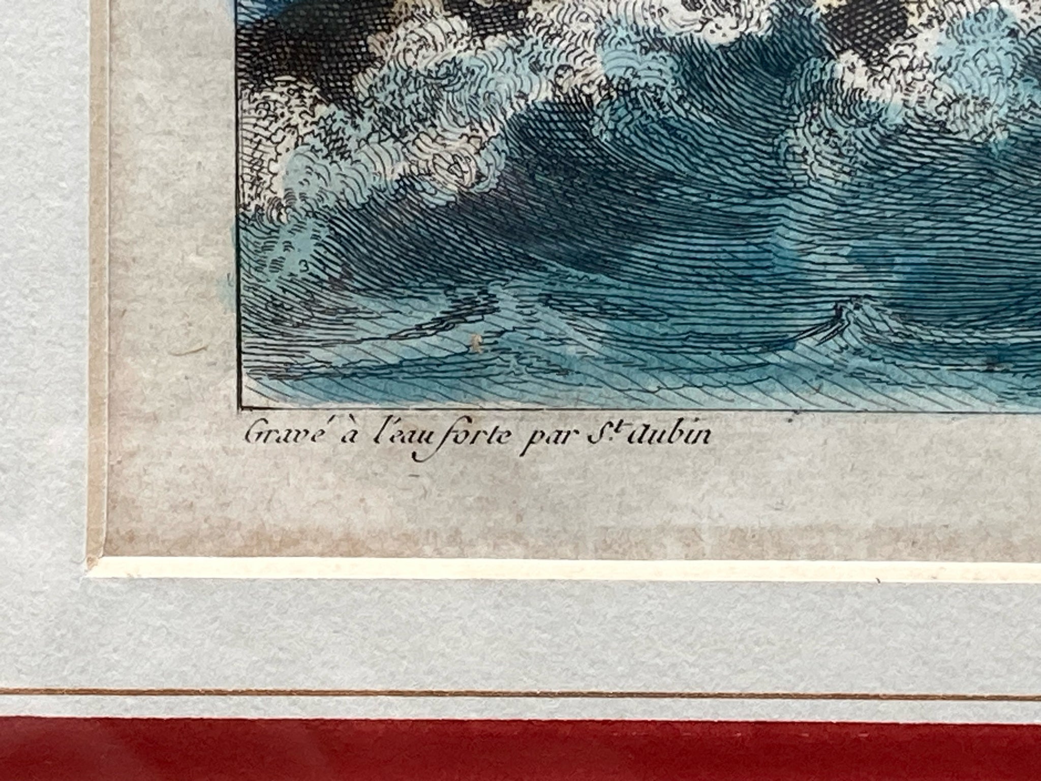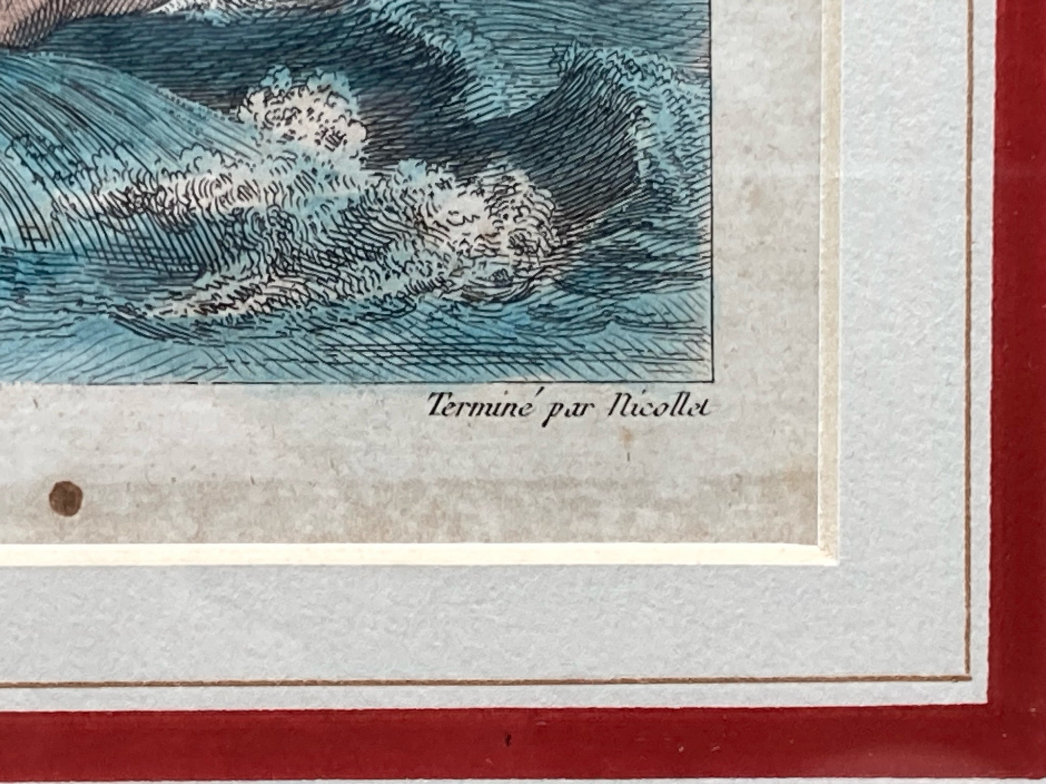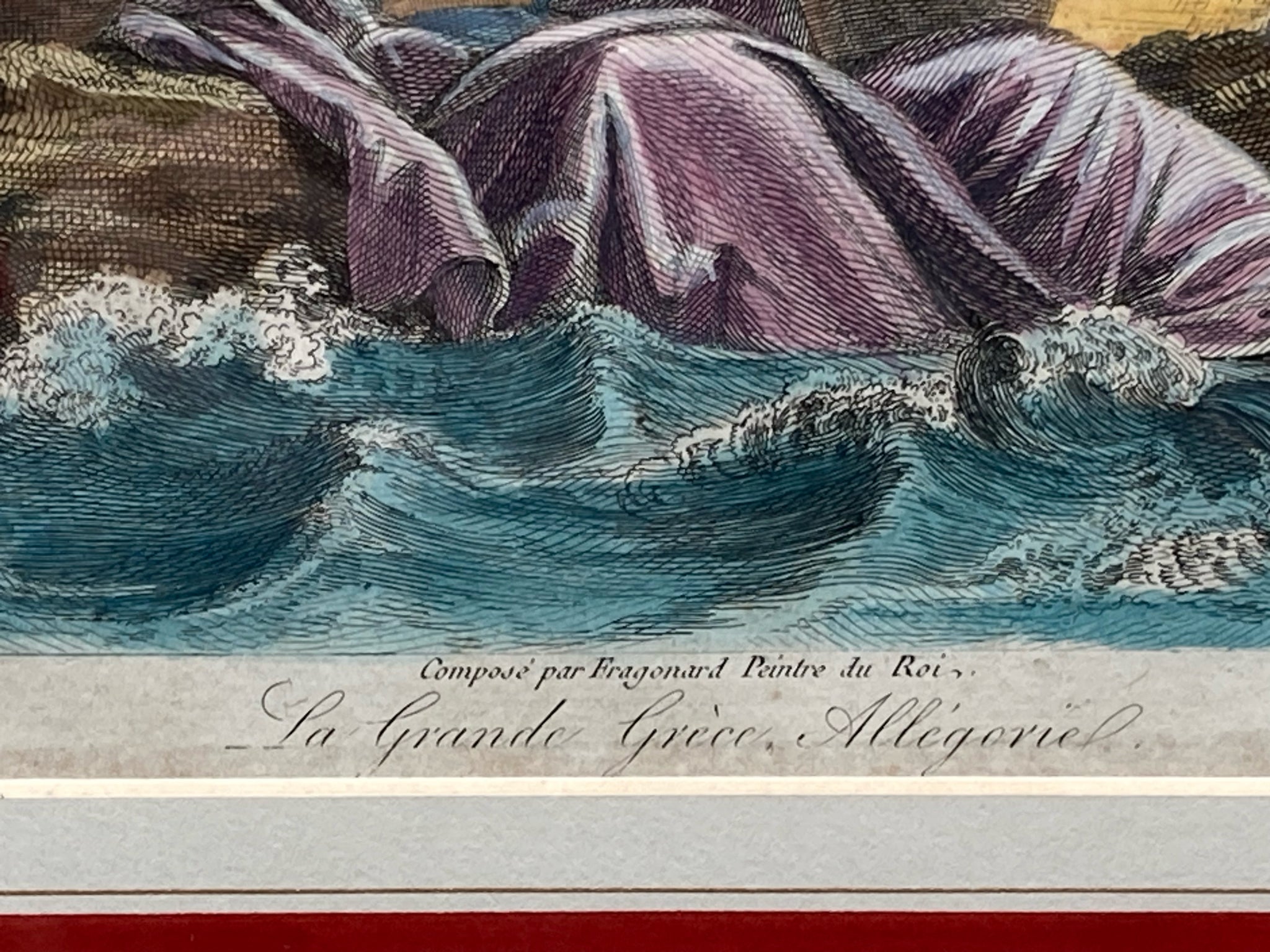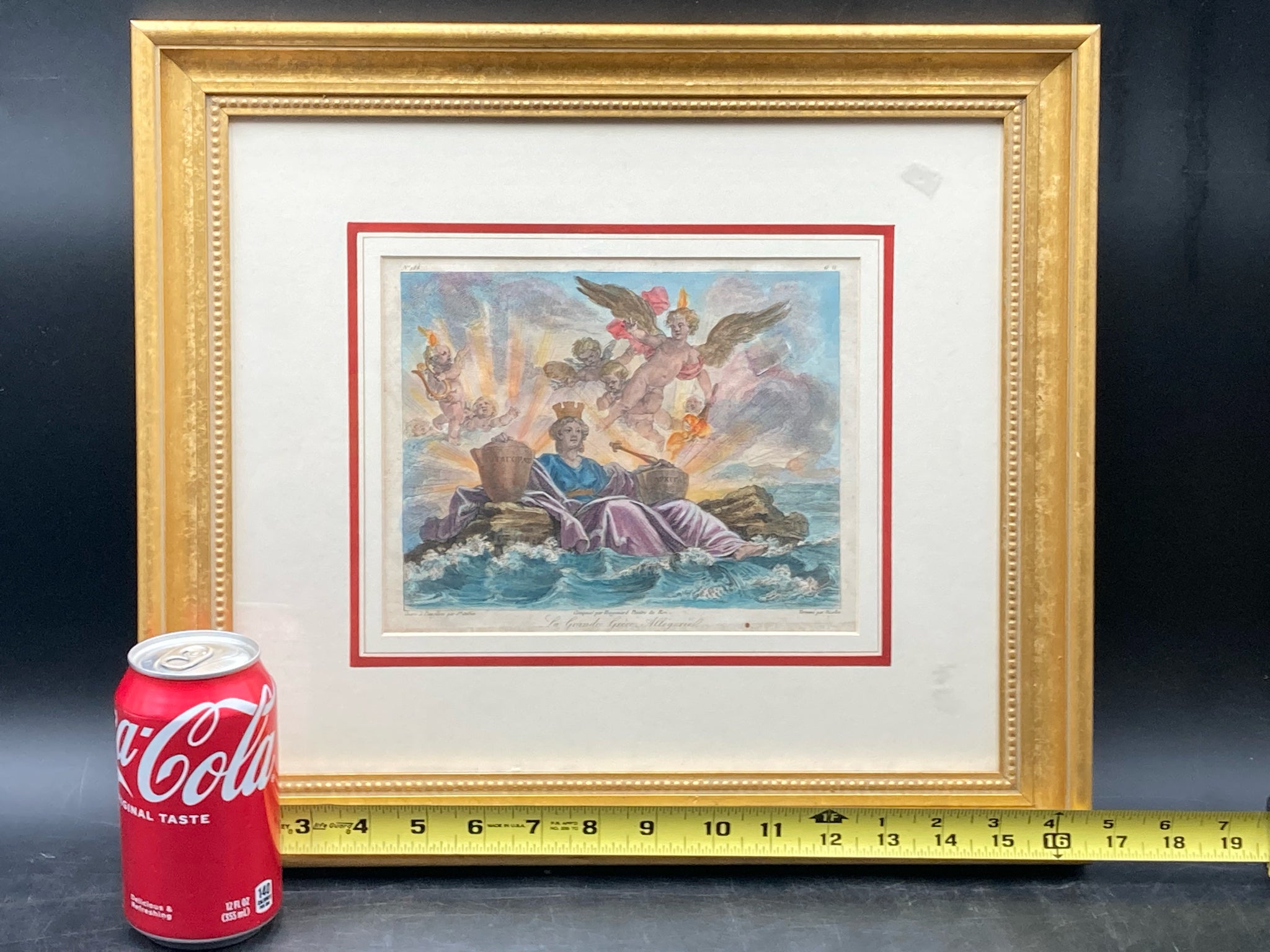 Antique framed and matted "The kingdom of Naples" hand colored engraving. Engraving is based on an original painting from 1730 and features high level of detail and faithful color rendition. Bottom of engraving has inscriptions in Italian with further information on the engraving. Engraving is given a gold tone wood frame with ornate pattern wor. Engraving measures 7" tall by 9" wide, total size with frame is 13" tall and 15" wide. One area of repair to torn area is noted in photos, and frame has some general light wear.
