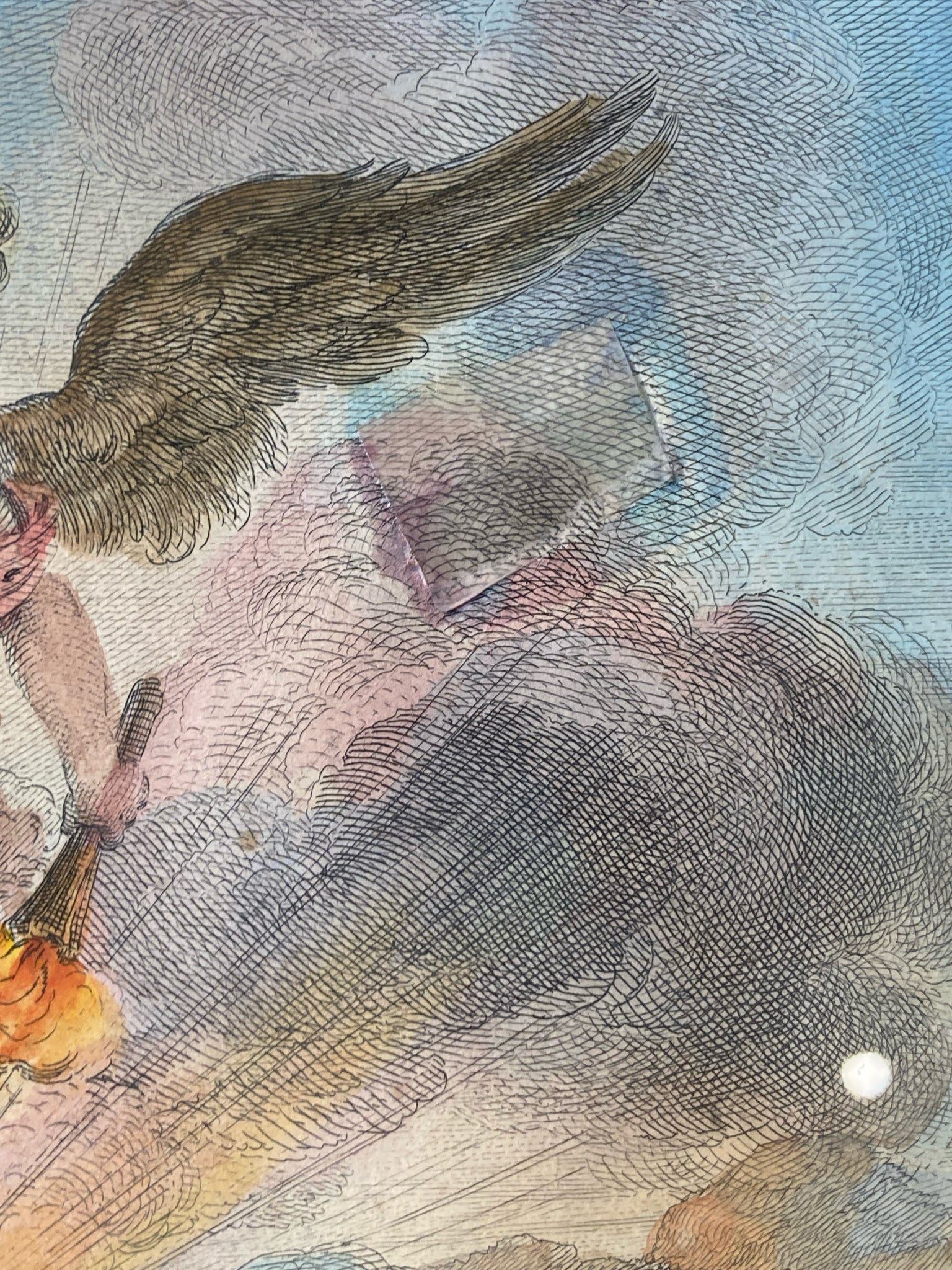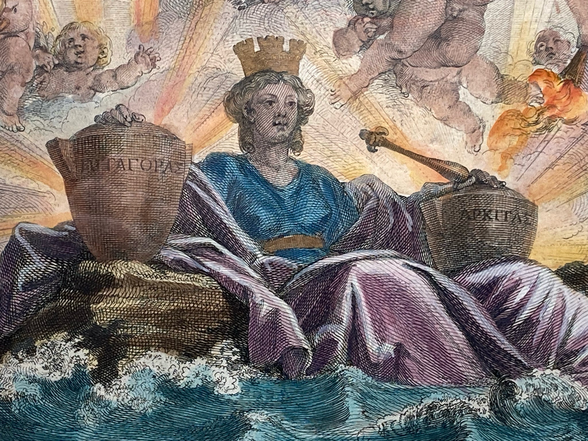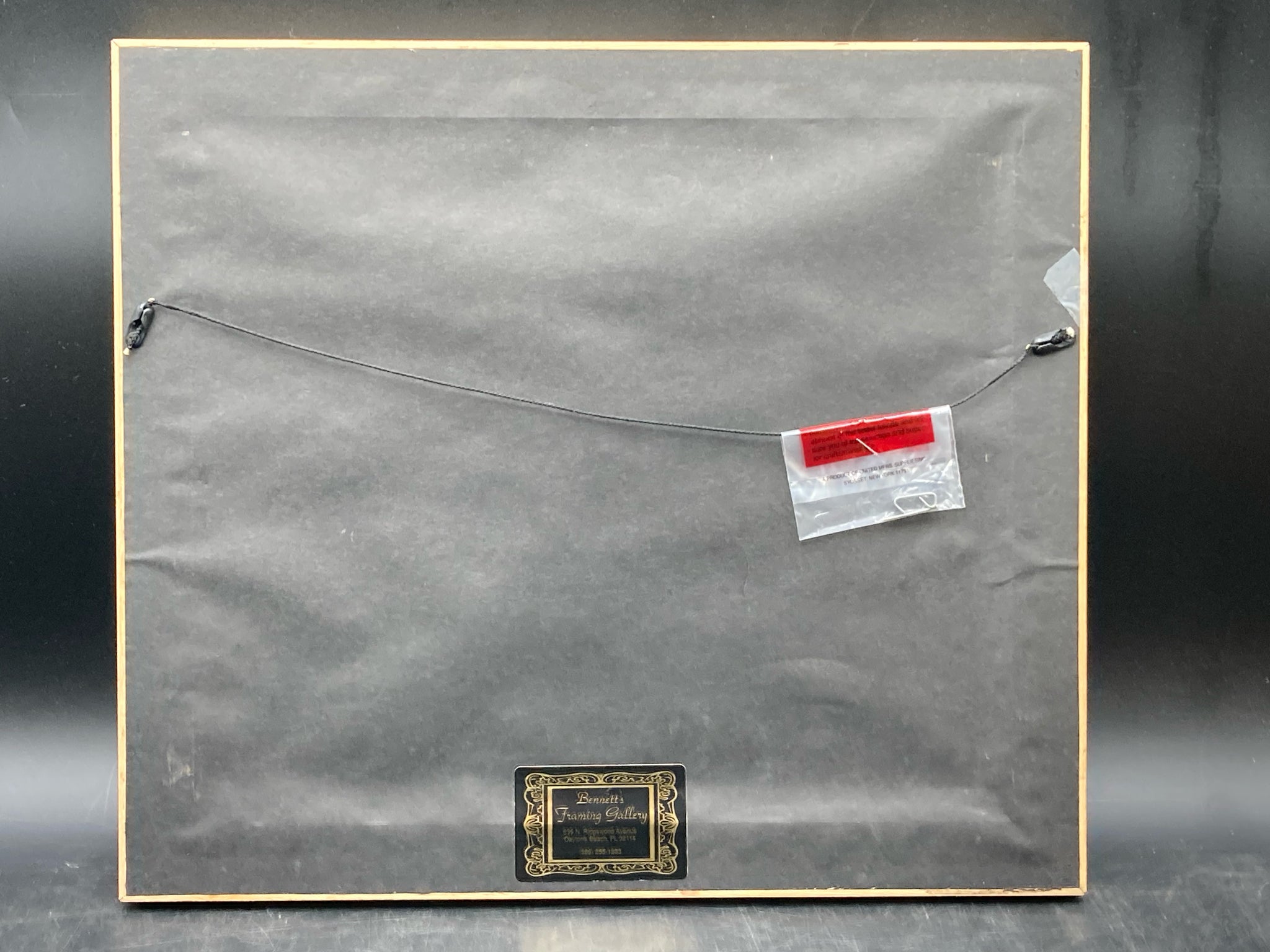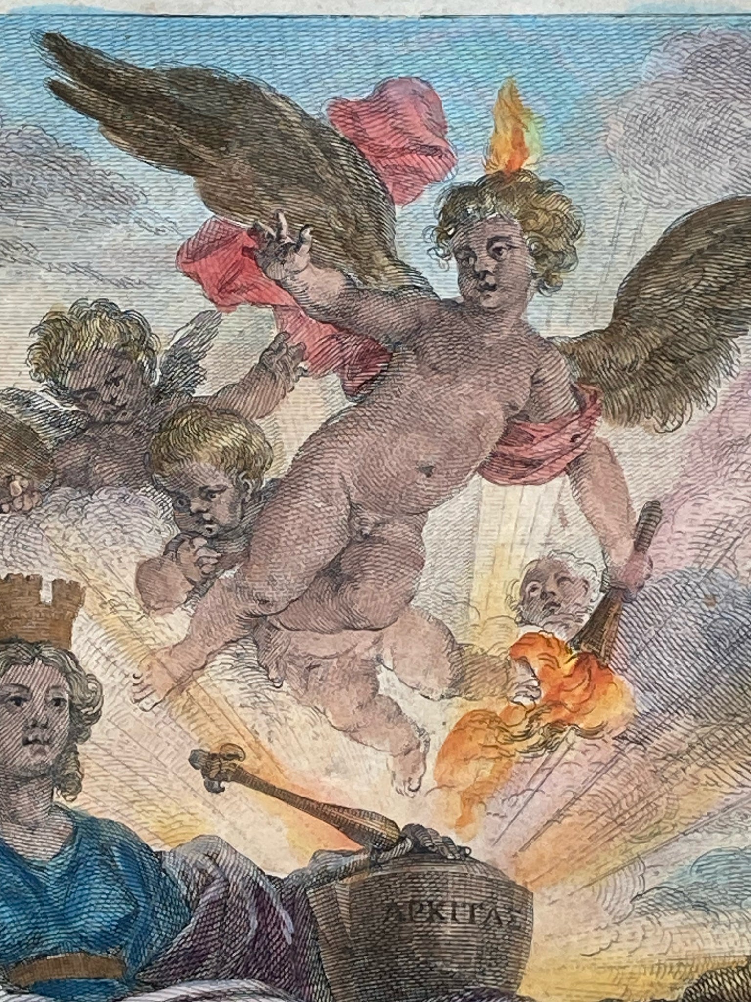 Antique framed and matted "The kingdom of Naples" hand colored engraving. Engraving is based on an original painting from 1730 and features high level of detail and faithful color rendition. Bottom of engraving has inscriptions in Italian with further information on the engraving. Engraving is given a gold tone wood frame with ornate pattern wor. Engraving measures 7" tall by 9" wide, total size with frame is 13" tall and 15" wide. One area of repair to torn area is noted in photos, and frame has some general light wear.