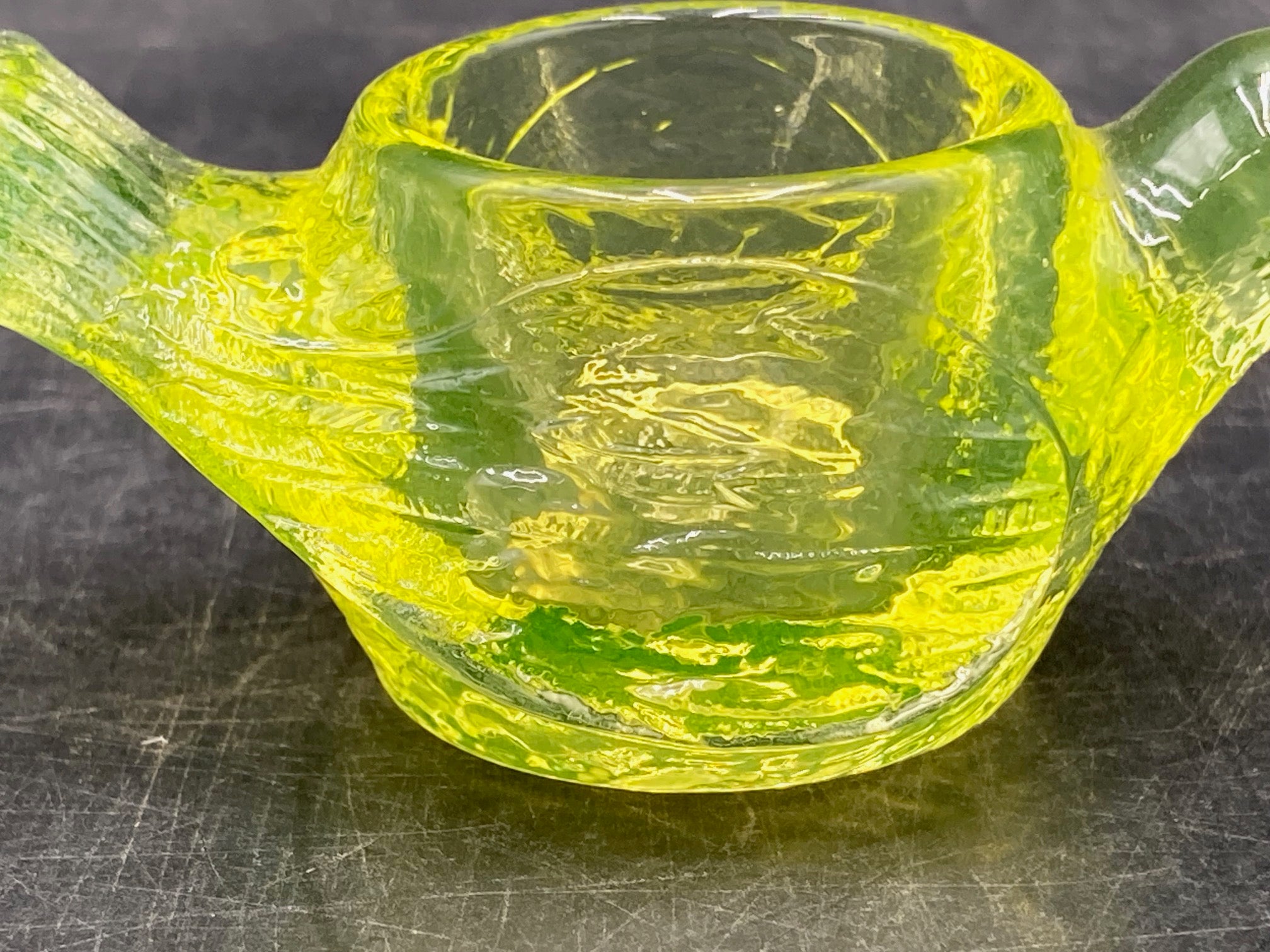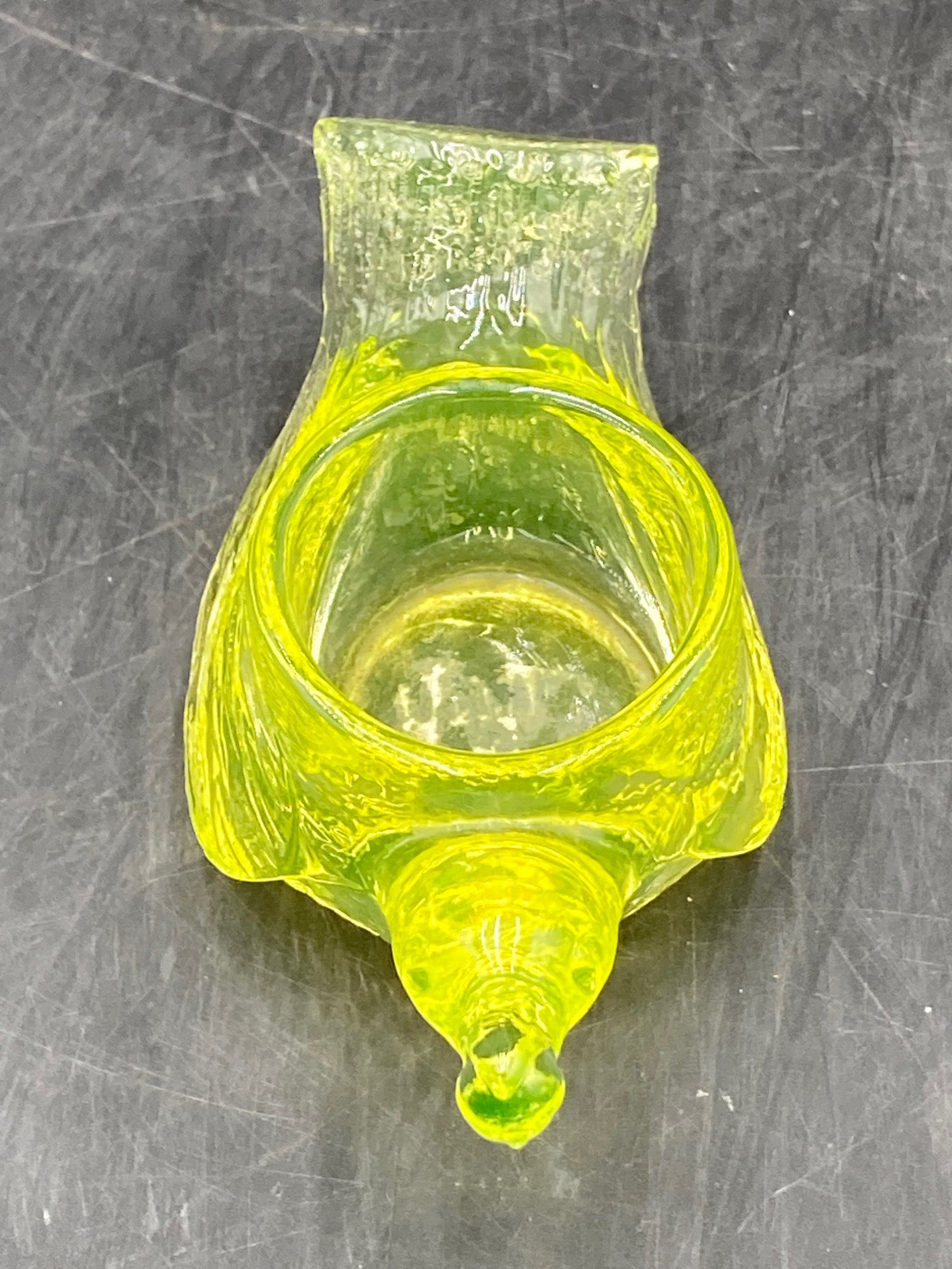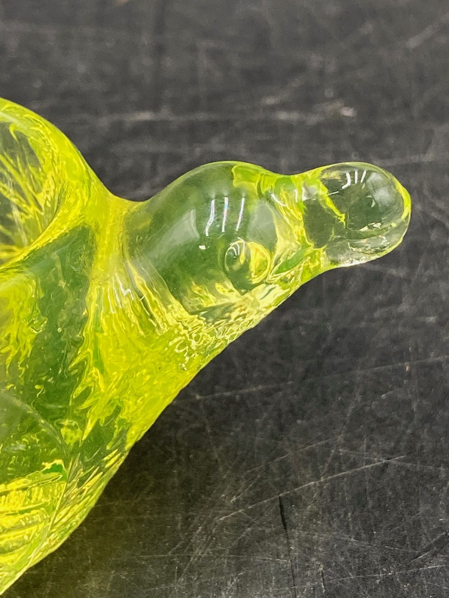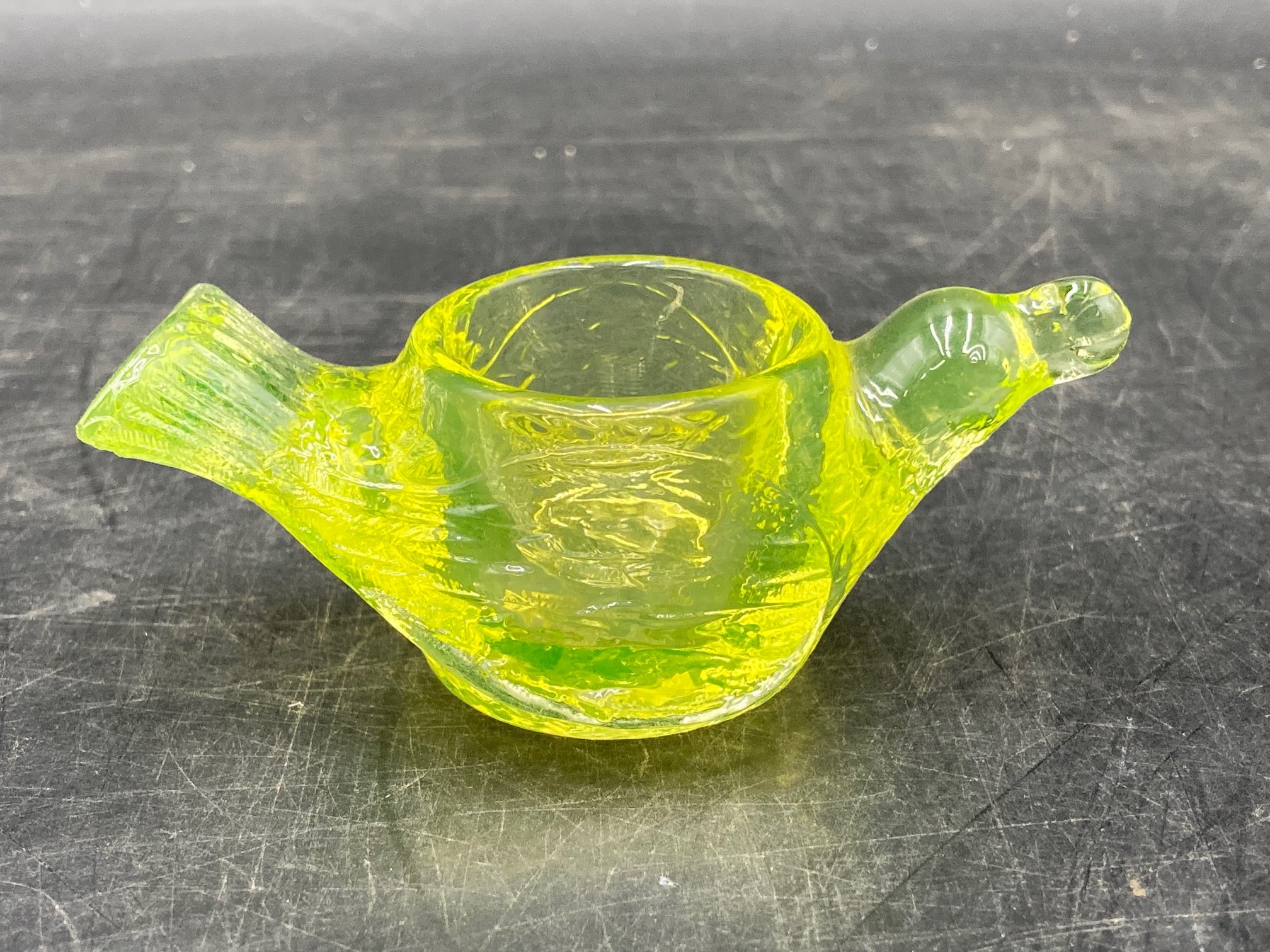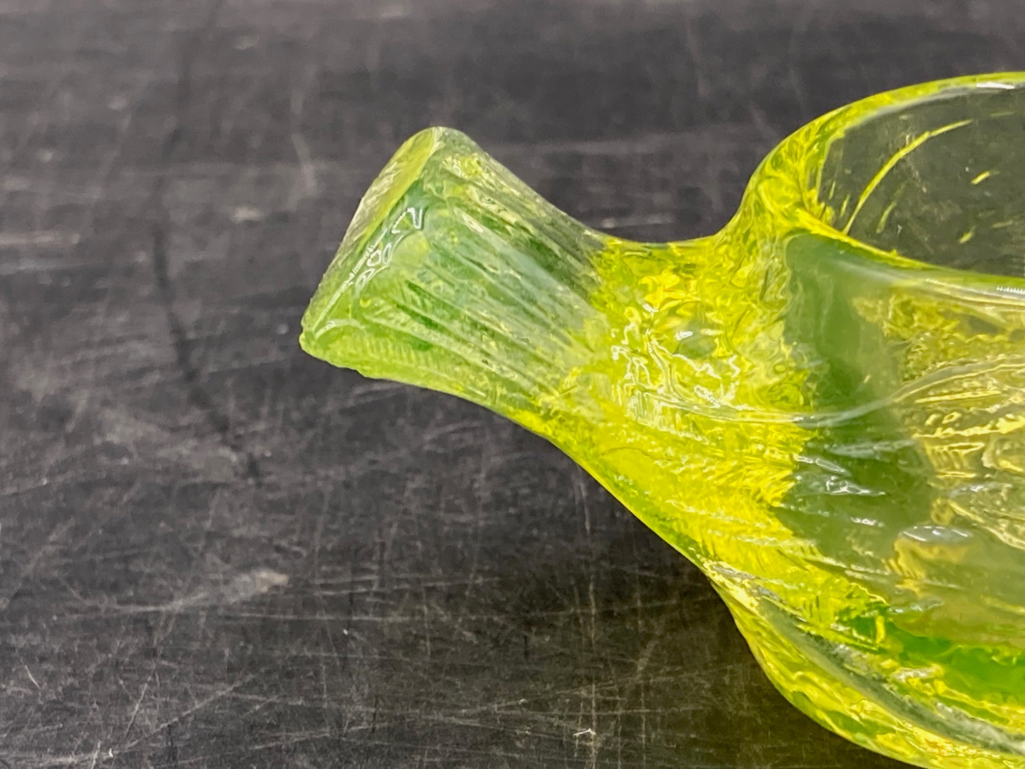 Antique vaseline glass bird salt cellar. Yellow-Green colored glass bird figure with detailed feather pressings and a central salt holder. Glass glows under UV light. Figure measures 3.5" long. Figure is in excellent condition with no noted chips or crack
