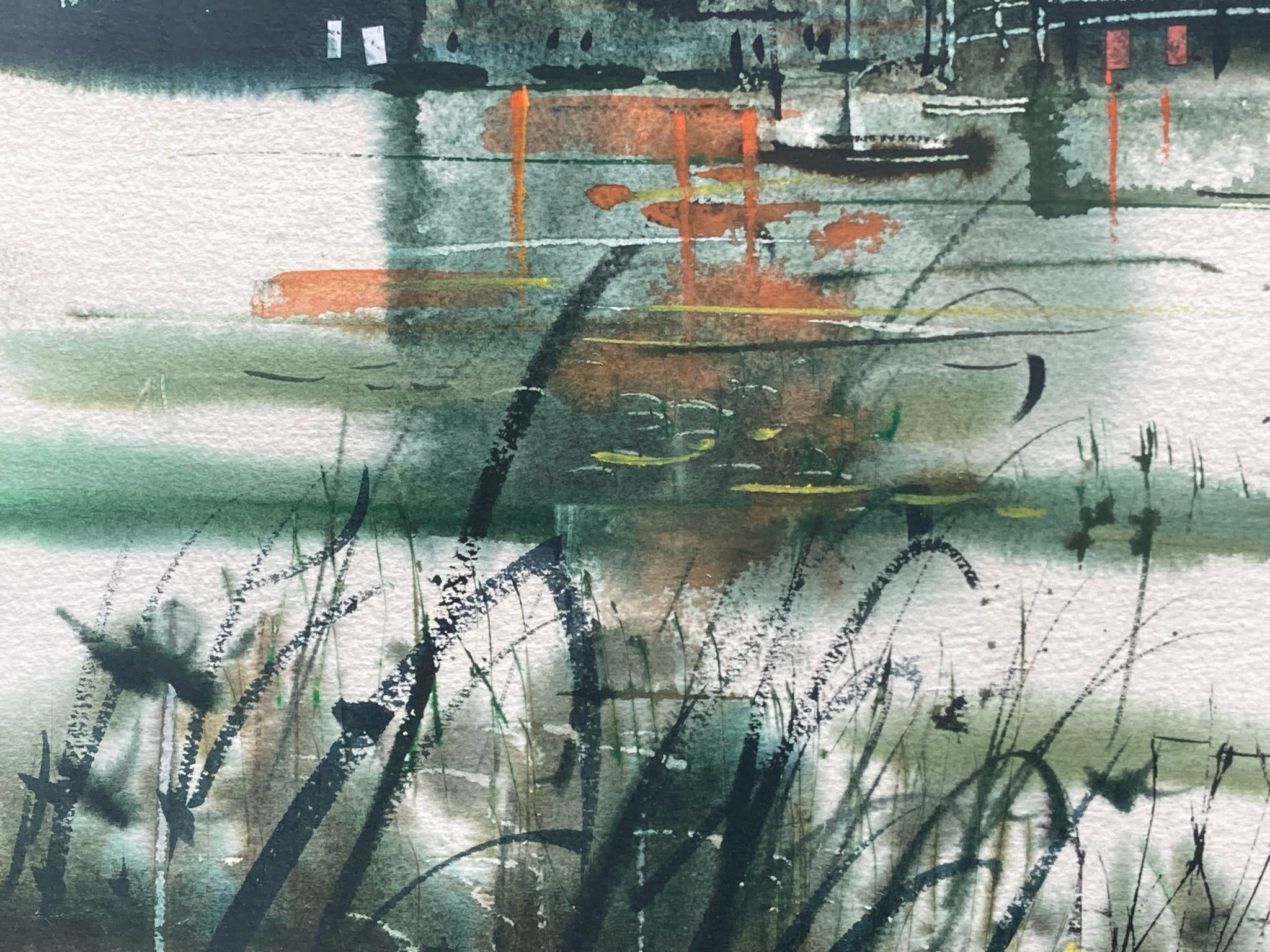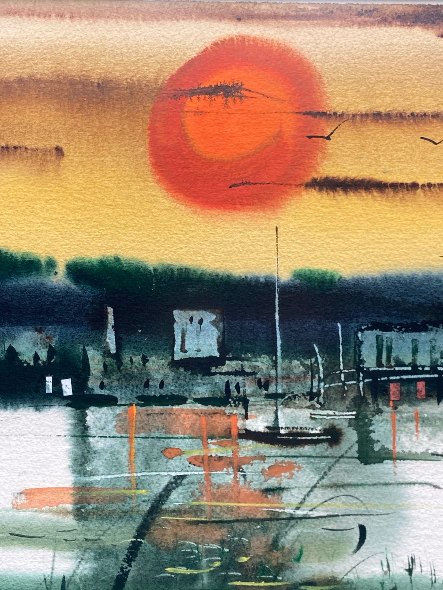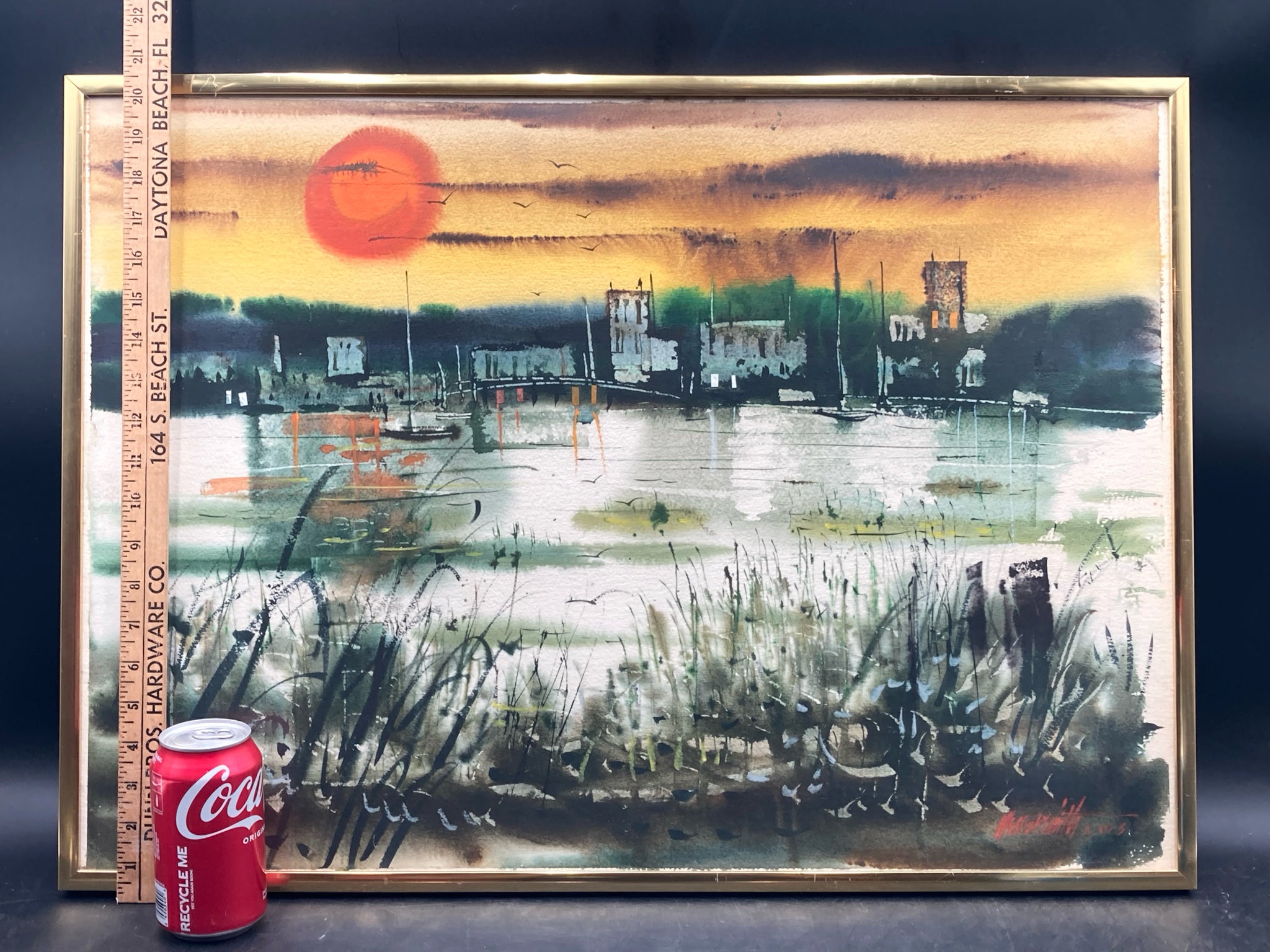 Original artist signed Asian style painting. Watercolor on paper. Sunset scene on a harbor town with reeds in the foreground. Painting is signed in lower left corner by the artist, the name is difficult to properly make out. Total size with frame measures 20" tall by 28" wide. Painting is in excellent condition.