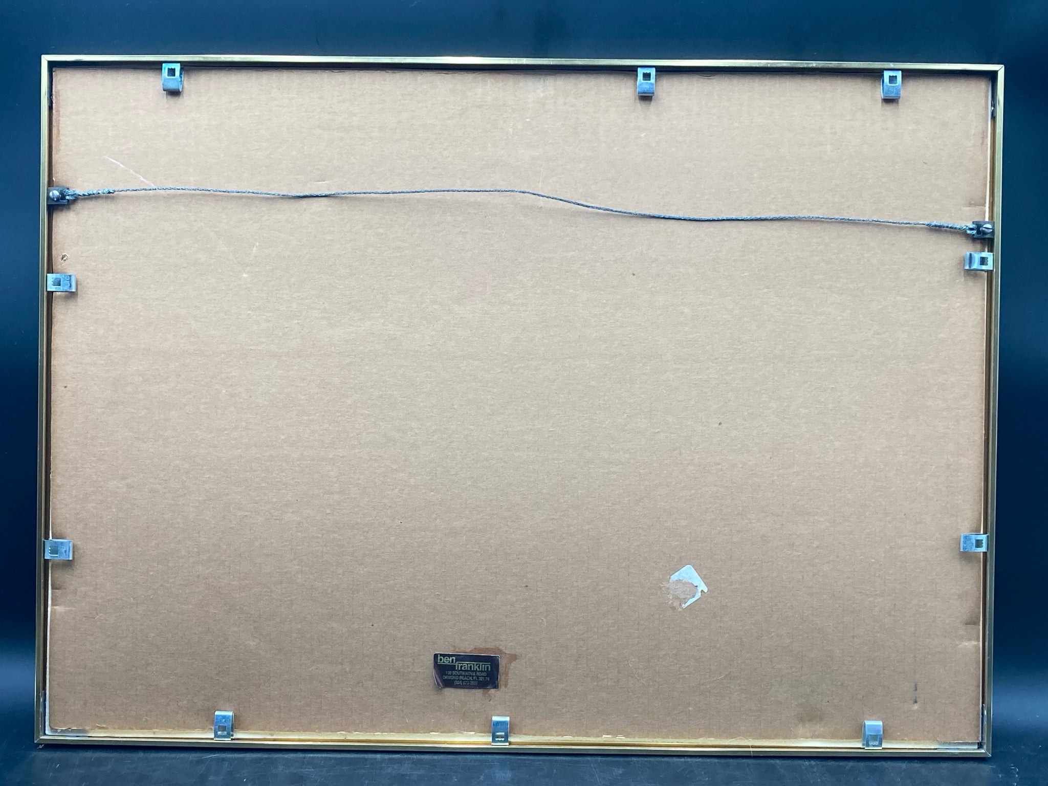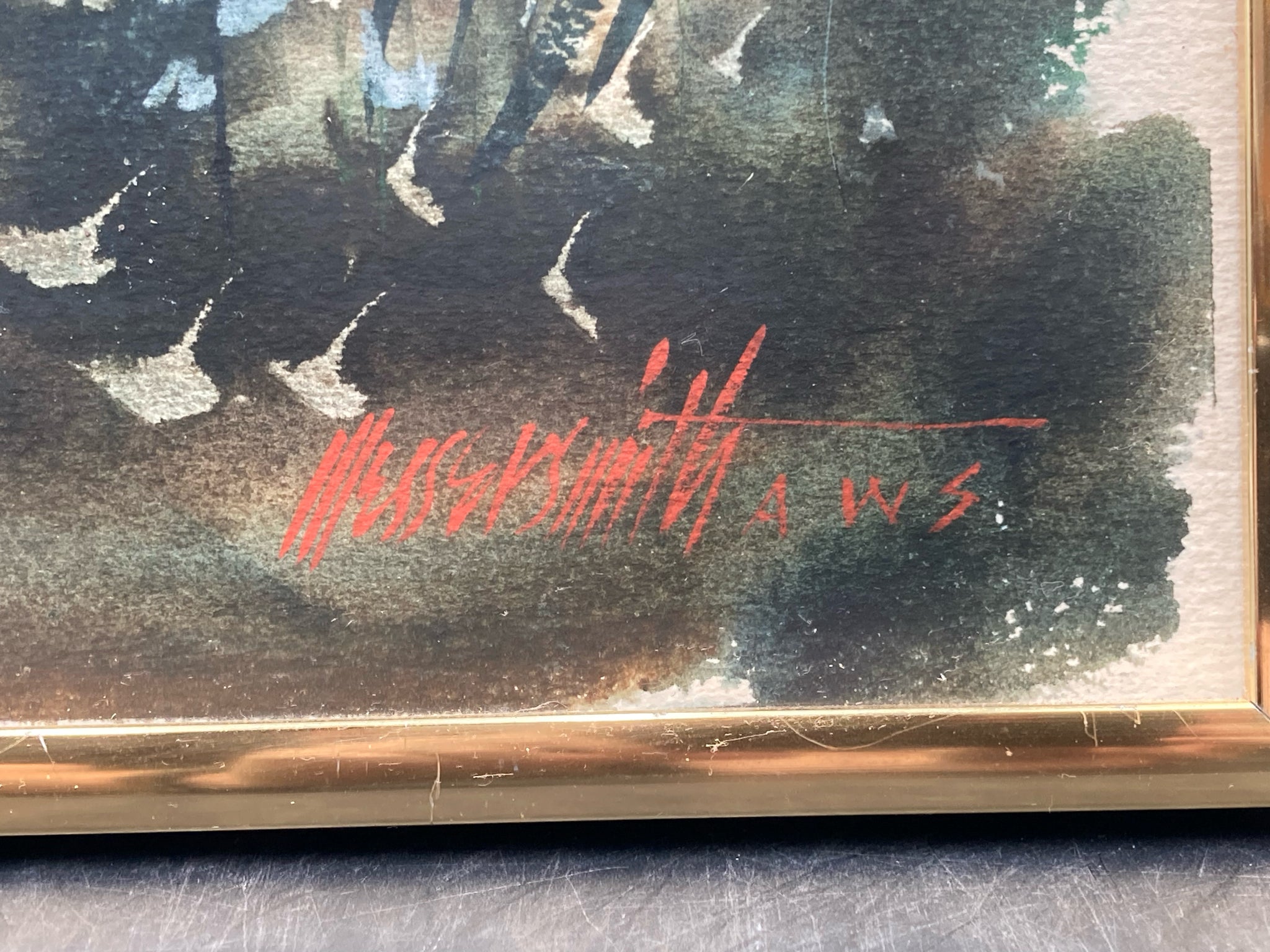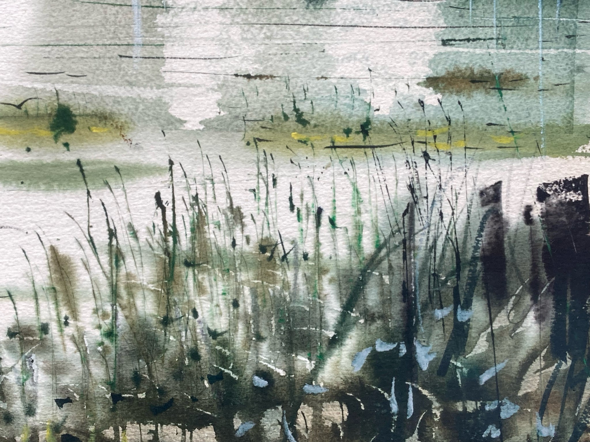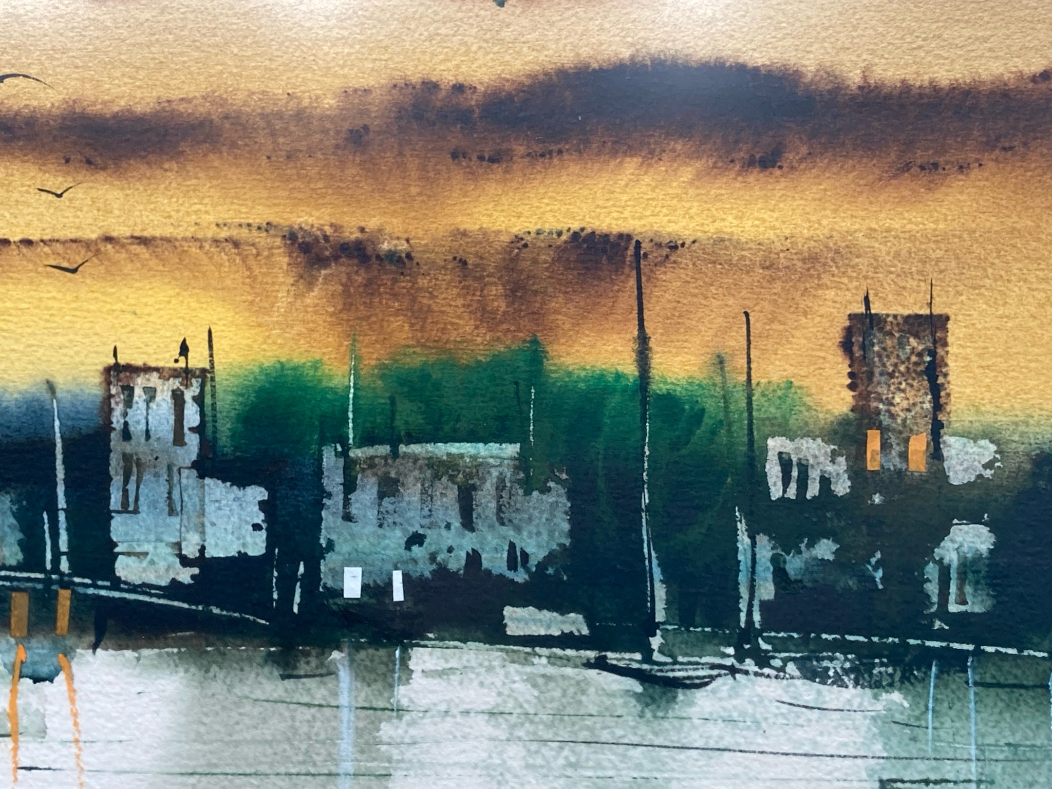 Original artist signed Asian style painting. Watercolor on paper. Sunset scene on a harbor town with reeds in the foreground. Painting is signed in lower left corner by the artist, the name is difficult to properly make out. Total size with frame measures 20" tall by 28" wide. Painting is in excellent condition.