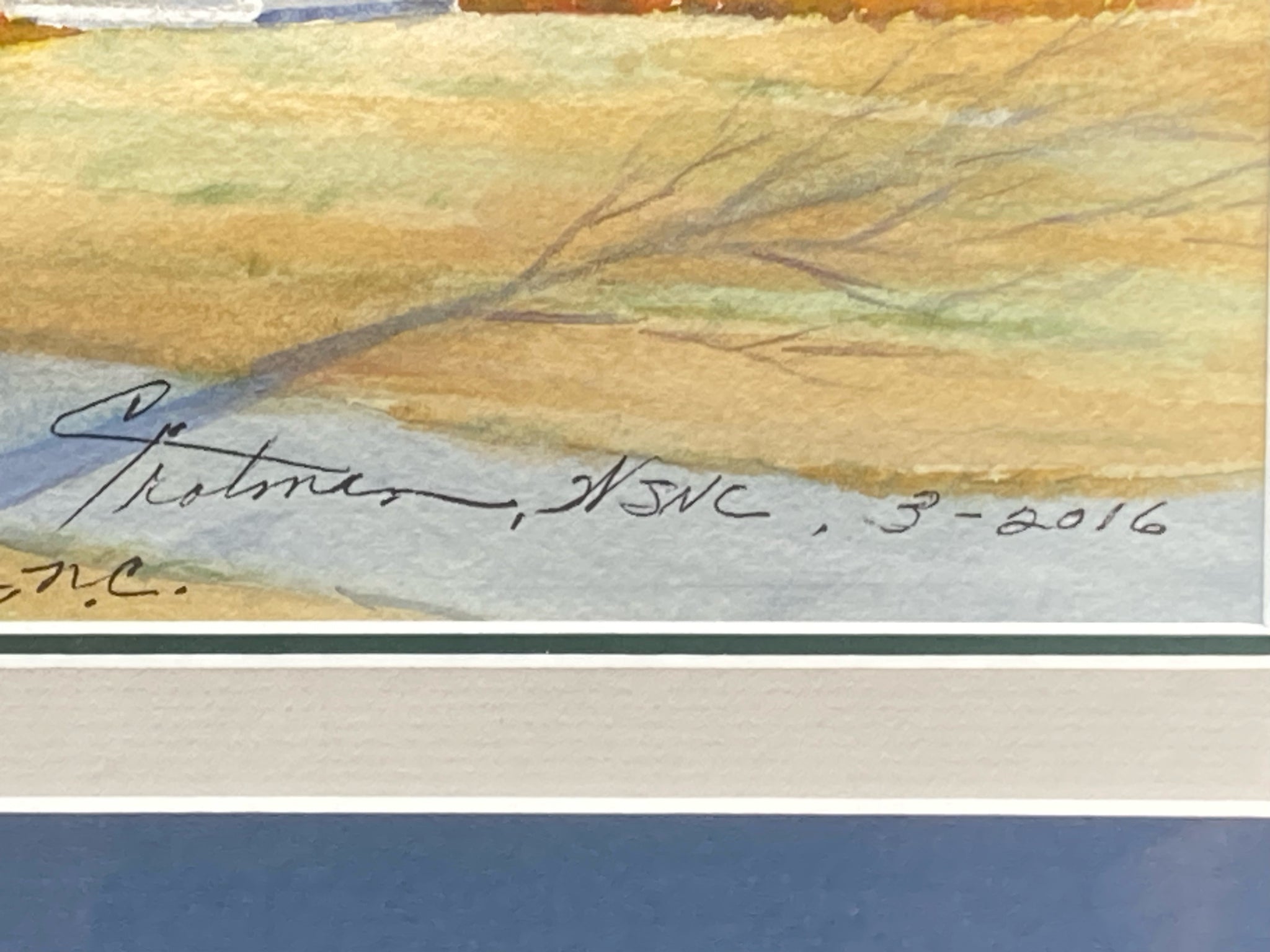 Signed North Carolina House Watercolor Painting. Signed by artist at bottom with additional information. Total size with frame is 19" tall by 23" wide. Frame has some scuffs, painting is in excellent condition.