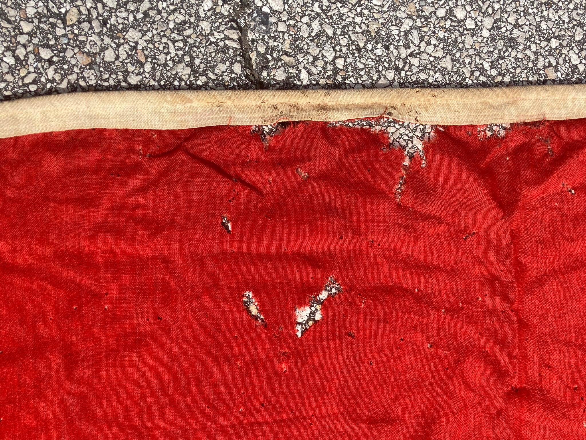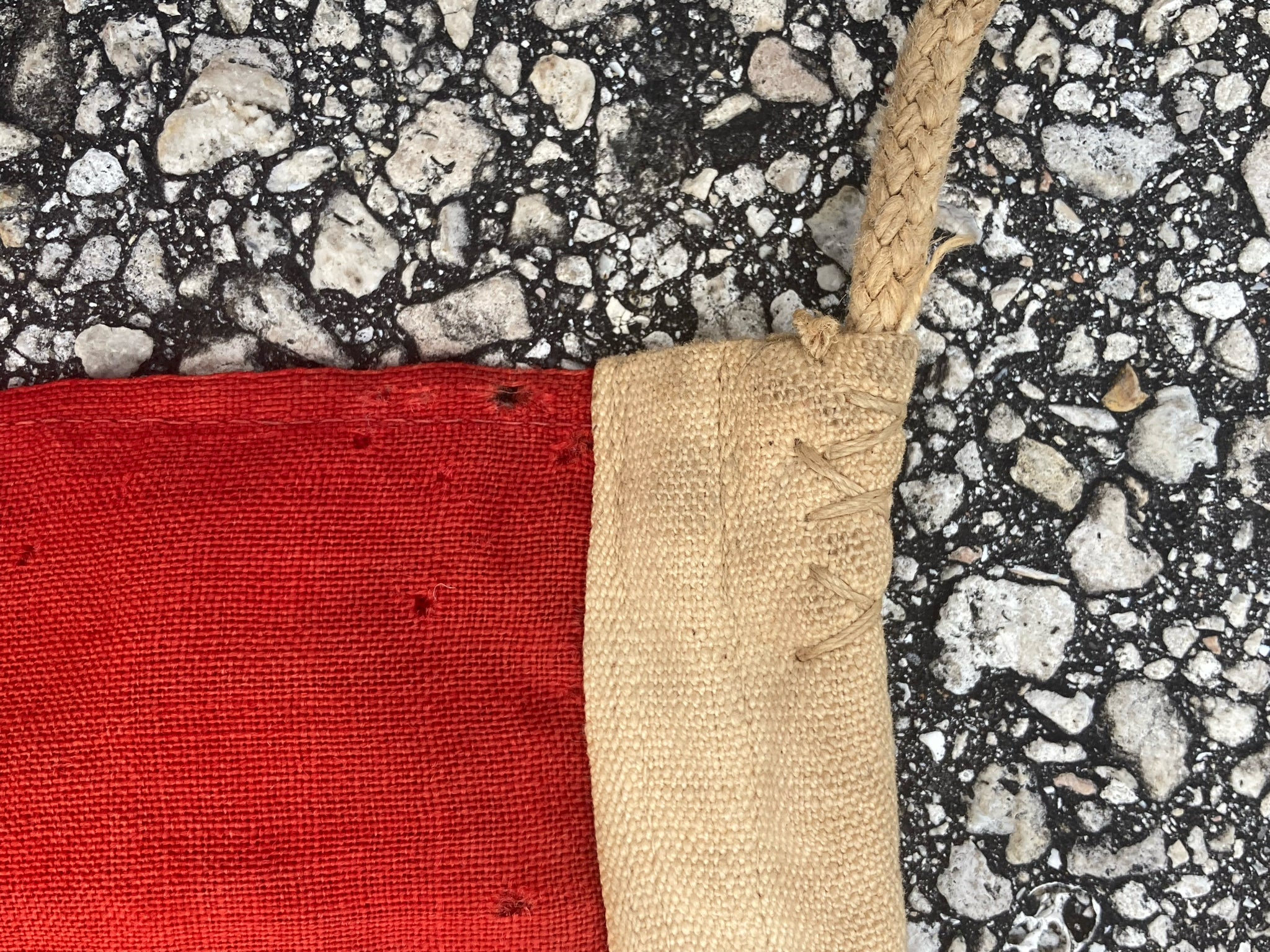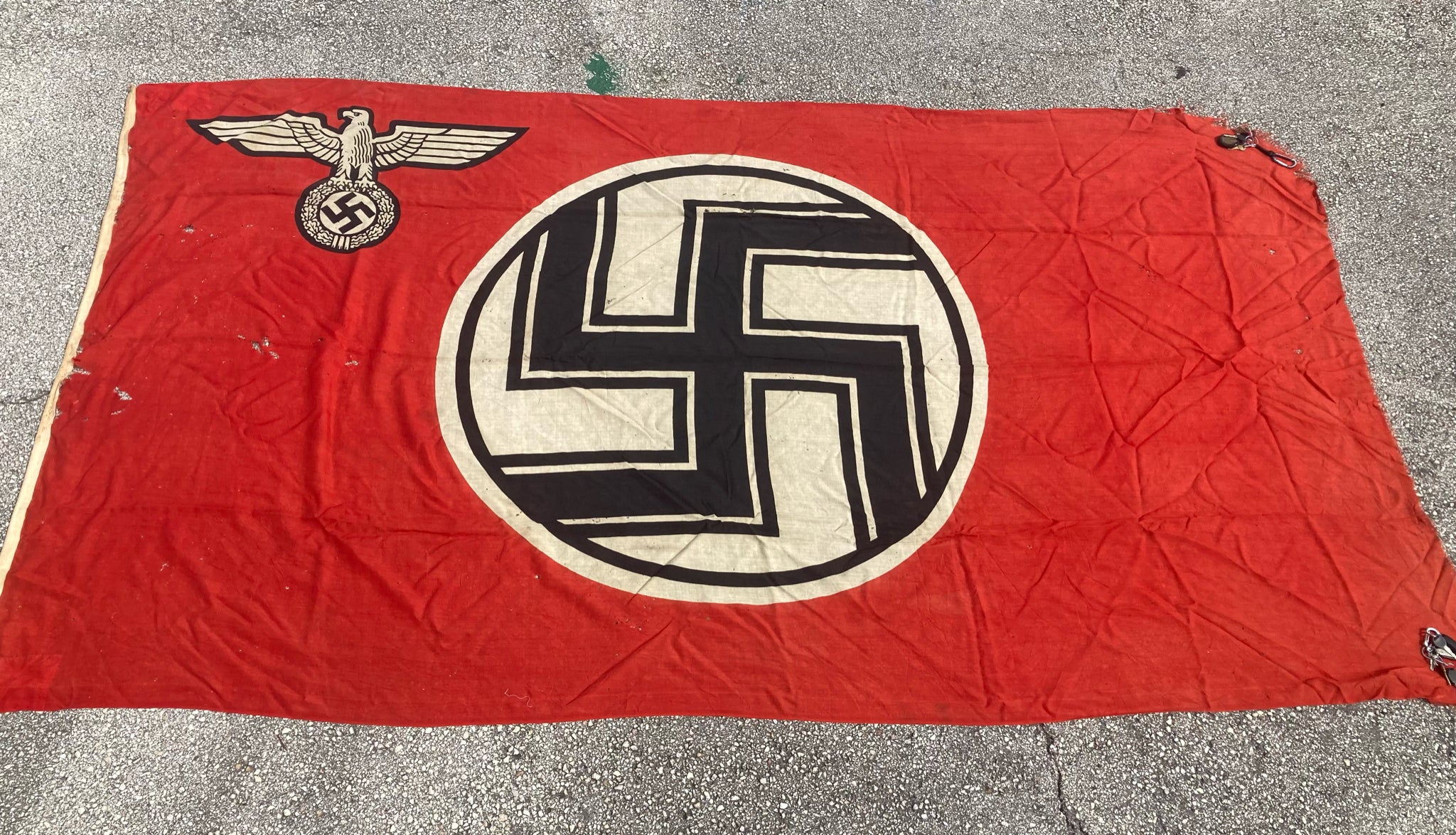 Very large authentic World War II German NSDAP state service flag. The Reichskriegsflagge was the traditional state flag flown over official government buildings. Cotton material dyed with red main color and printed NSDAP symbol and Imperial eagle symbols. Double sided design is identical on both sides. Reinforced cotton hoist with pull rope and characteristic stitching pattern of world war II era German flags, noted in photos. Large sized flag, measures 72 inches tall and 132 inches long. Flag has considerable wear with many holes and fraying present and noted in photos. Overall the flag is in fair condition given its age and use.