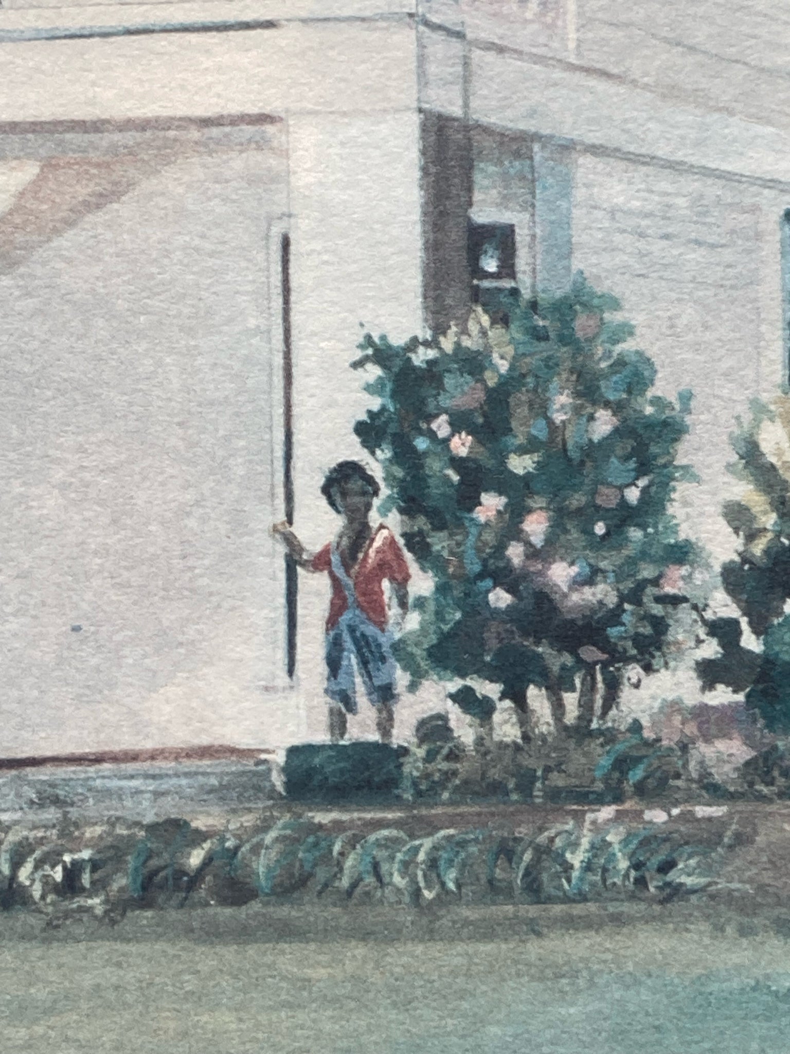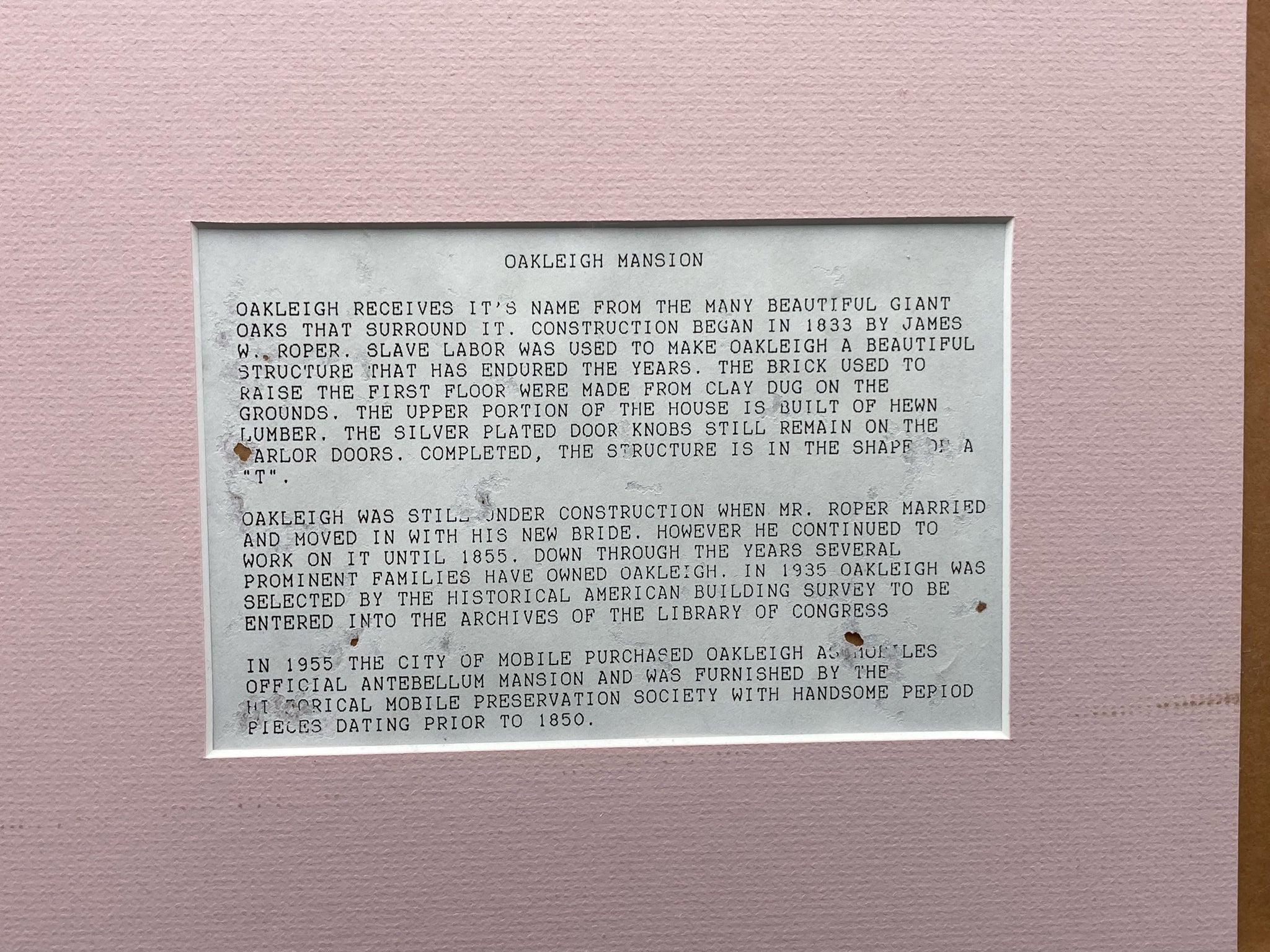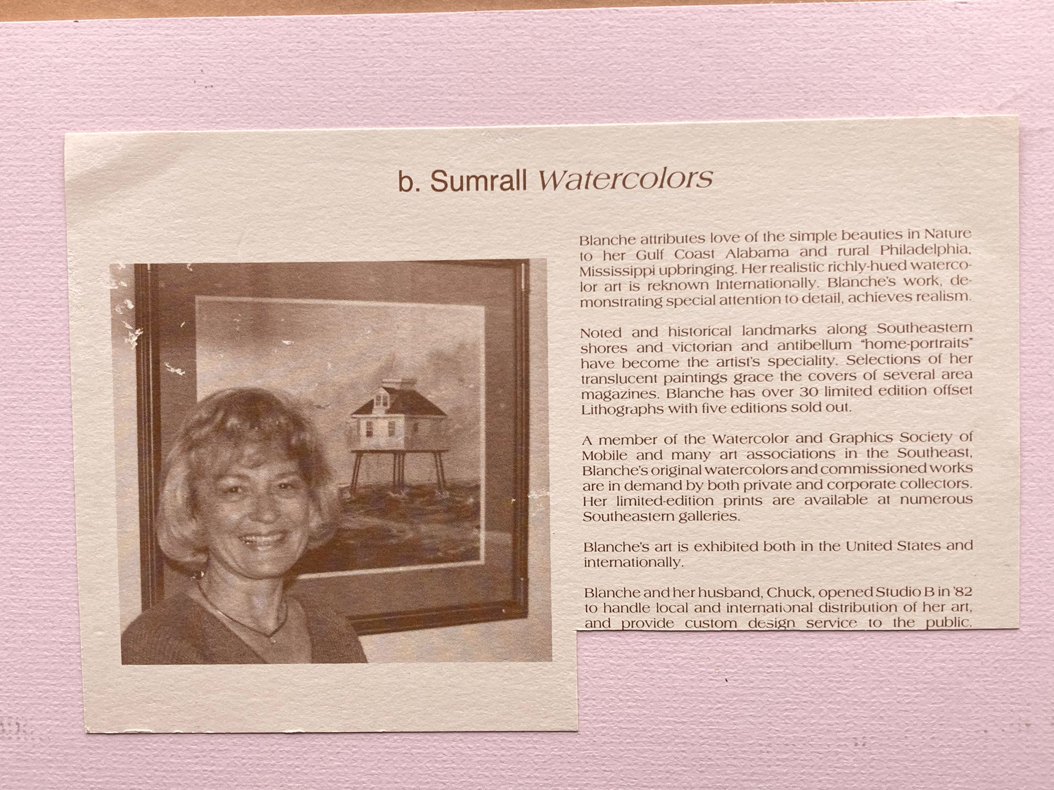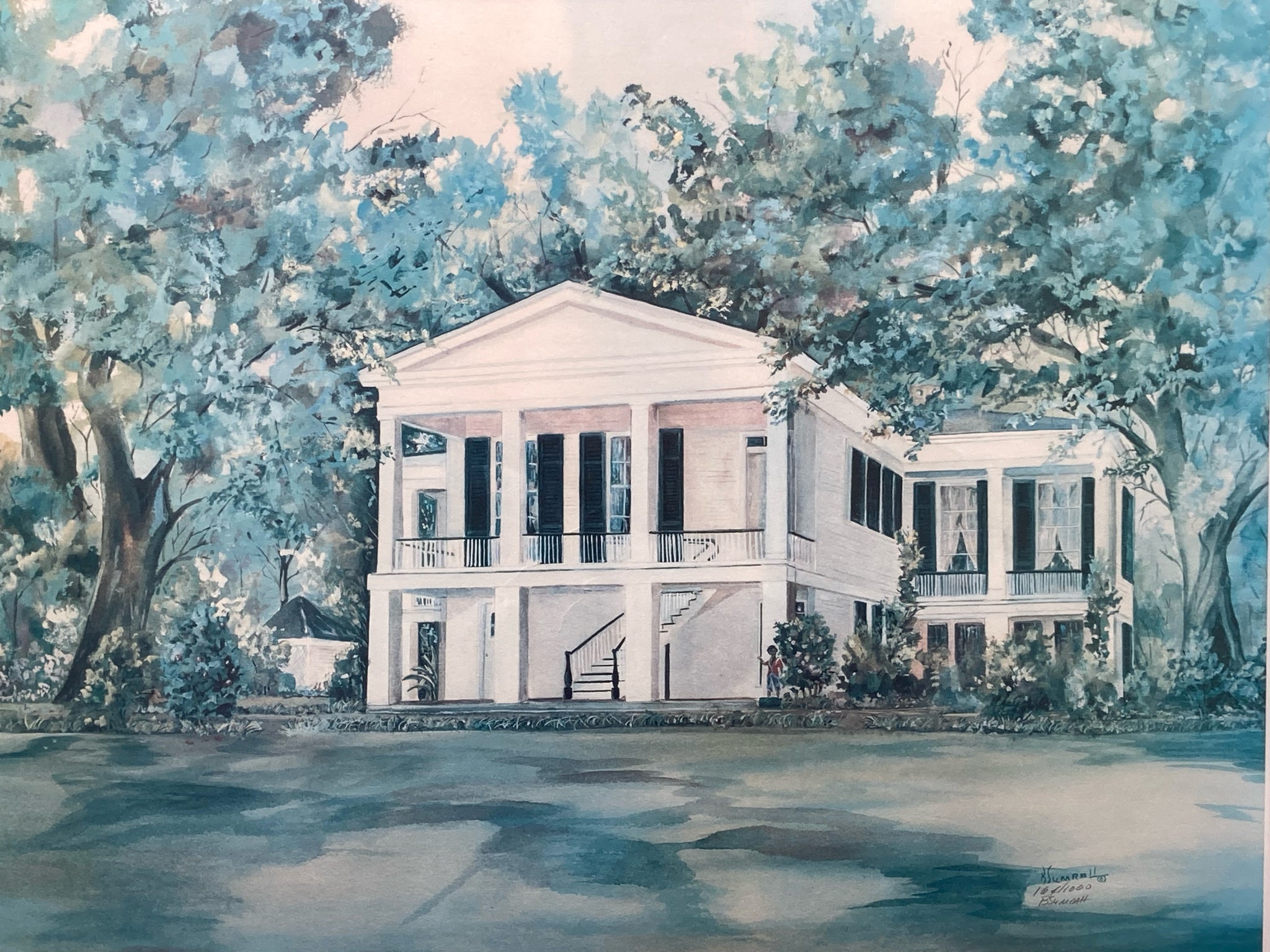 B. Sumrall signed limited edition "Oakleigh Mansion" print, framed and matted. Print is based on her original watercolor of the historic plantation house in Mobile, Alabama. Print is signed and numbered by Sumrall in the lower left, number 164/1000. Print measures 18" tall by 24" wide, total size with frame is 25" by 31". Backside of frame has additional information on the artist and the artwork. Some color fading is visible otherwise print is in good condition.