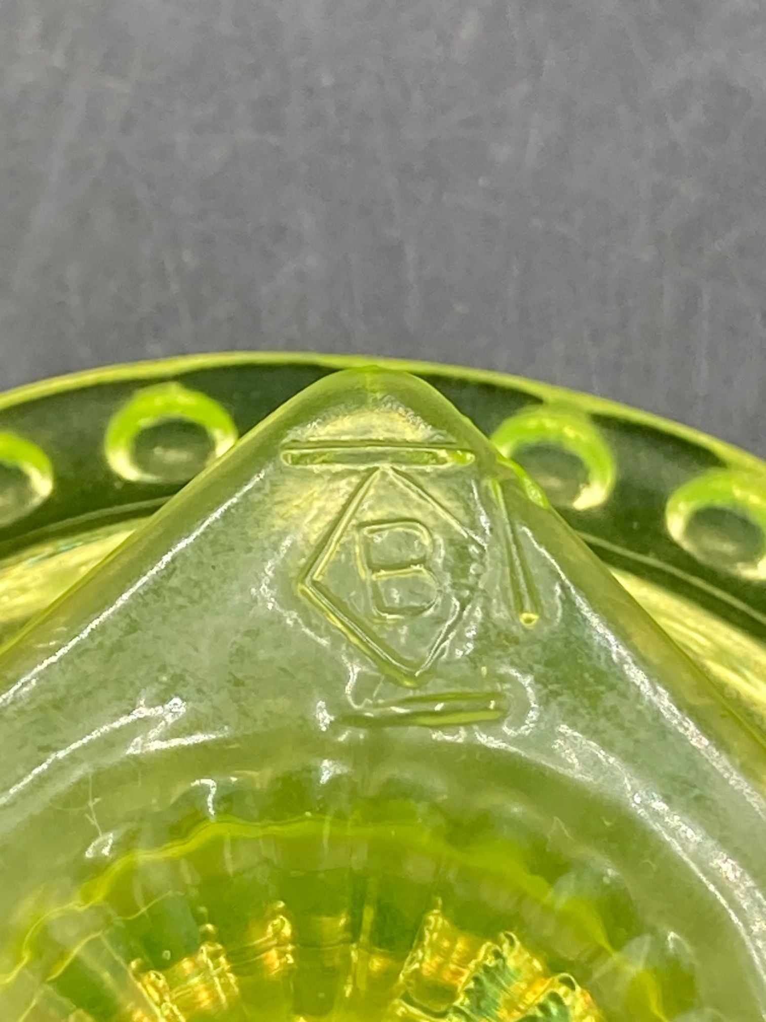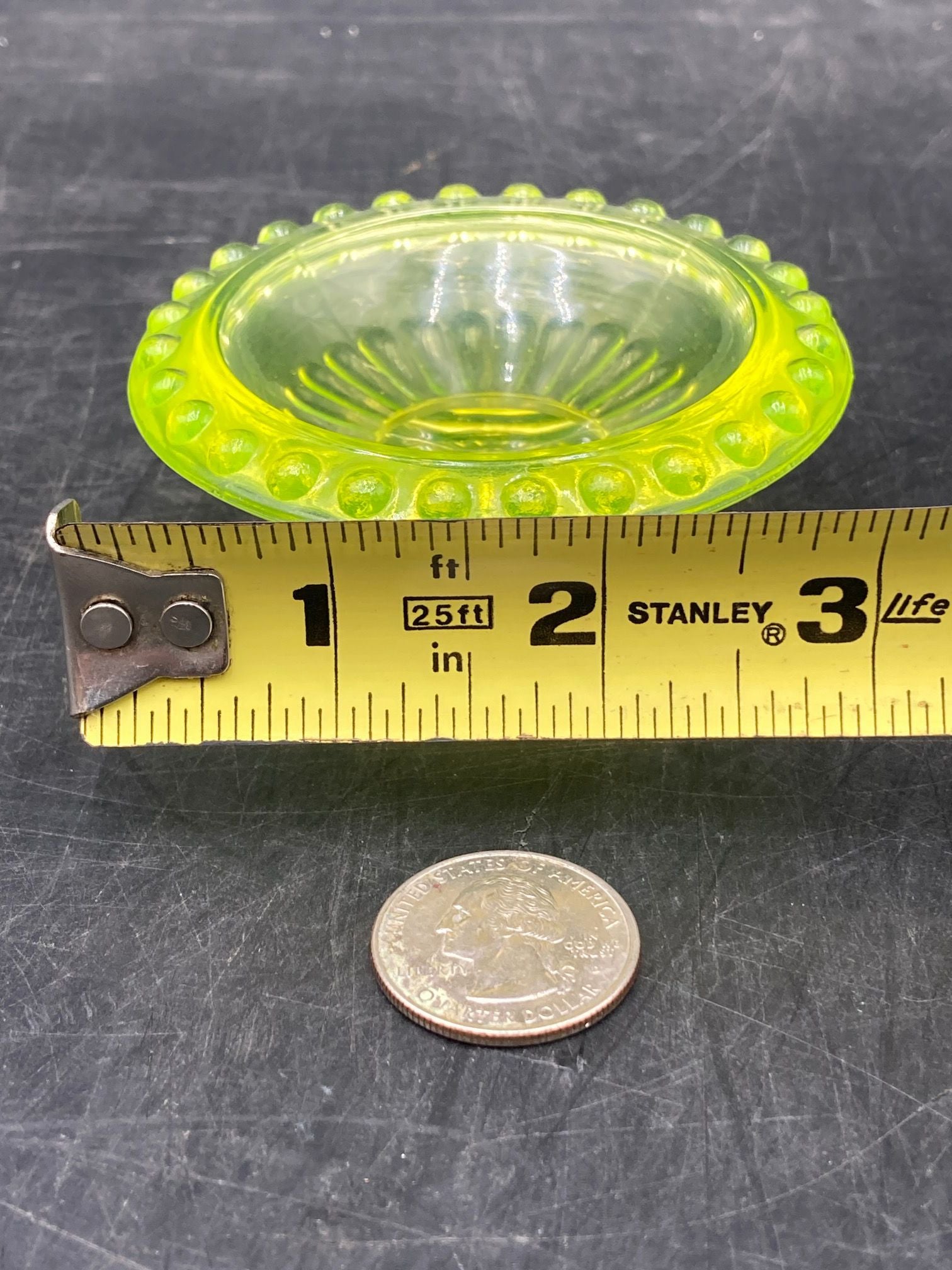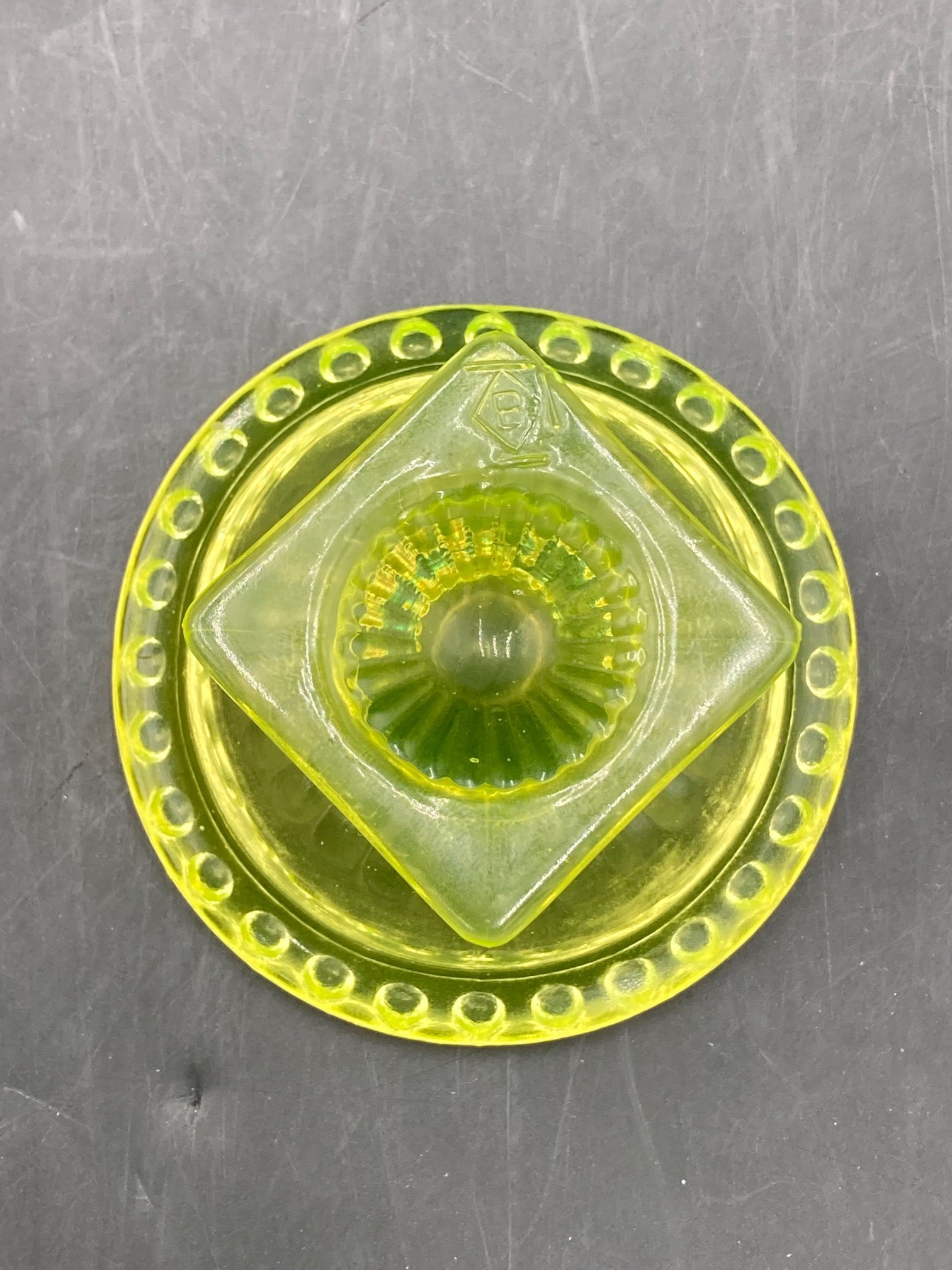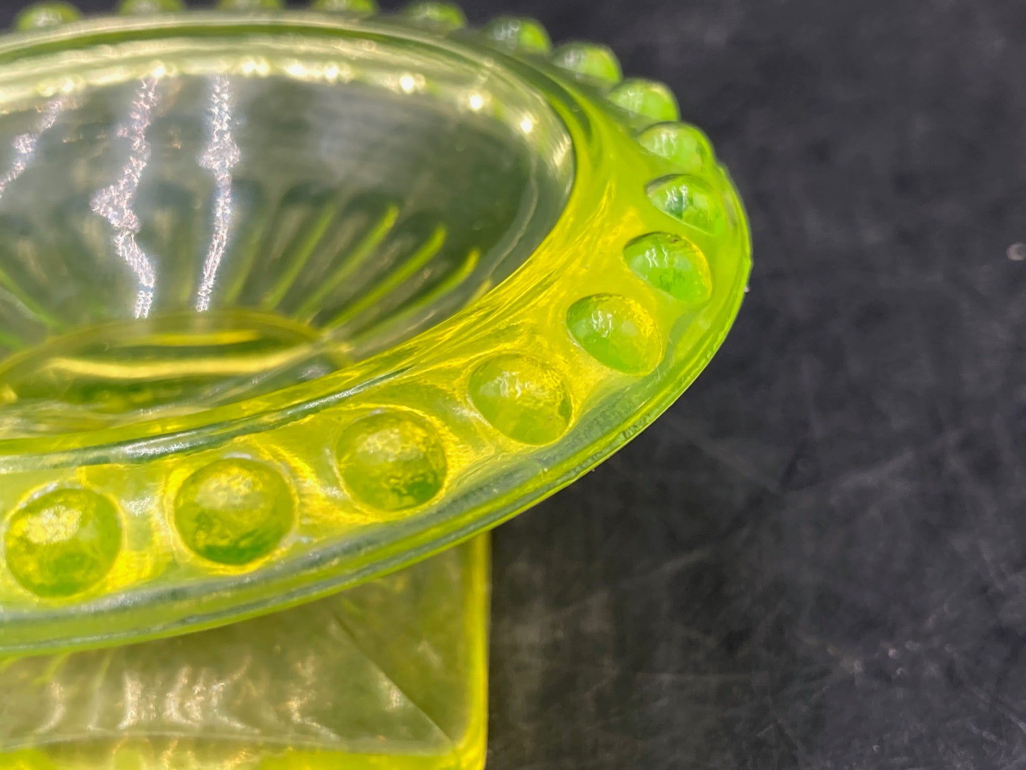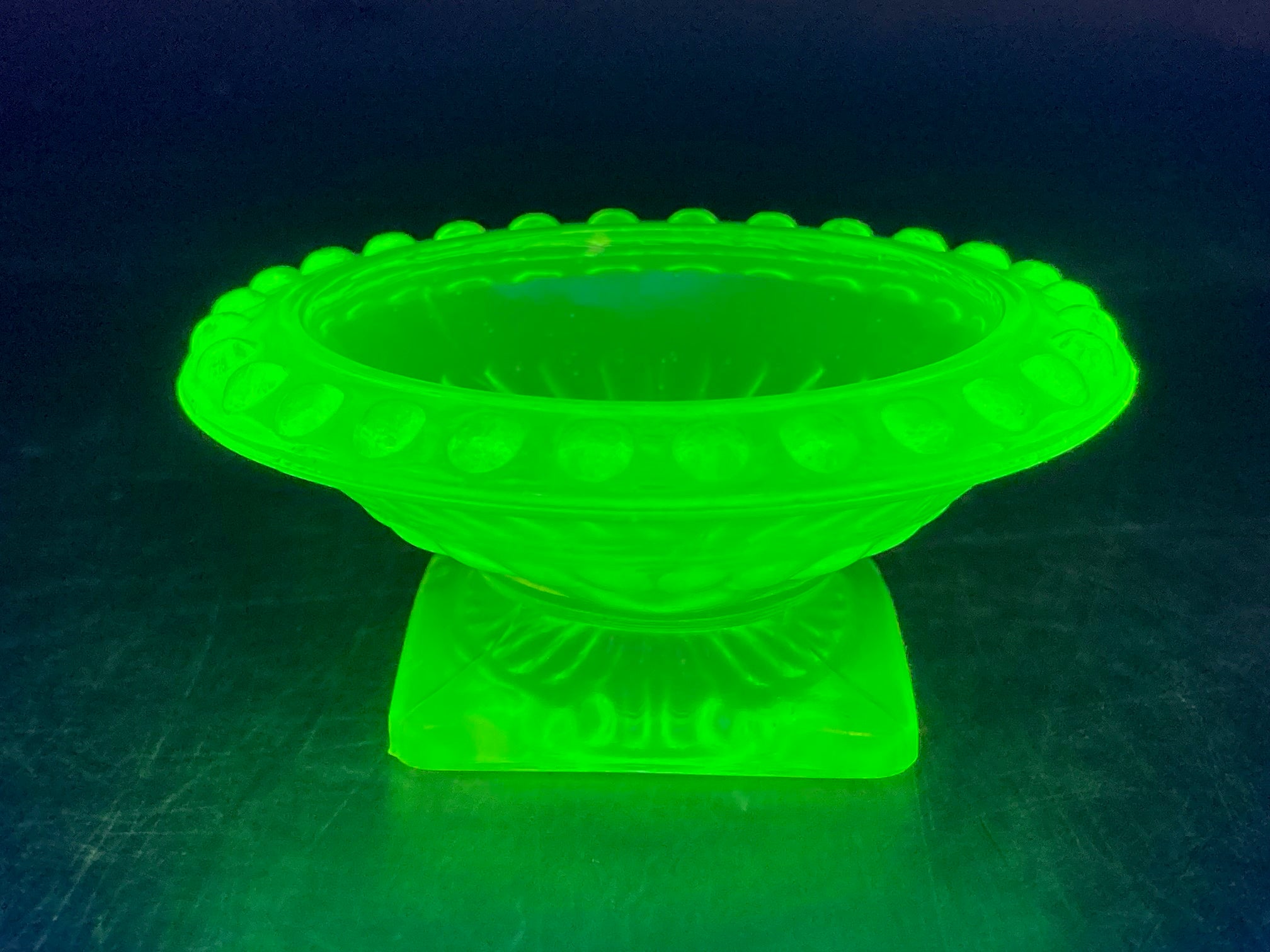 Antique Boyd's vaseline footed candy dish. Yellow-Green colored glass with pedestal style base, floral burst pattern within dish and button patterned rim. Glass glows under UV light, noted in photos. Dish measures 3" long. Dish is in excellent condition with no noted damages.
