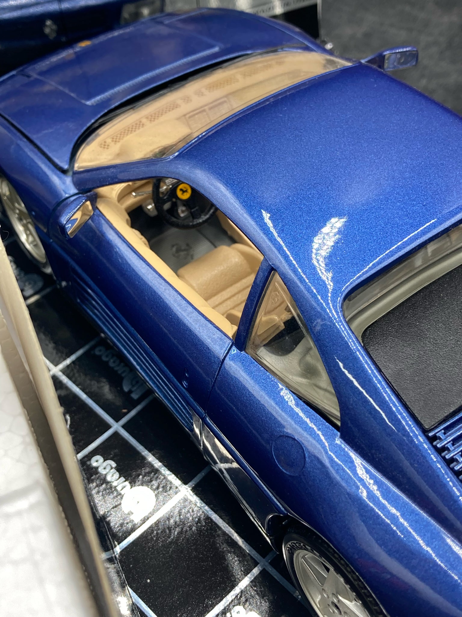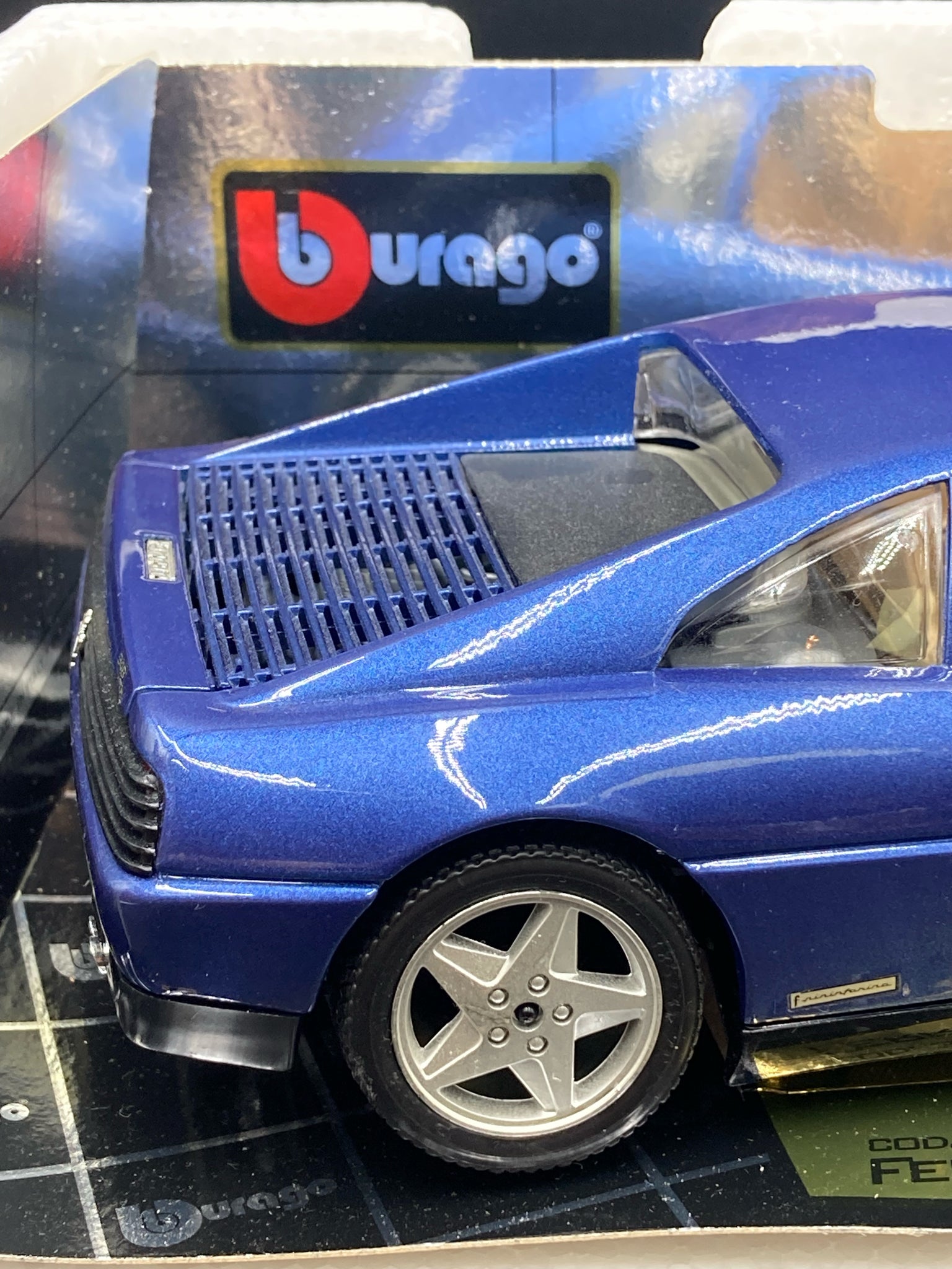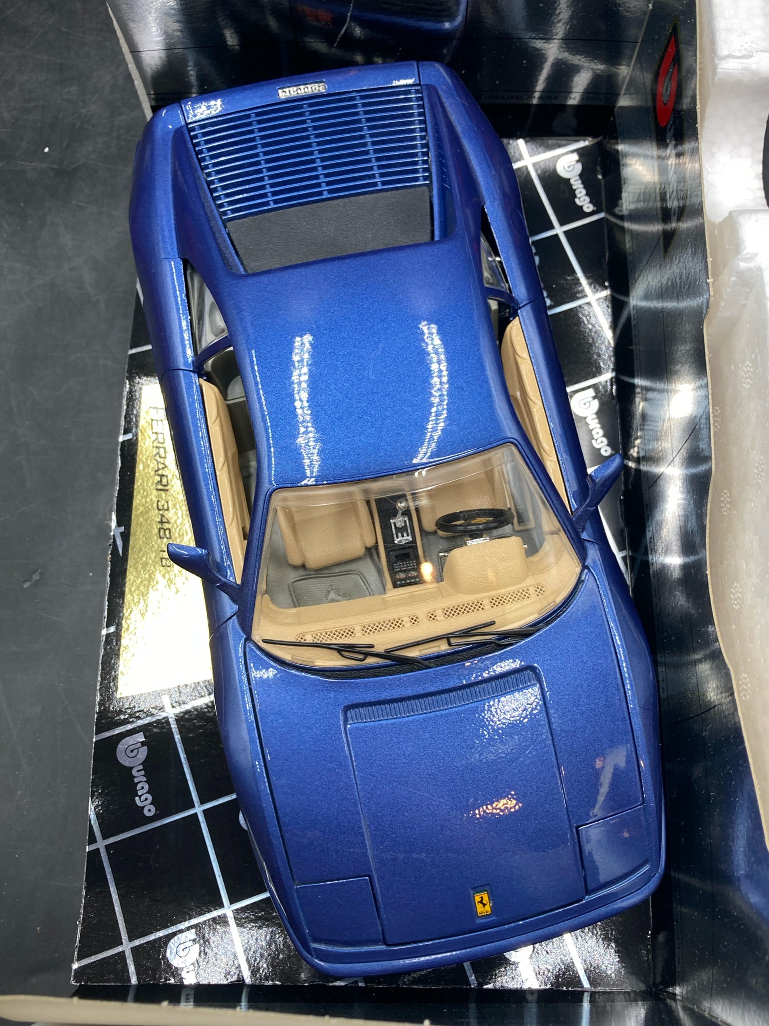 Burago 1/18 scale 1989 Ferrari 348 TB die cast model, COD 3039 with original box. Blue color. Model features opening doors, hood and trunk, detailed engine bay and interior, and precision detailed body. Model is in excellent condition, box has some light wear.