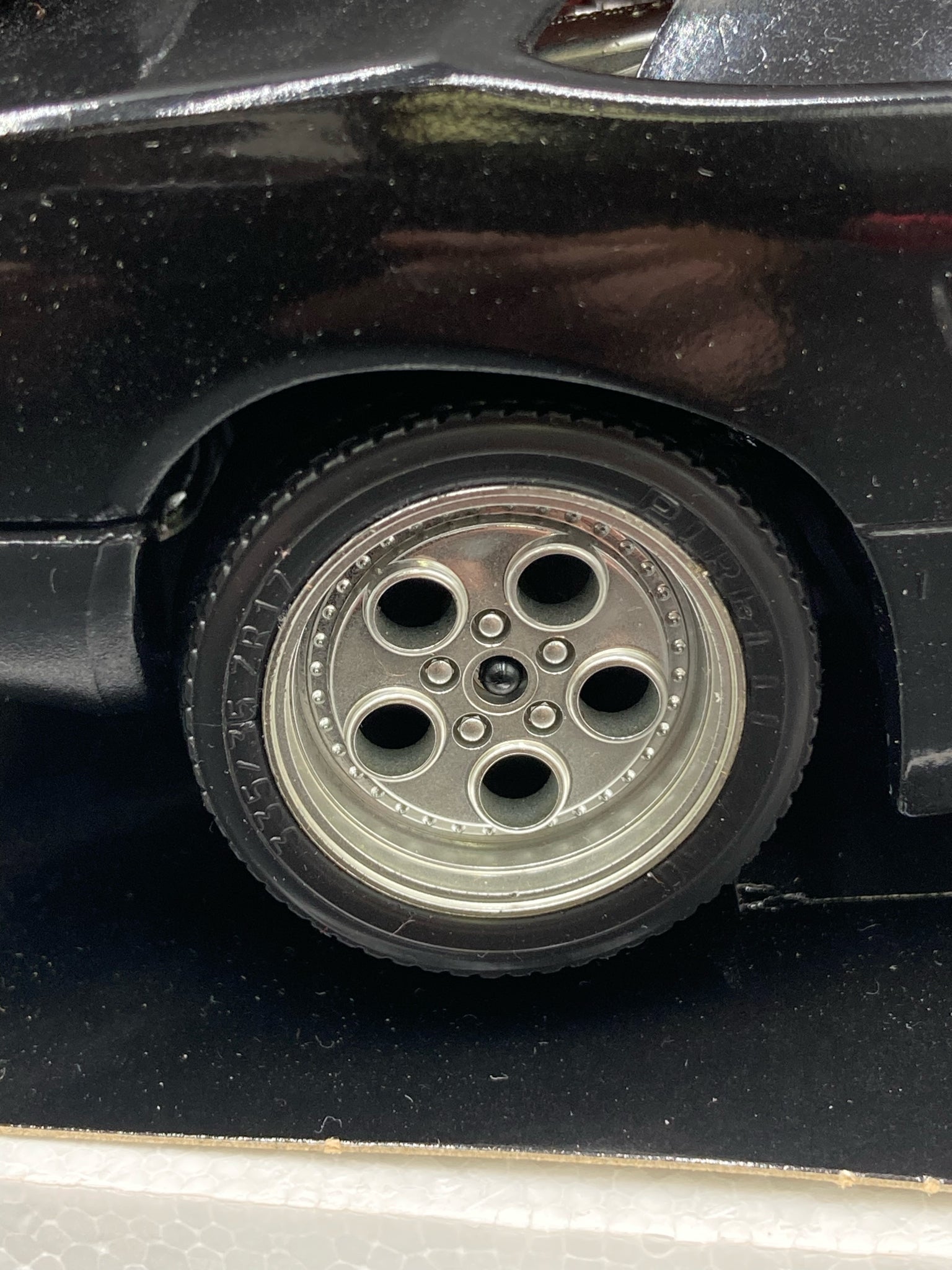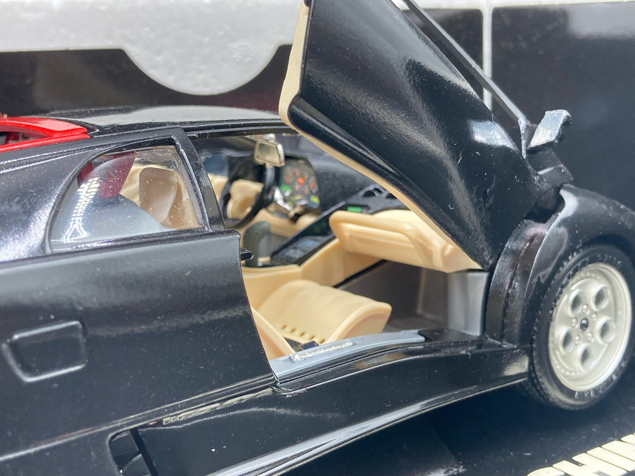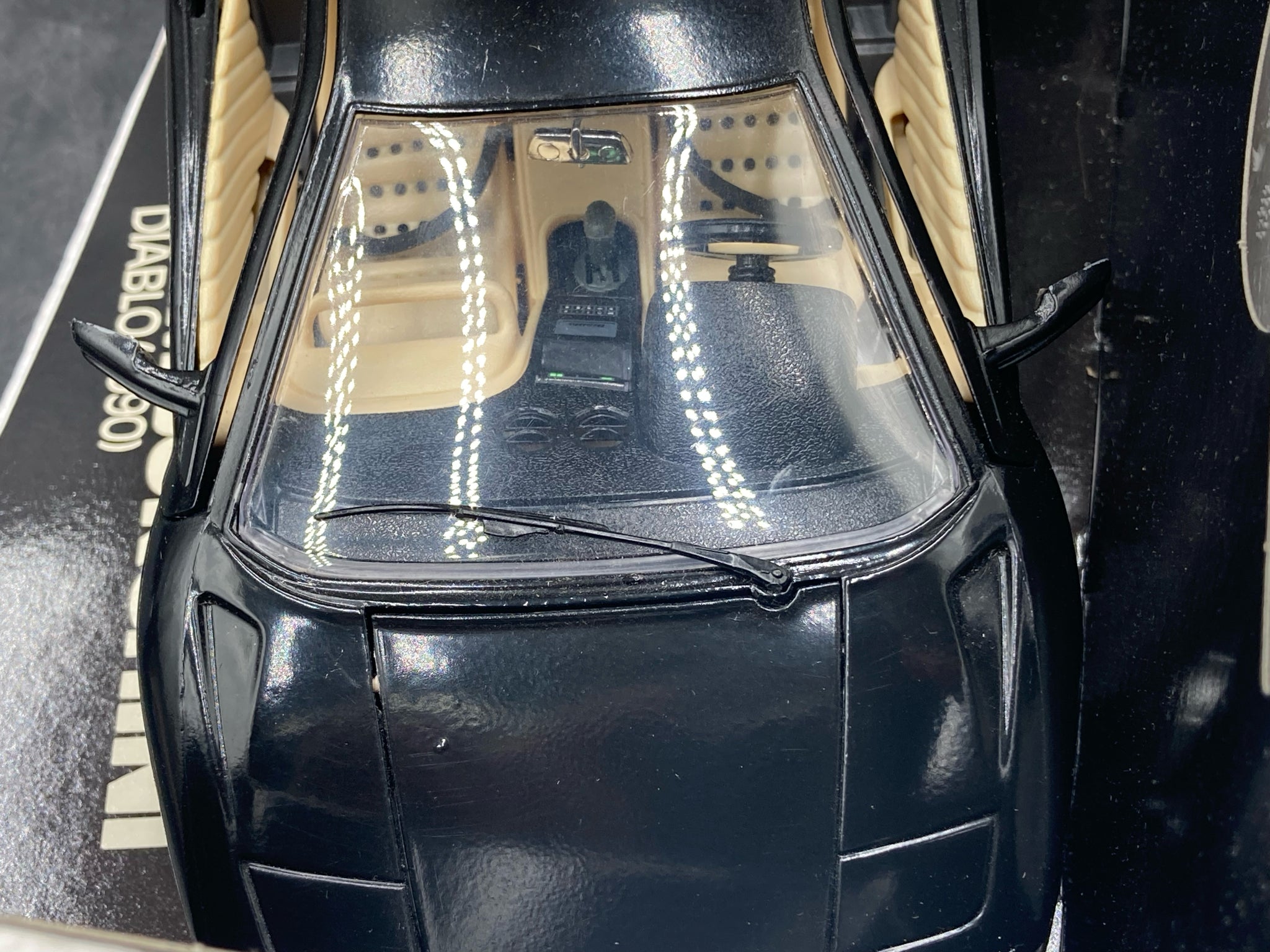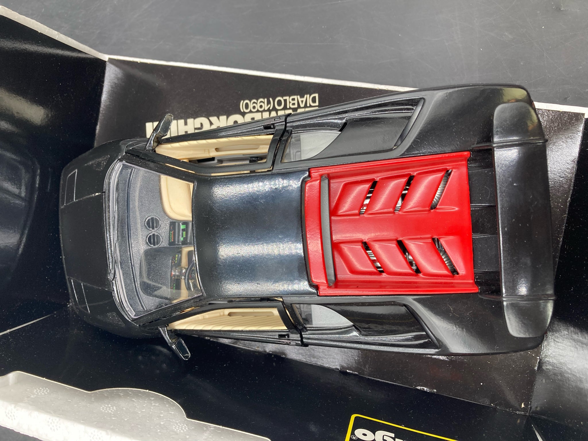 Burago 1/18 scale 1990 Lamborghini Diablo die cast model, COD 3028 with original box. Black color. Model features opening doors, hood and trunk, detailed engine bay and interior, and accurately detailed body. One spot of worn paint on rear bumper is noted in photos, otherwise die cast is in good condition. Box has some wear.