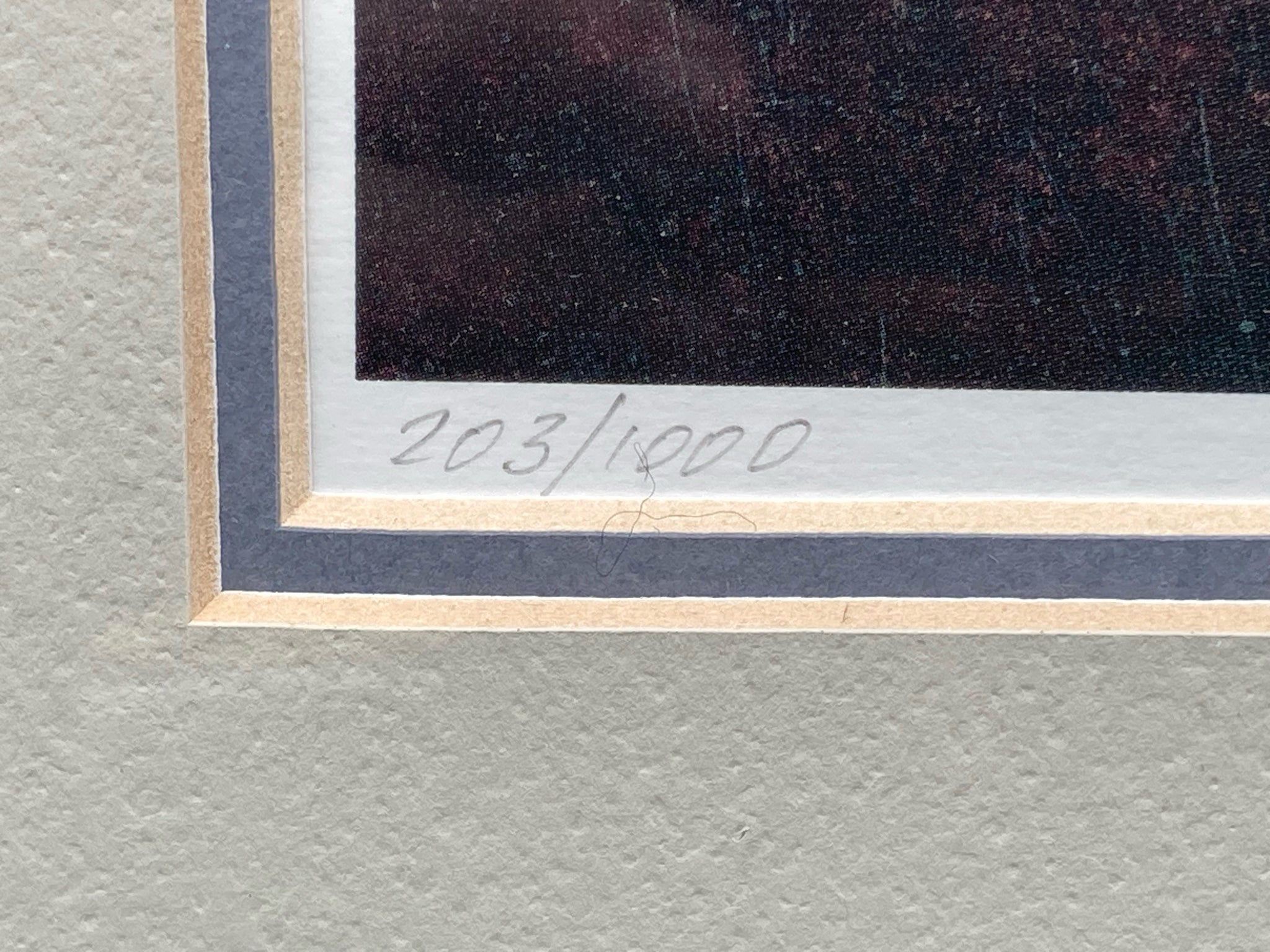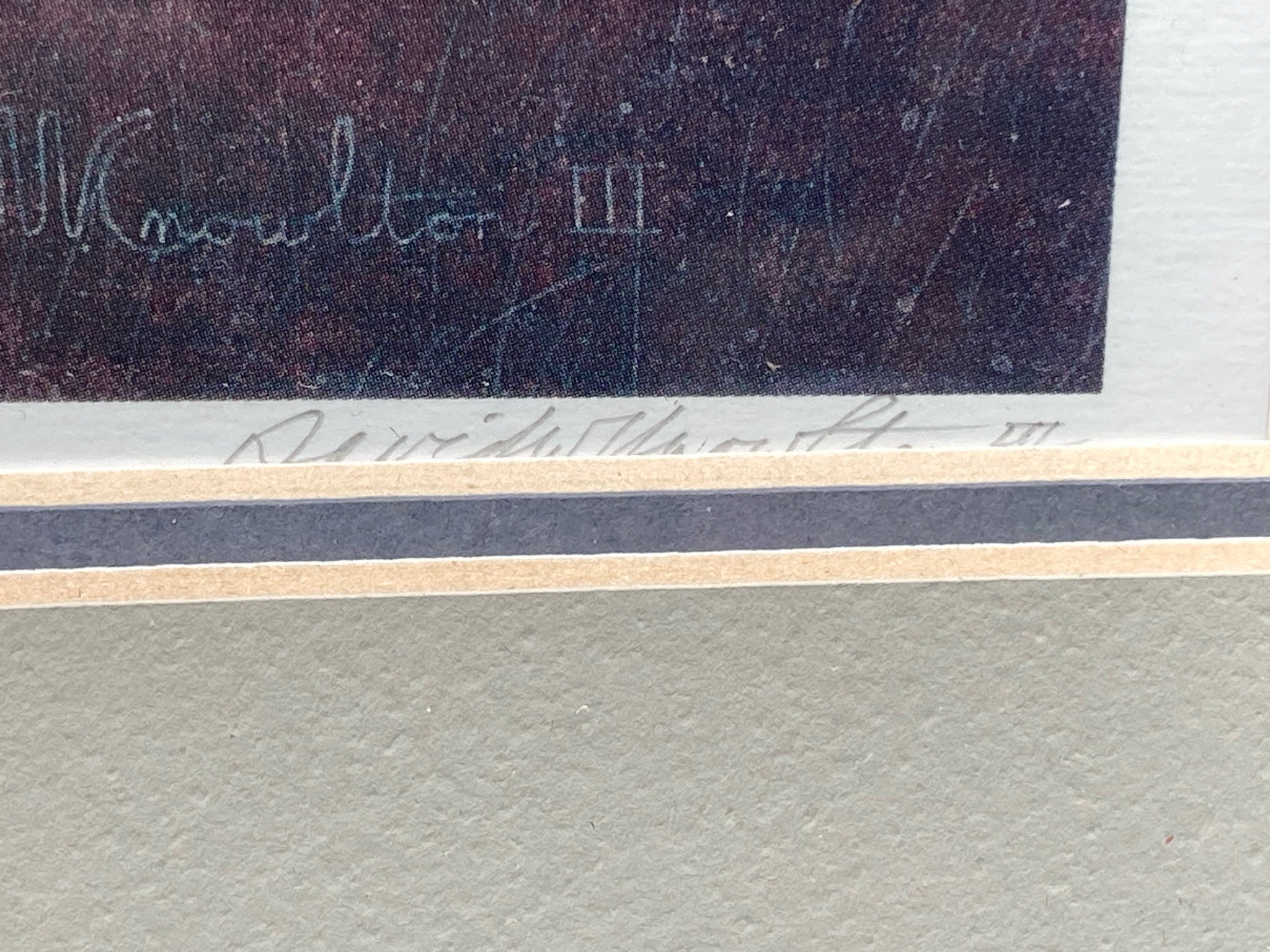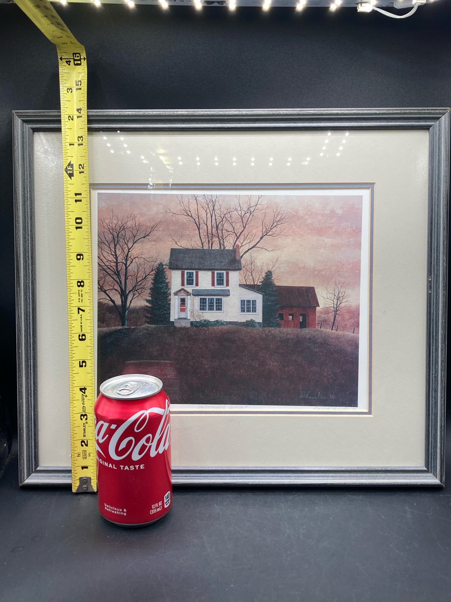 David Knowlton signed and numbered limited edition "December Sunset" lithograph print, framed and matted. Lithograph on paper. Rustic Shenandoah Valley Virginia countryside house and barn scene using darker, dusk time colors. Signed and numbered at bottom by the artist David Knowlton at bottom, number 203/1000. Visible print measures 8.5" tall and 10.5" long, total size with frame measures 14" tall by 16" long. Print is slightly off center within matting, noticeable down where artist signature is located, otherwise print is in good condition.