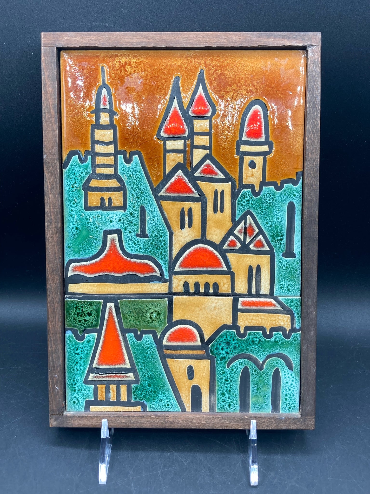 Original Ein Reb hand made tile art. Israeli made hand crafted piece depicting the skyline and cityscape of Jerusalem using vibrant colors. Backside is inscribed with information about the piece. Item measures 9" tall and 7" wide. Item is in excellent condition.