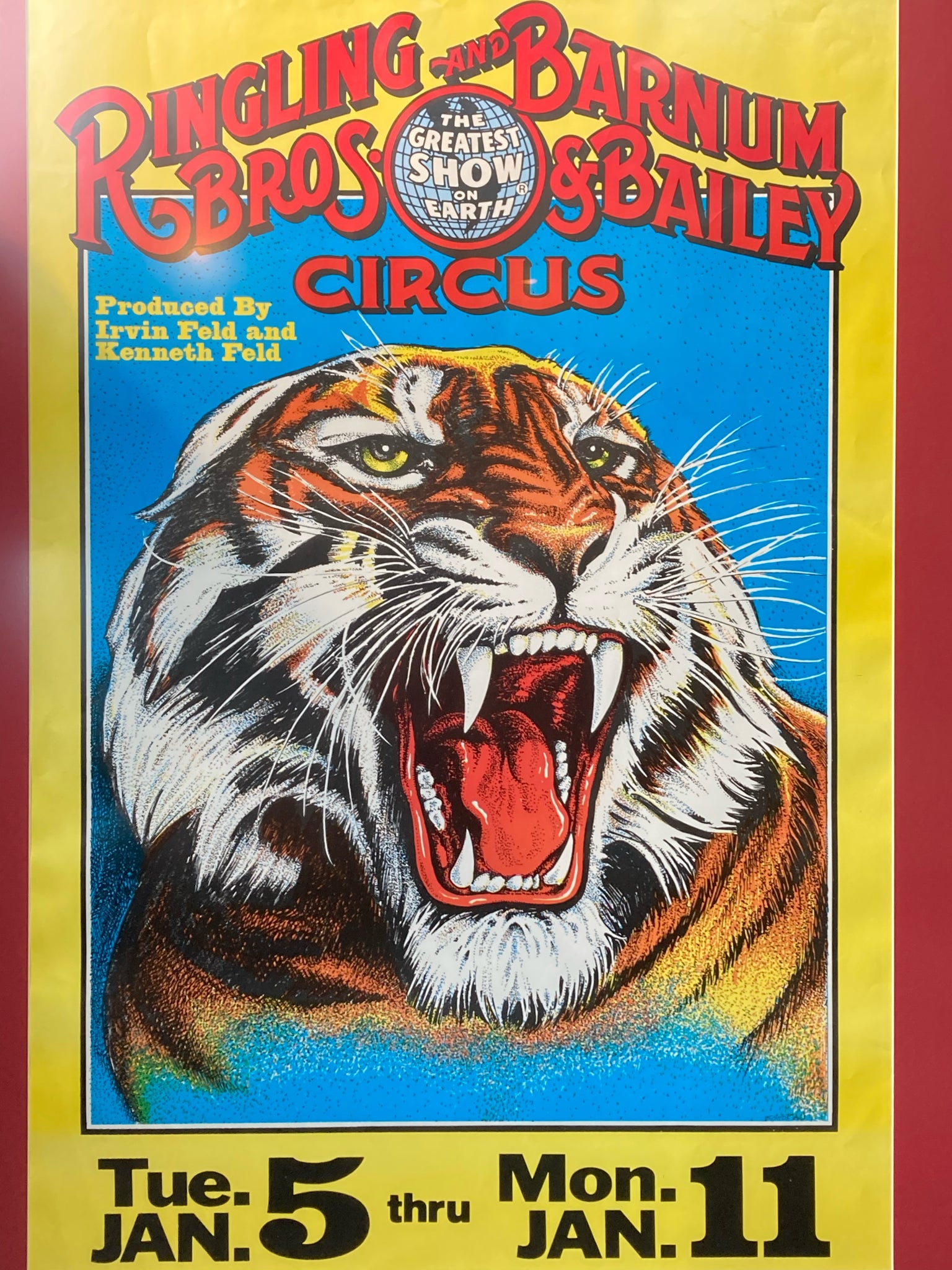 Framed vintage Ringling Bros and Barnum & Bailey circus poster with tiger design. Large full size poster measures 24" wide and 36" tall, total size with frame is 32" wide and 40" tall. Previously featured in Norton's Auction House of Michigan.