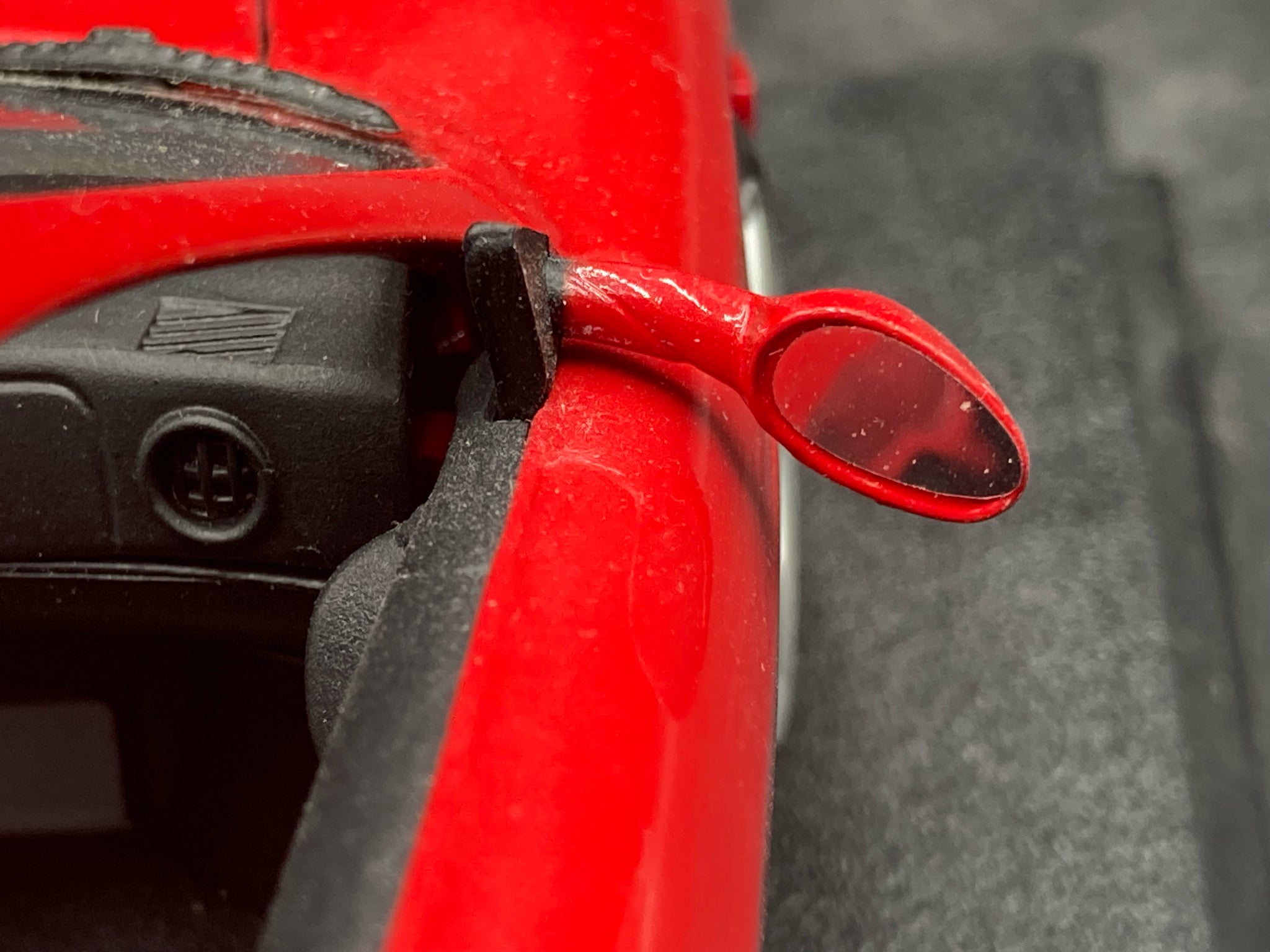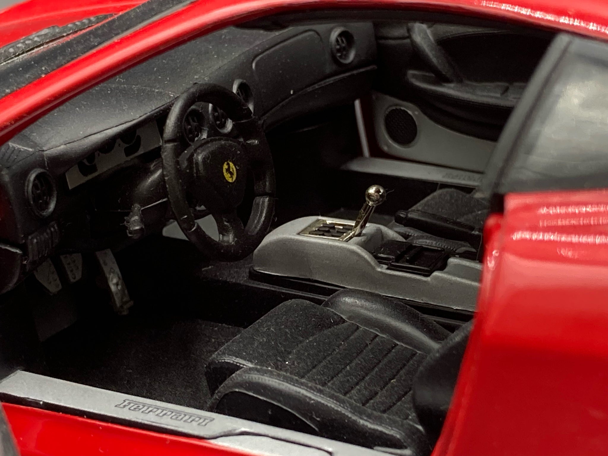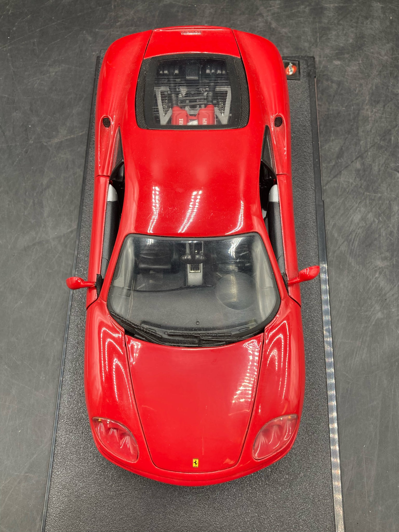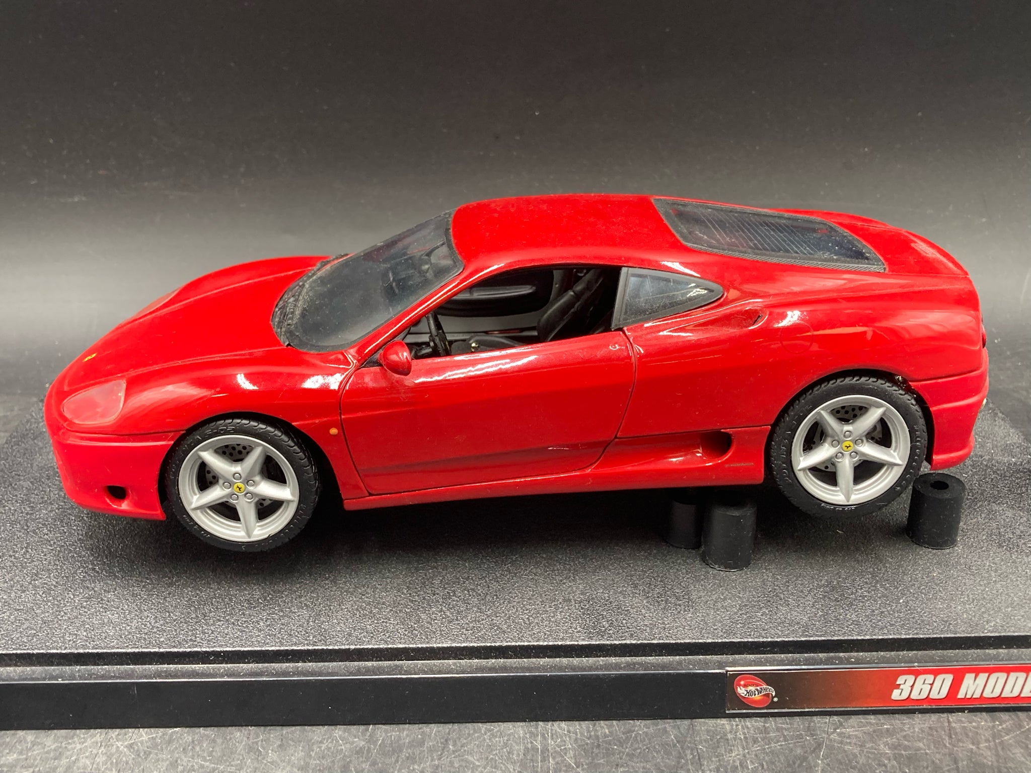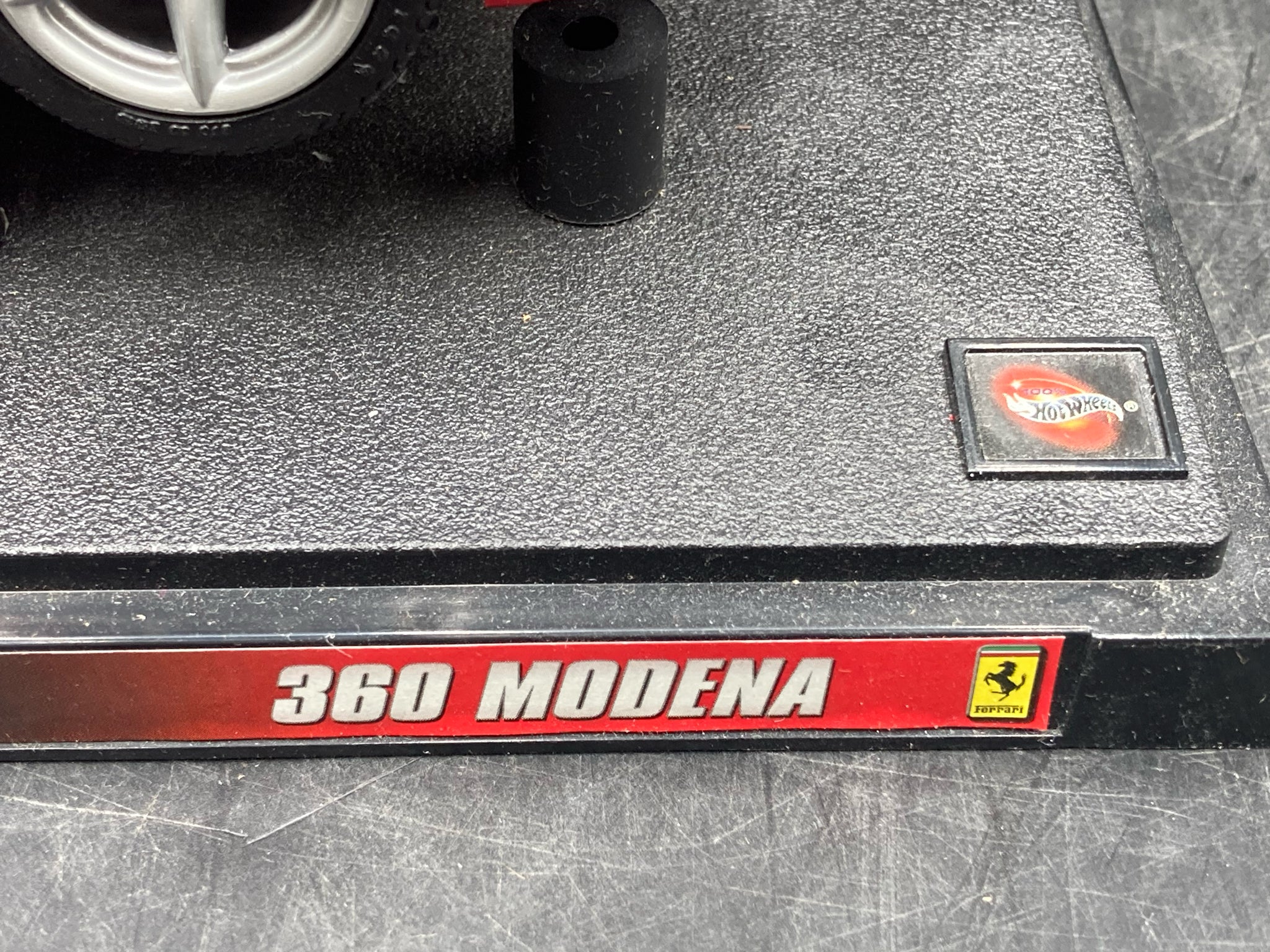 Hot Wheels 1/18 scale Ferrari 360 Modena die cast model with original display stand. Model features opening doors, hood and trunk, detailed engine bay and interior, and precision body detailing. Side view mirrors are a bit loose, otherwise model is in good condition.