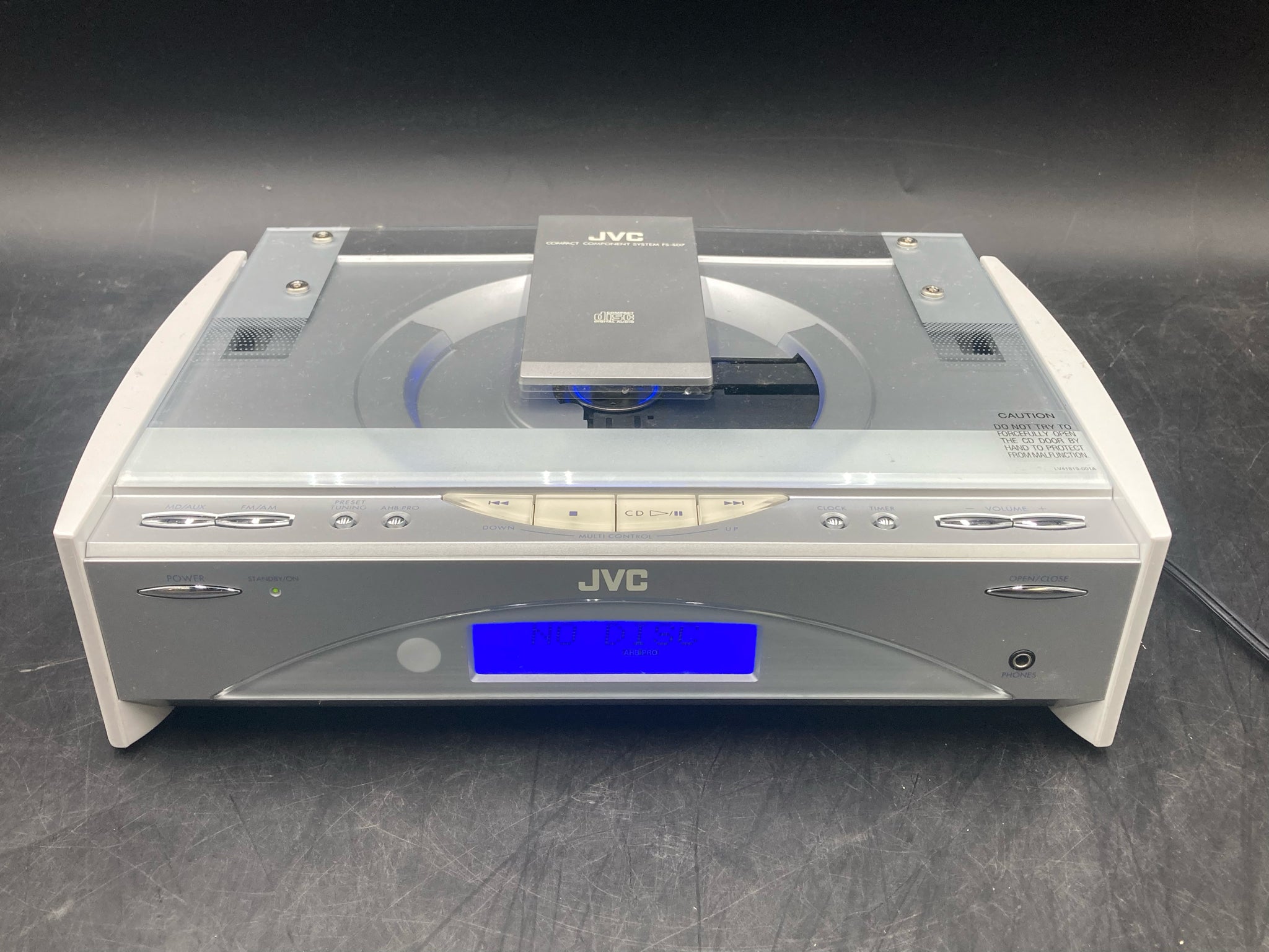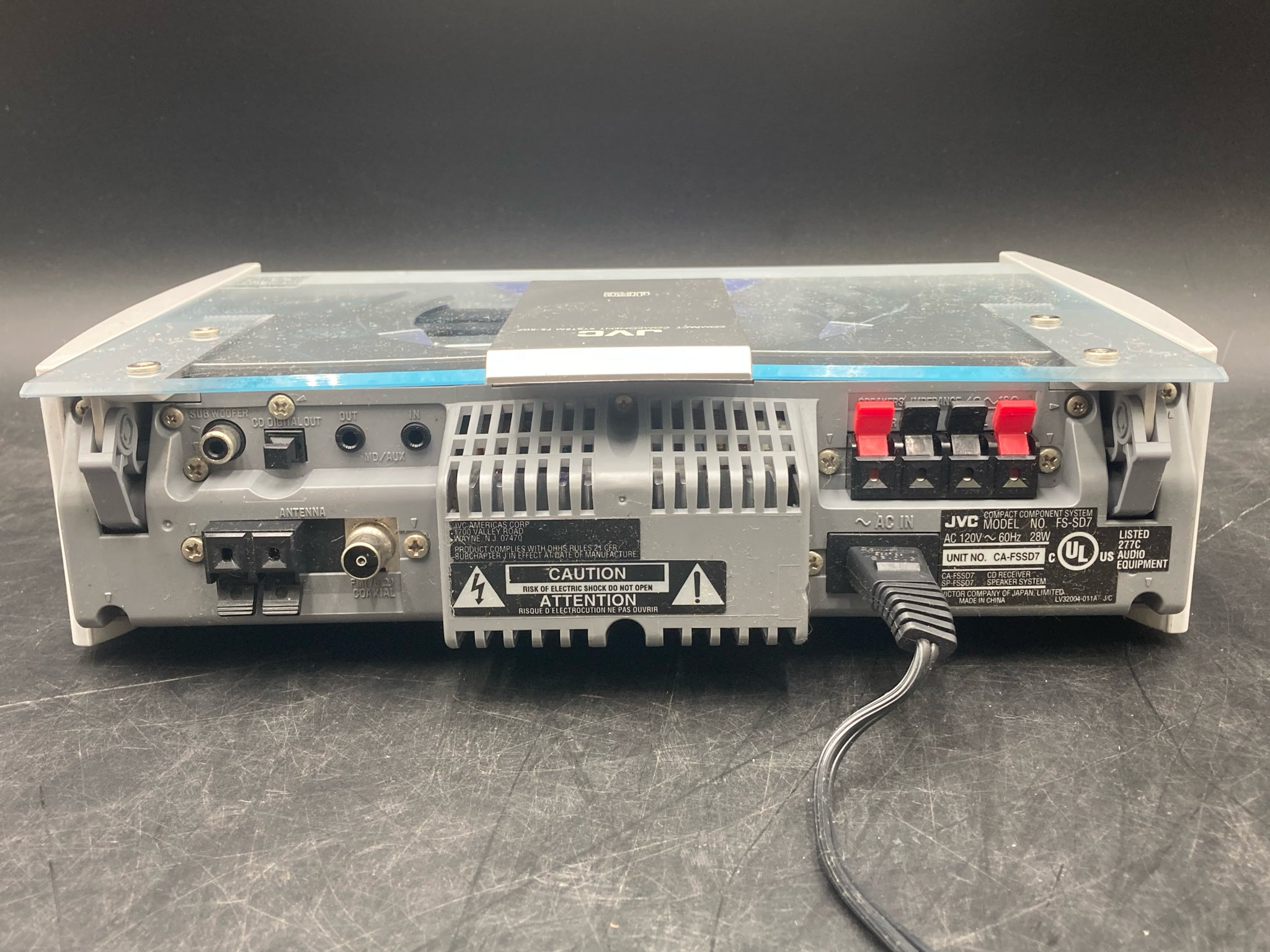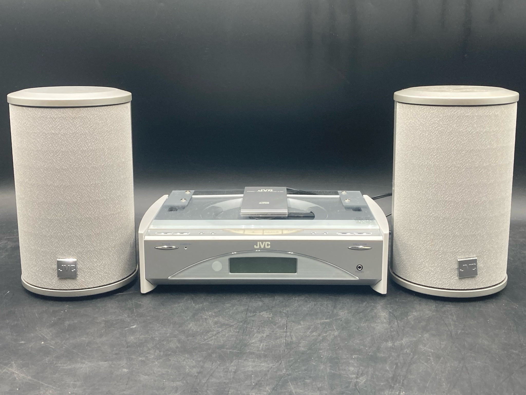JVC FS-SD7 compact component system CD receiver with pair of JVC SP-FSSD7 speakers and power cord. Receiver features am/fm radio and single disc CD player with multiple controls. COmes with two JVC SP-FSSD7 speakers rated for 20 watts of power each. Receiver and speakers are tested in working condition and set is in good physical condition. Will need speaker wire to connect speakers to receiver.