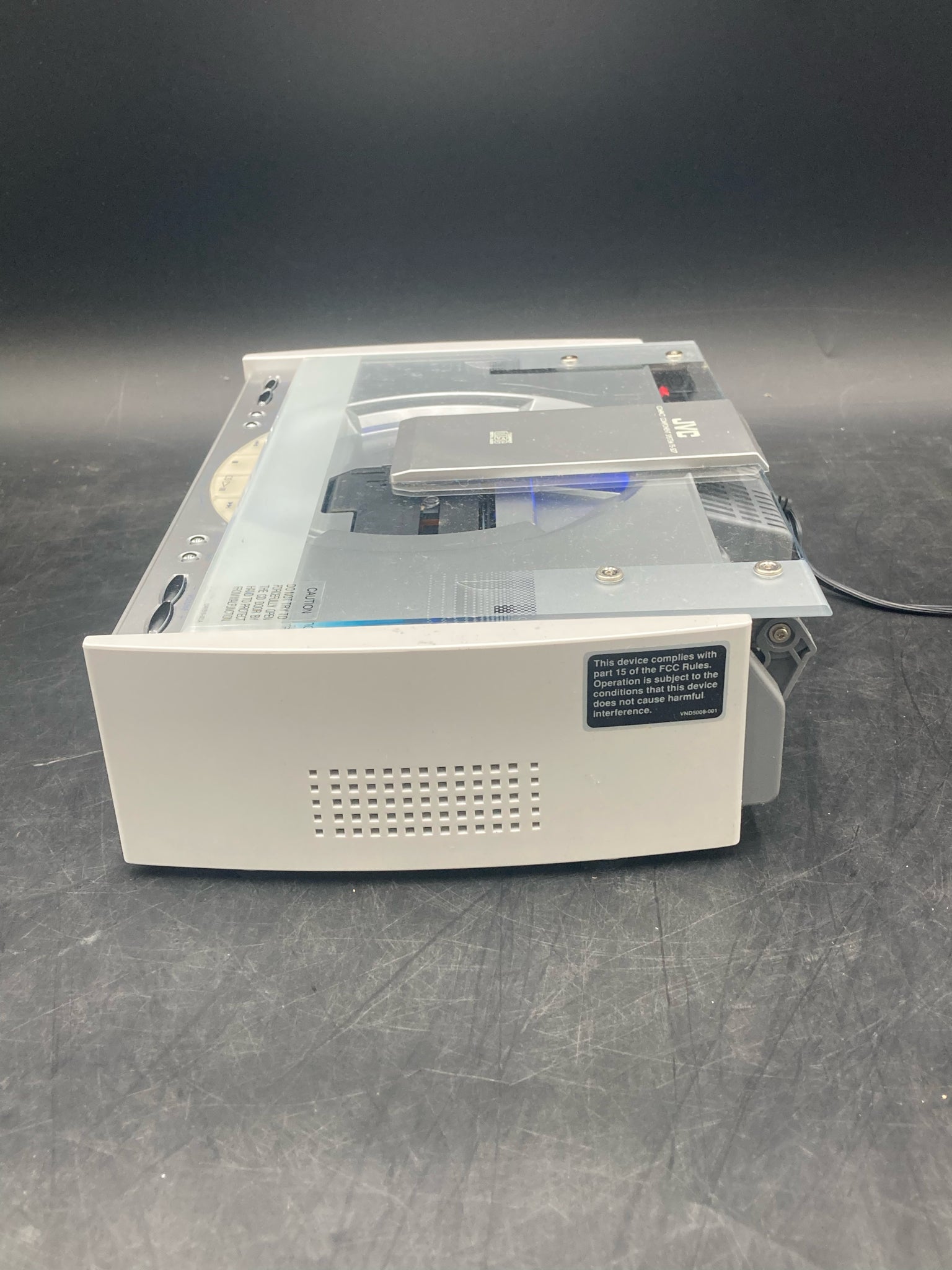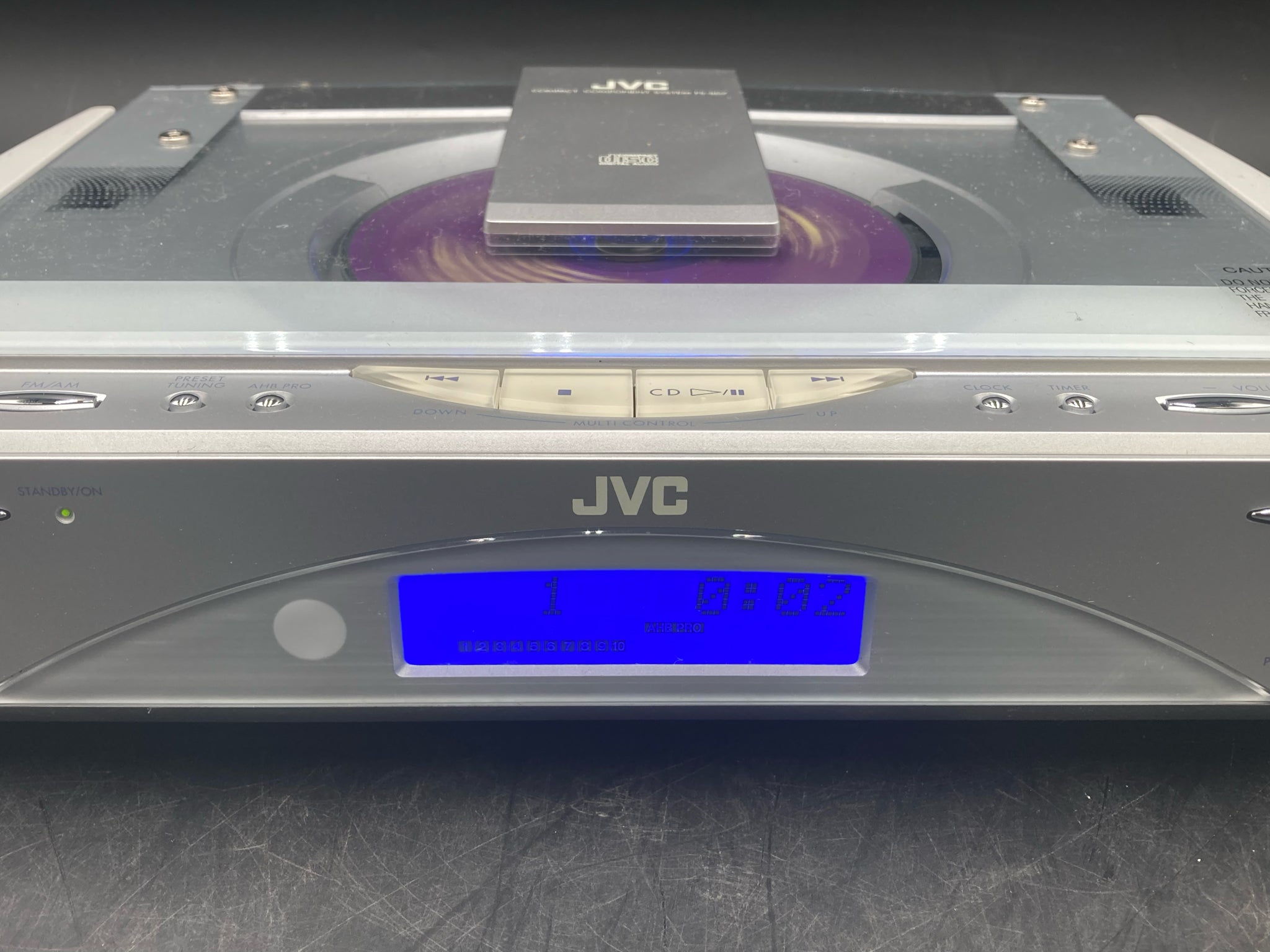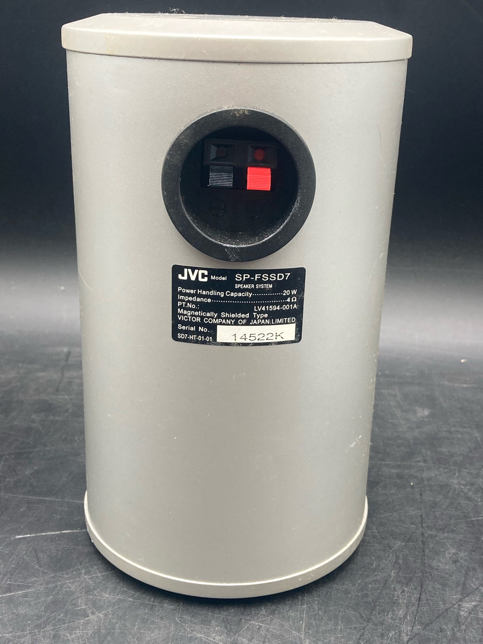 JVC FS-SD7 compact component system CD receiver with pair of JVC SP-FSSD7 speakers and power cord. Receiver features am/fm radio and single disc CD player with multiple controls. COmes with two JVC SP-FSSD7 speakers rated for 20 watts of power each. Receiver and speakers are tested in working condition and set is in good physical condition. Will need speaker wire to connect speakers to receiver.