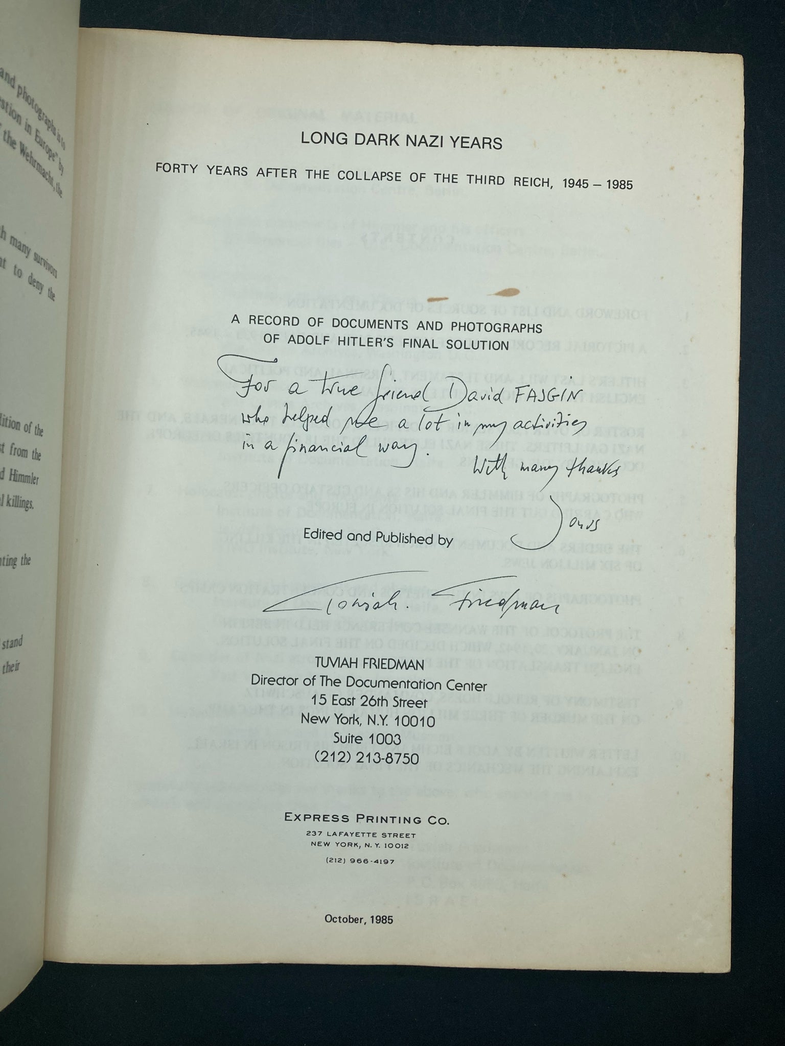 Long dark nazi years: Forty years after the collapse of the third reich 1945-1985 by Tuviah Friedmann. Paperback. 1985 printing by Express Printing Company. A detailed collection of documents and photographs of the third reich and the aftermath of their f