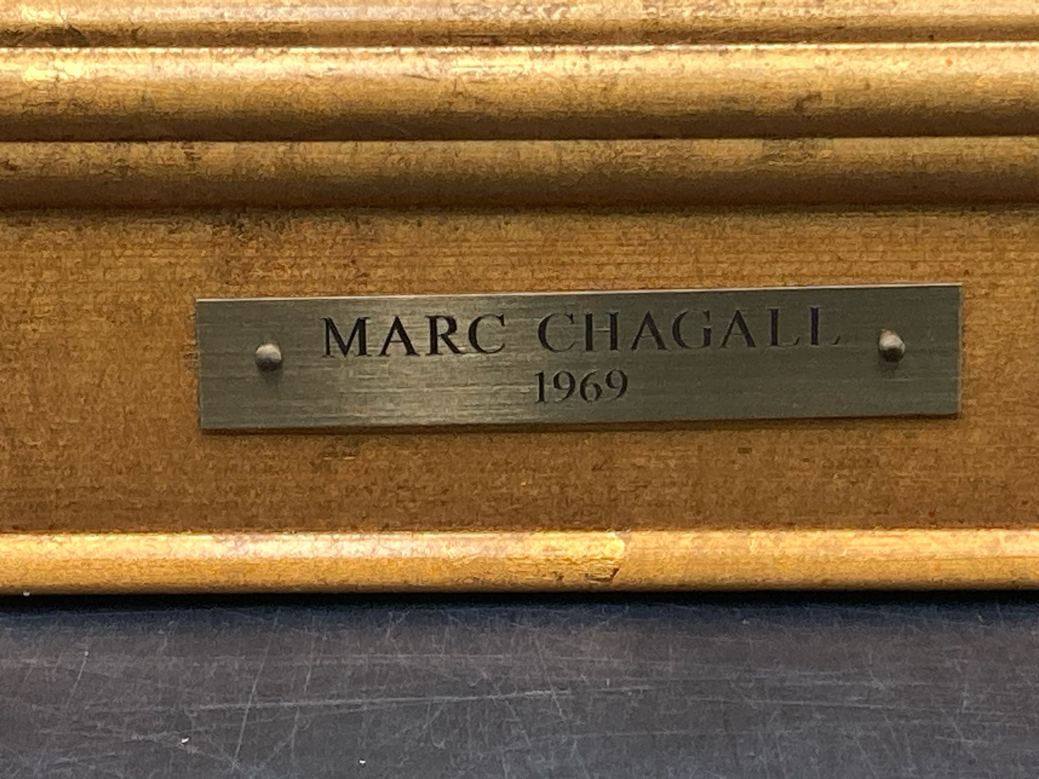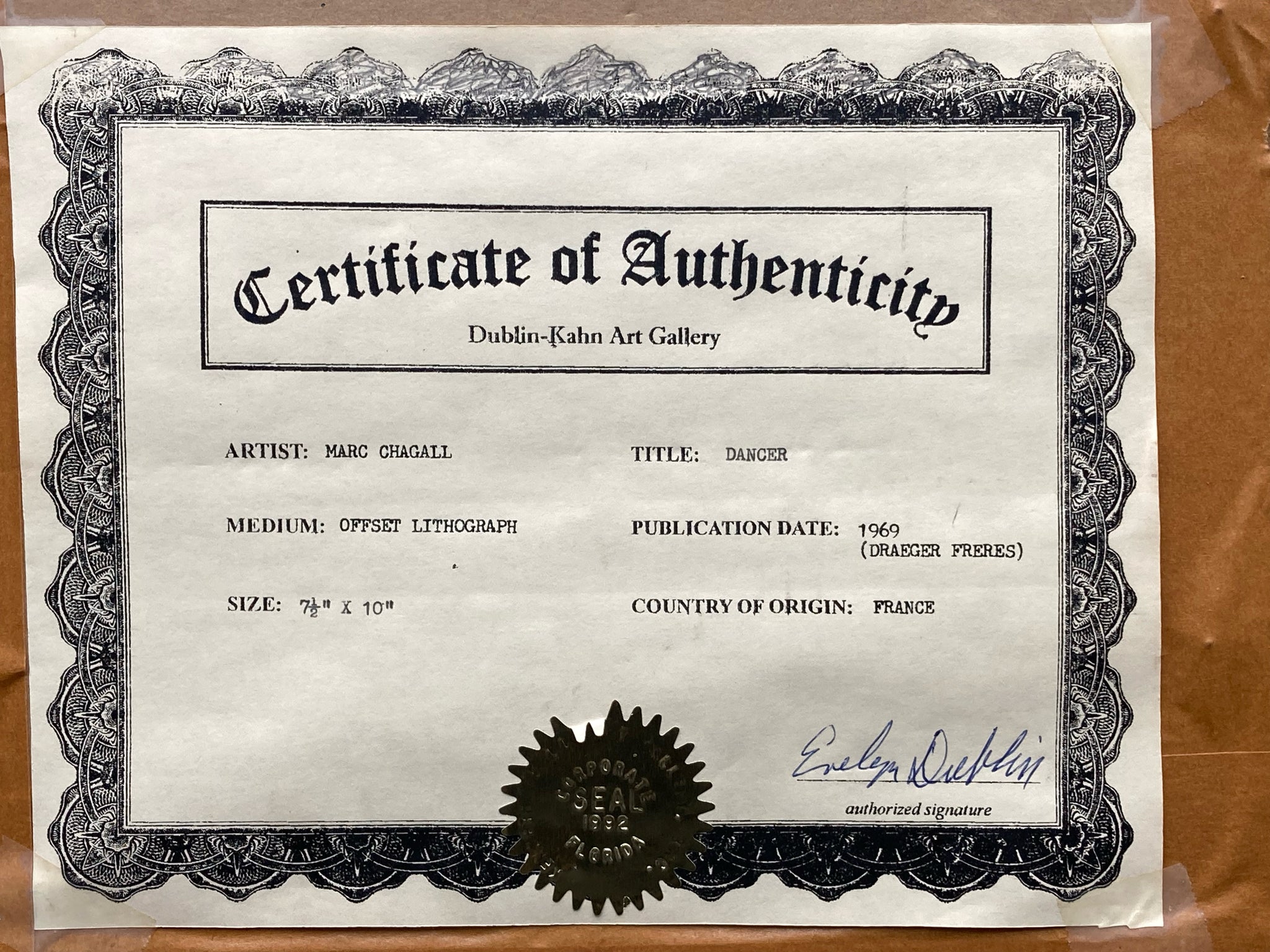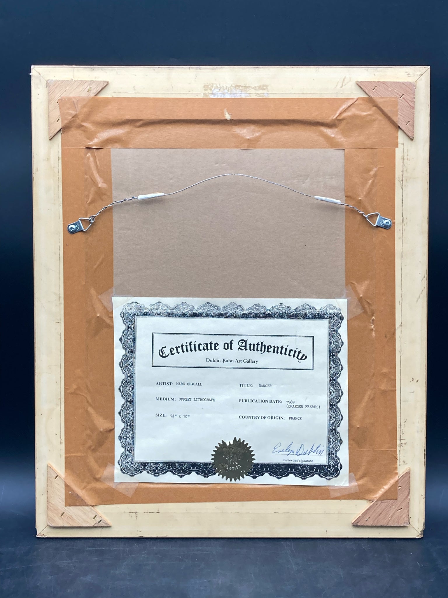 Marc Chagall "Dancer" framed lithograph print with certificate of authenticity. Rare offset lithograph print based on Chagall's original painting of an explicit ballerina dancing scene. Backside has attached certificate of authenticity from Dublin-Kahn art gallery with more information on the print, signed by gallery representative. Print is given a gold toned wood frame with a plaque on the bottom with artist name and year of production. Print measures 7.5" wide by 10" long, total size with frame is 15" wide by 18" tall. Frame has one chip on lower right corner, print is in excellent condition.