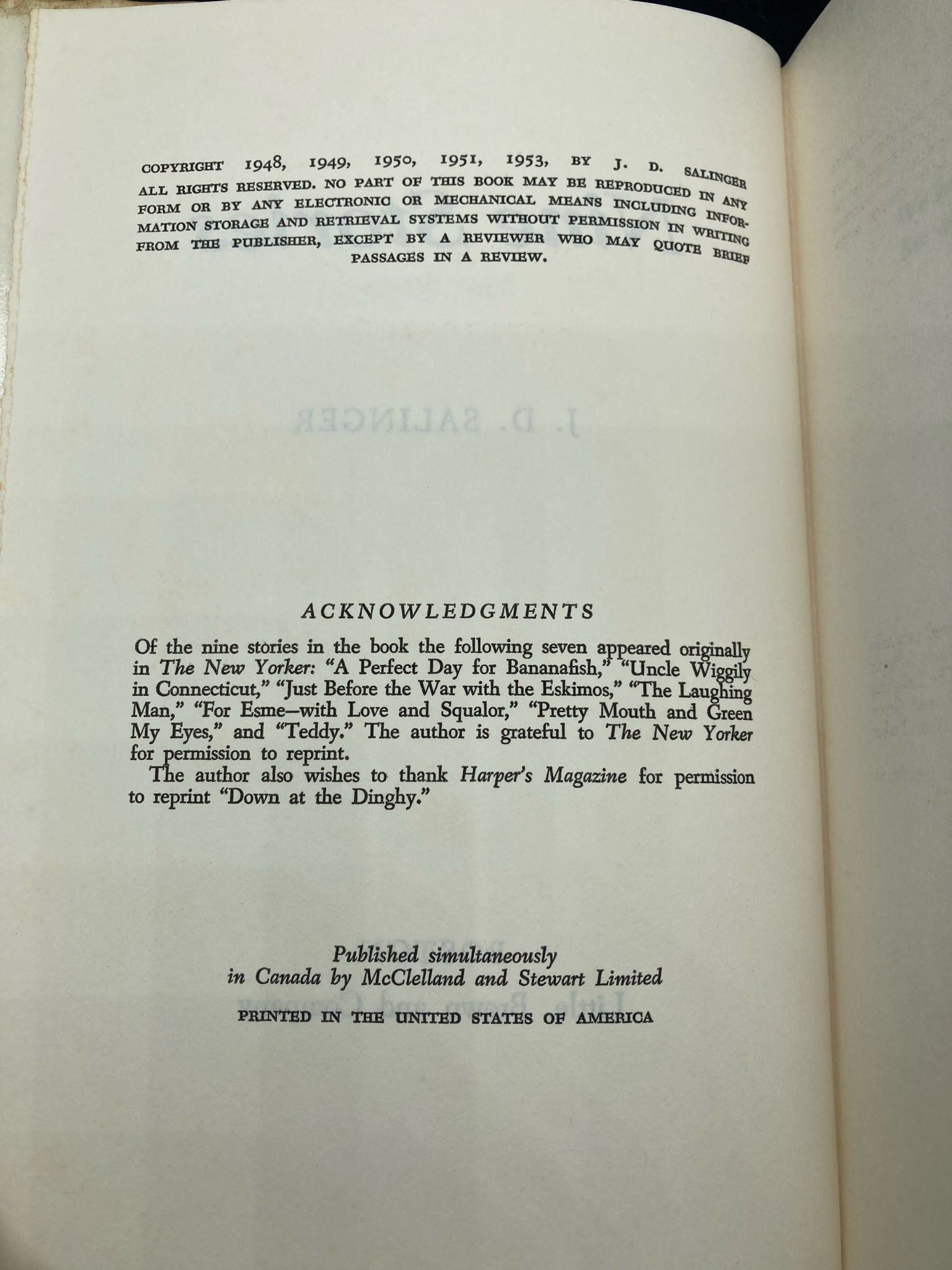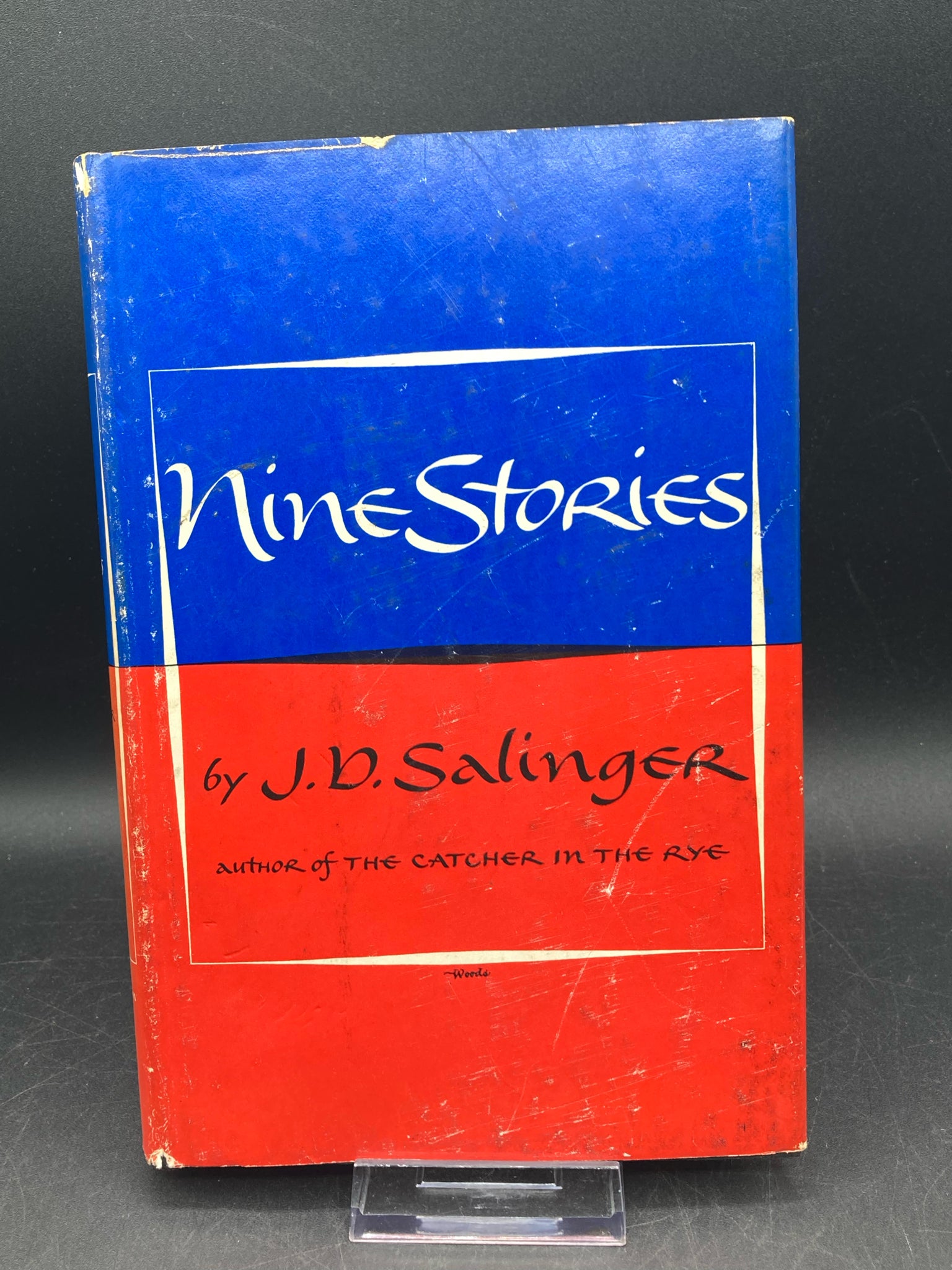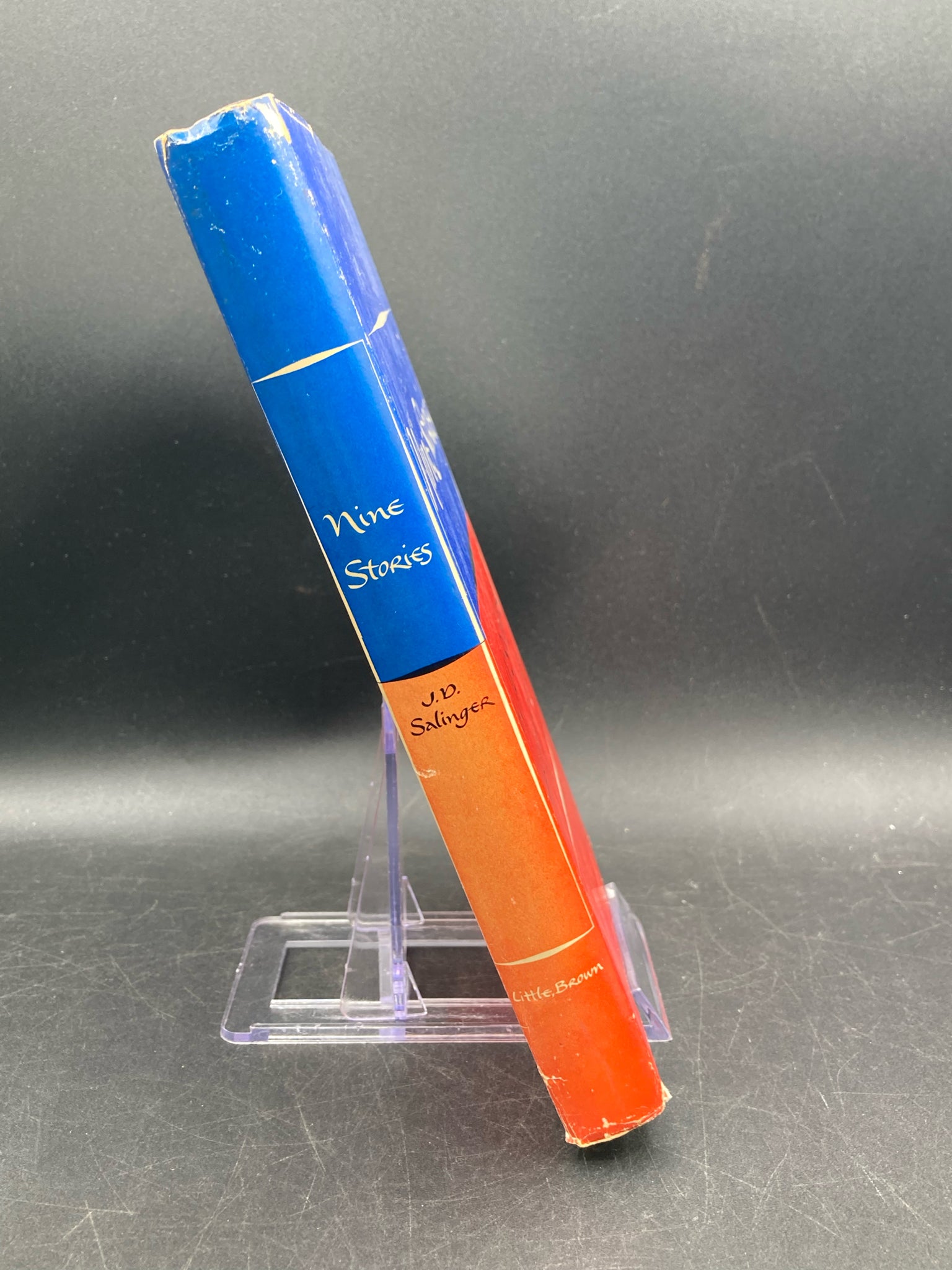 Nine Stories by J.D. Salinger. Hardcover with dust jacket. 1953 book club edition printing by Little, Brown and Company. Some visible wear to dust jacket and light wear to covers, otherwise book is in good condition with clean pages and fully intact spine.