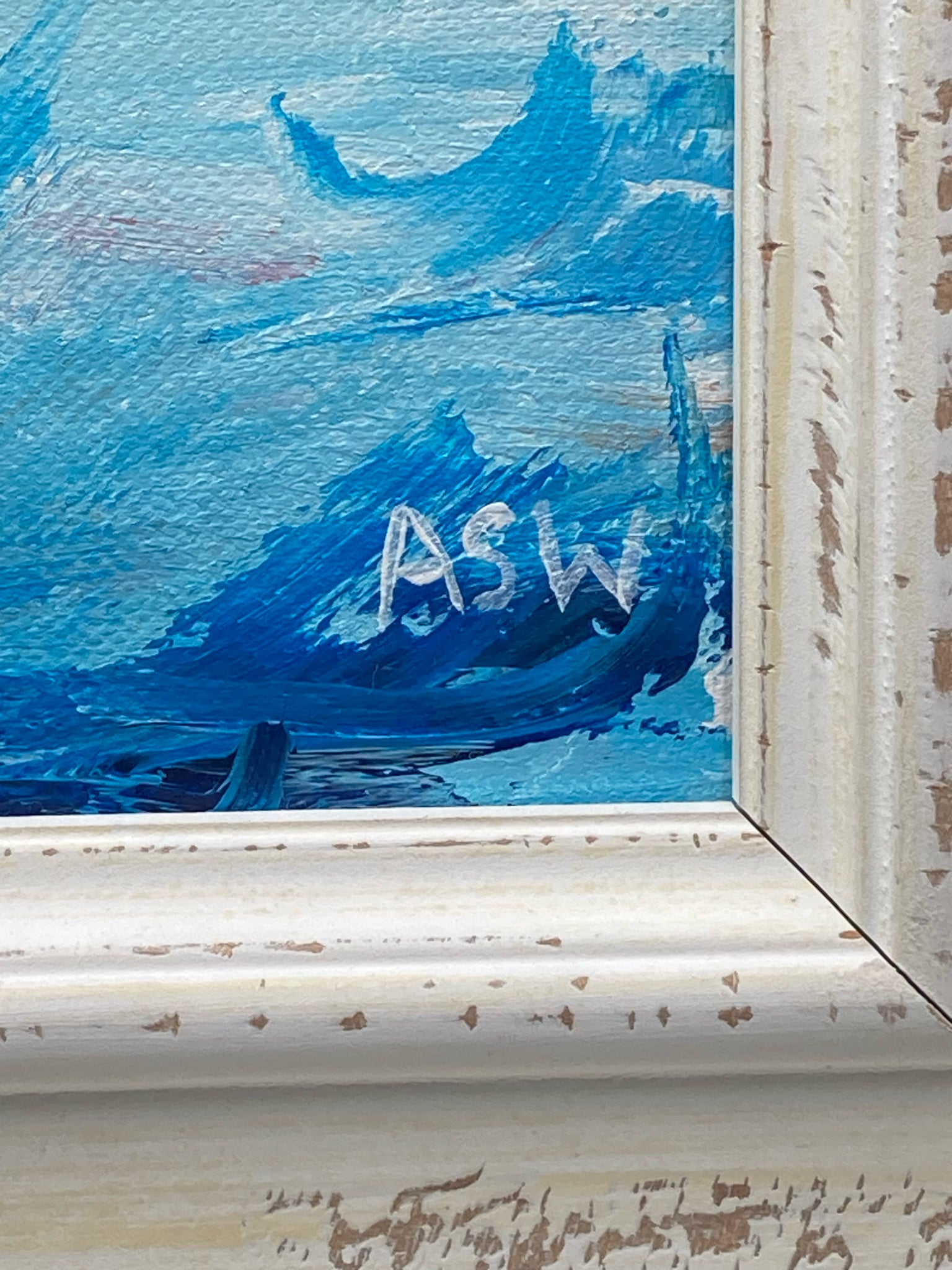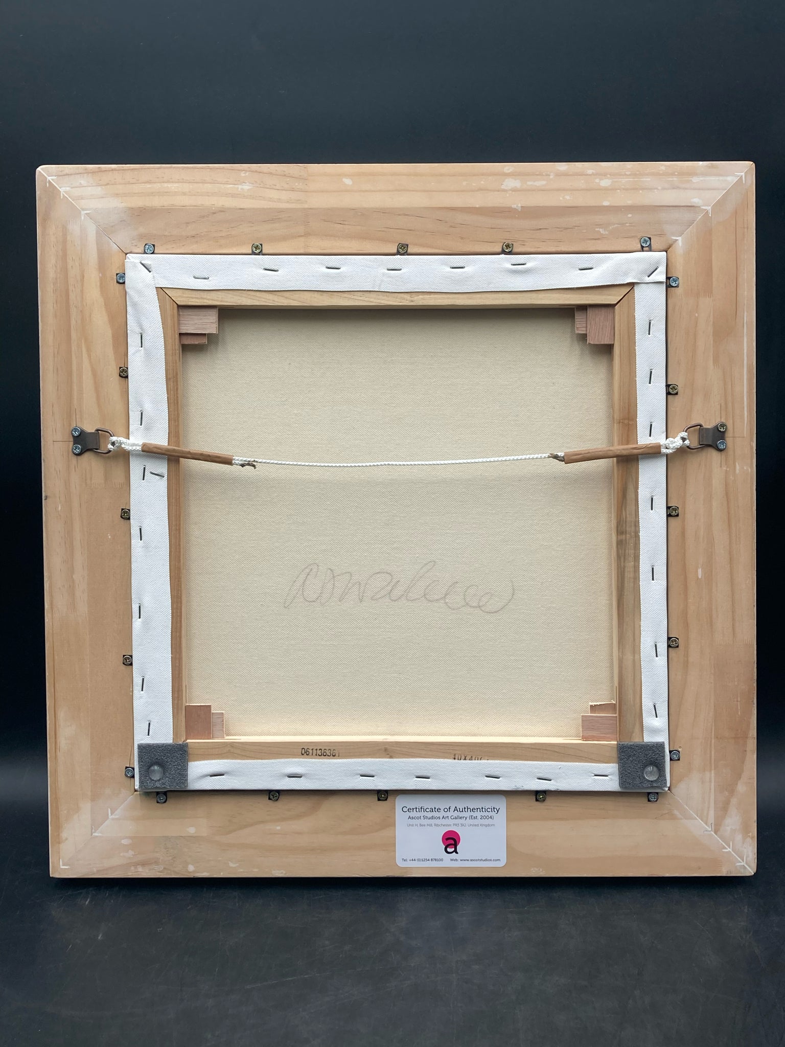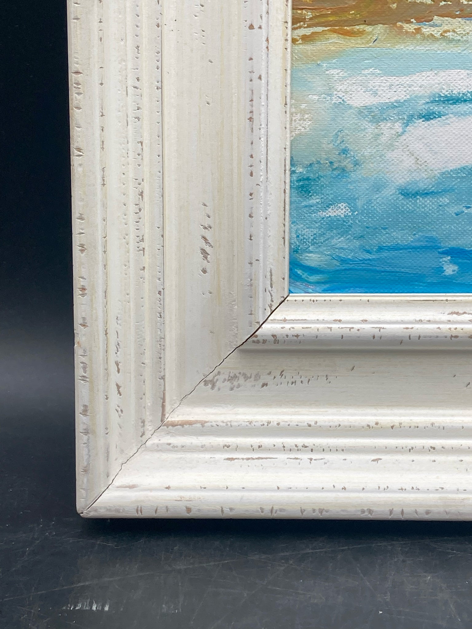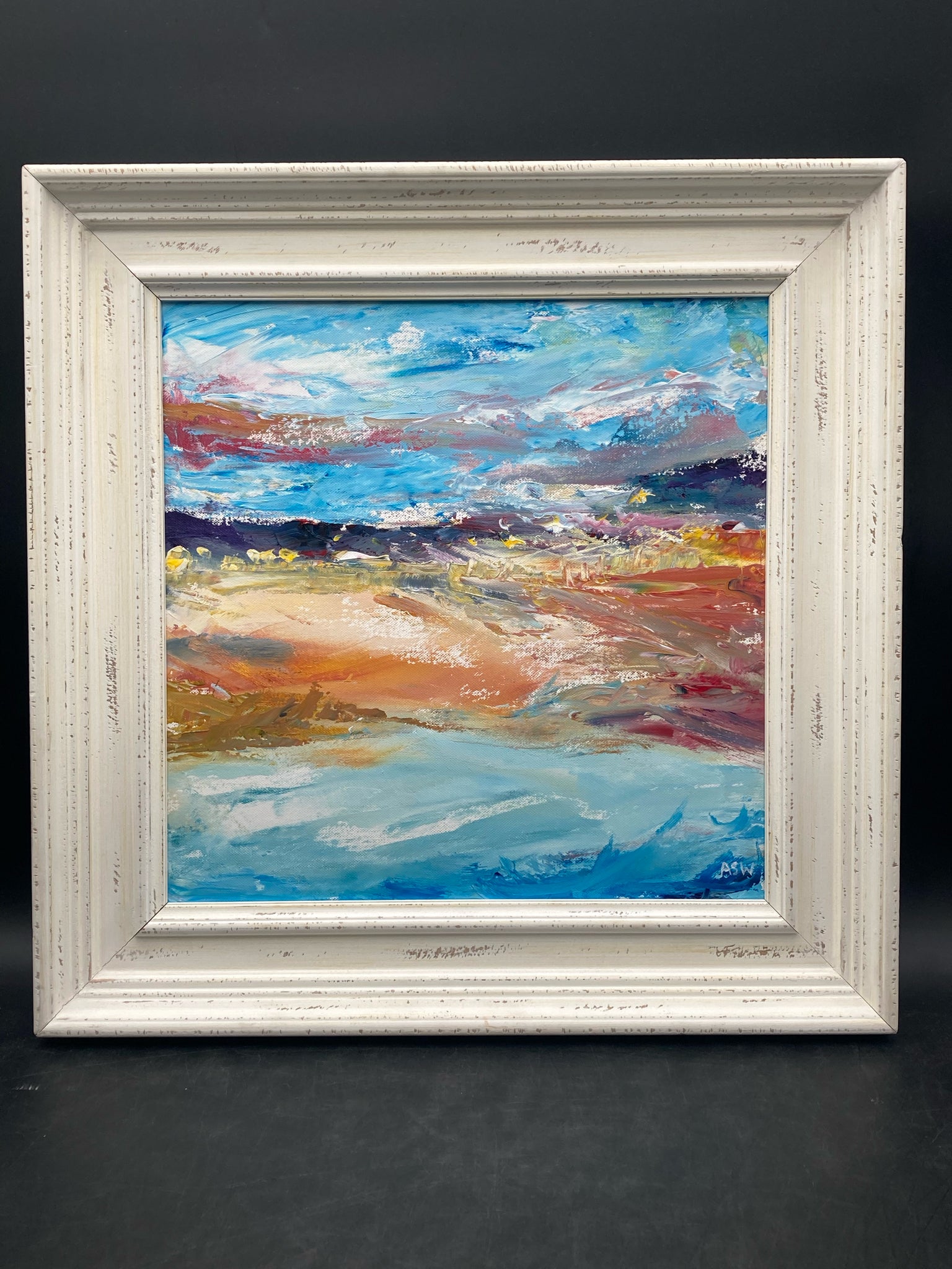 Original 16x16" framed Angela Wakefield impressionst abstract river scene painting with Ascot Studio Galleries certificate of authenticity. Oil on canvas. Abstract evening time river scene with mountains in the background using vibrant colors. Artwork is given a contemporary styled wood frame with a weathered coastal look. Artwork measures 16" wide and 16" tall, total size with frame is 21" wide and 21" tall. Signed by the artist on front bottom left corner and on back of canvas. Ascot Studio certificate of authenticity is noted on backside of frame. Artwork is in excellent, well cared for condition.