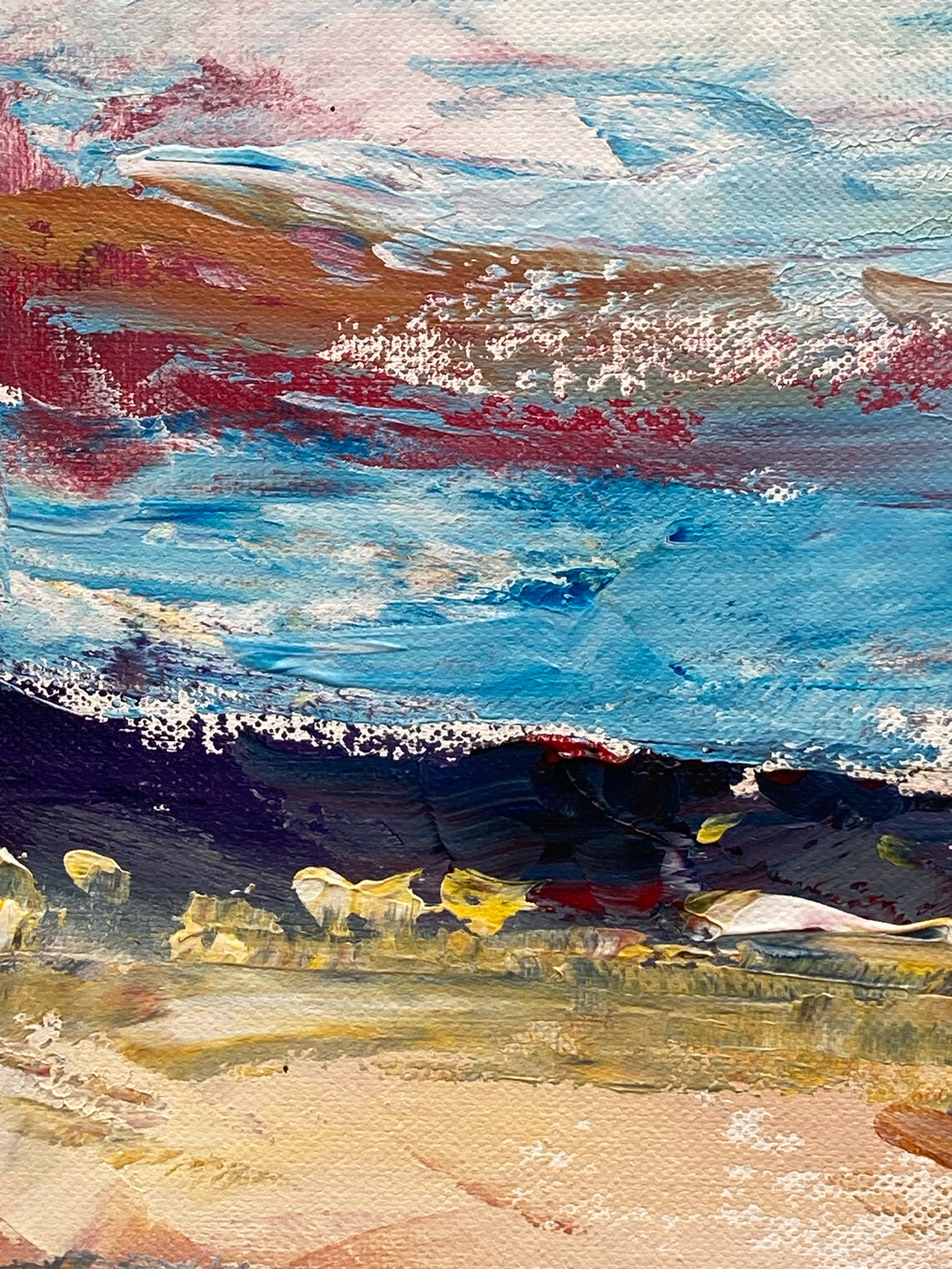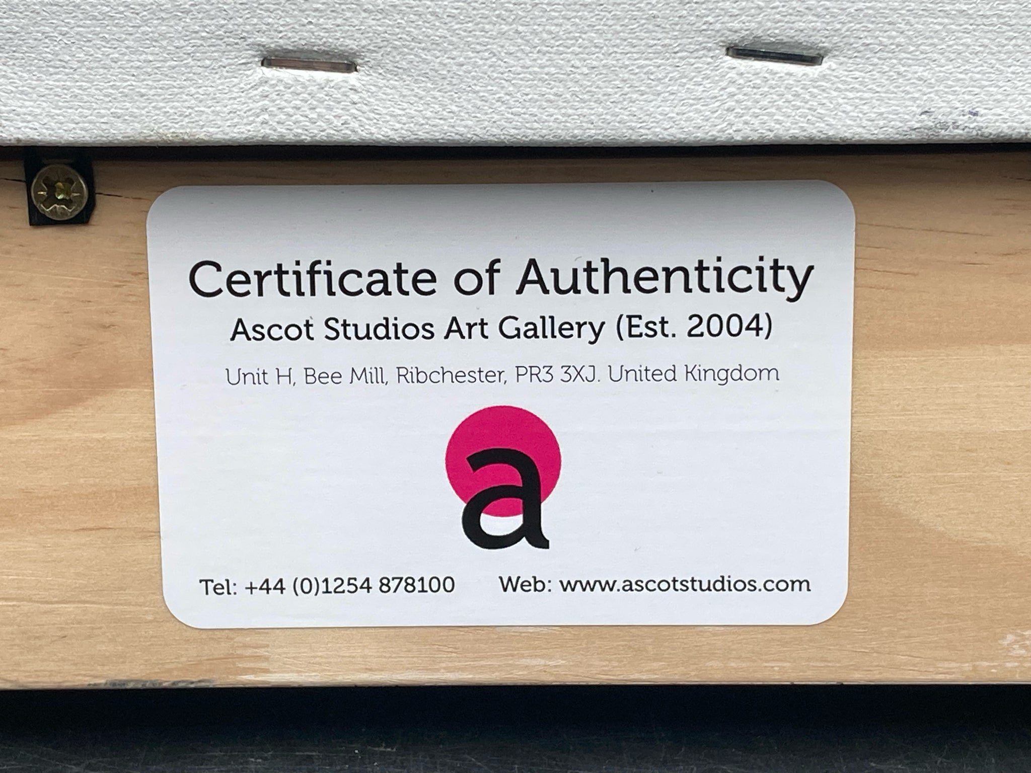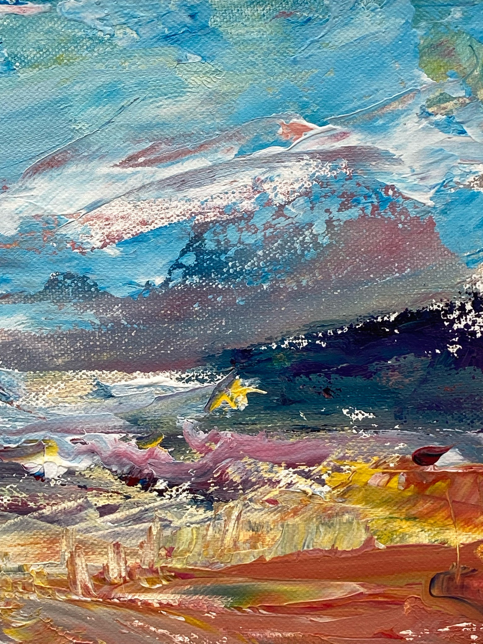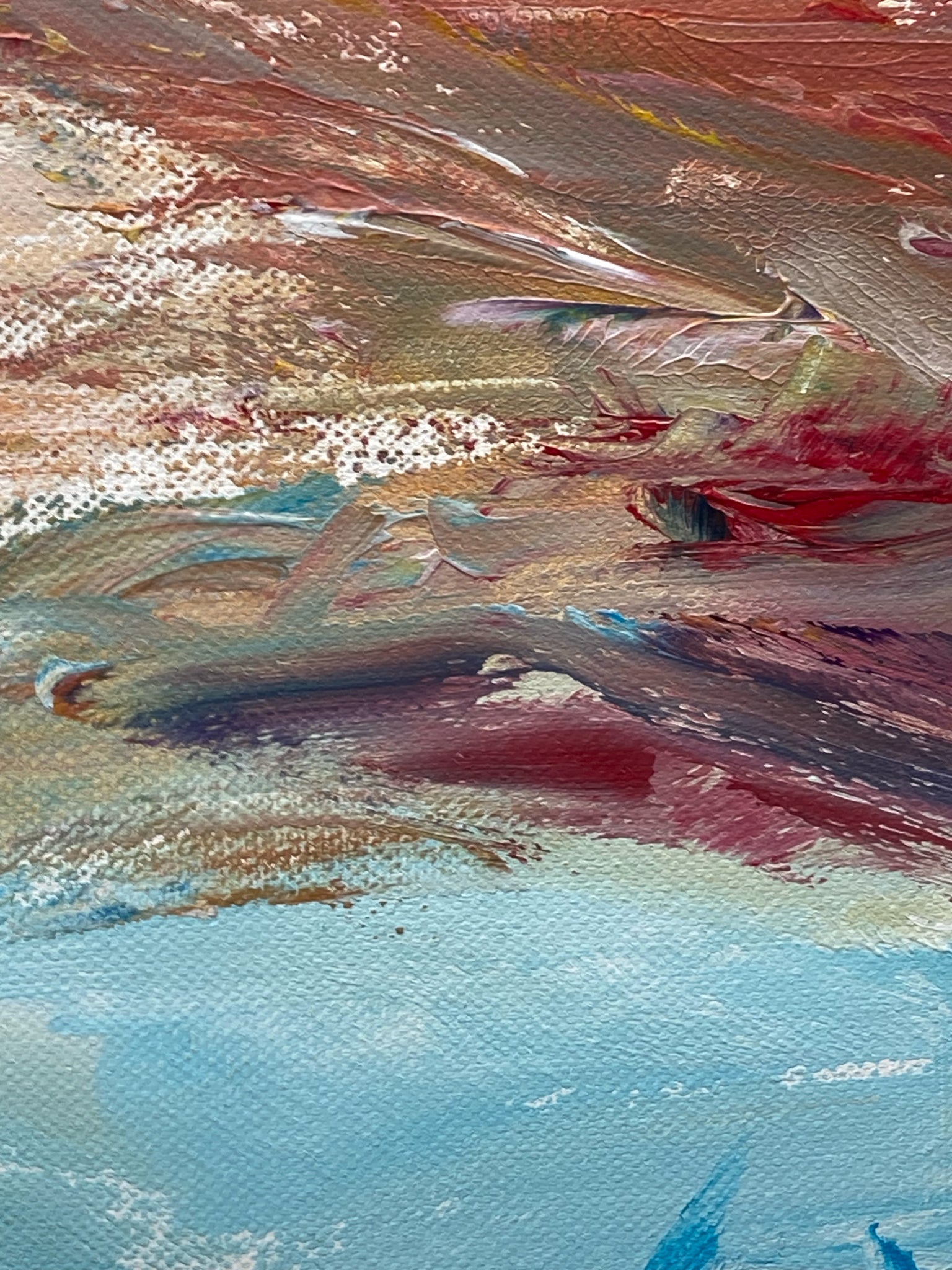 Original 16x16" framed Angela Wakefield impressionst abstract river scene painting with Ascot Studio Galleries certificate of authenticity. Oil on canvas. Abstract evening time river scene with mountains in the background using vibrant colors. Artwork is given a contemporary styled wood frame with a weathered coastal look. Artwork measures 16" wide and 16" tall, total size with frame is 21" wide and 21" tall. Signed by the artist on front bottom left corner and on back of canvas. Ascot Studio certificate of authenticity is noted on backside of frame. Artwork is in excellent, well cared for condition.