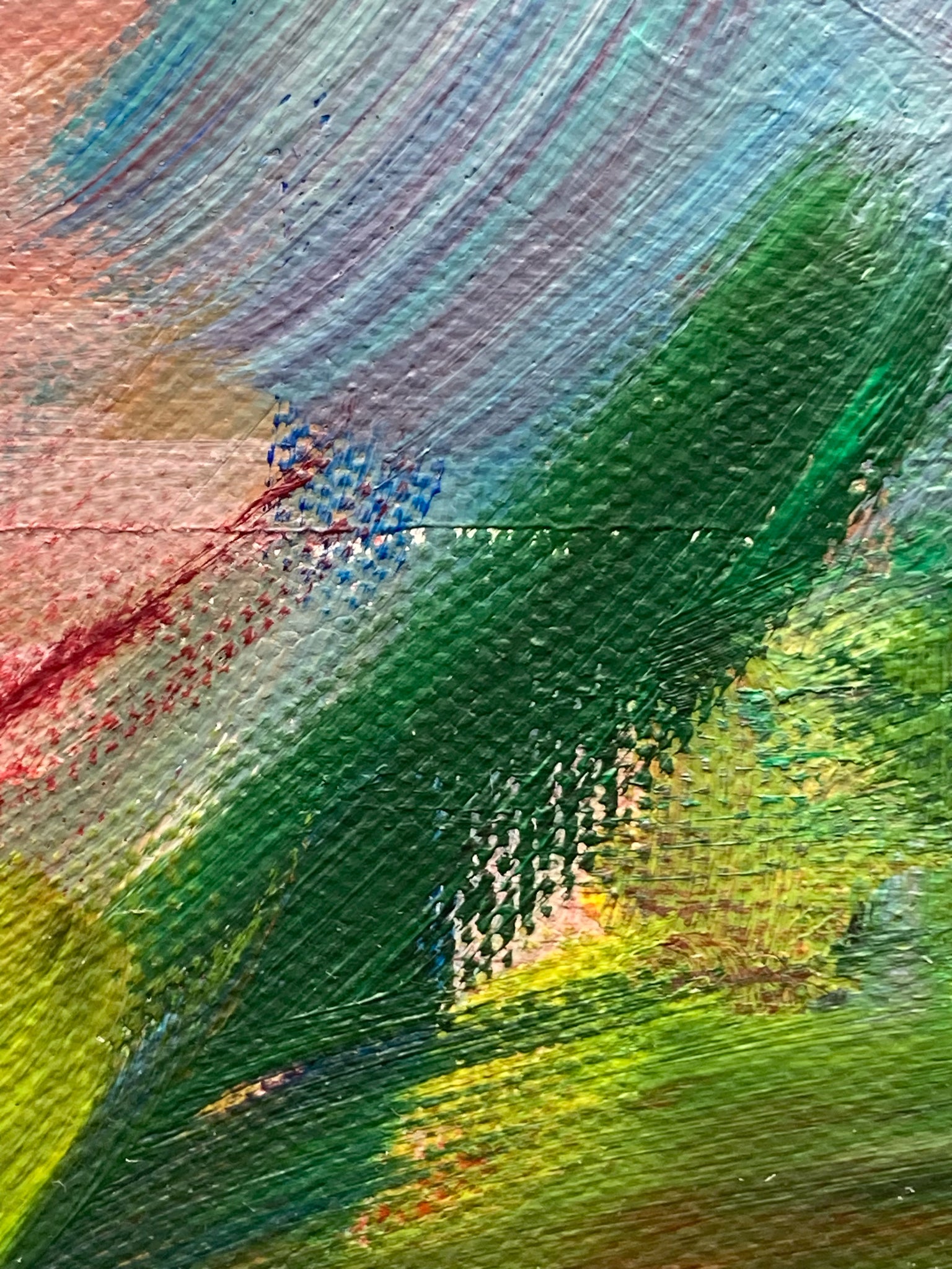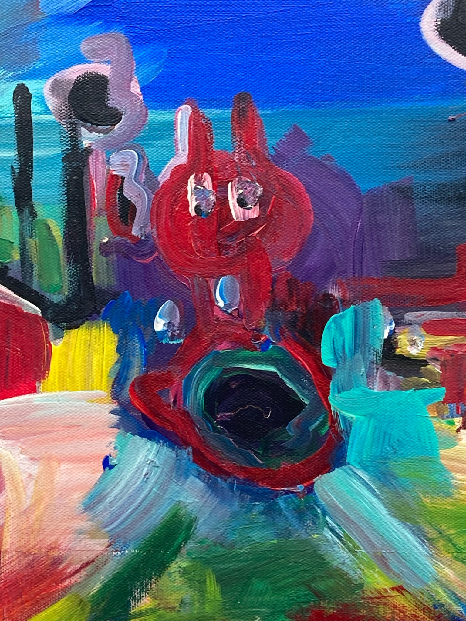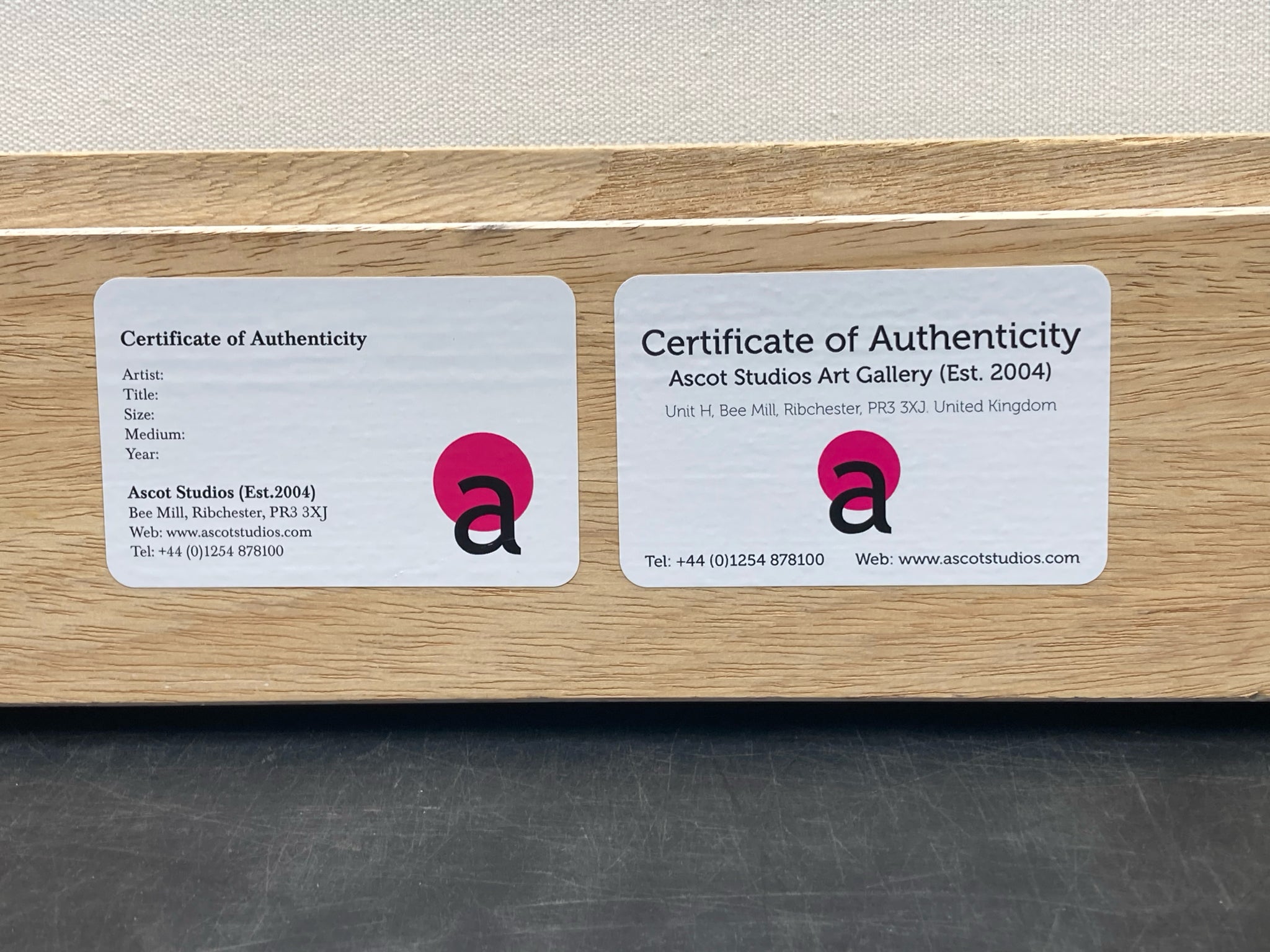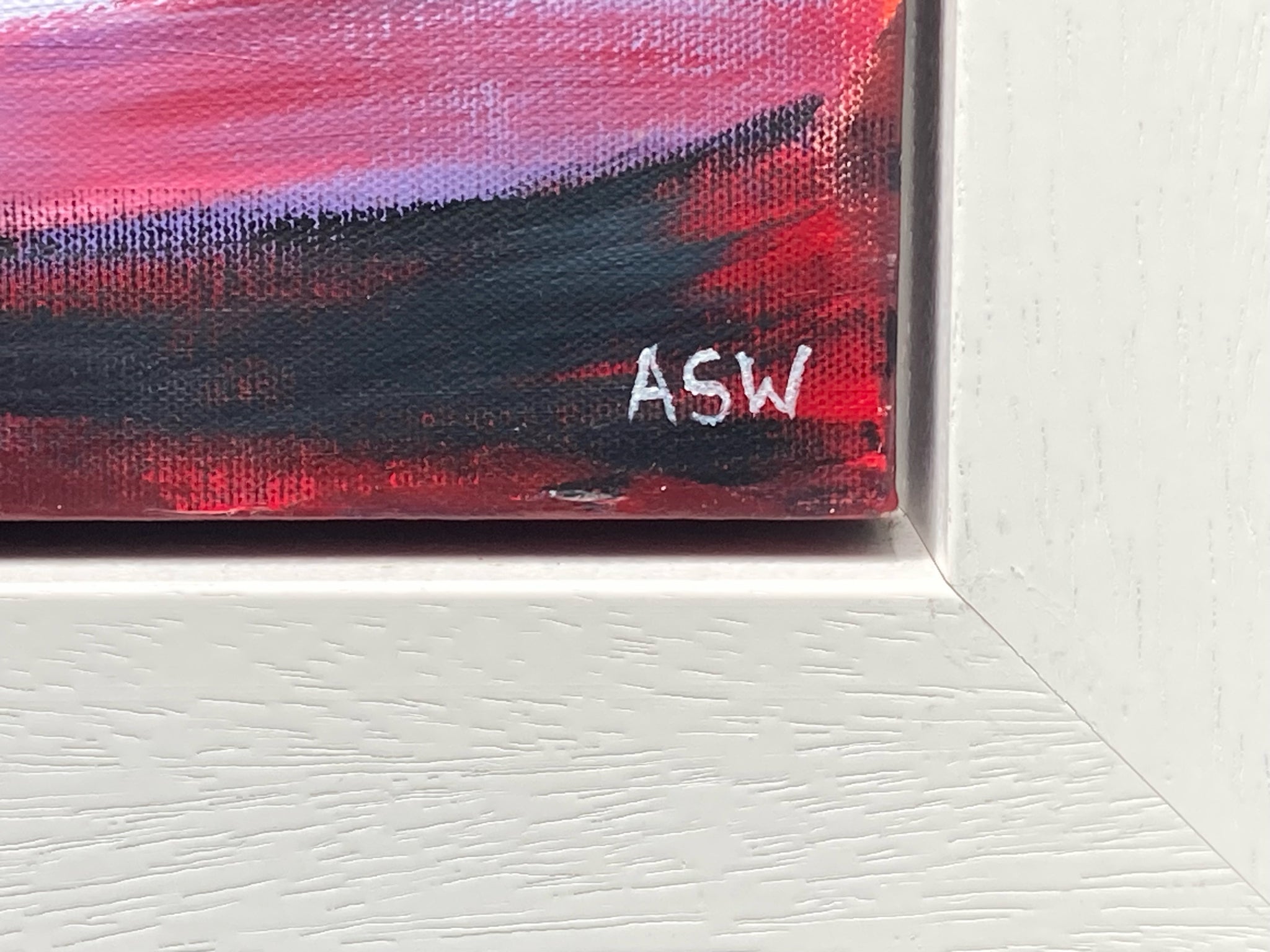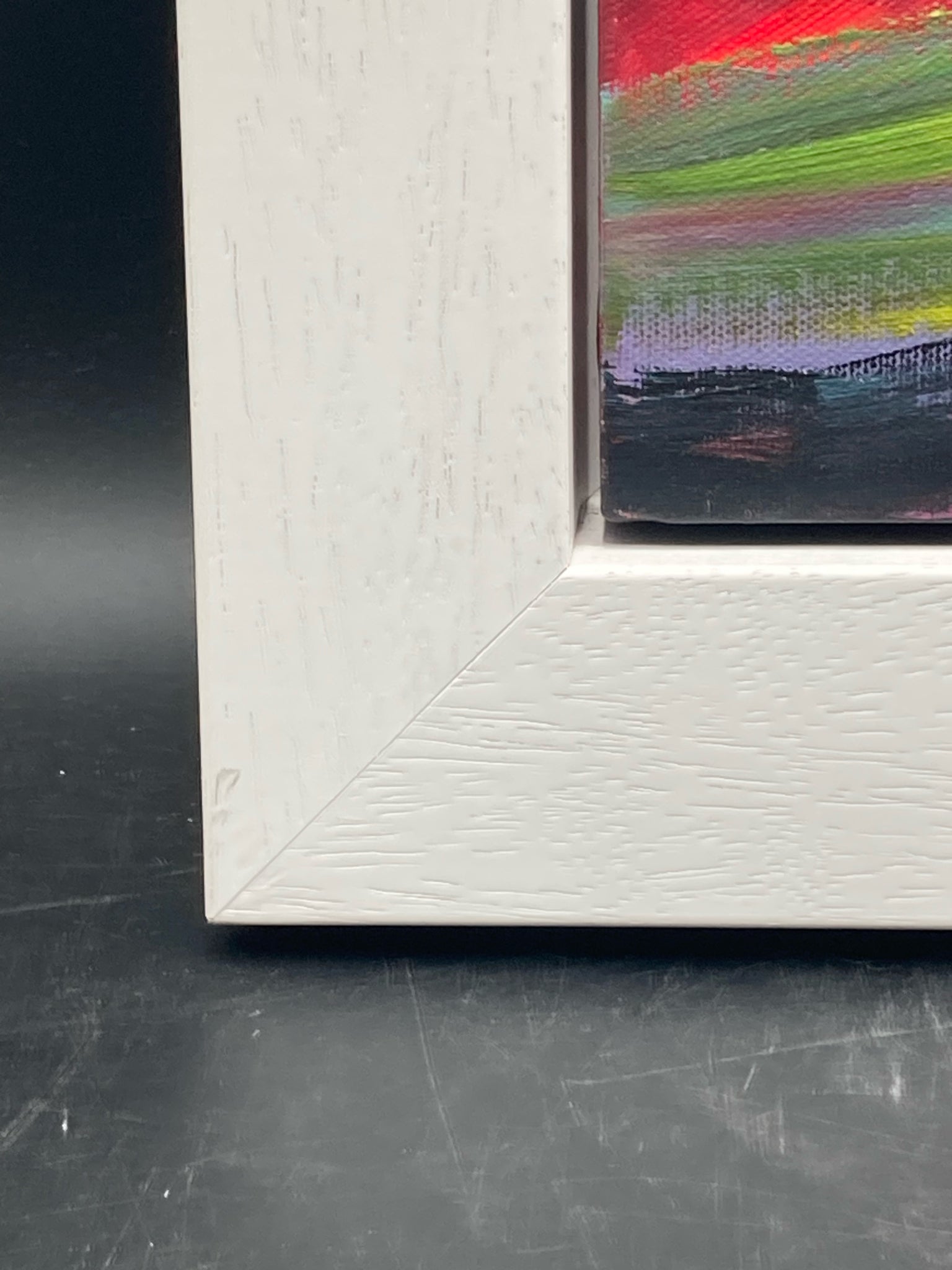 Original framed 24x24" Angela Wakefield psychedelic abstract city scape painting with certificate of authenticity from Ascot Studio Galleries. Oil on canvas. Abstract city scape painting with dark, brooding atmosphere based on London, England with a face visible in the middle of the painting. Artwork is given a white colored contemporary styled wood frame. Artwork measures 24" wide and 24" tall, total size with frame is 29" wide by 29" tall. Signed by the artist on front bottom left corner and backside of canvas. Ascot Studio certificate of authenticity noted on backside of frame. One small imperfection noted near middle of painting, otherwise item is in excellent condition.