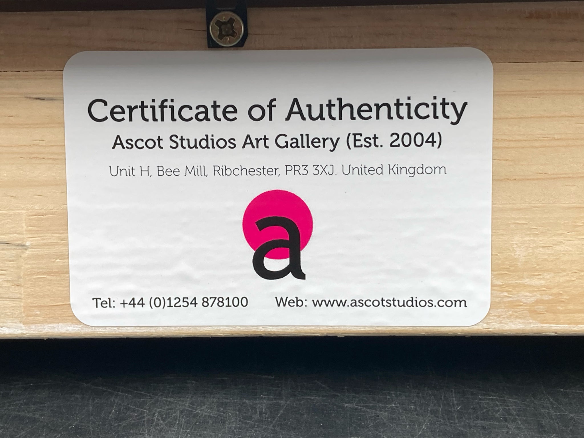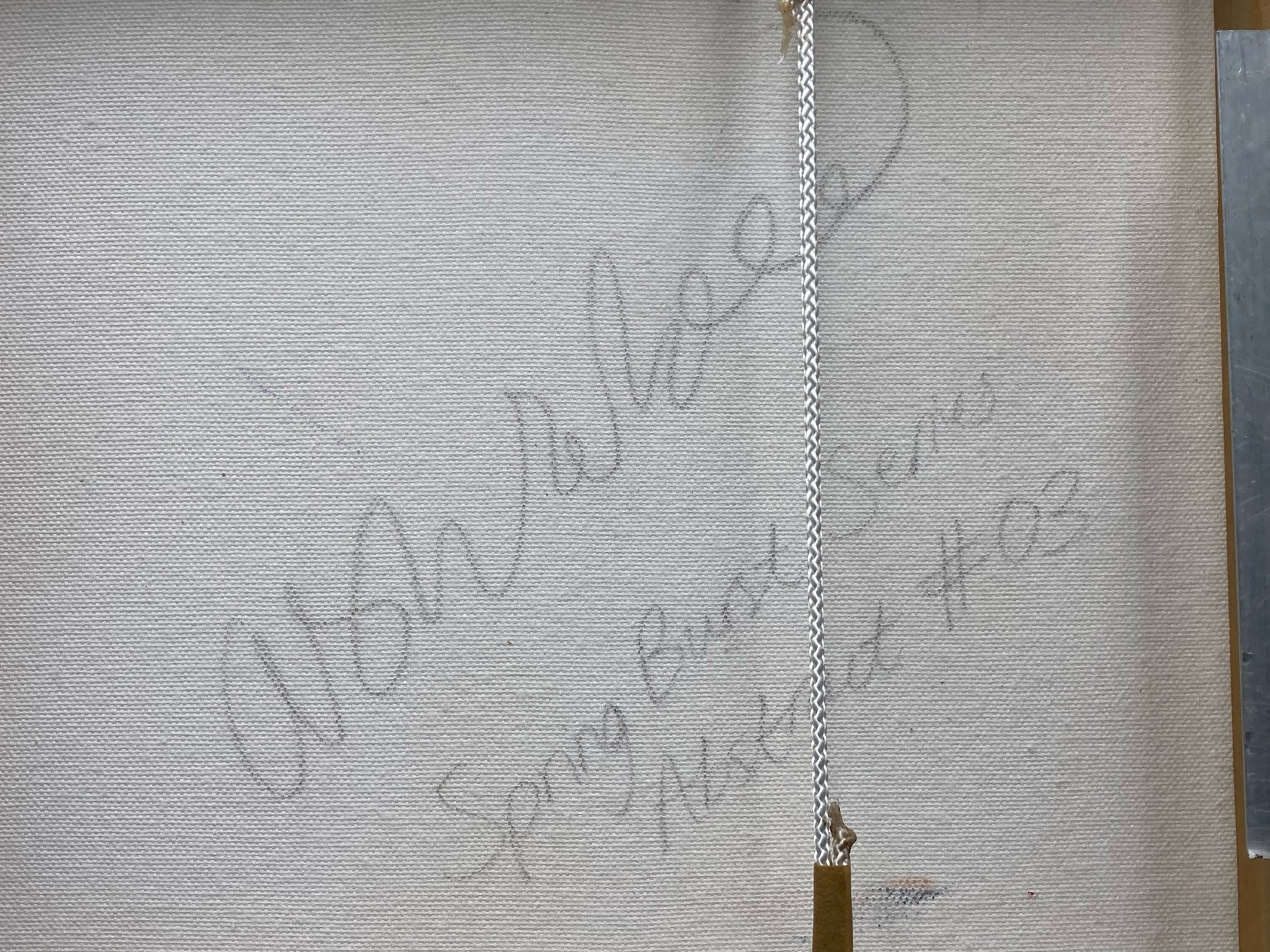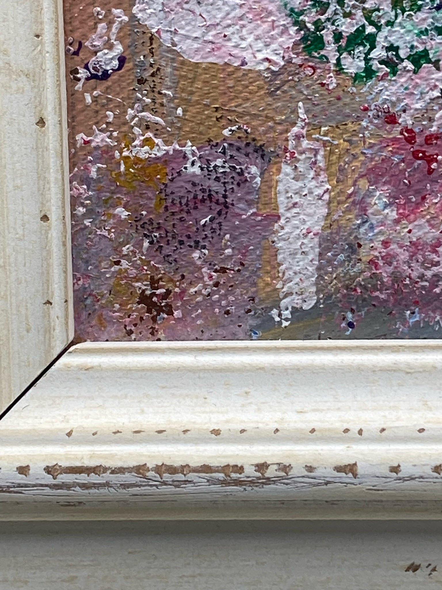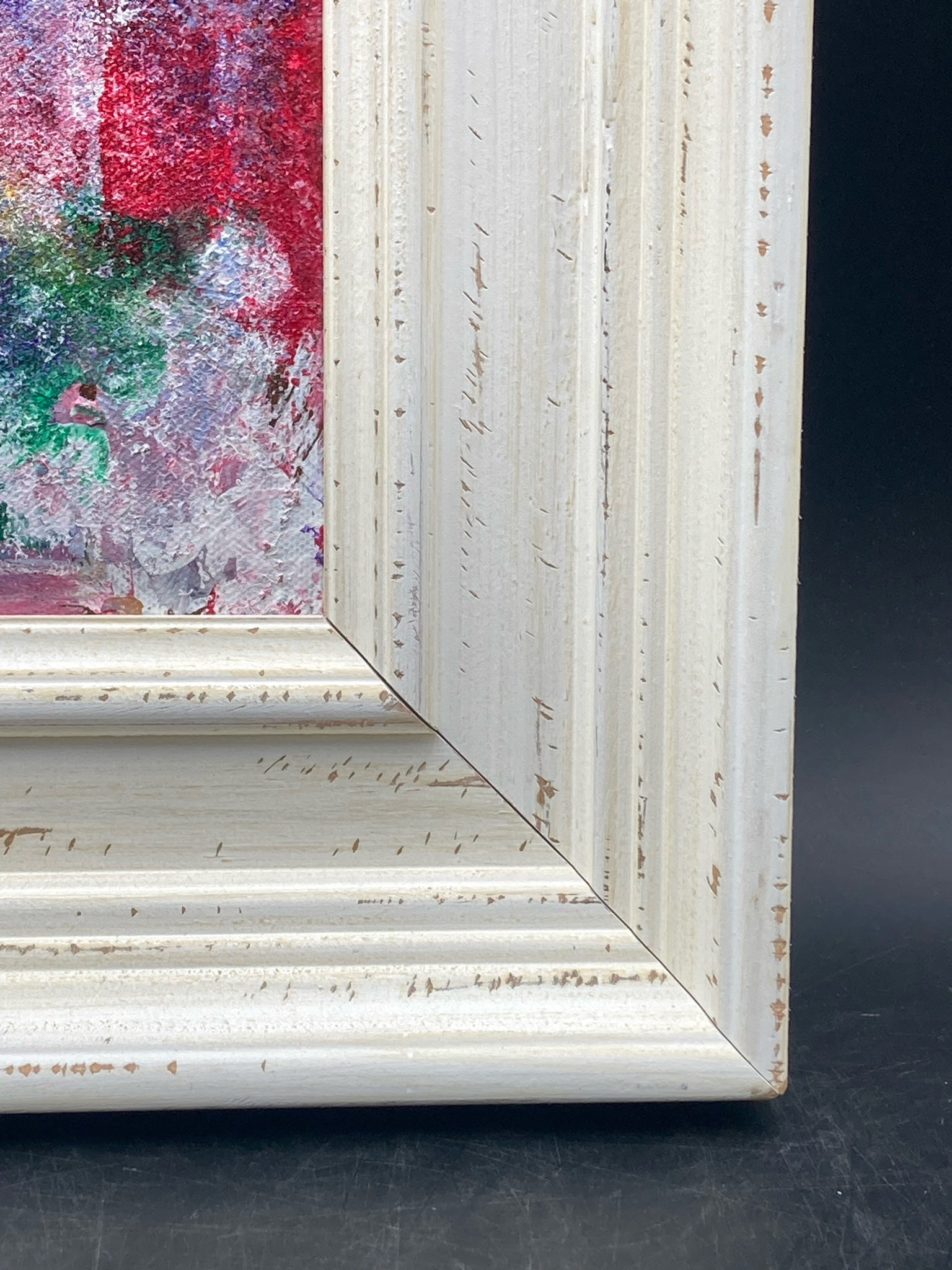 Framed original Angela Wakefield spring burst series abstract number 03 painting with certificate of authenticity from Ascot Studio Galleries. Mixed media on canvas. Impressionist abstract floral bloom with many vibrant colors. Painting is given a contemporary white colored wood frame with a weathered, coastal style look. Painting is signed by the artist in lower right corner and on backside of canvas. Ascot Studio issued certificate of authenticity on backside of frame is noted in photos. Artwork measures 12" wide by 12" tall, total size is 18" wide by 18" tall. Artwork is in excellent, well cared for condition.