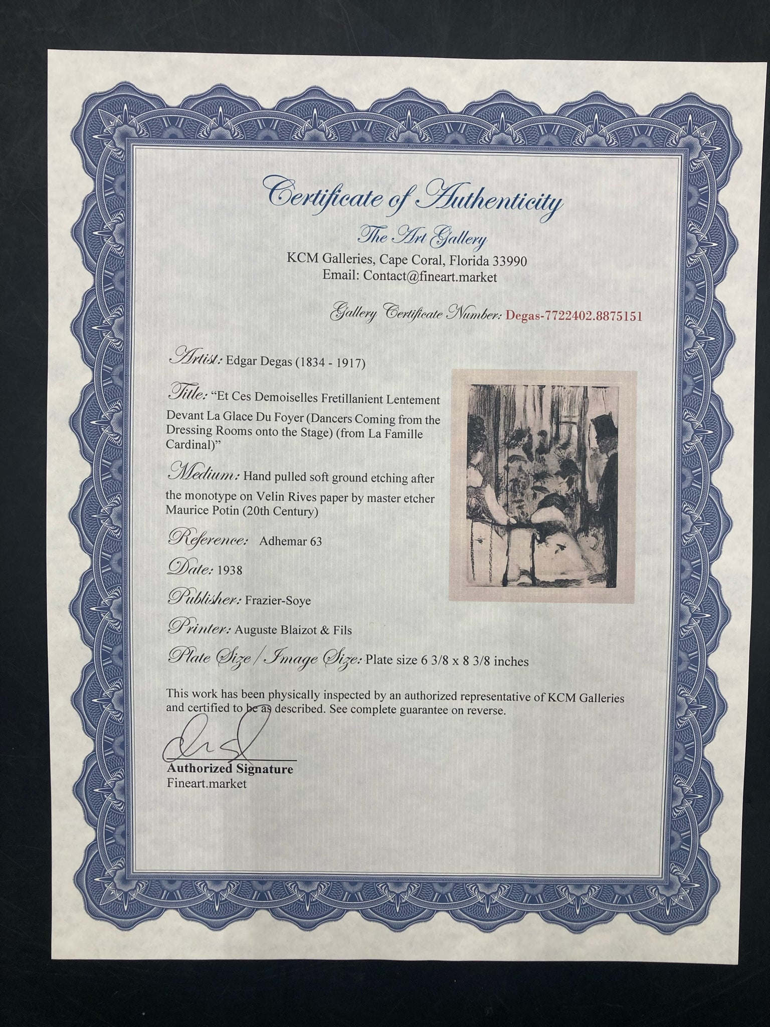 Original Edgar Degas "Dancers coming from the dressing rooms onto the stage" soft ground etching with certificate of authenticity. Original etching done by Degas and plate printed on Velin Rives paper by Maurice Potin in 1938. Depicts a scene of French ballet dancers readying for a performance. Etching measures 6 3/8" wide by 8 3/8" tall, total size with frame is 16" wide by 18" tall. Certificate of authenticity is issued by KCM Galleries and provides further information on the piece. Etching is in excellent condition.