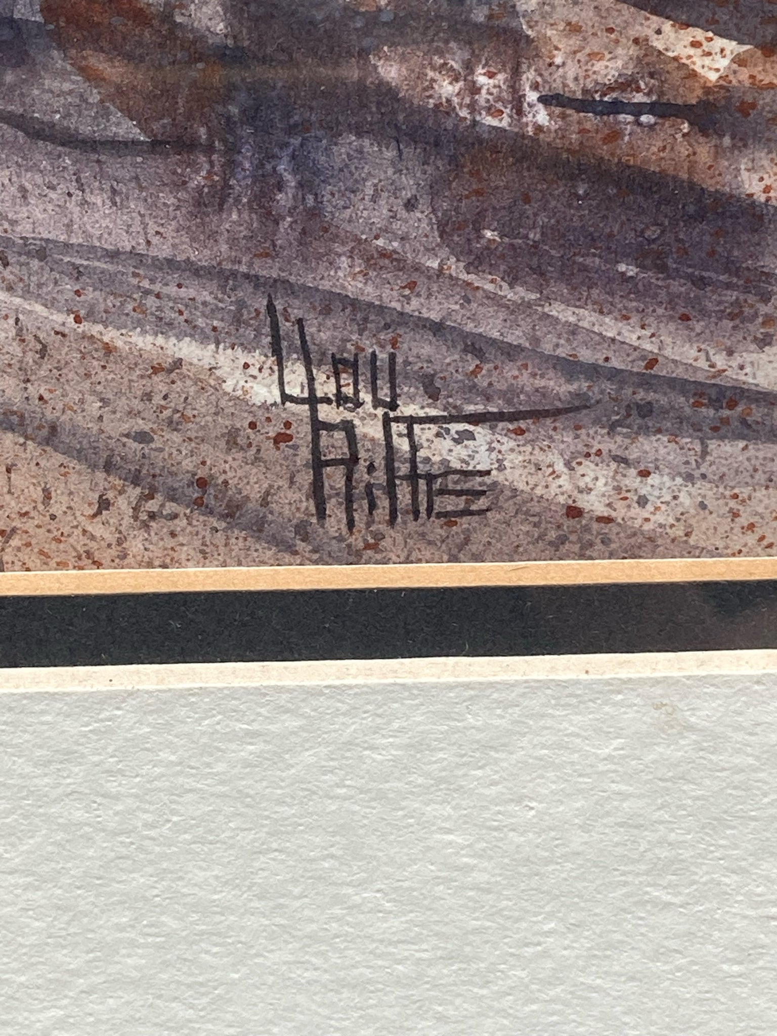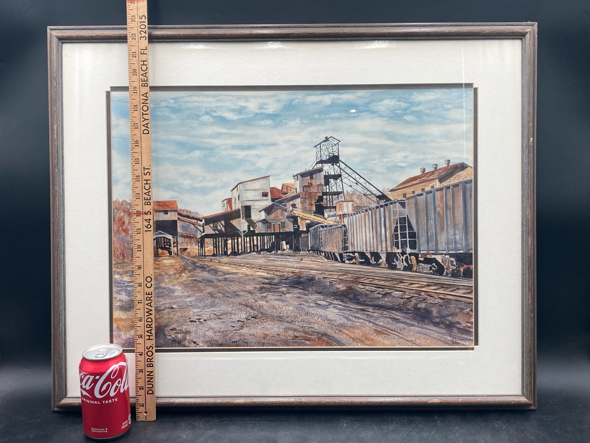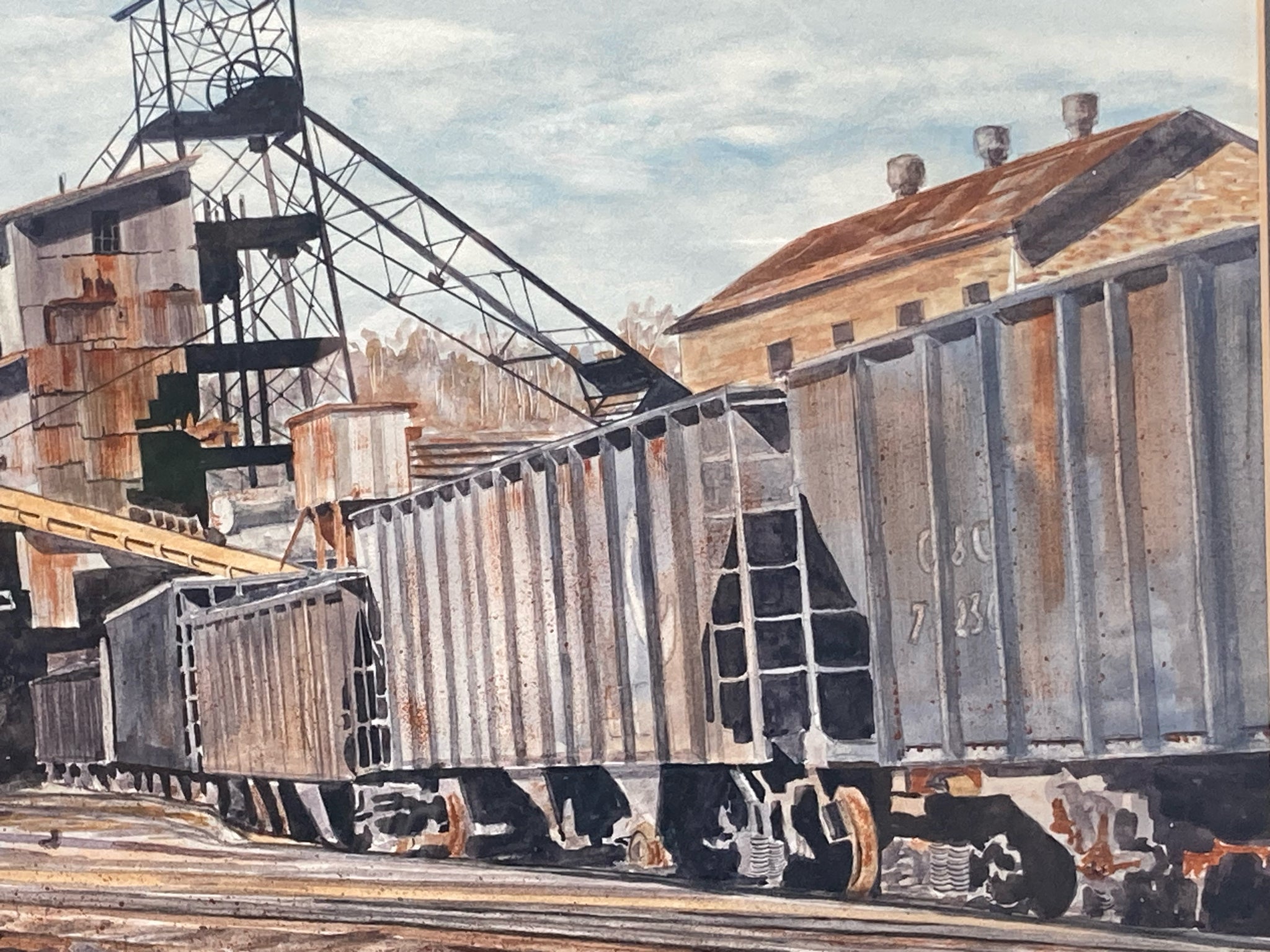 Original signed Lou Riffe painting. Watercolor on paper. Highly detailed rustic railroad scene. Signed by the artist in the lower left corner. Painting measures 15" tall by 21" long, total size with frame is 23" tall by 29" long. Painting is in excellent condition.