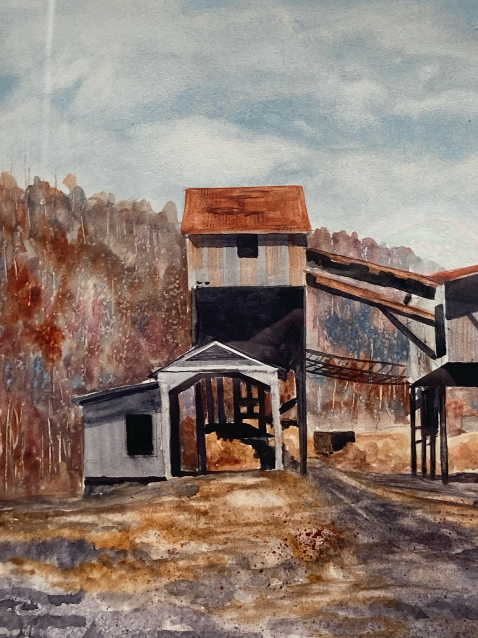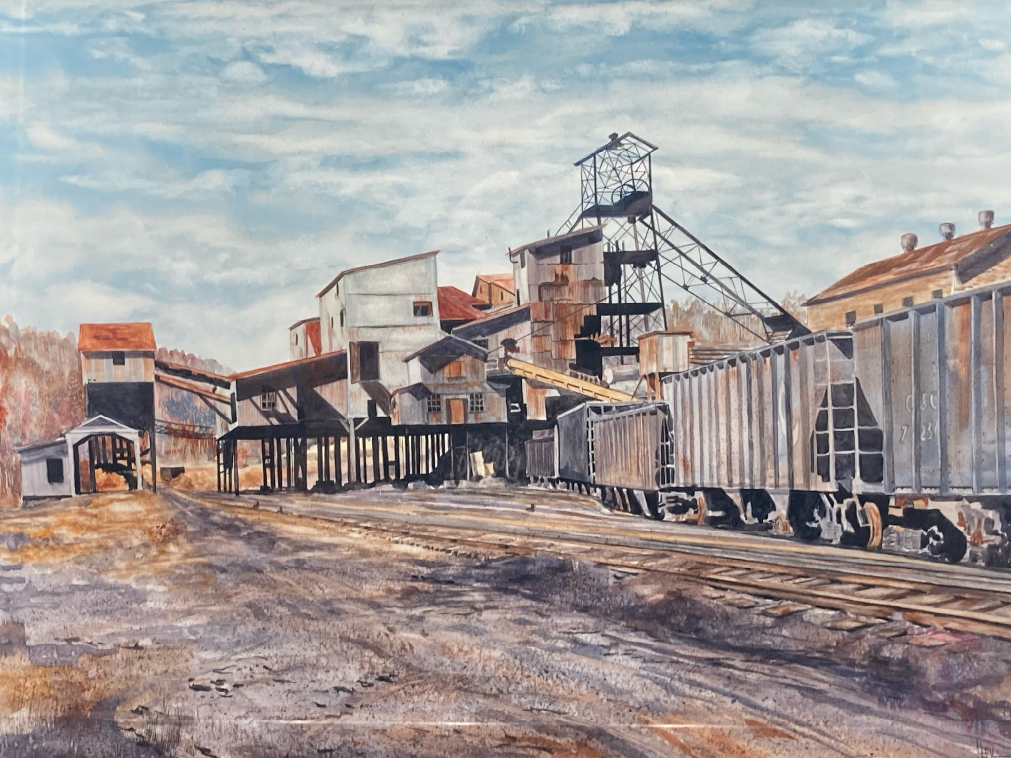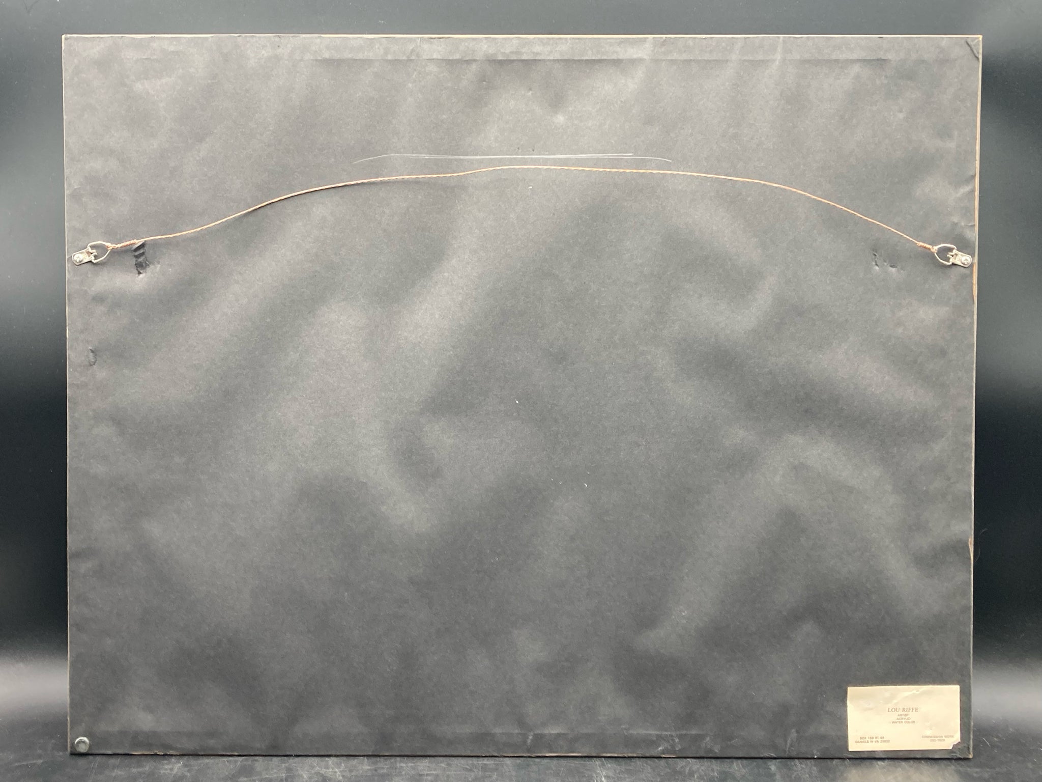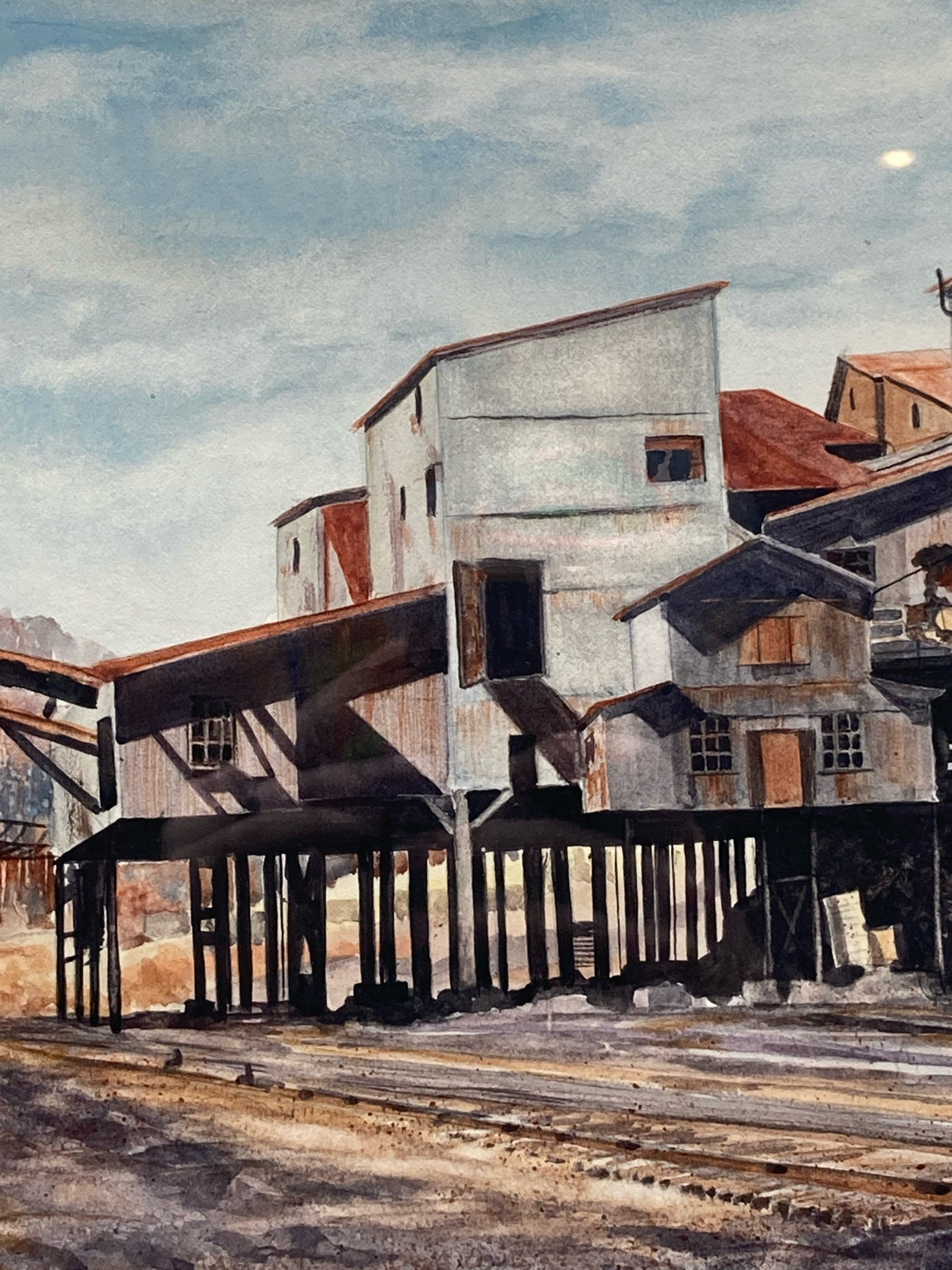 Original signed Lou Riffe painting. Watercolor on paper. Highly detailed rustic railroad scene. Signed by the artist in the lower left corner. Painting measures 15" tall by 21" long, total size with frame is 23" tall by 29" long. Painting is in excellent condition.