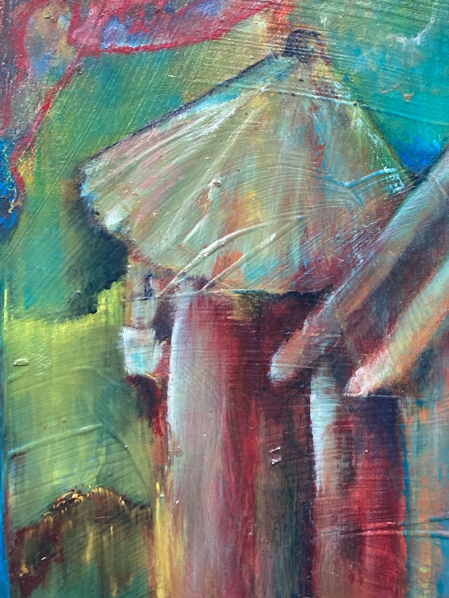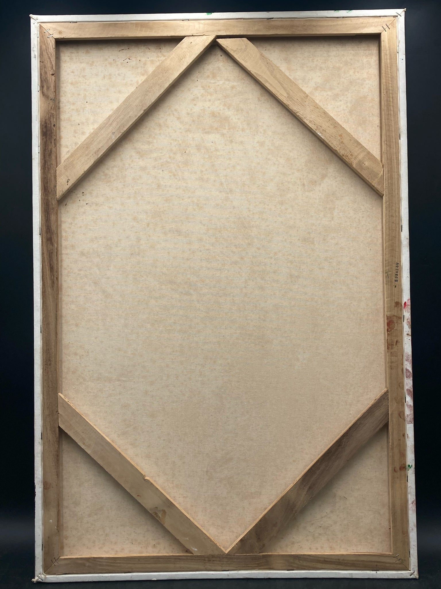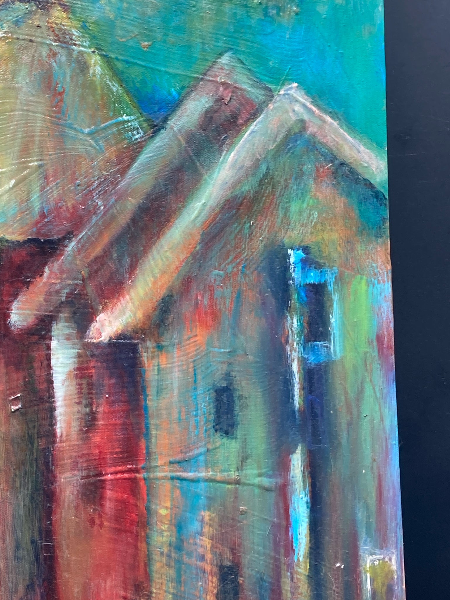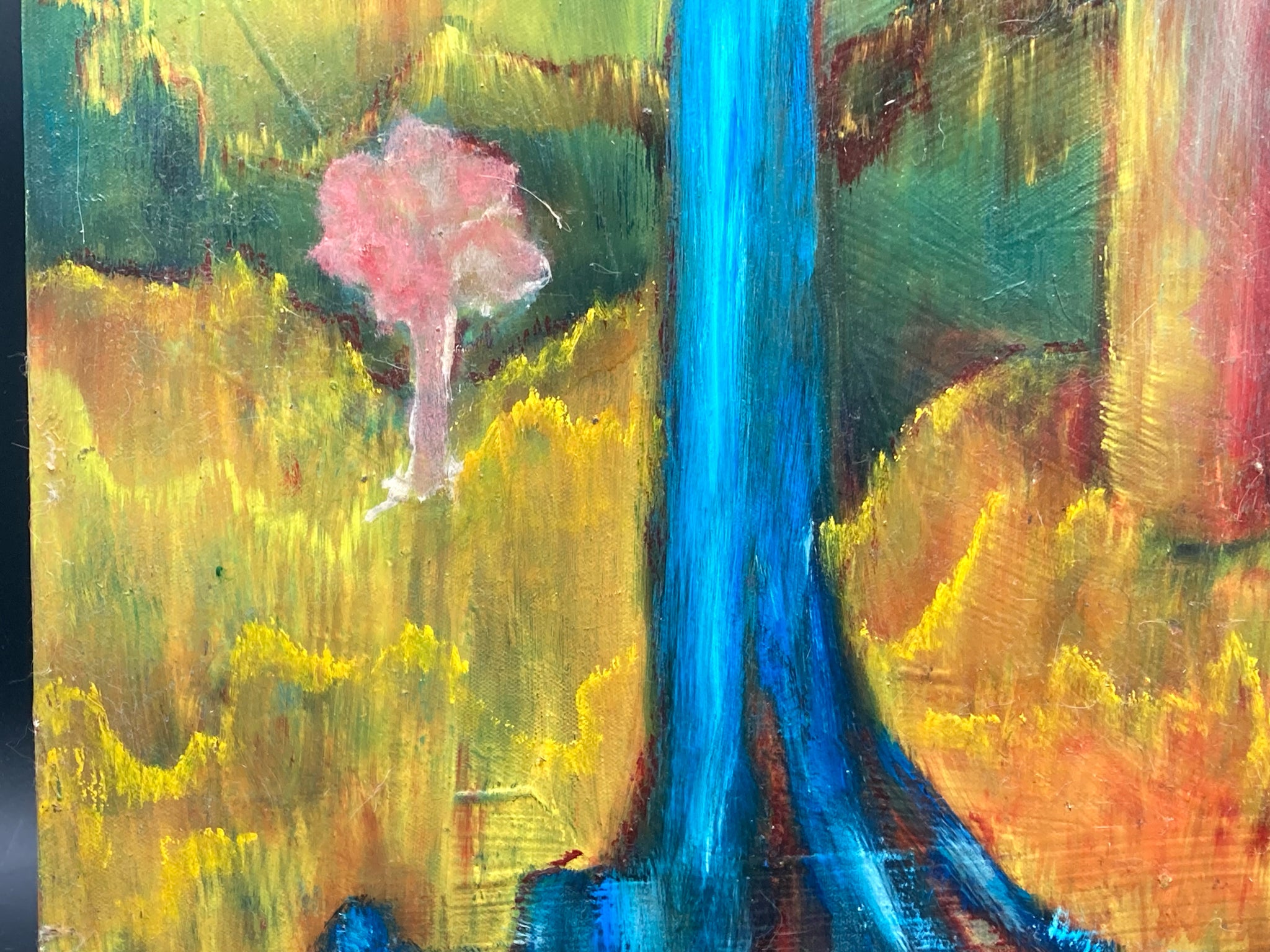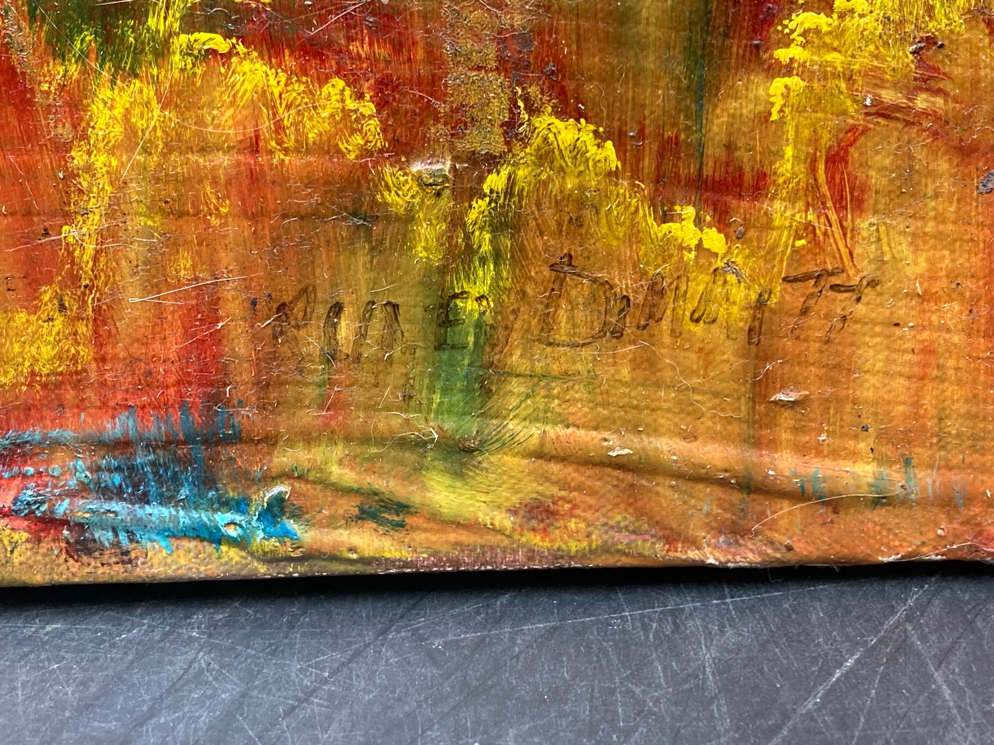 Original Rainey Dimmitt signed landscape painting. Oil on canvas. Expressionist outdoor scene with trees and shed buildings using drip style accents and fall season colors. Signed by the artist in the lower left corner. Painting measures 36" tall by 24" wide. Rainey Dimmitt was a local Ormond Beach, Florida based artist who specialized in people and local nature and landscape paintings.