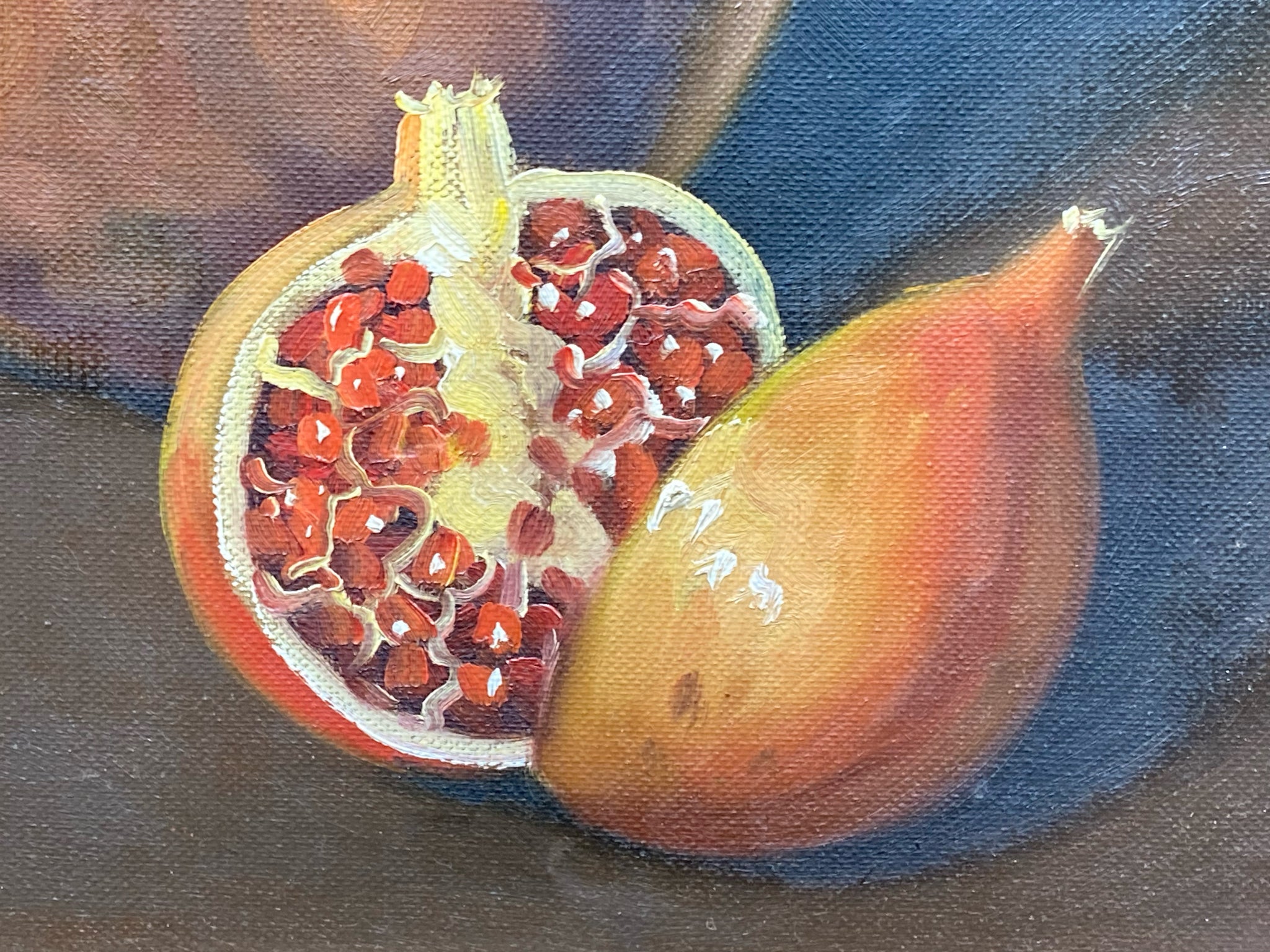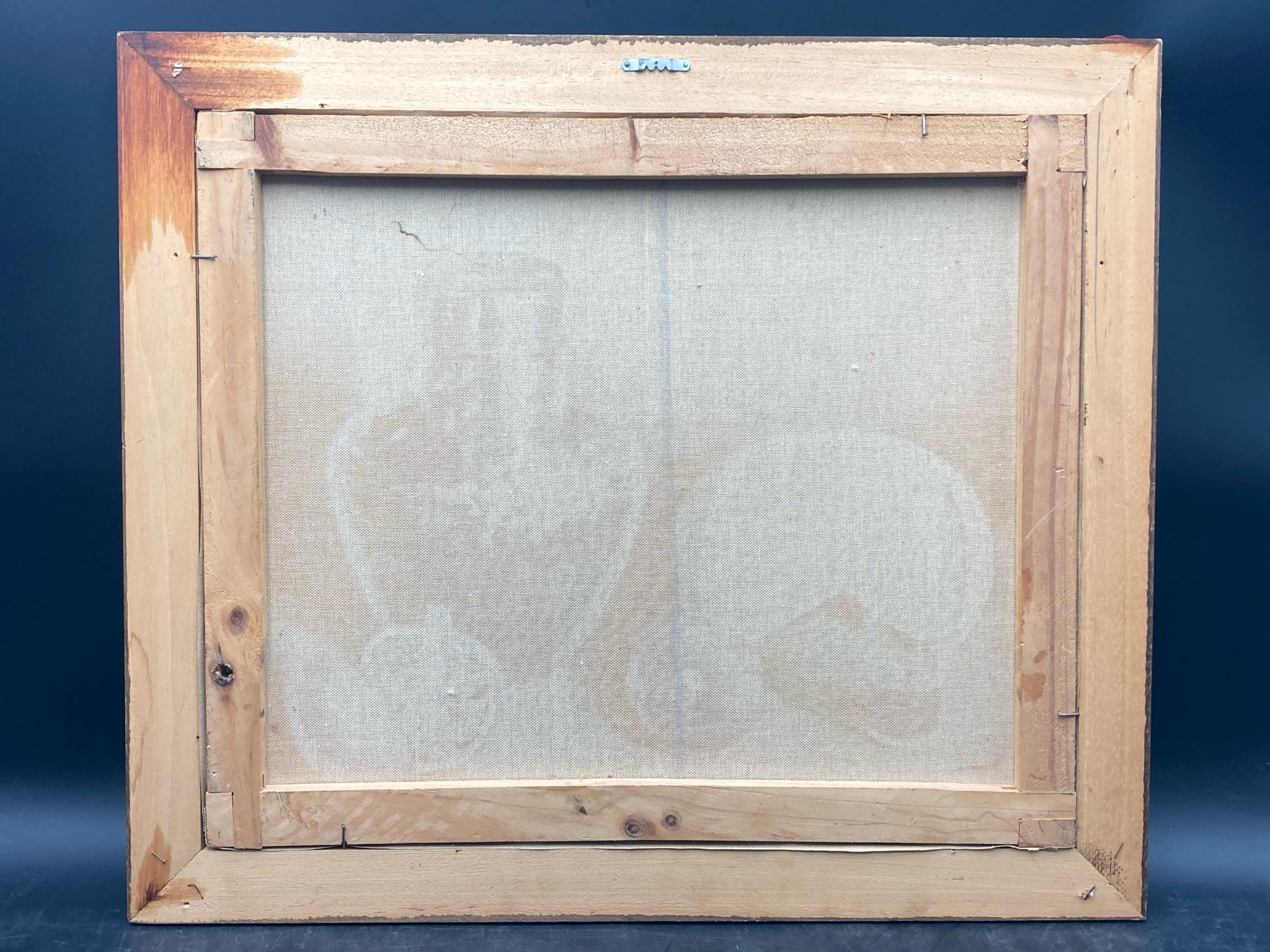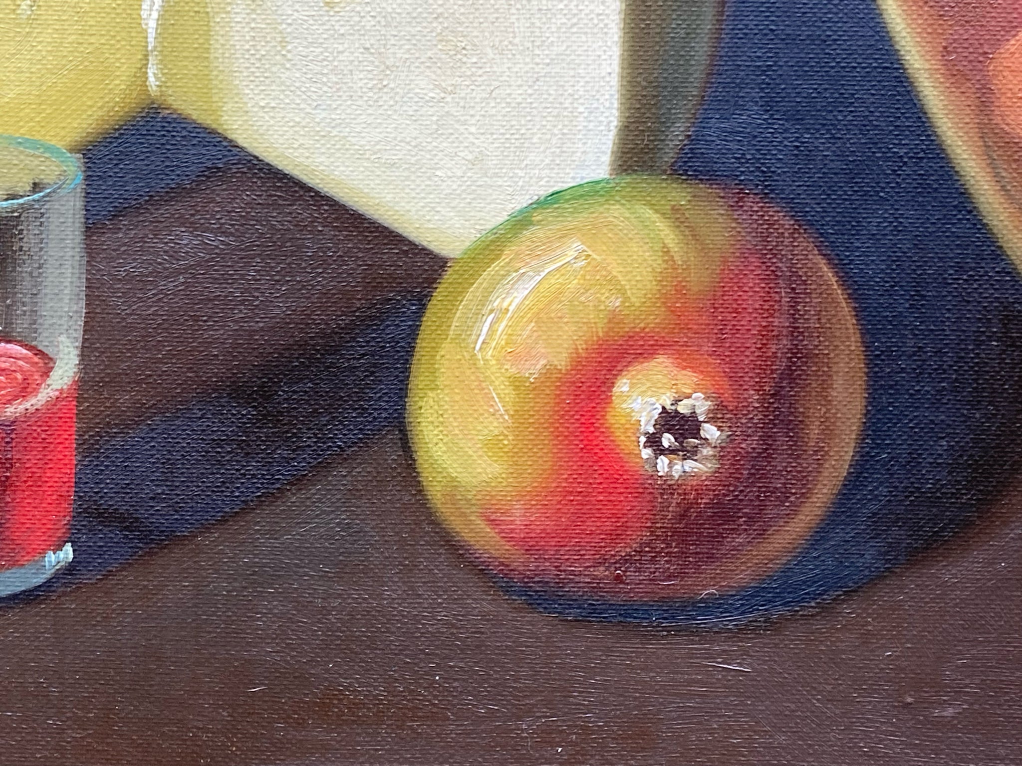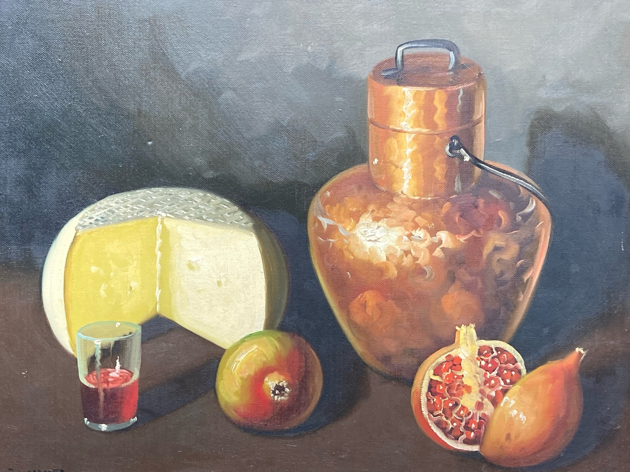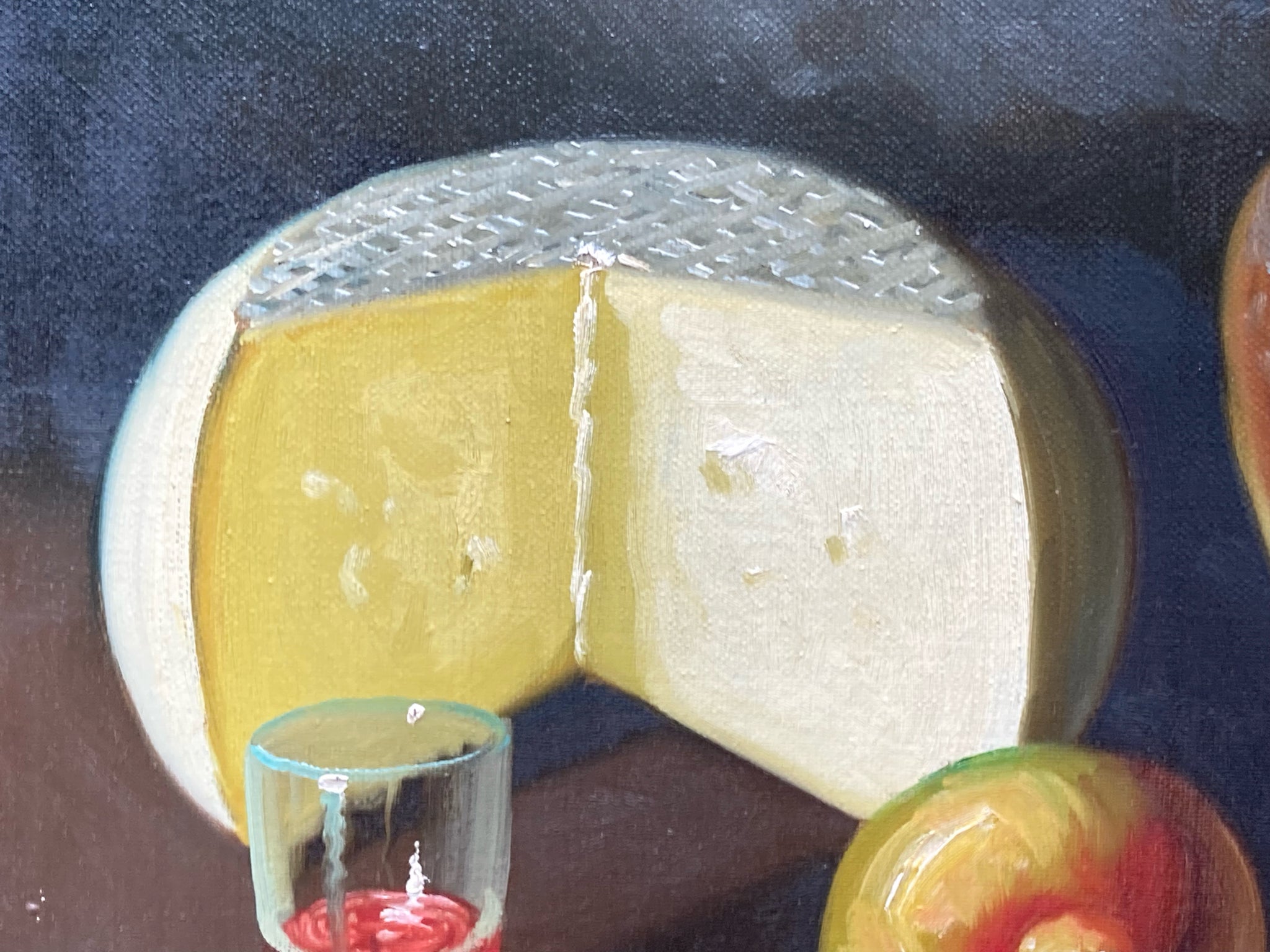 Original Rodriguez signed still life painting. Oil on canvas. Still life featuring a cheese wheel, fruits, drink and a copper vase with a brooding dark color background. Painting is signed by the artist in the lower right corner. Painting measures 17" tall by 21" long, total size with frame is 22" by 26". Painting is in excellent condition.