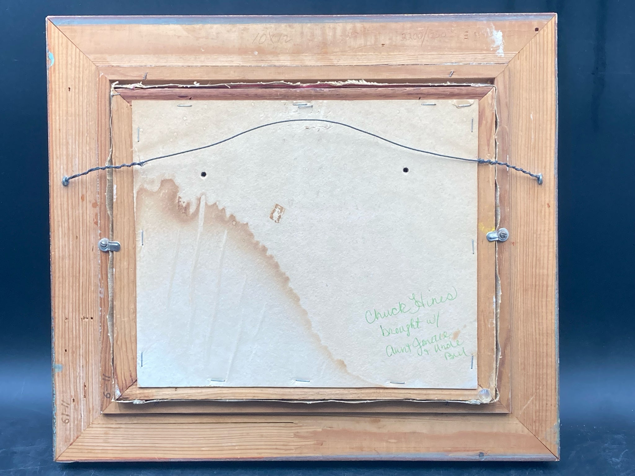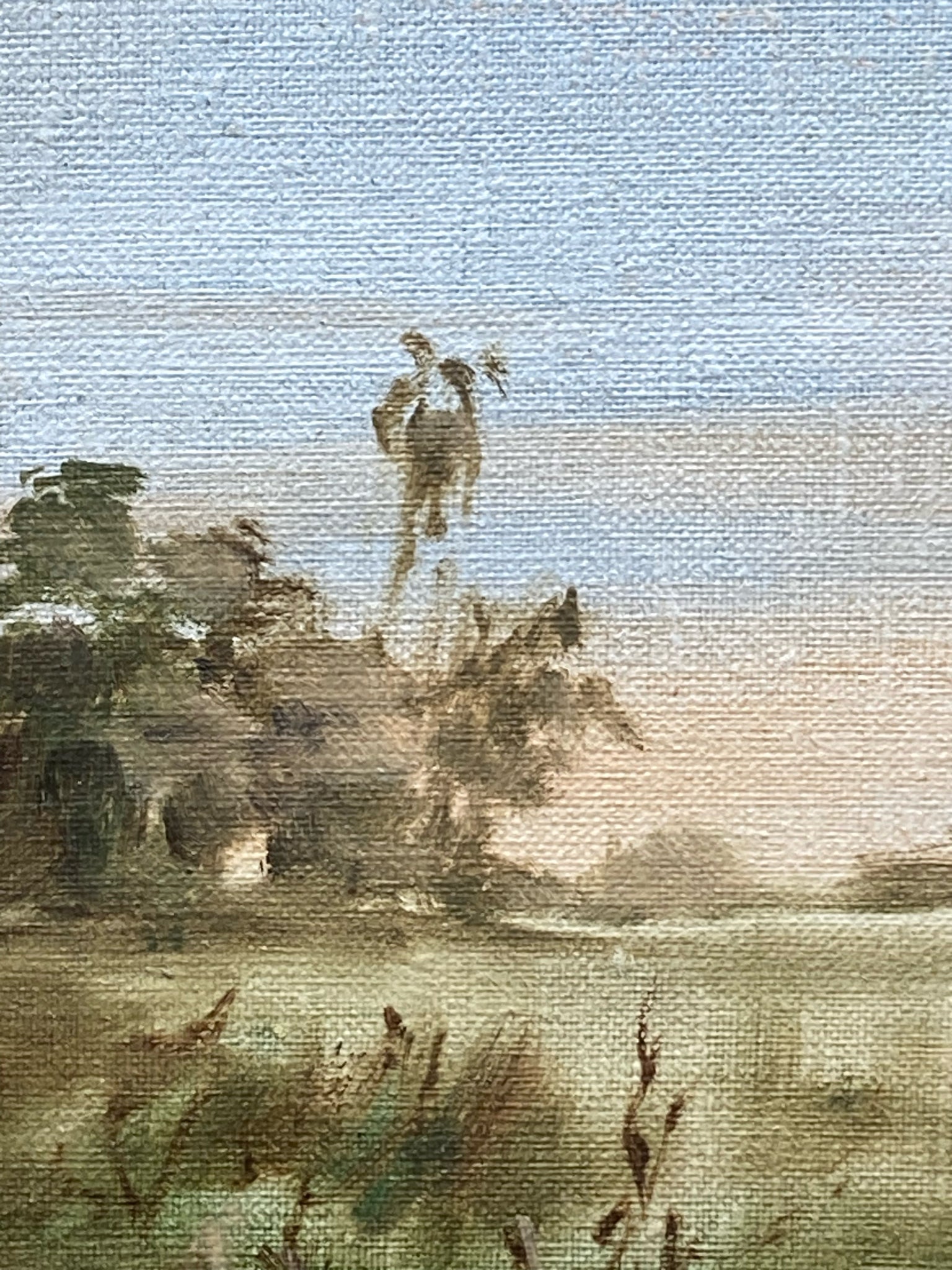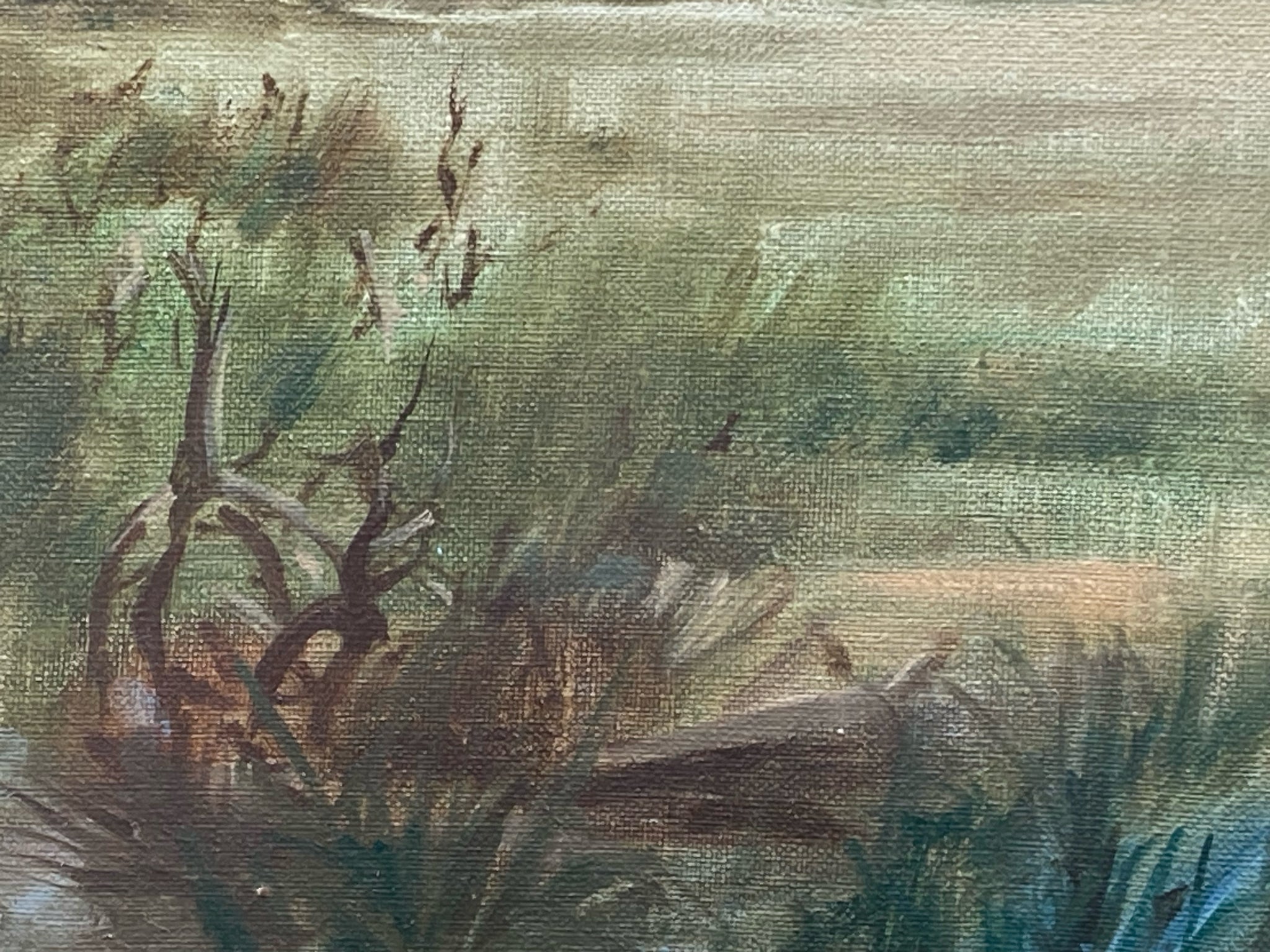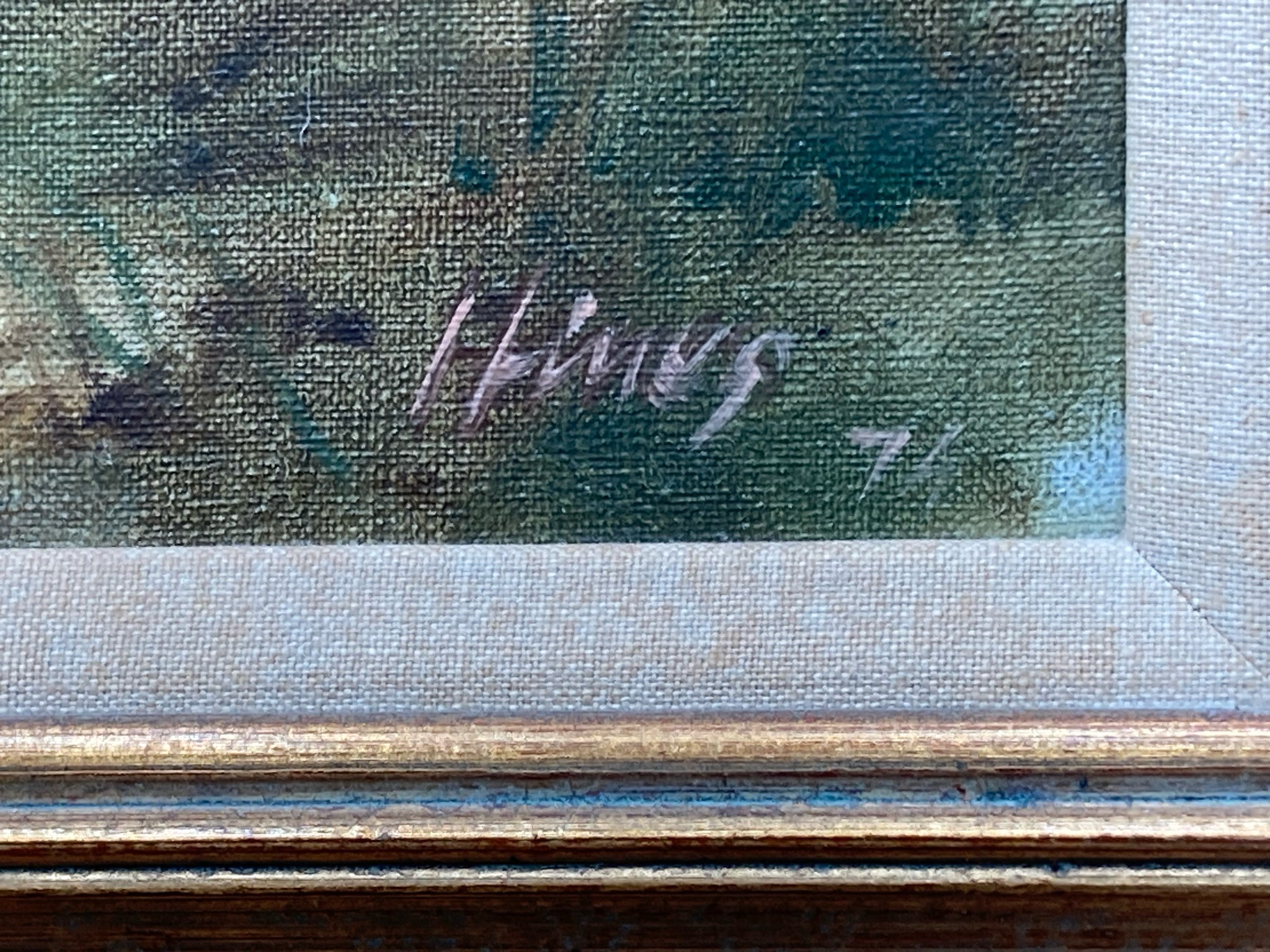 Original Charles Hines landscape painting. Oil on canvas. Marshy grassland landscape with palm trees reminiscent of Florida wetlands. Painting is signed and date by artist on bottom left corner, and has personalized inscription from family on back. Dated to 1871, which represents one of his last works before his death. Painting measures 10" by 12", total size with frame is 14" by 16". Some light wear to frame, painting itself is in excellent condition.