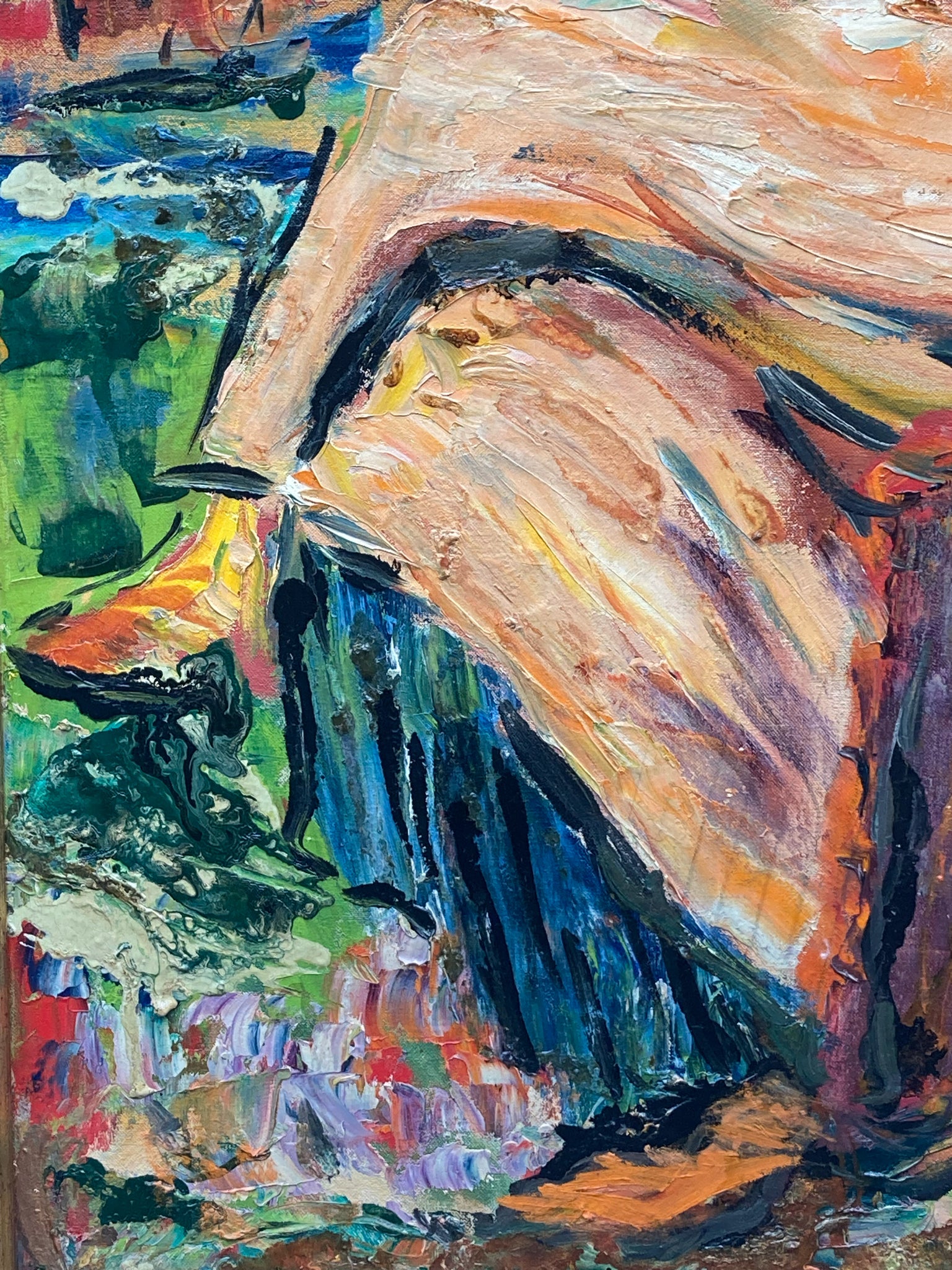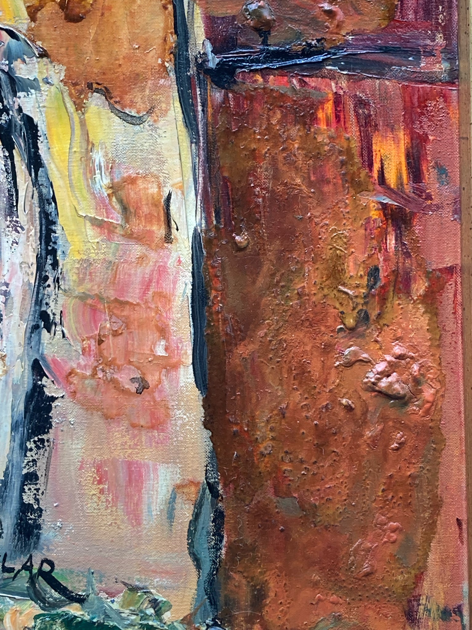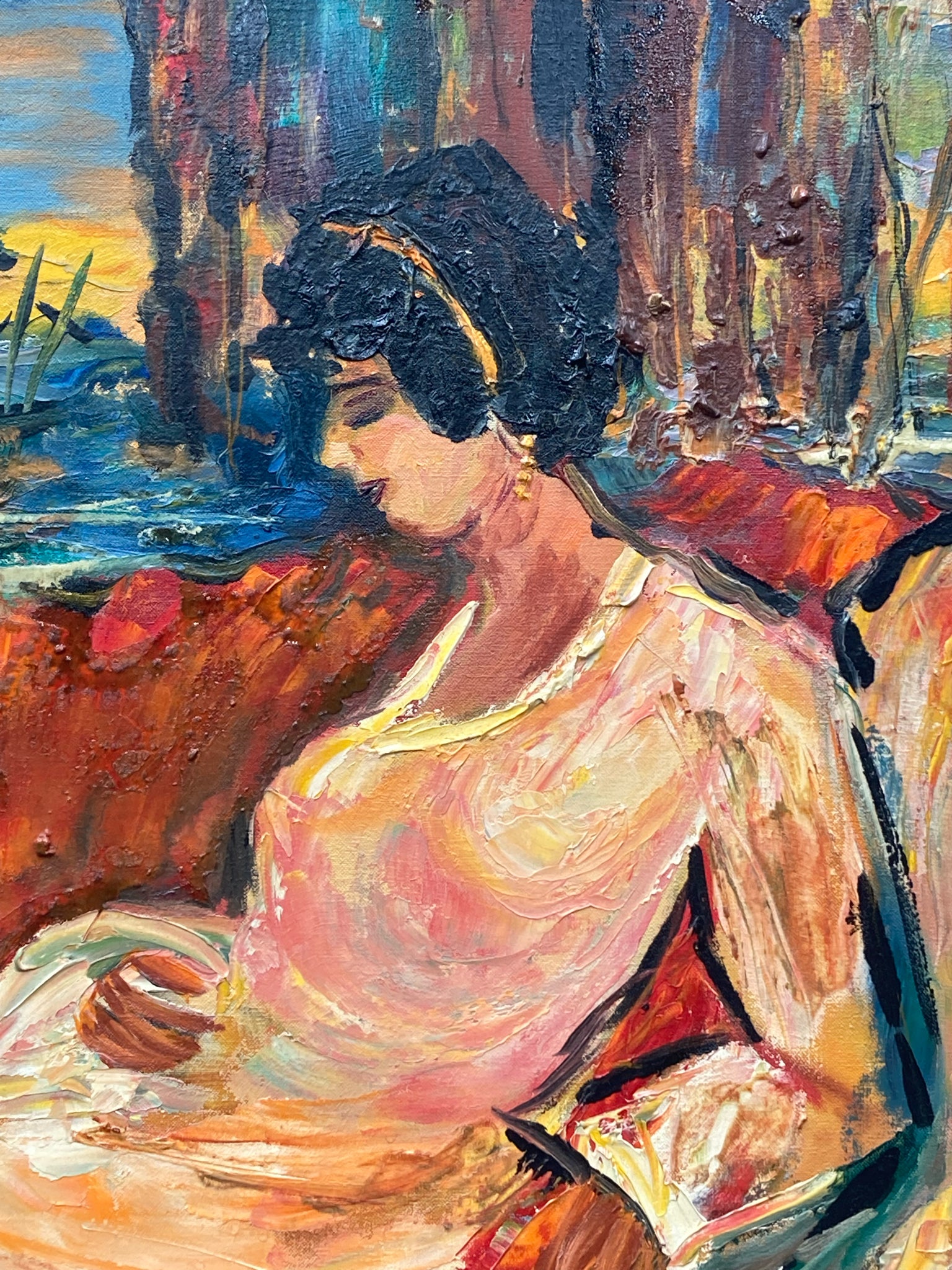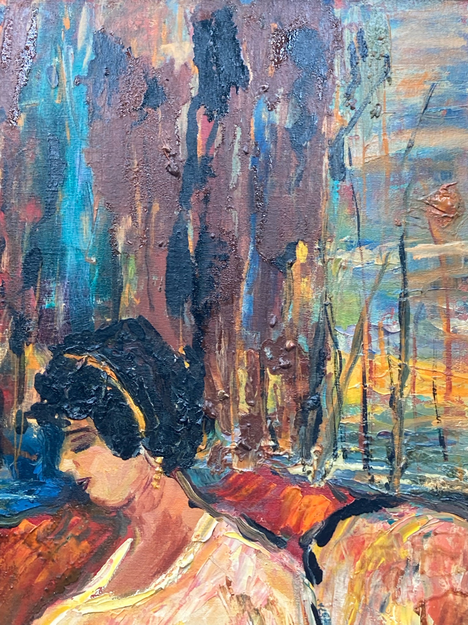 Original Tea Weintraub Sternklar signed painting. Oil on canvas. Vivid expressionist depiction of a woman sitting in front of a river at sunset. Painting is signed by Sternklar at the bottom middle. Total size with frame is 21" by 31", visible painting is 20" by 30". Painting is in excellent condition. Sternklar is a well listed and noteable artist of Polish decent who lived in Italy, Israel and New York City.