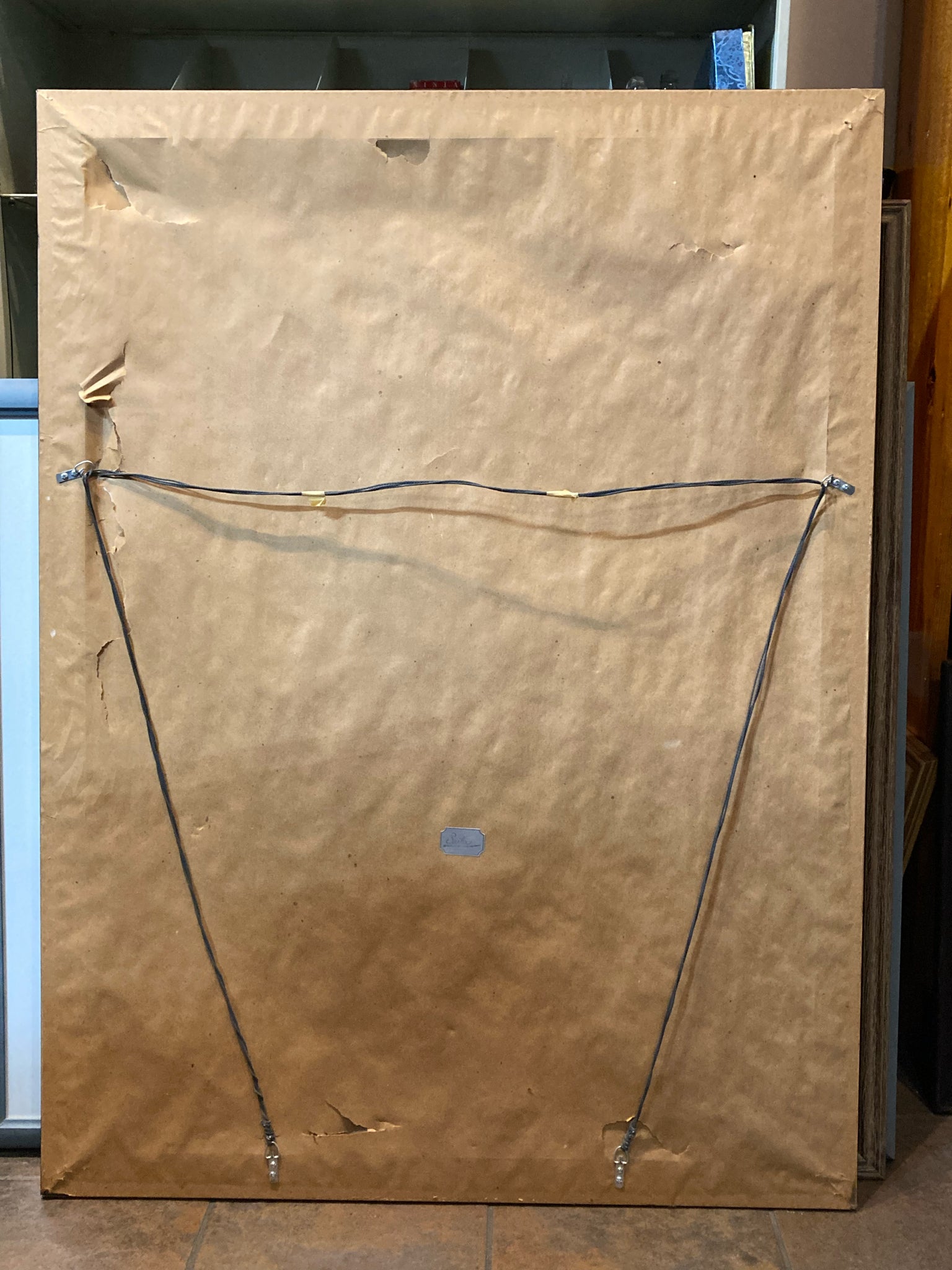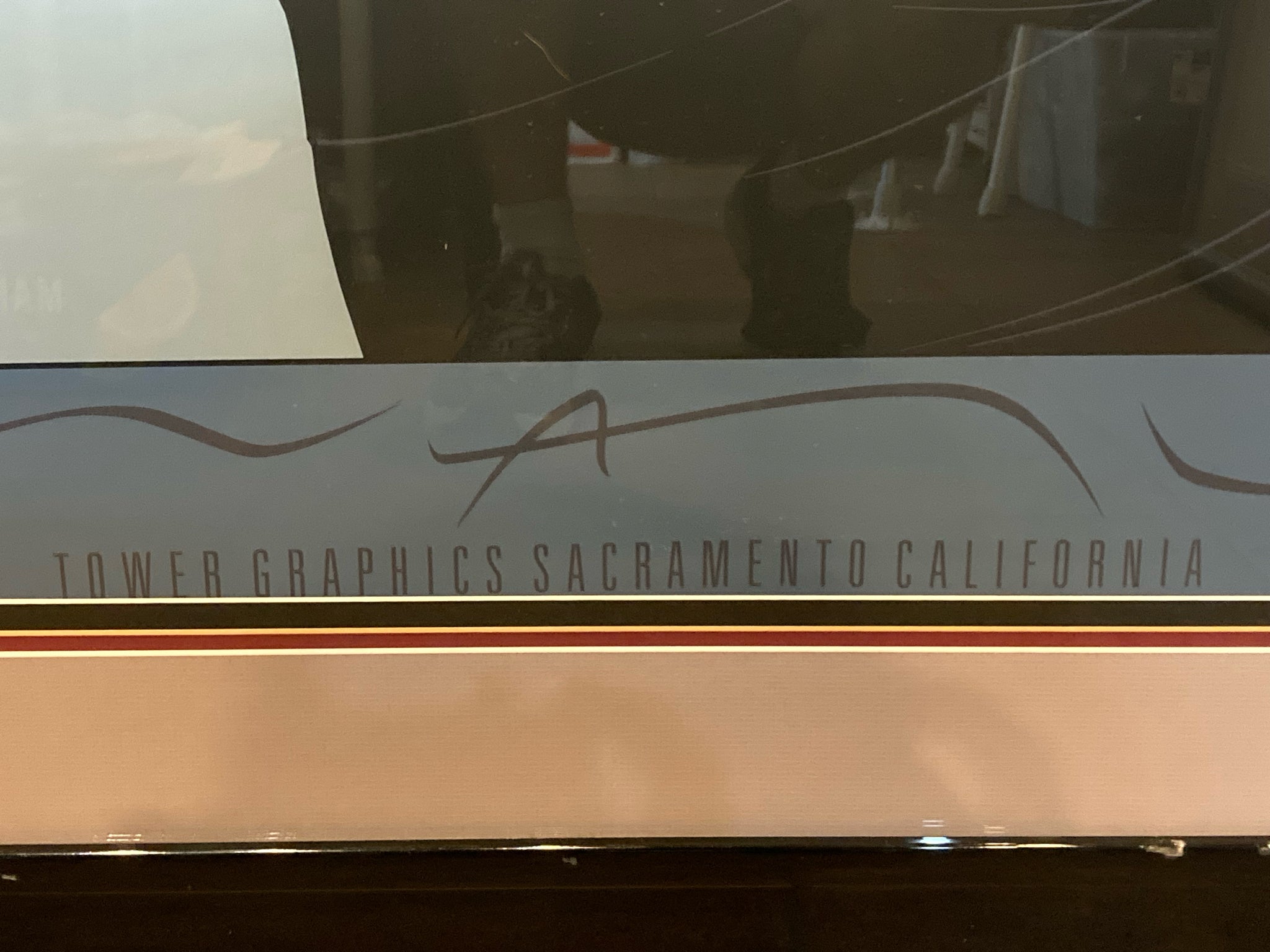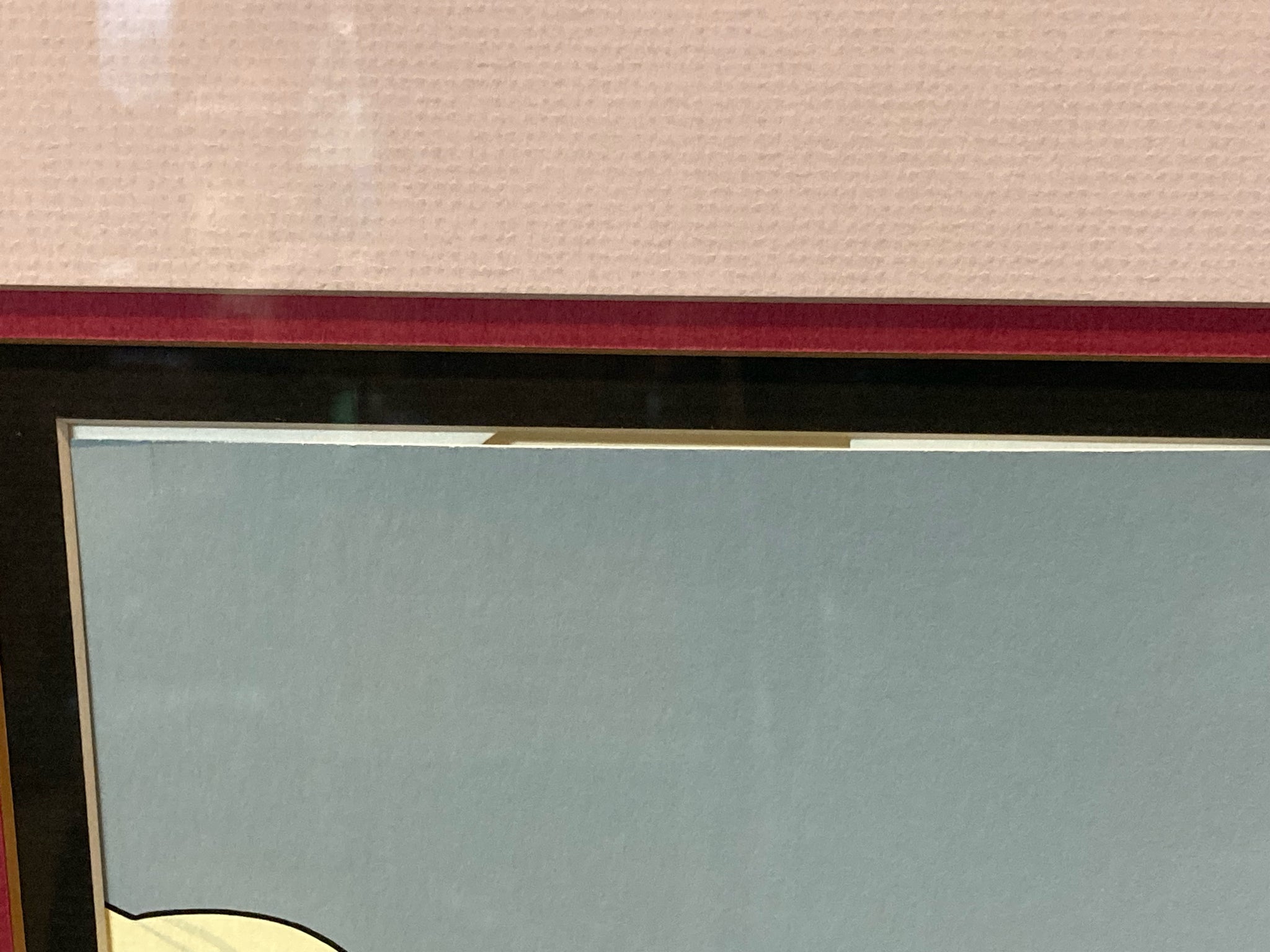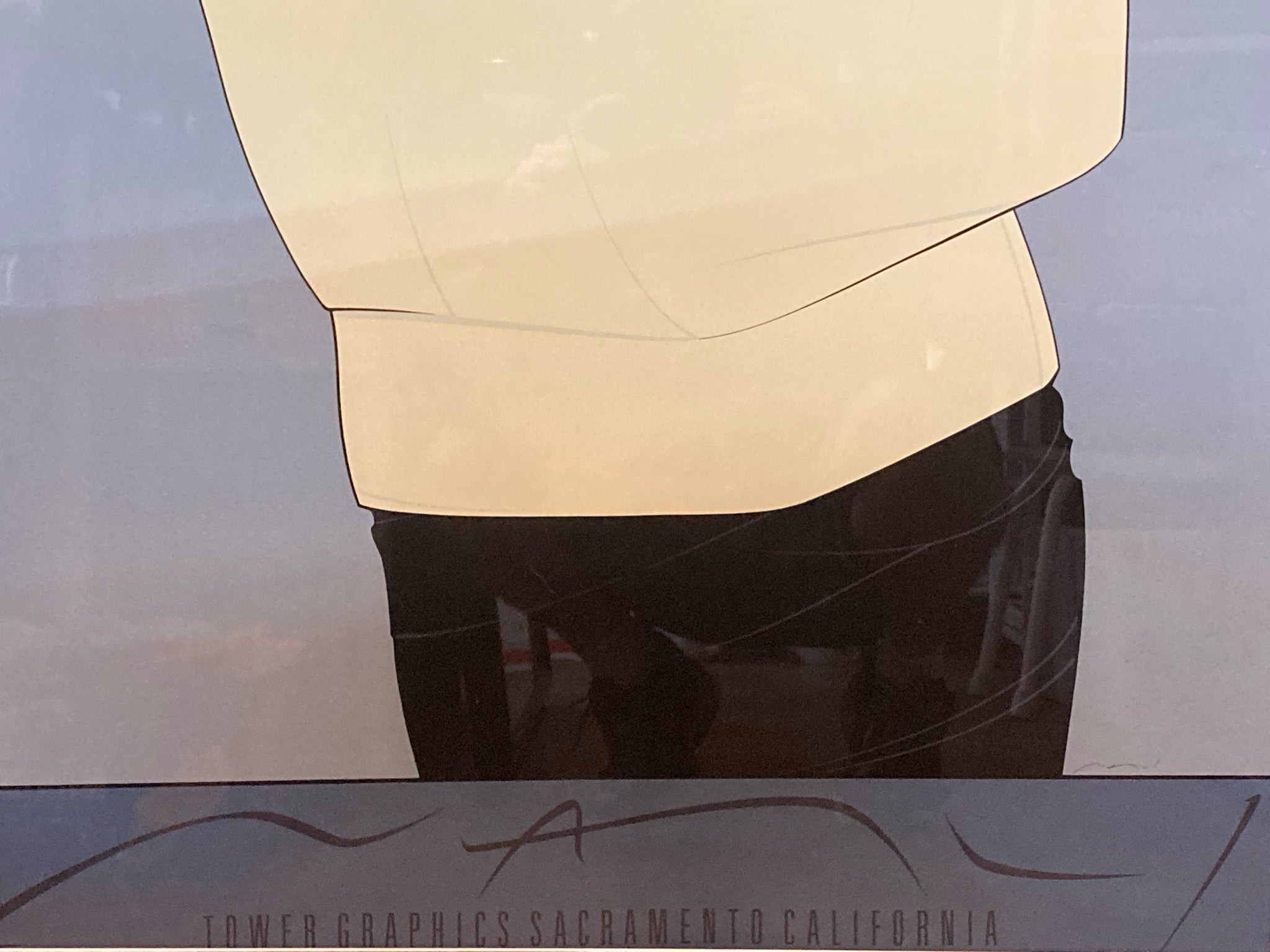 Patrick Nagel commemorative number 8 "Yellow sweater" serigraph, framed and matted. Limited run 1987 printing based on Nagel's original painting, printed by Tower Graphics of Sacramento, California. Print is framed and matted with complimenting colors. Print measures 24" wide by 36" tall, total size with frame is 36" wide by 48" tall. Print is slightly out of matting at upper left corner, this is noted in photos, otherwise print is in good condition. Frame has some dings and scuffs.