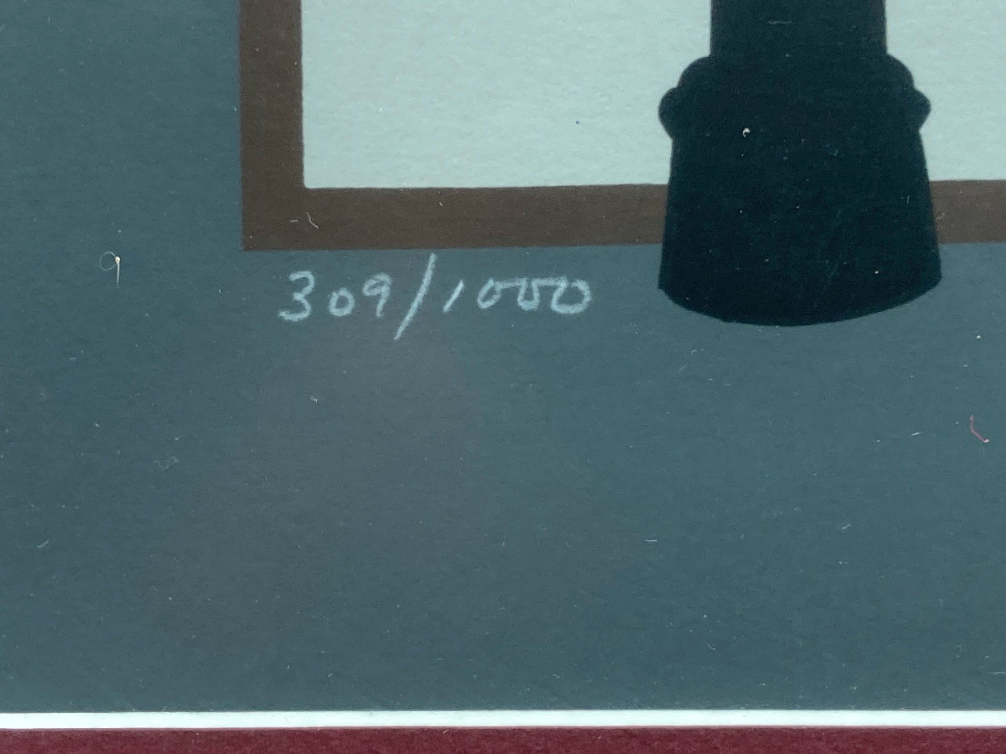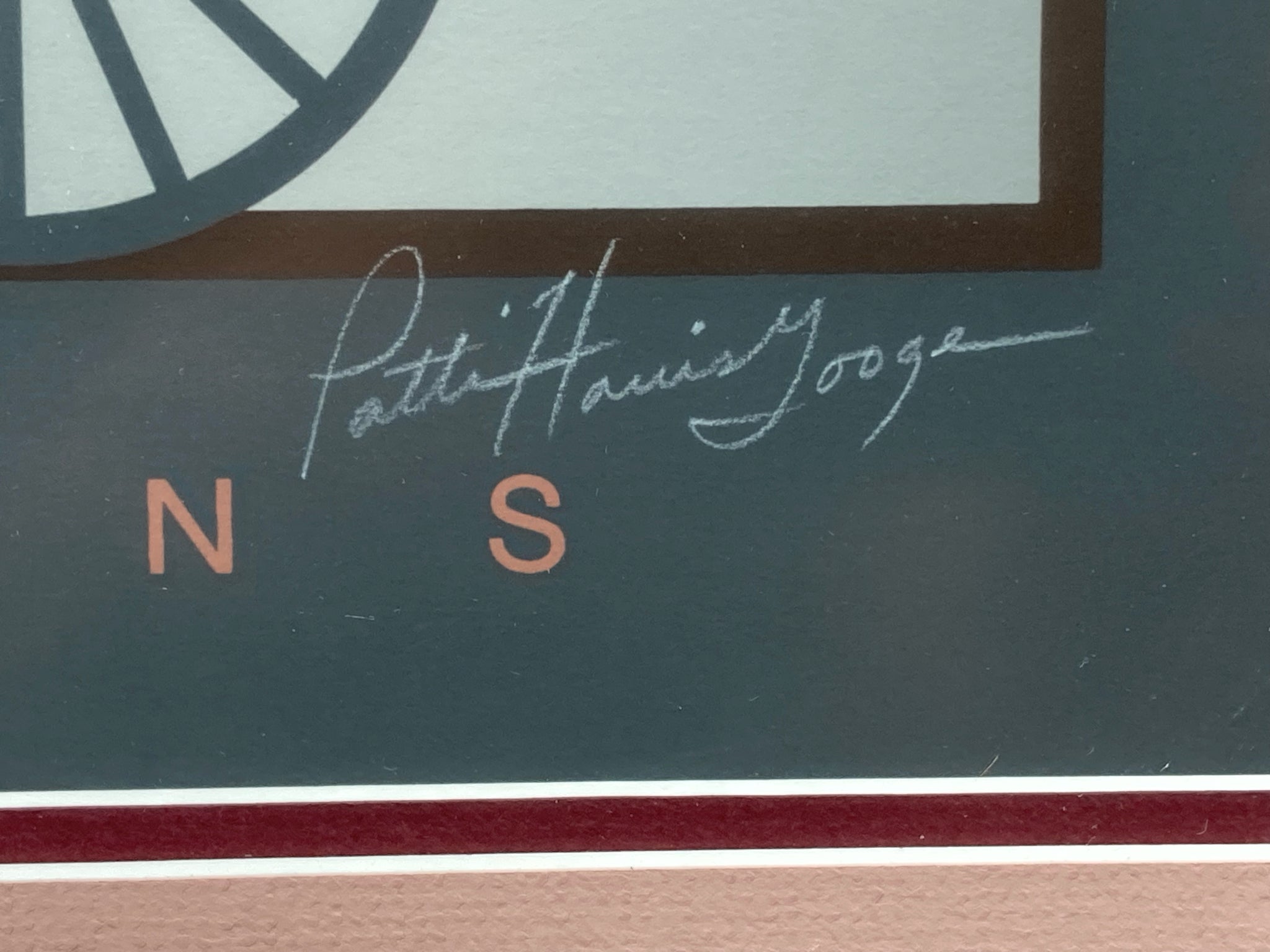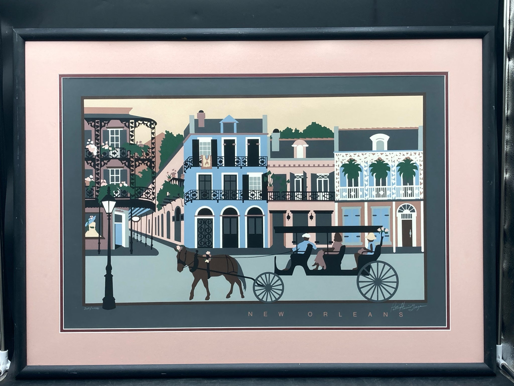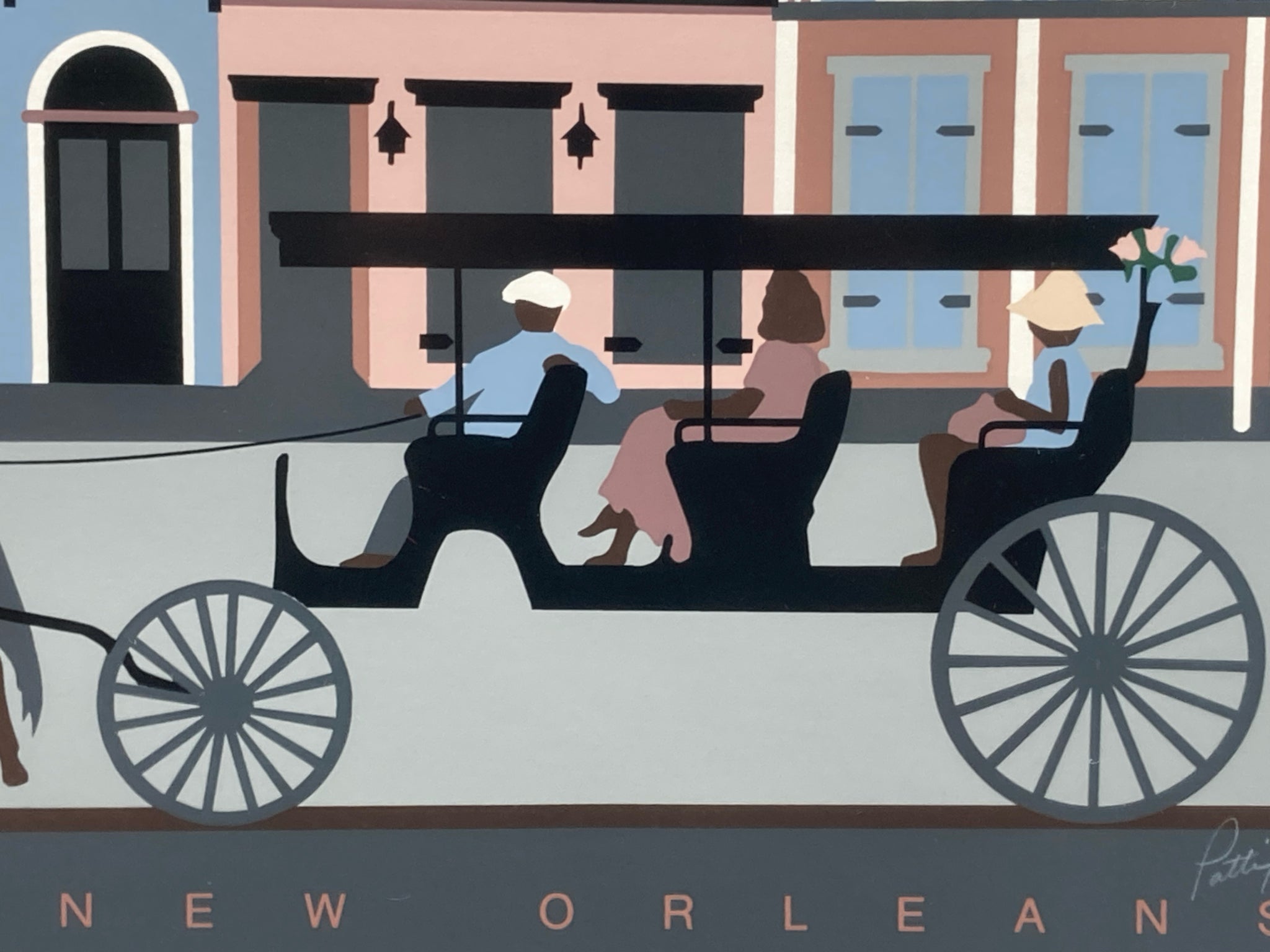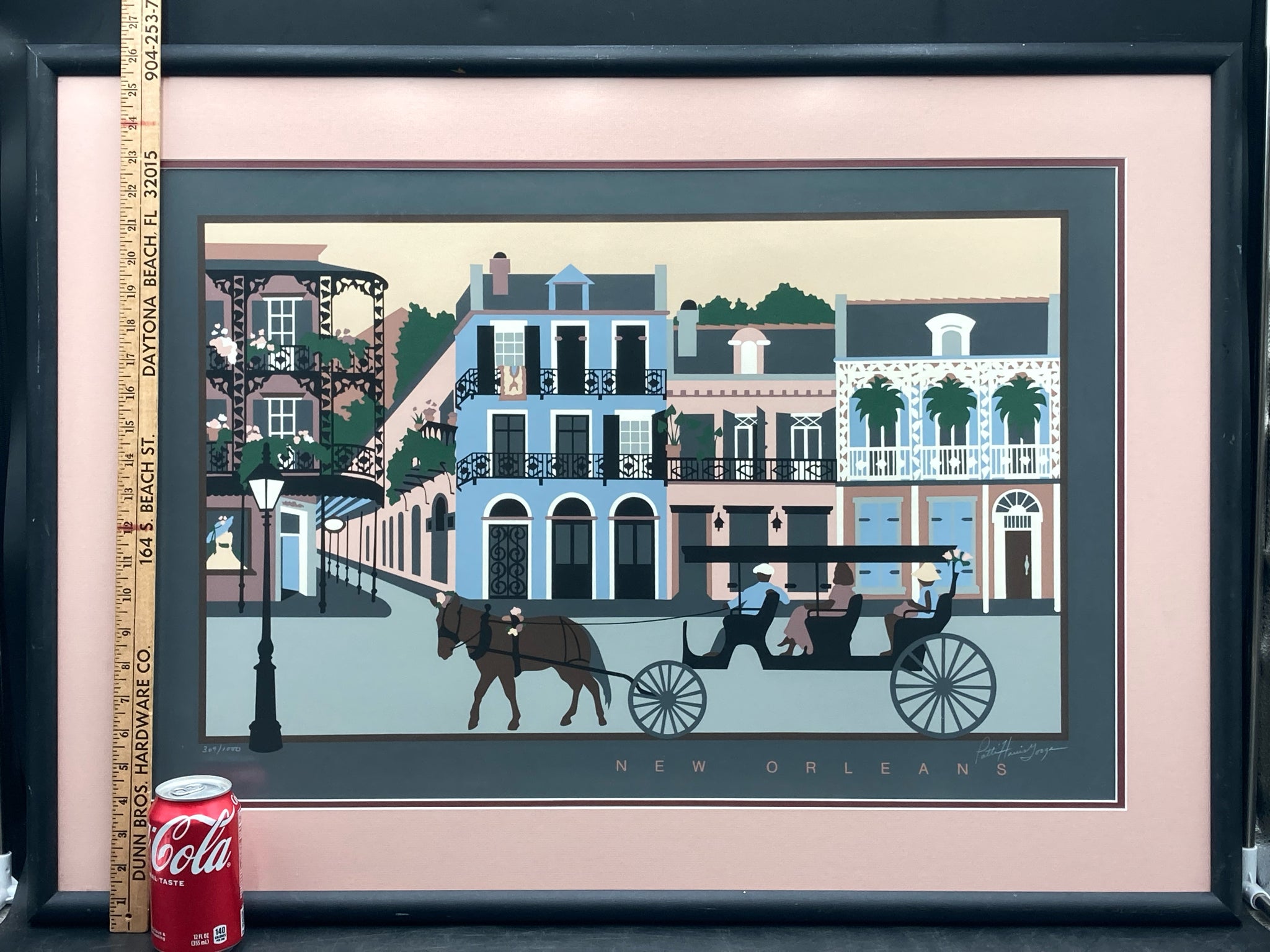 Patti Harris Googe signed and numbered limited edition New Orleans serigraph print, framed and matted. Colorful serigraph print of the French Quarter with a horse drawn carriage in the foreground. Signed and numbered by the artist Patti Harris Googe at bottom. number 305 of 1000. Print measures 20" tall by 30" long, total size with frame is 26" tall by 36" long. Some light wear and marks on frame, print is in excellent condition.