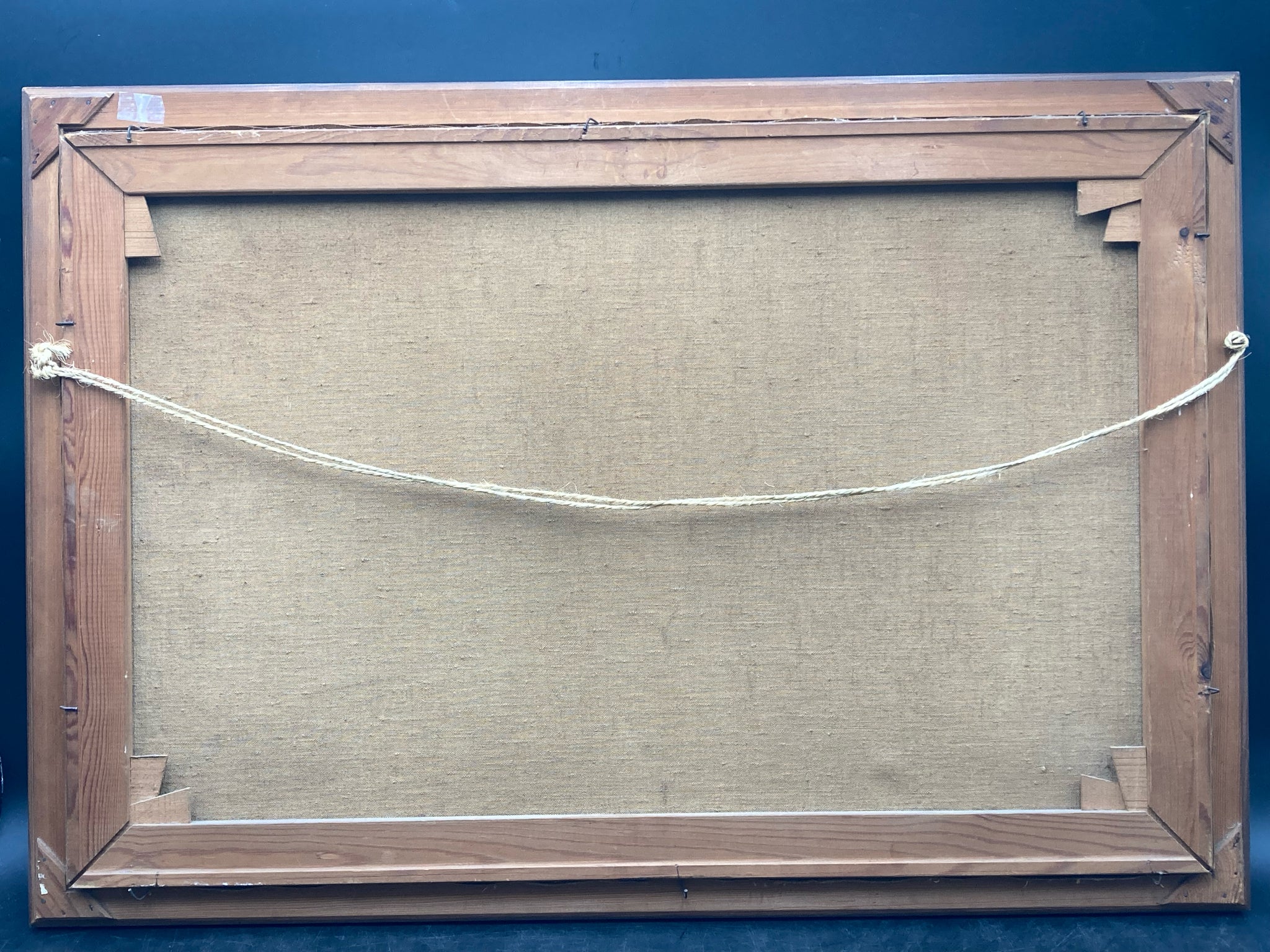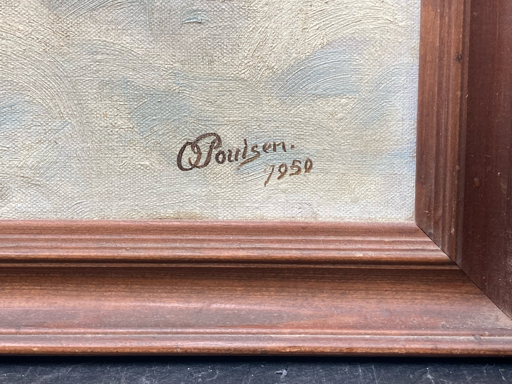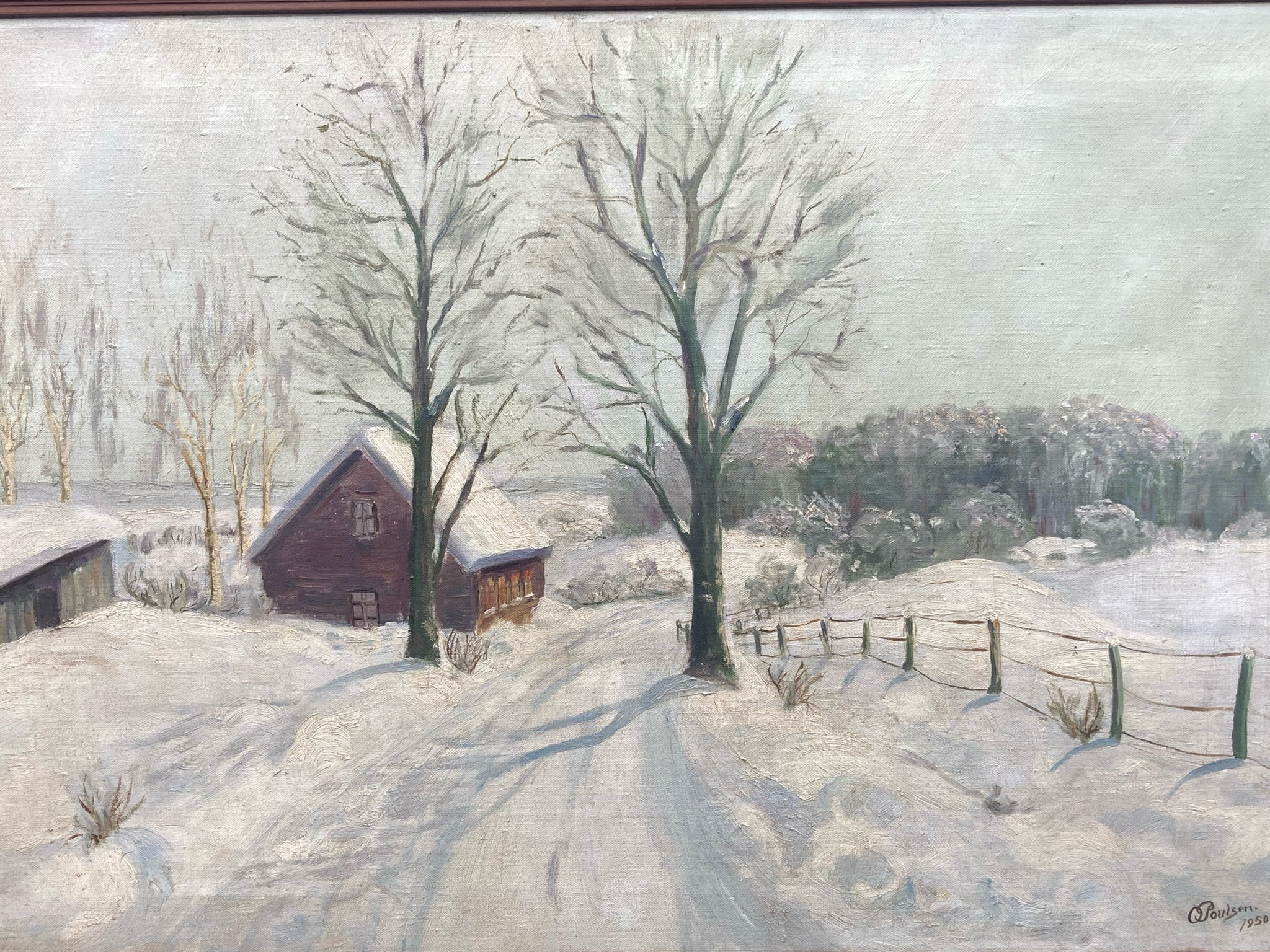 Vintagae Poulsen signed and dated winter landscape painting. Oil on canvas. Snowy winter scene with cabin and shed in the foreground and forestry in the background. Signed and dated by the artist in the lower left corner, dated 1950. Total measurement with frame is 22" by 32". Painting has some general grime ans some small areas of cracking toward top, overall it is in good condition.