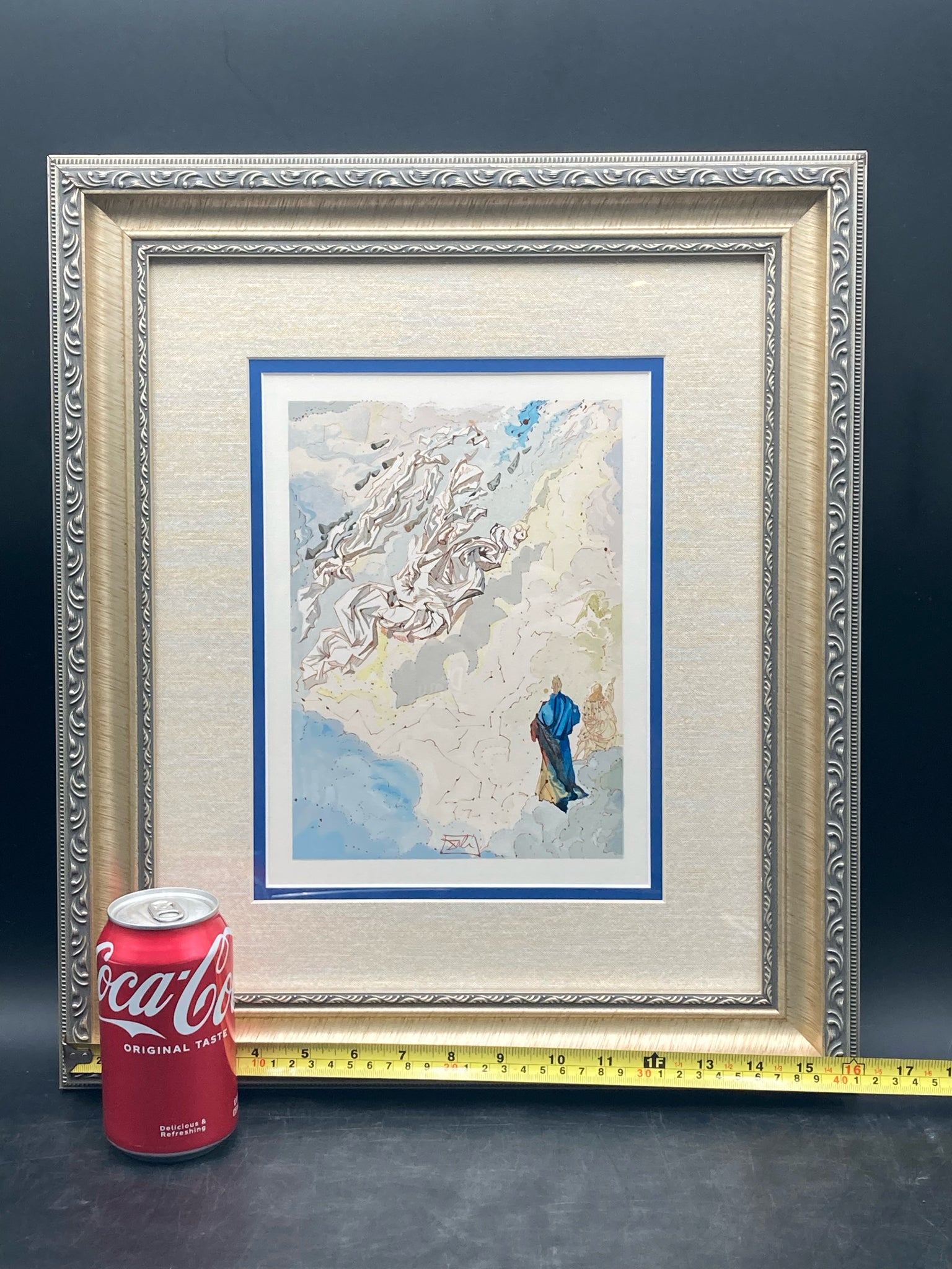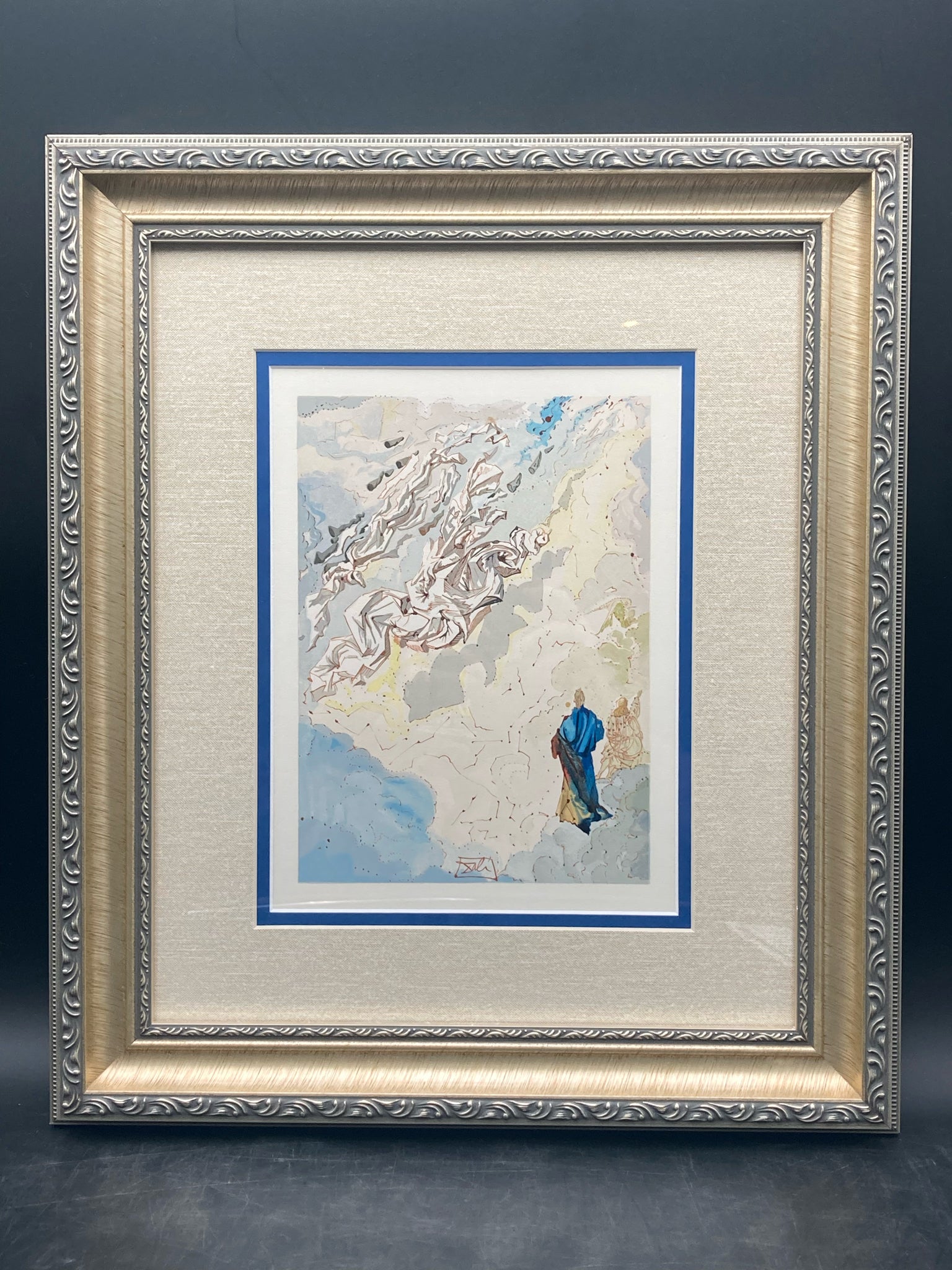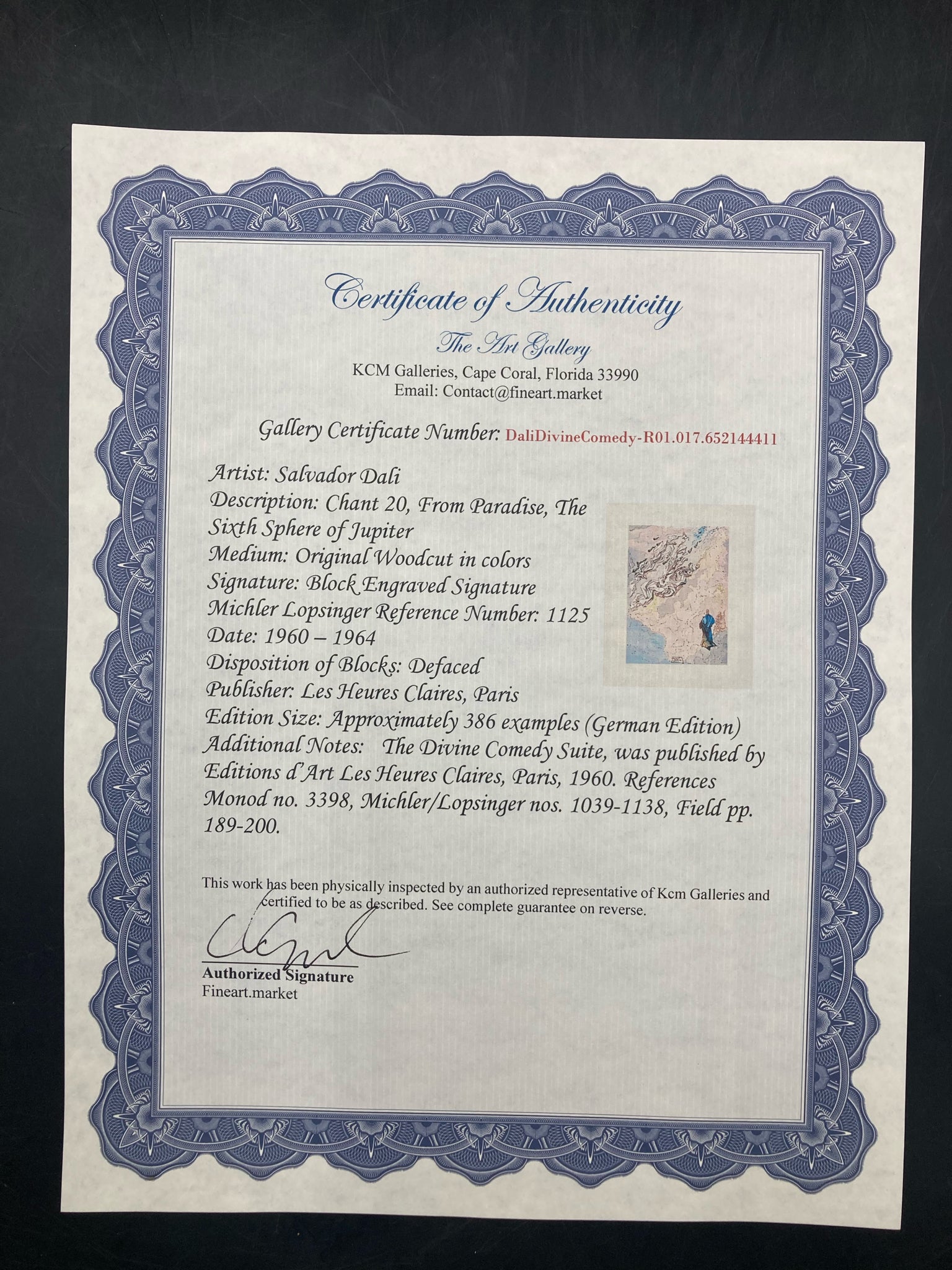 Framed limited edition Salvador Dali divine comedy canto 20 paradiso sixth sphere of Jupiter woodcut with certificate of authenticity. Woodcut with colors. Depicts the scene of Dante ascending to the Spheres of Saturn where Dante sees visions. Artwork measures 7" wide by 9" tall, total size with frame is 17" wide by 20" tall. Certificate of authenticity is issued by KCM Art Galleries and provides further information on the piece. Artwork is in excellent condition.