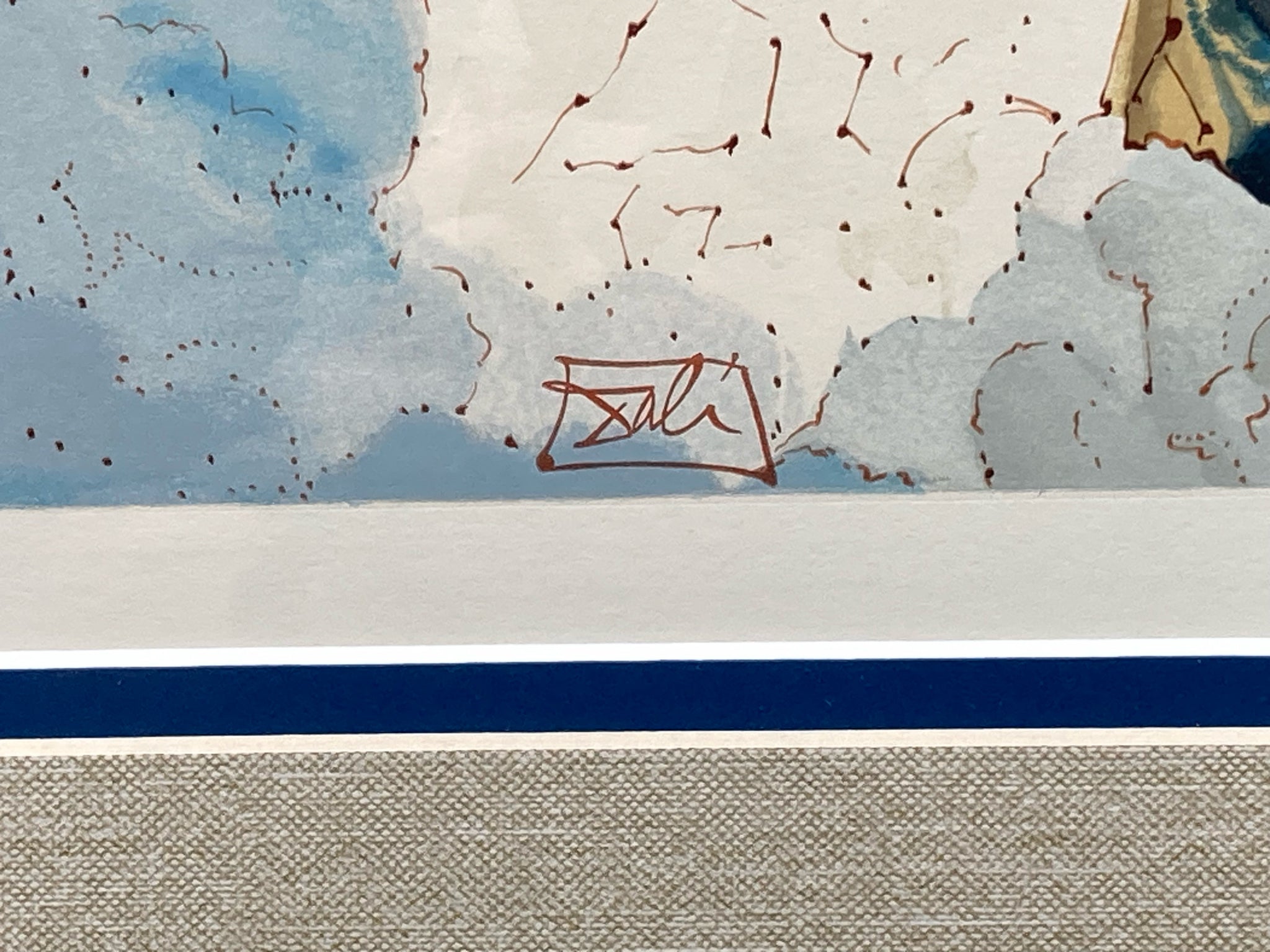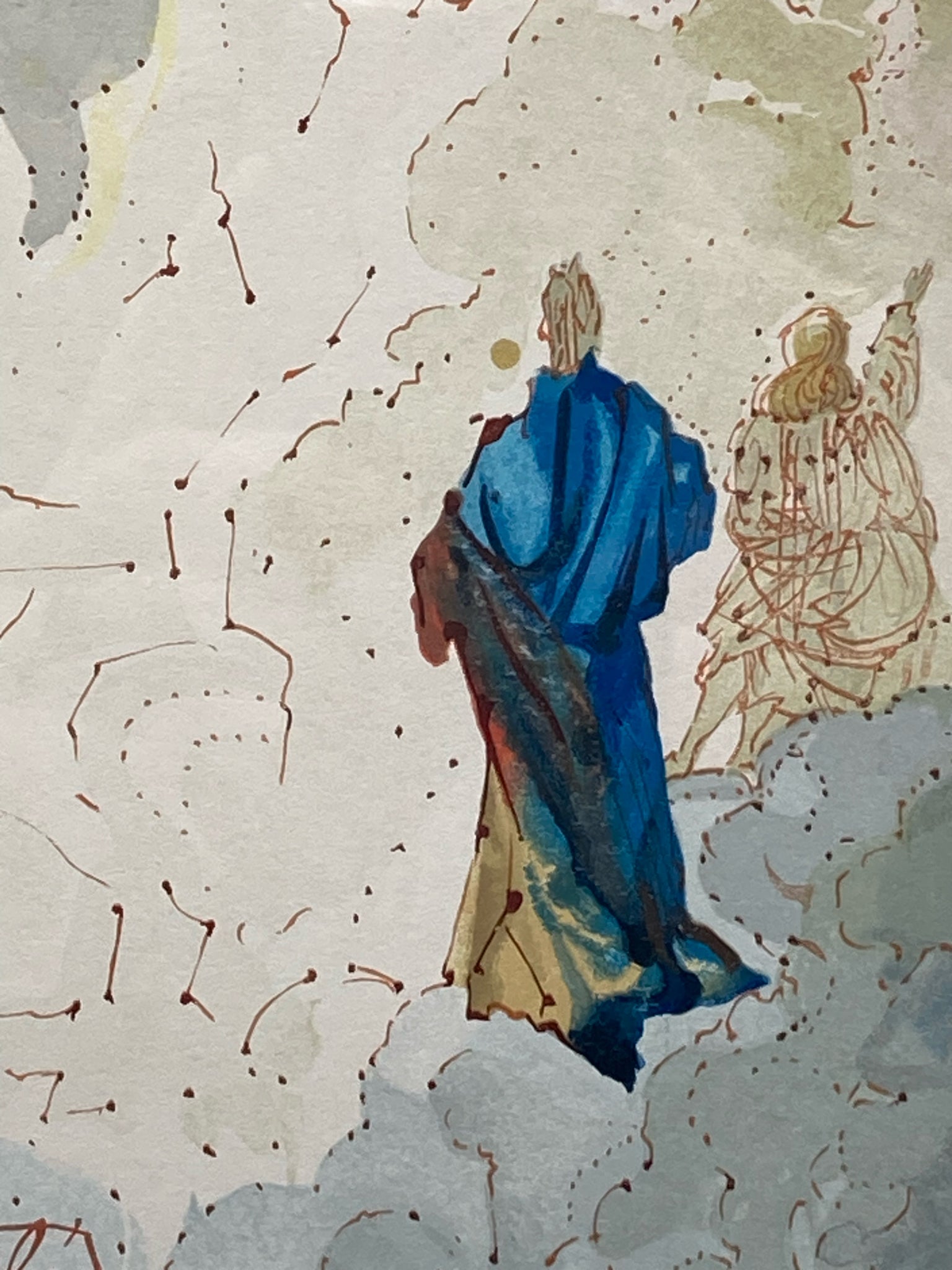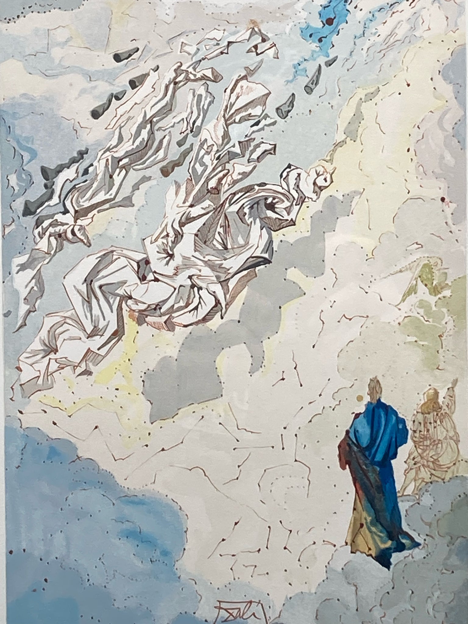 Framed limited edition Salvador Dali divine comedy canto 20 paradiso sixth sphere of Jupiter woodcut with certificate of authenticity. Woodcut with colors. Depicts the scene of Dante ascending to the Spheres of Saturn where Dante sees visions. Artwork measures 7" wide by 9" tall, total size with frame is 17" wide by 20" tall. Certificate of authenticity is issued by KCM Art Galleries and provides further information on the piece. Artwork is in excellent condition.
