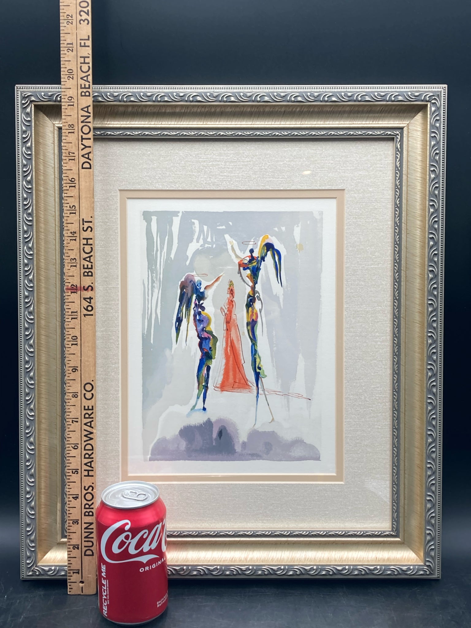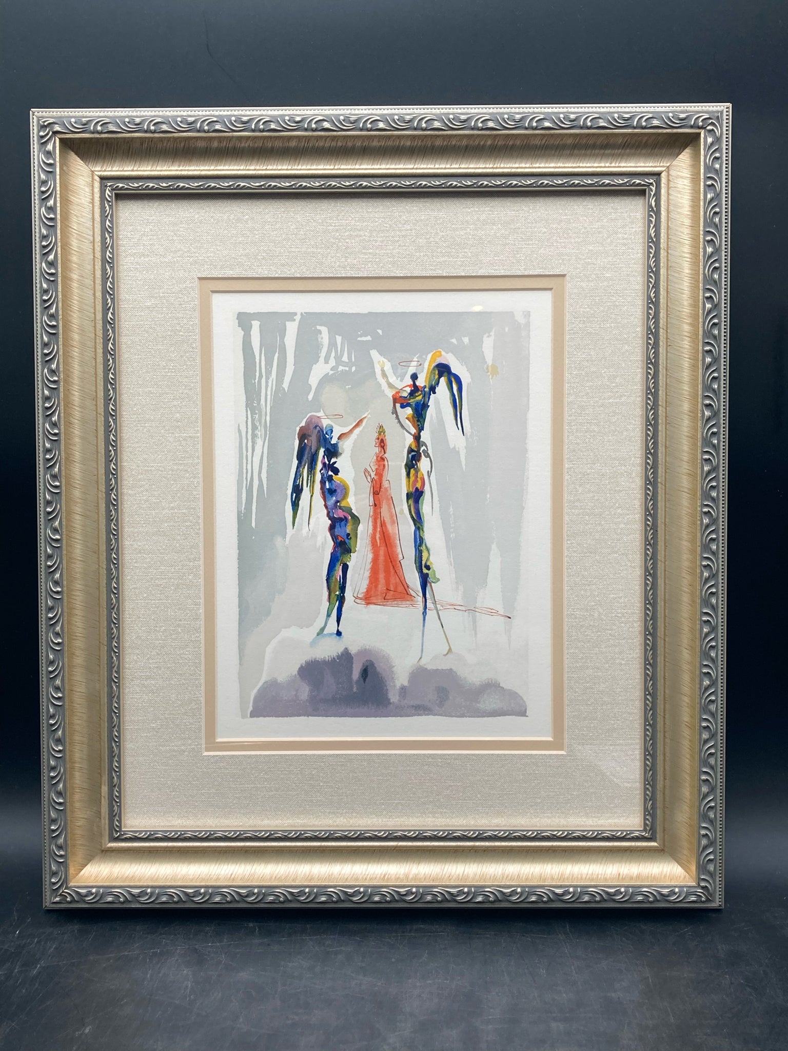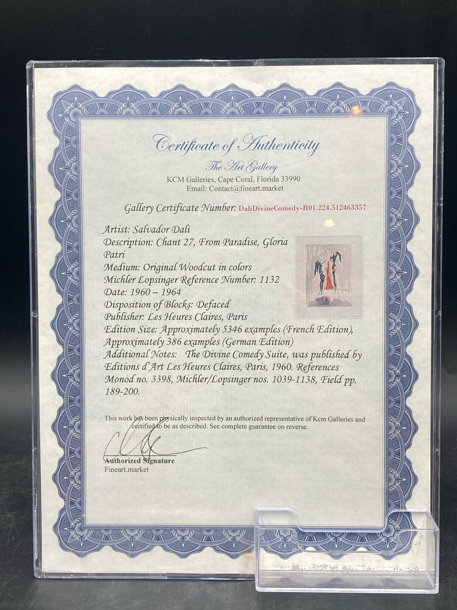 Framed limited edition Salvador Dali divine comedy canto 27 paradiso woodcut with certificate of authenticity. Woodcut with colors. Depicts the scene of Dante ascending to the Spheres of Saturn where Dante sees visions. Artwork measures 9" wide by 11" tall, total size with frame is 17" wide by 20" tall. Certificate of authenticity is issued by KCM Art Galleries and provides further information on the piece. Artwork is in excellent condition.