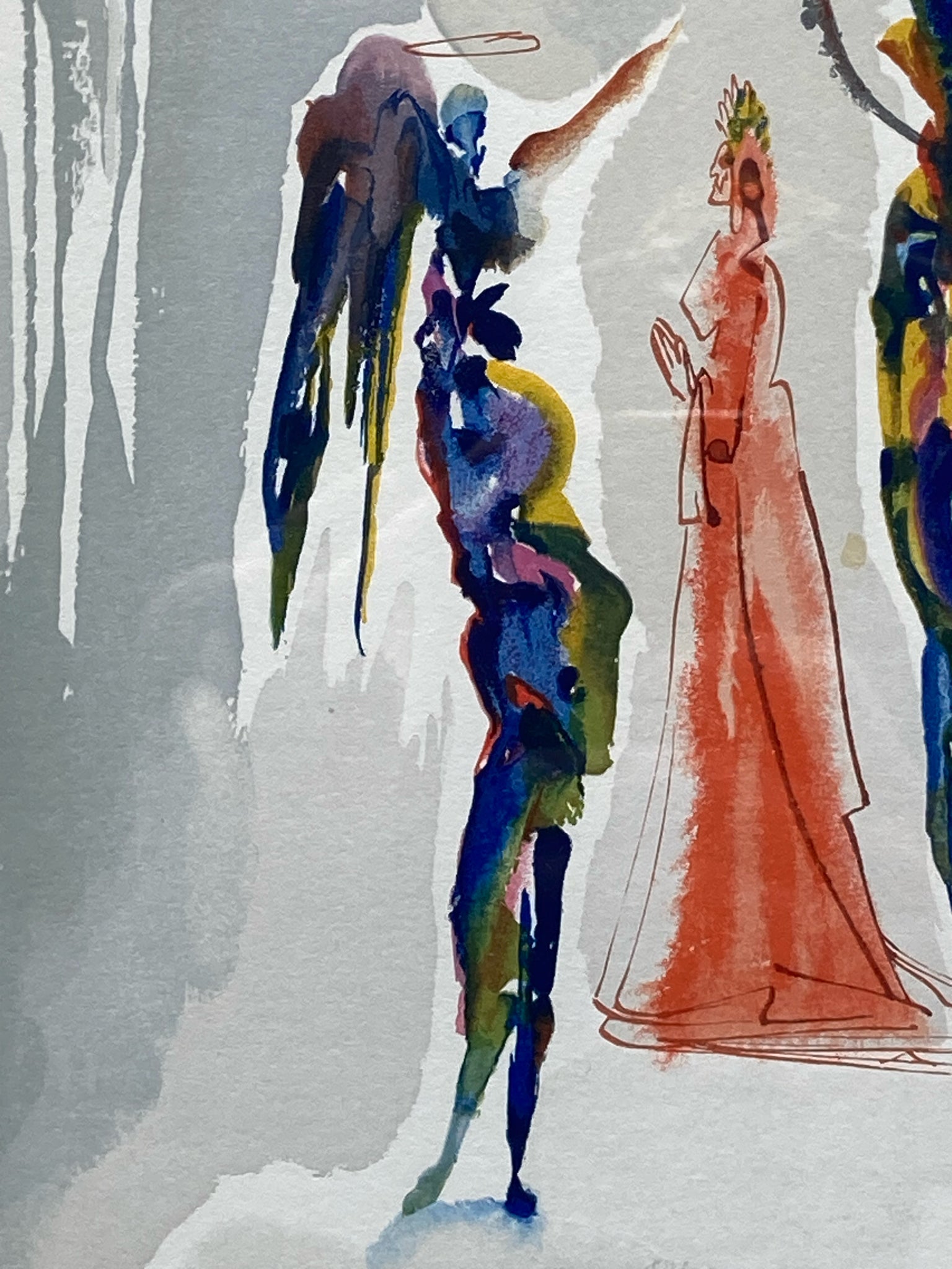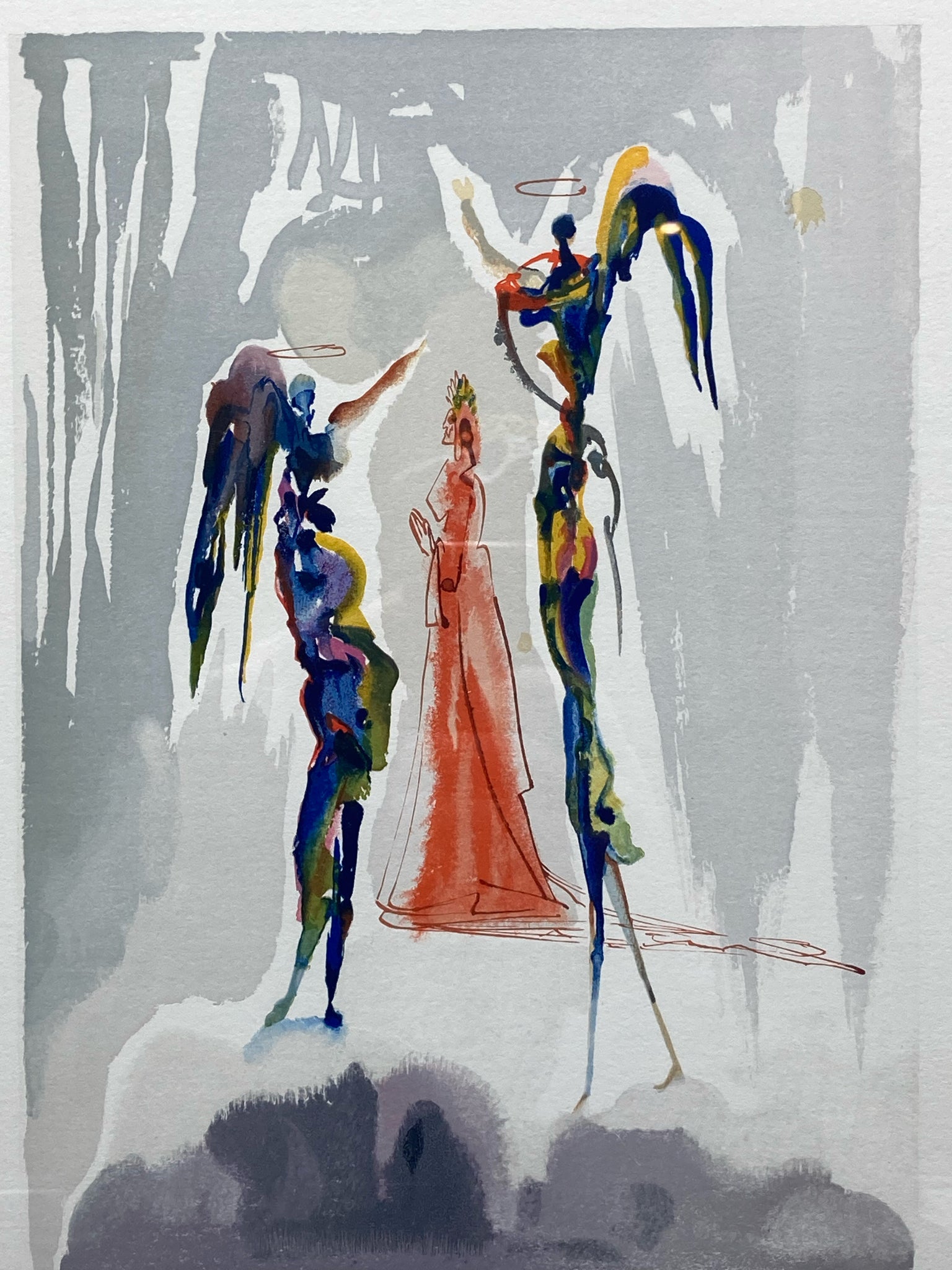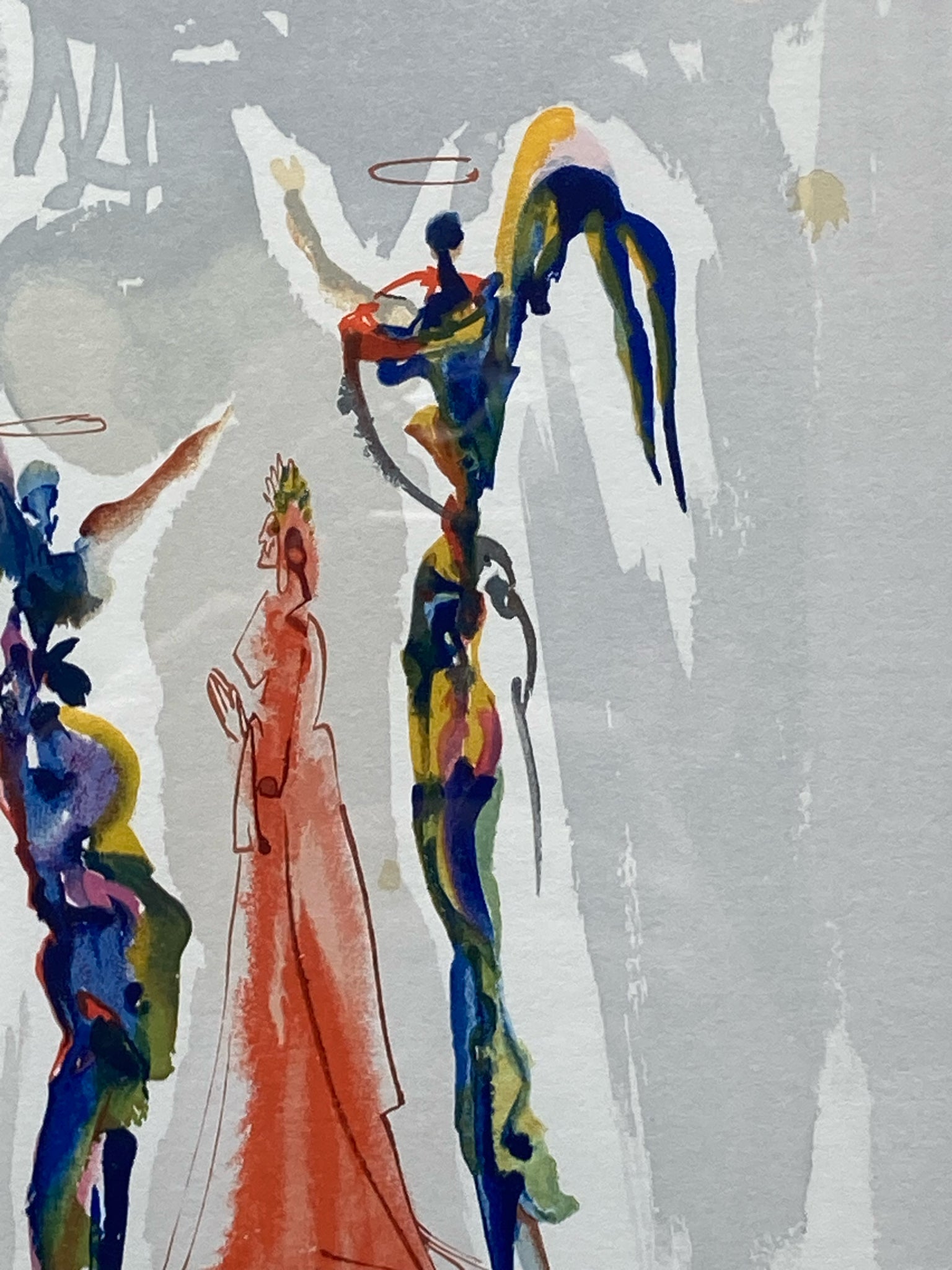 Framed limited edition Salvador Dali divine comedy canto 27 paradiso woodcut with certificate of authenticity. Woodcut with colors. Depicts the scene of Dante ascending to the Spheres of Saturn where Dante sees visions. Artwork measures 9" wide by 11" tall, total size with frame is 17" wide by 20" tall. Certificate of authenticity is issued by KCM Art Galleries and provides further information on the piece. Artwork is in excellent condition.