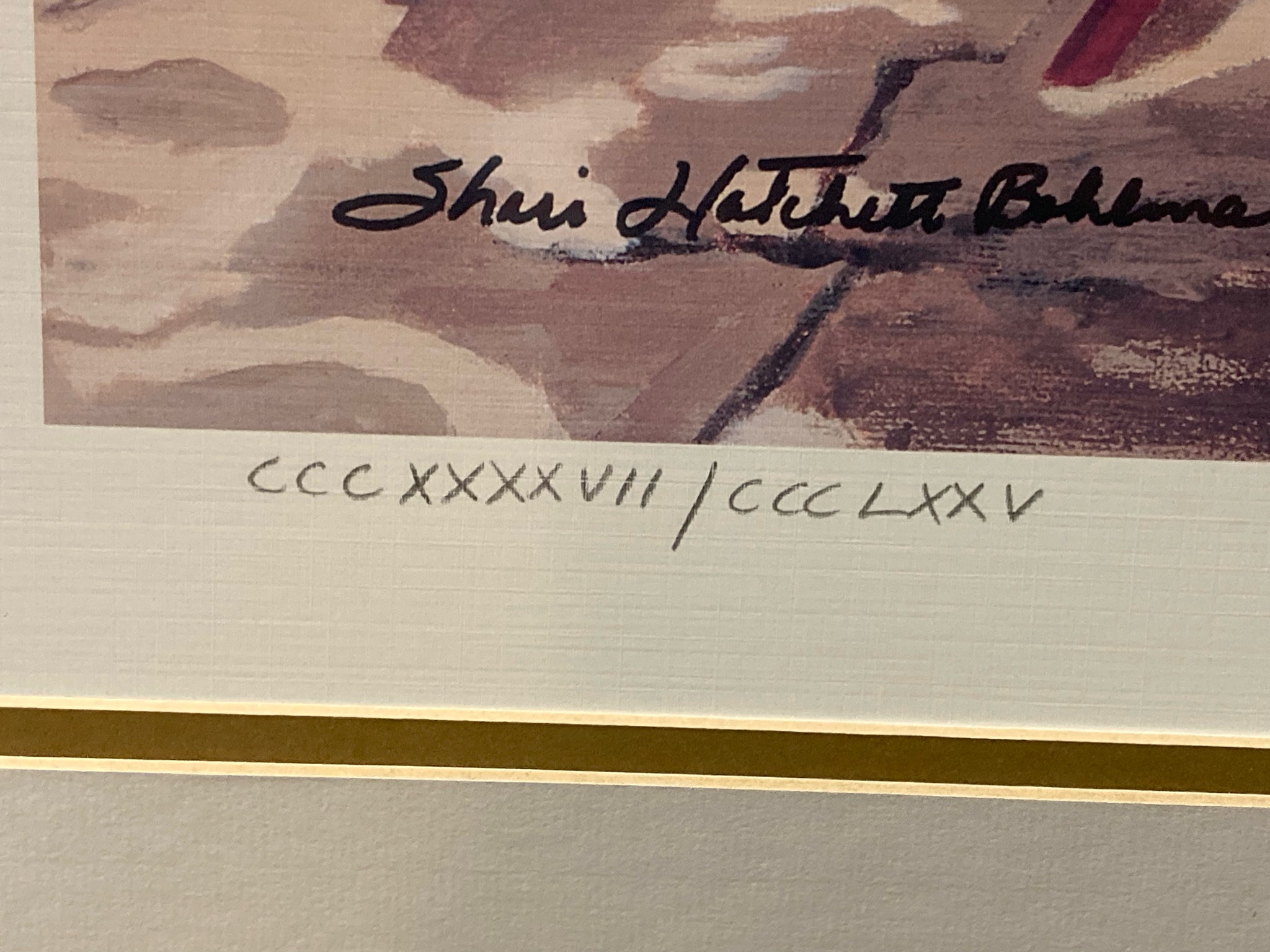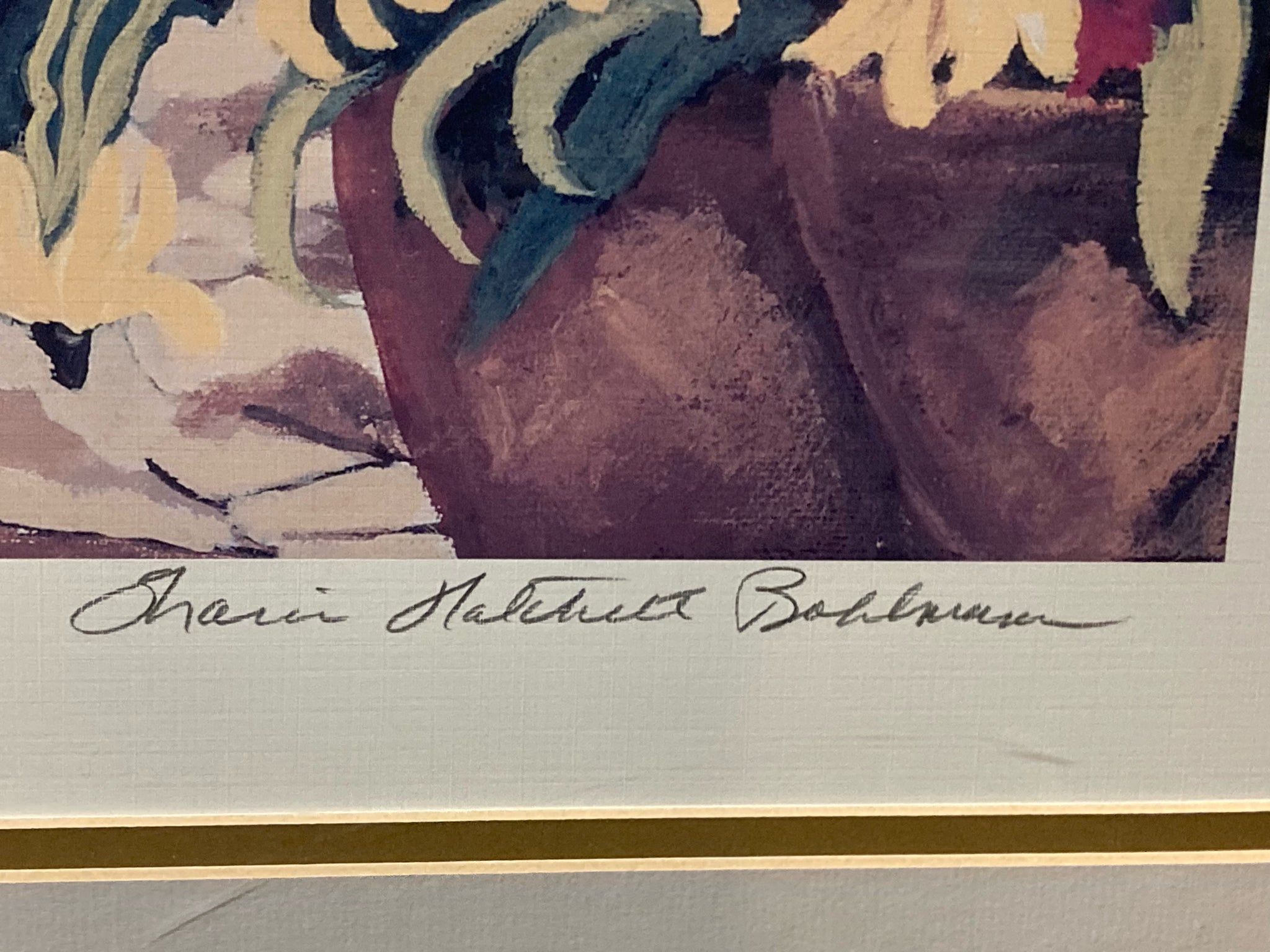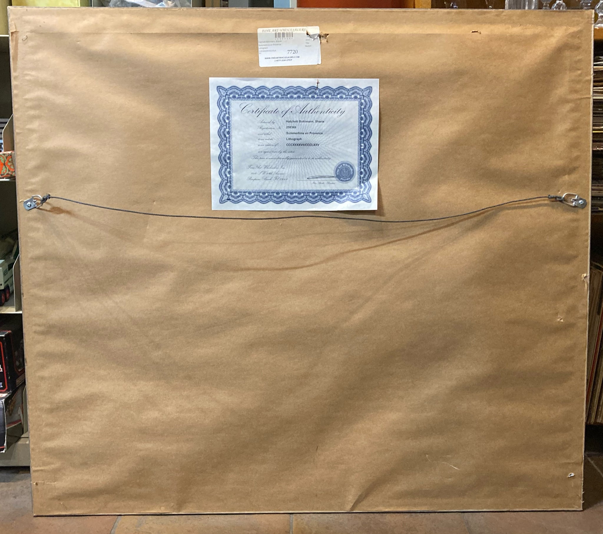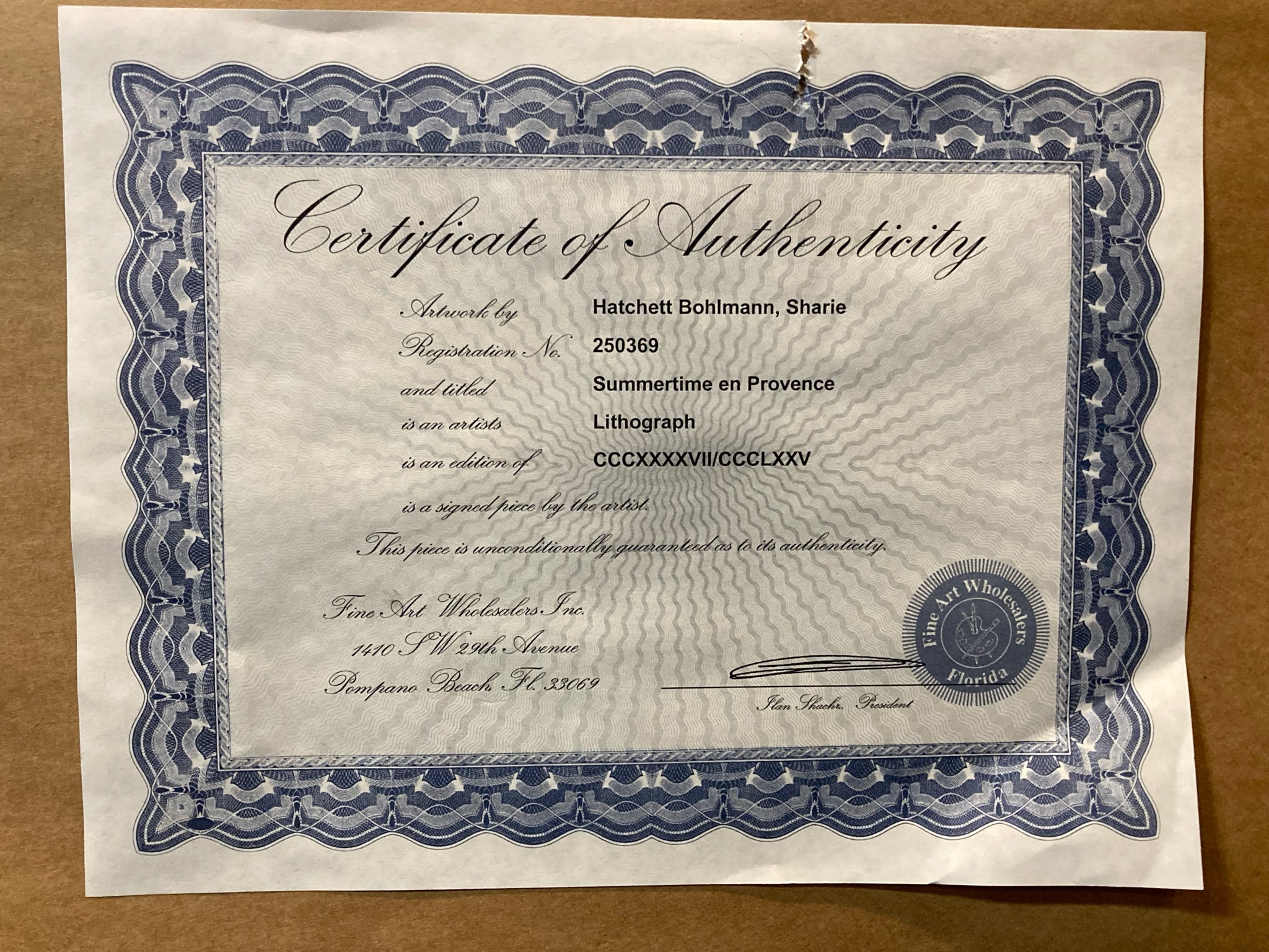 Sharie Hatchett-Bohlmann signed "Summertime en Provence" limited edition lithograph, framed and matted with certificate of authenticity. Vibrant Mediterranean style summer time scene set in a villa. Lithograph is signed, named and numbered at the bottom by the artist, number 347/375. Certificate of authenticity on back of frame is noted in photos. Lithograph measures 24" tall by 28" wide, total size with frame is 34" by 38". Frame has some very light wear, lithograph is in excellent condition.