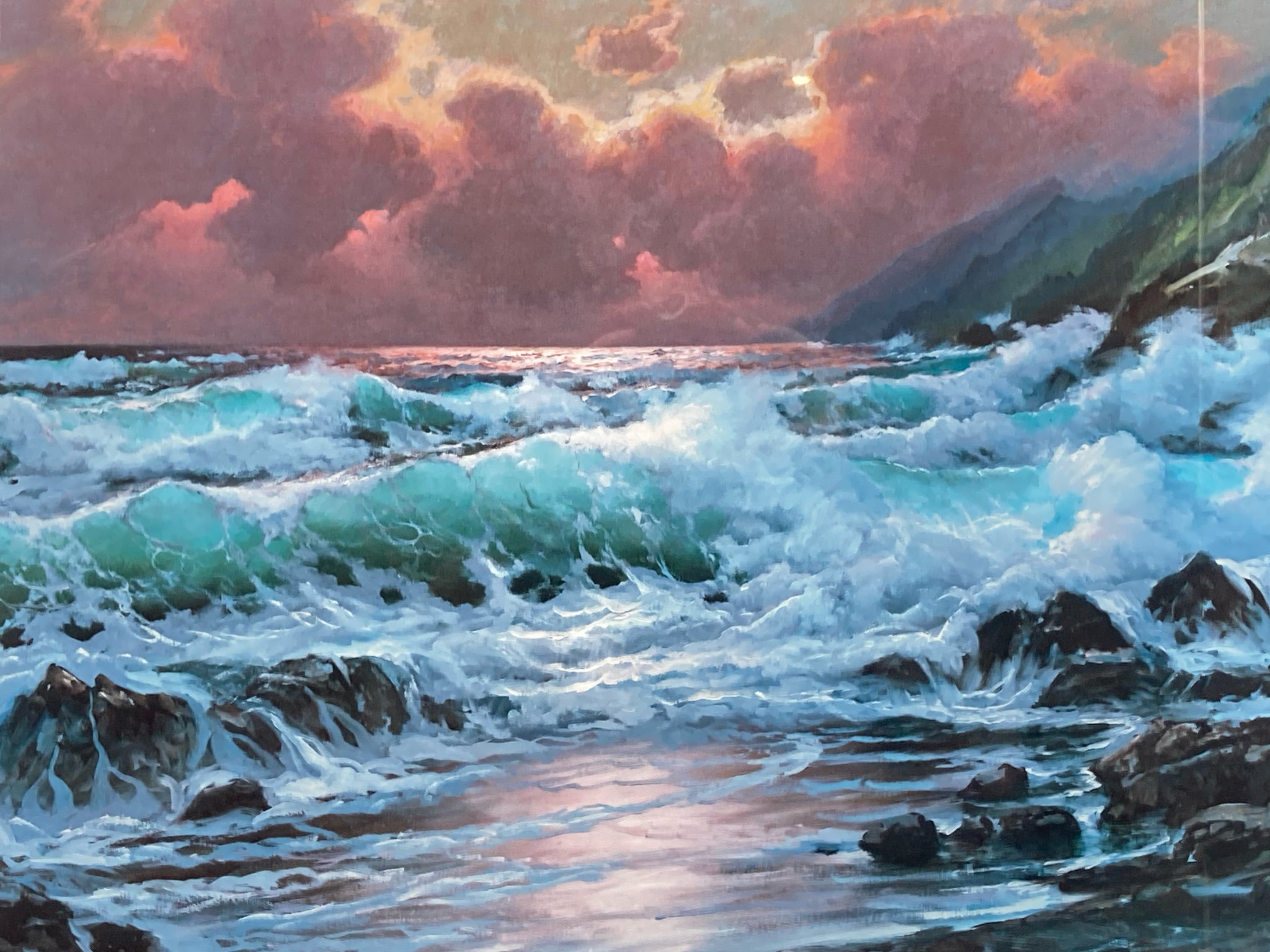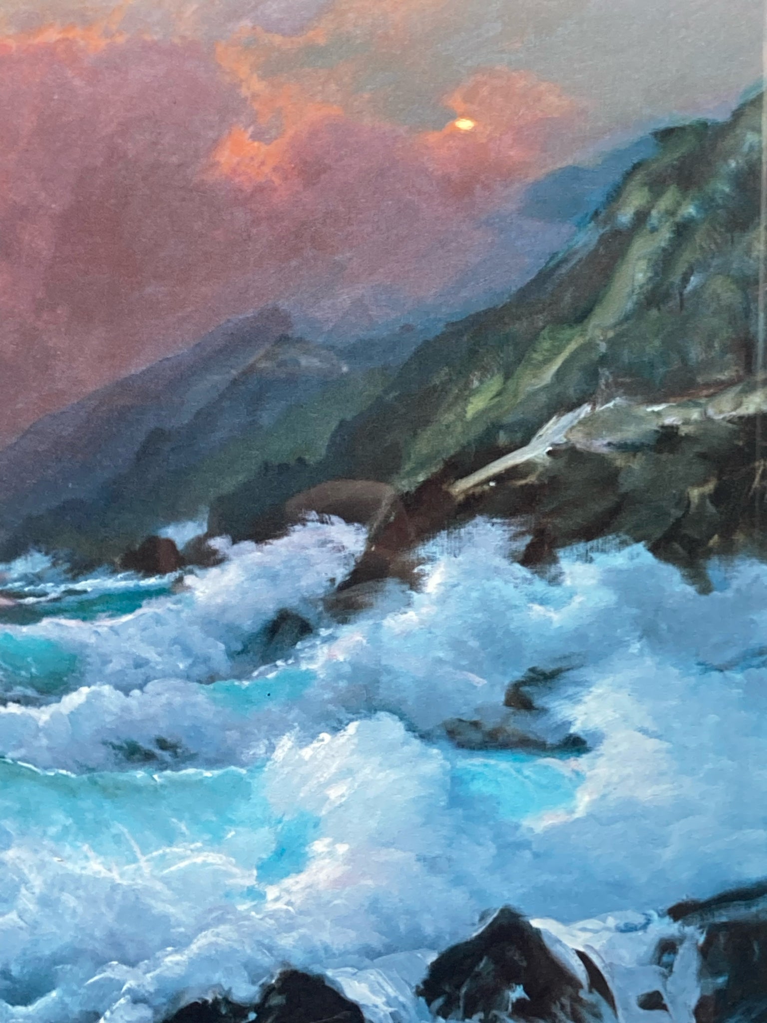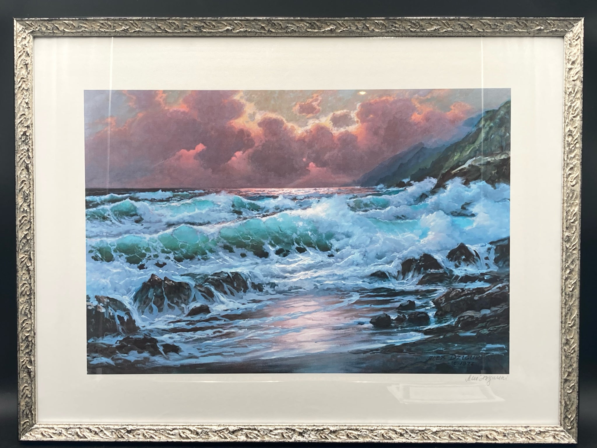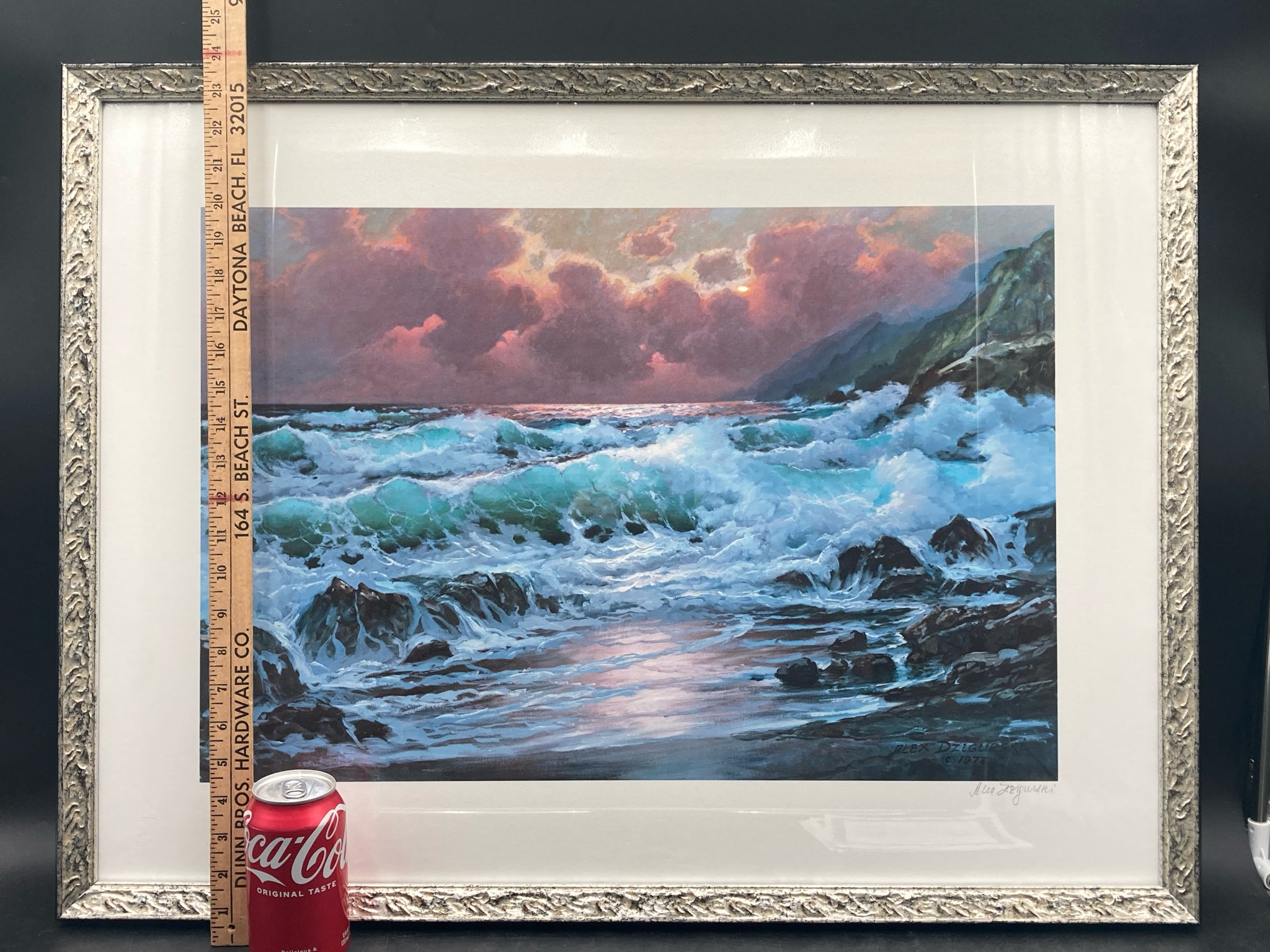 Signed and framed 24x30" Alex Dzigurski "From sea to shining sea" lithograph" print. Print is based on Dzigurski's original painting of a dramatic dusk time ocean scene with vibrant color and great detail. Numbered and signed by the artist on bottom as noted in photos. Print measures 24" tall by 30" wide with authenticity stamp from Franklin Mint on bottom, total size measures 27" tall by 33" wide. Print is in excellent condition.