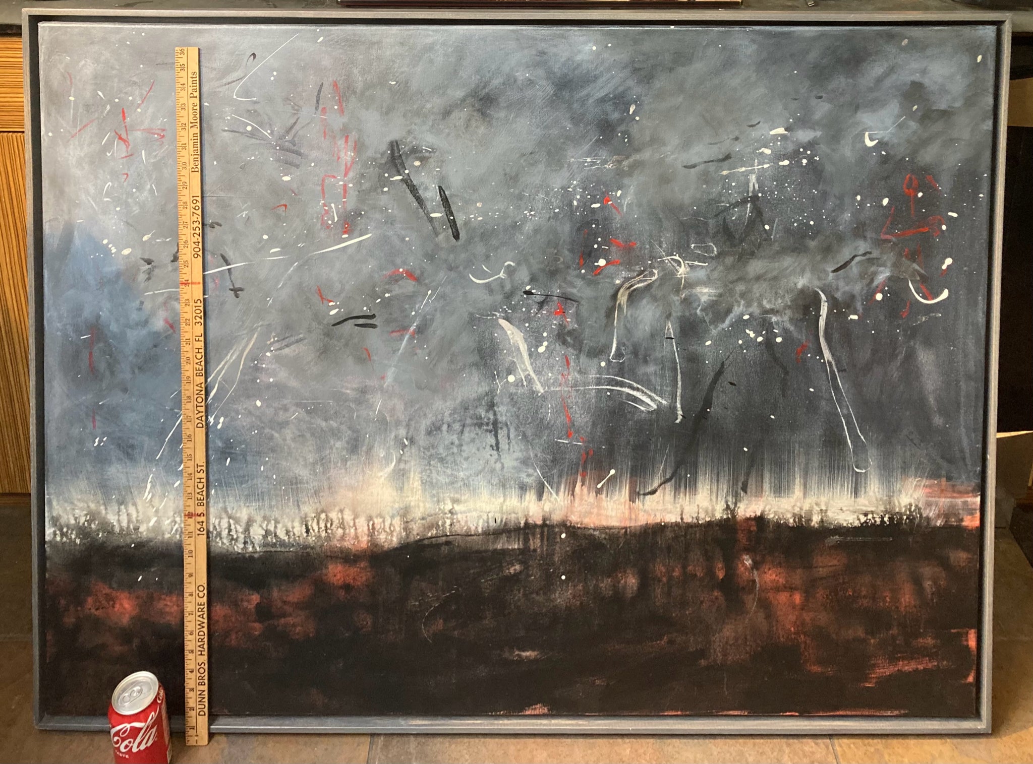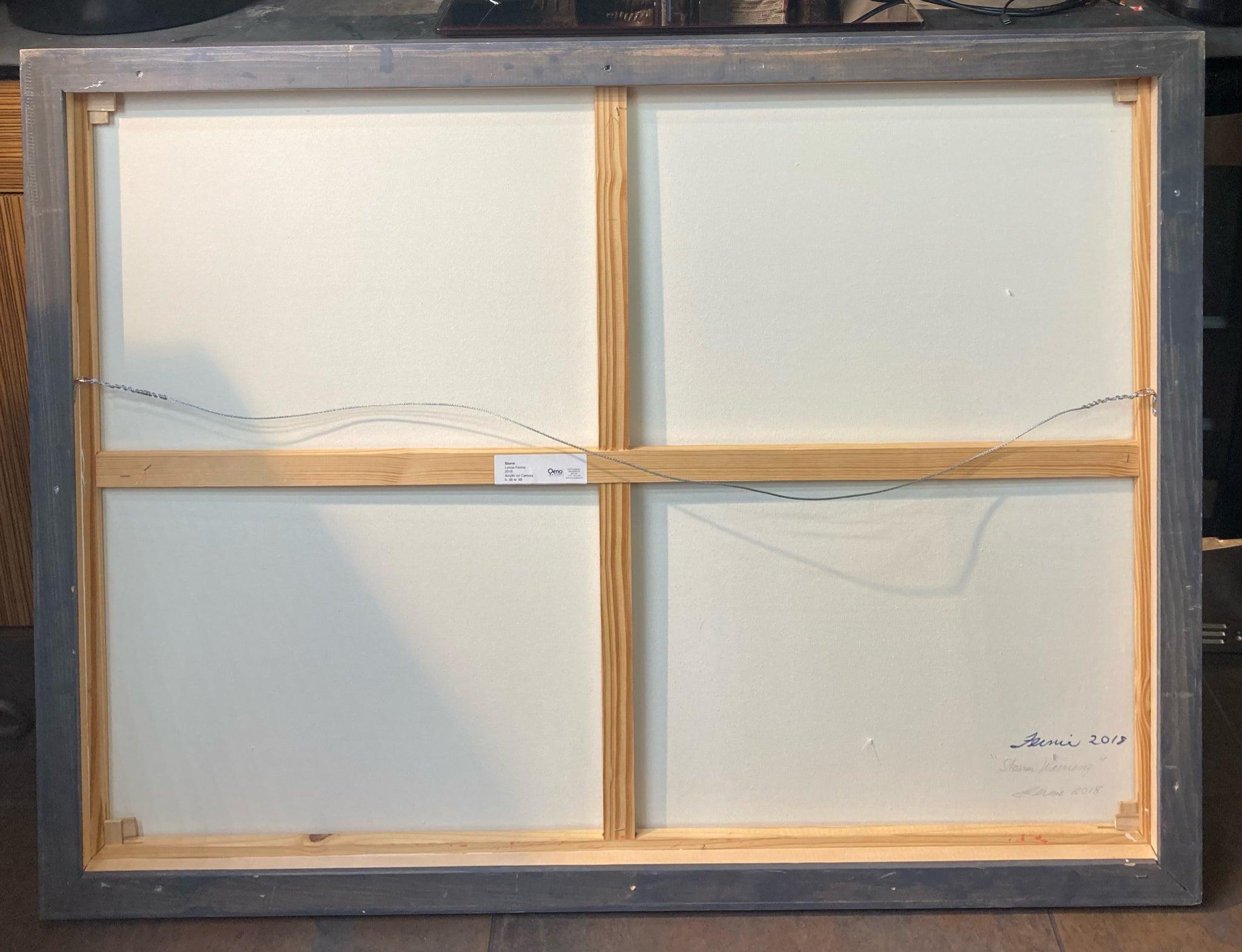 Signed original 36x48" Lynne Fernie "Storm" painting with certificate of authenticity. Oil on canvas. Abstract dramatic night time stormy weather scene with with brooding colors and large prominent skyline. Signed by artist on back of canvas. Certificate of authenticity is noted in photos along with match certification sticker on backside of frame. Painting is in excellent condition.